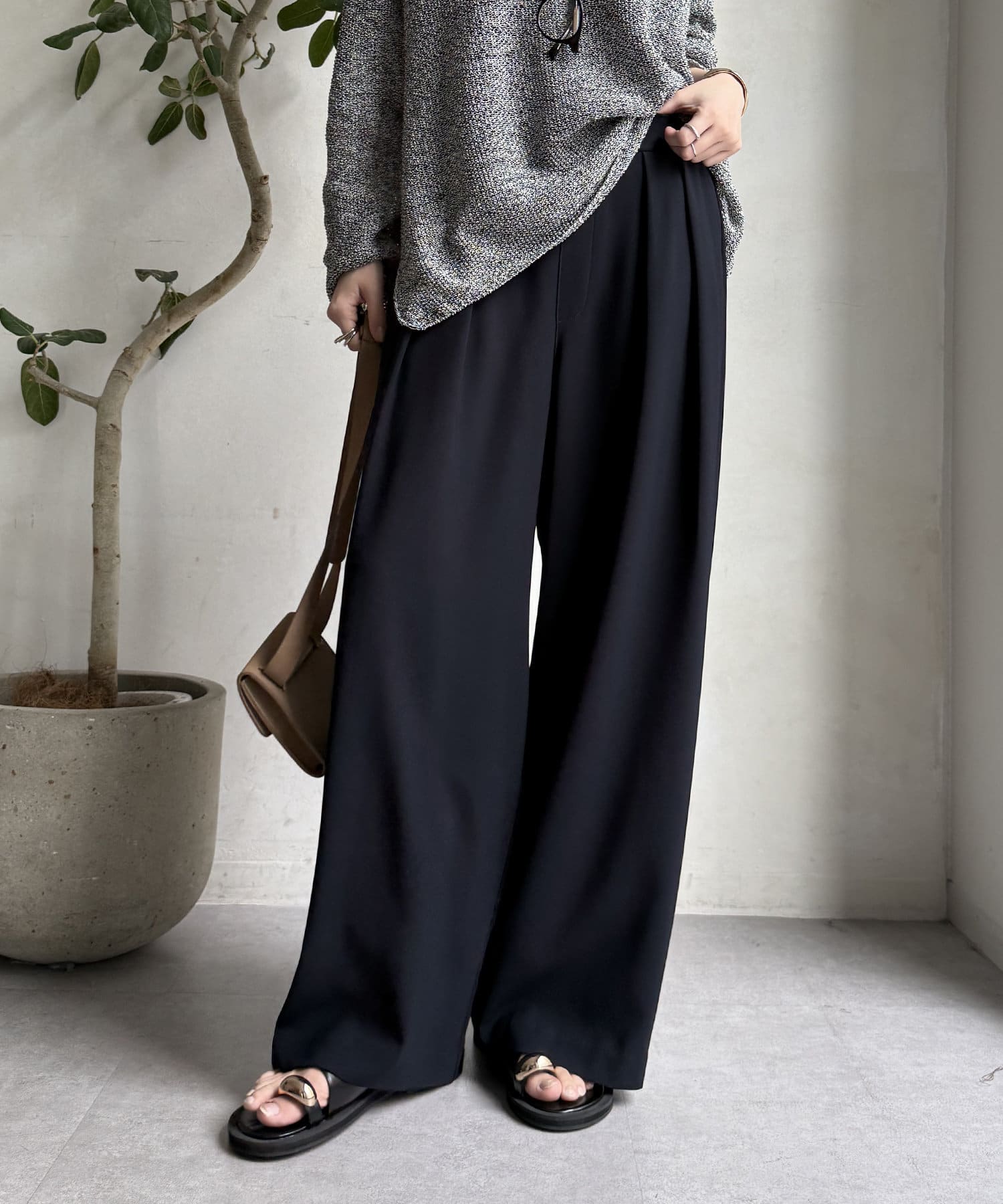 購入場所:パルクローゼットカルゼパンツと迷いに迷ってマイナス3キロという言葉でこちらを購入しました。164cmでTMサイズの黒とグレーを同時購入。結果大正解でした!タックからの落ち感はオンオフどちらにも合わせ方次第で馴染みます。丈はフラットサンダルで裾ギリギリで理想通り。グレーはマットだけど素材のツヤも感じられてグレーワントーンコーデにも活躍しそうです。今年は暖冬とのことで長いシーズン着たいと思います。
