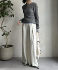 購入場所:パルクローゼットカルゼパンツと迷いに迷ってマイナス3キロという言葉でこちらを購入しました。164cmでTMサイズの黒とグレーを同時購入。結果大正解でした!タックからの落ち感はオンオフどちらにも合わせ方次第で馴染みます。丈はフラットサンダルで裾ギリギリで理想通り。グレーはマットだけど素材のツヤも感じられてグレーワントーンコーデにも活躍しそうです。今年は暖冬とのことで長いシーズン着たいと思います。
