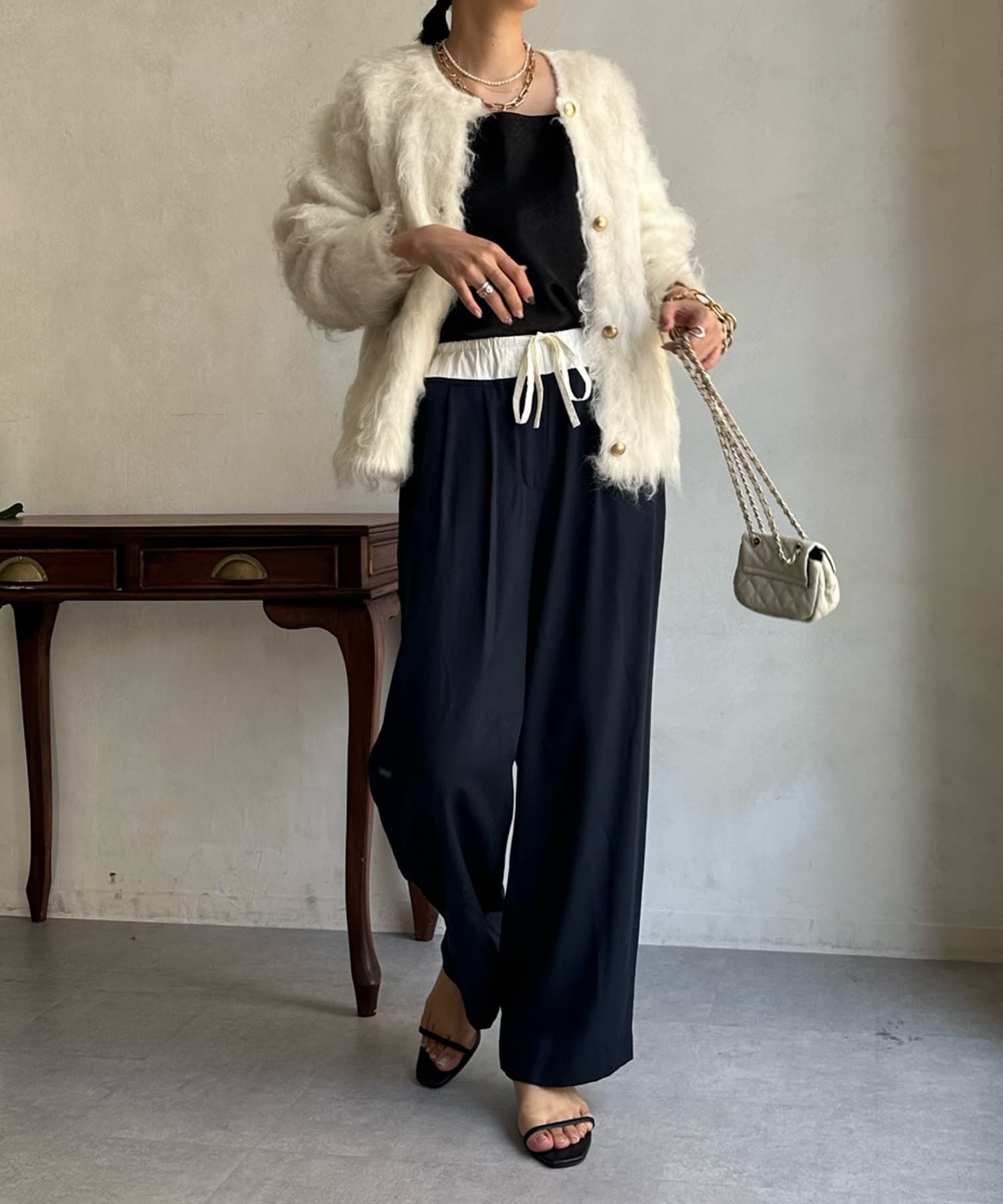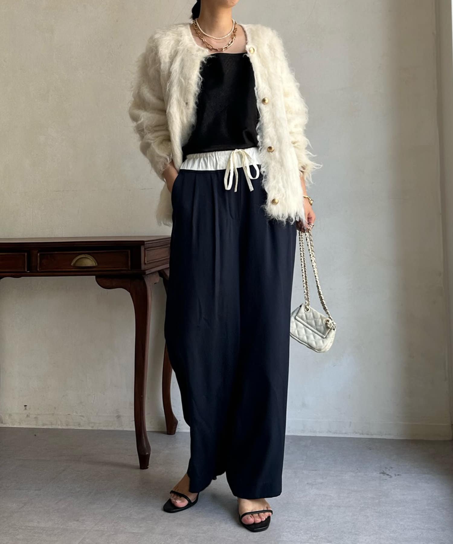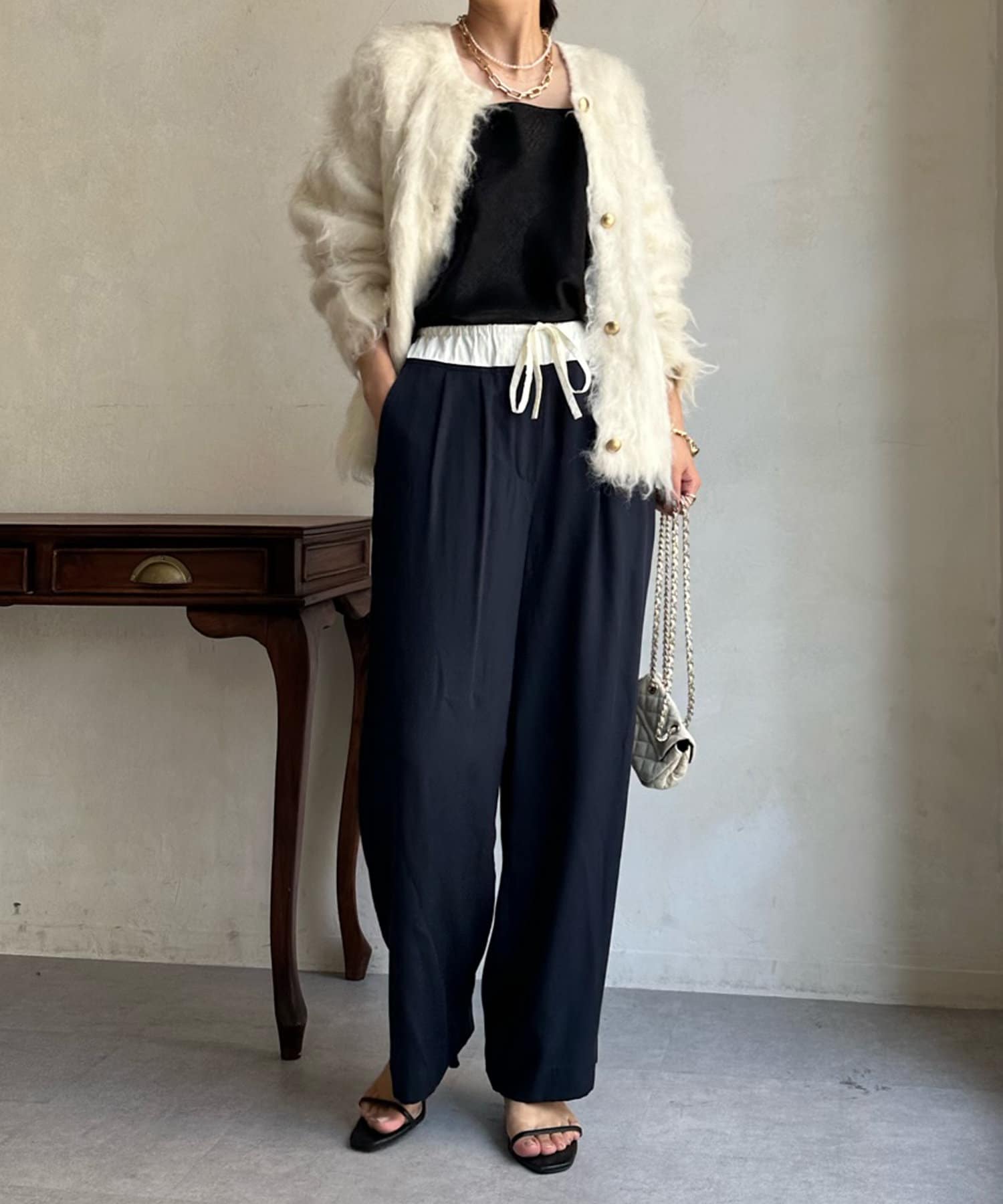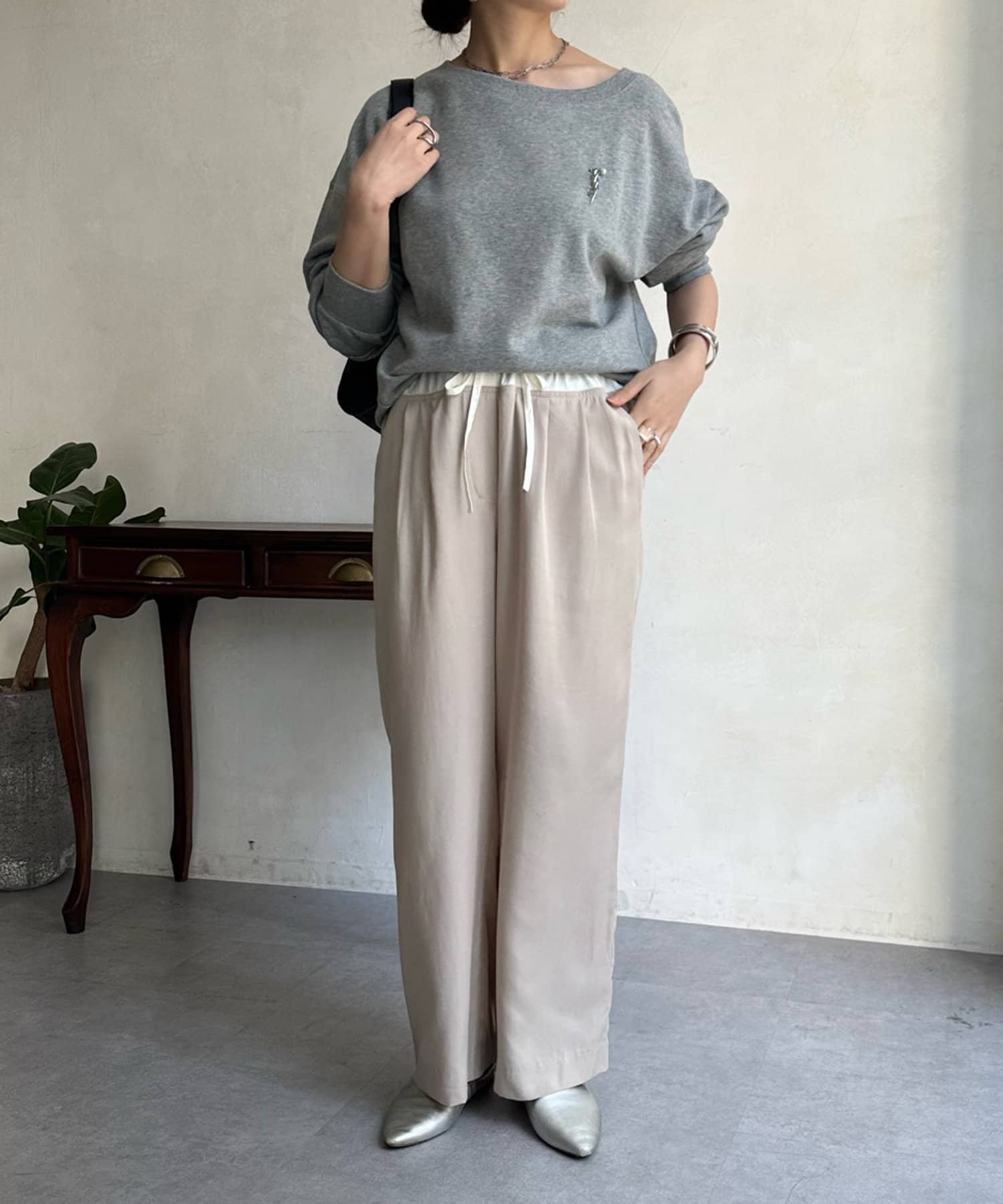 ワイドシルエットで、ウエストの切替デザインが特徴的なパンツです!