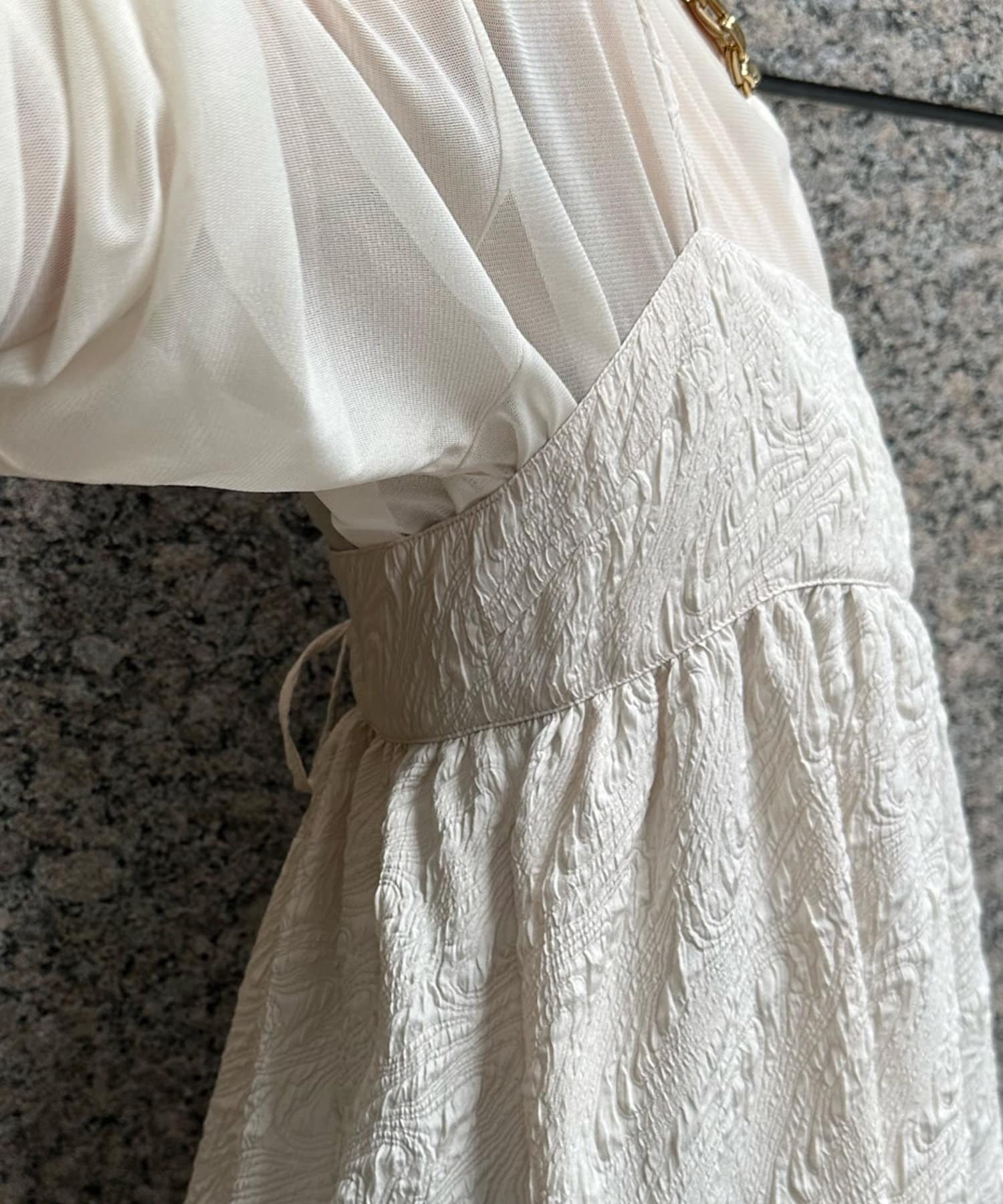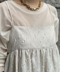 胸下からフレアに広がるシルエットに、華奢な肩紐が抜け感をプラス。