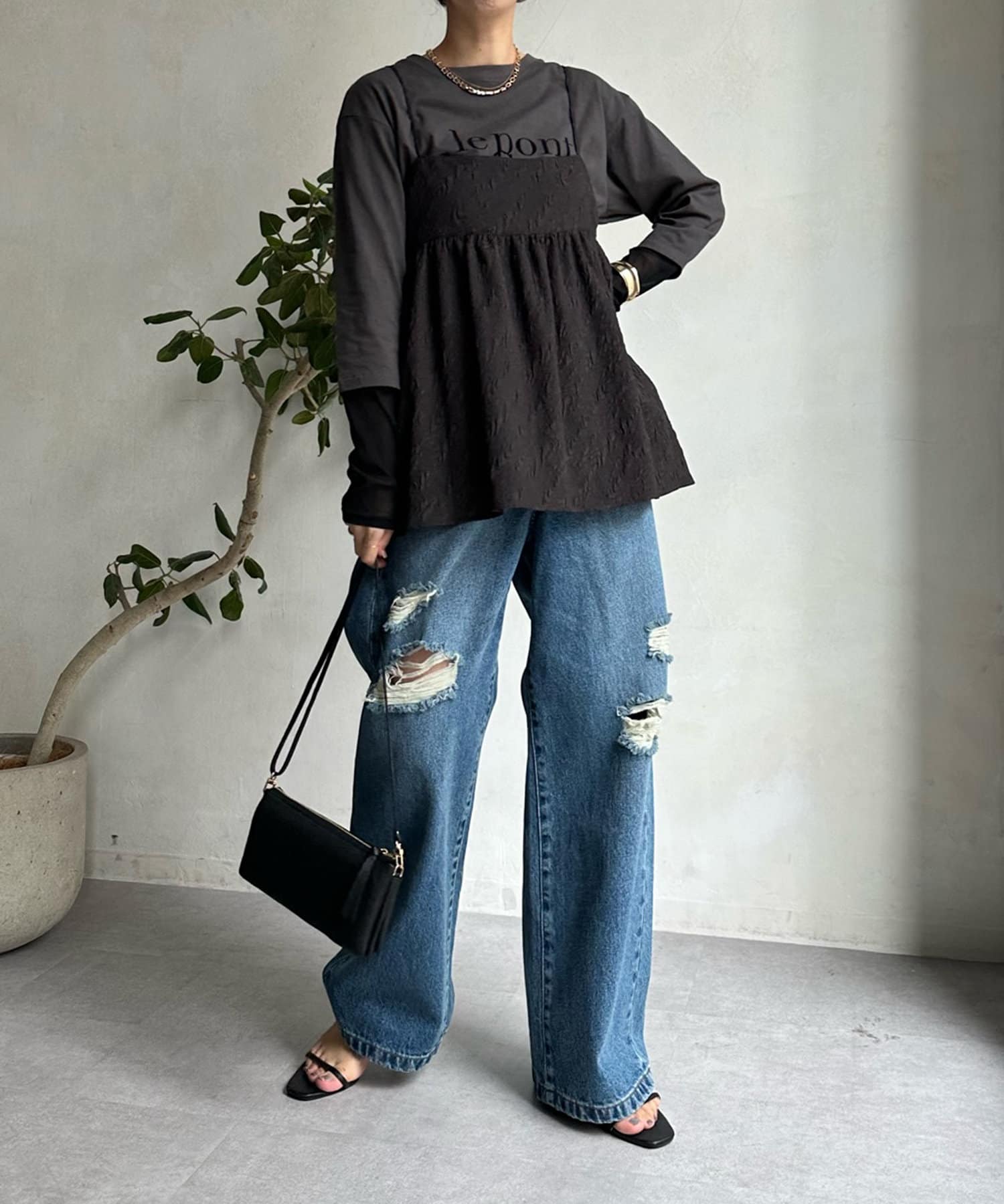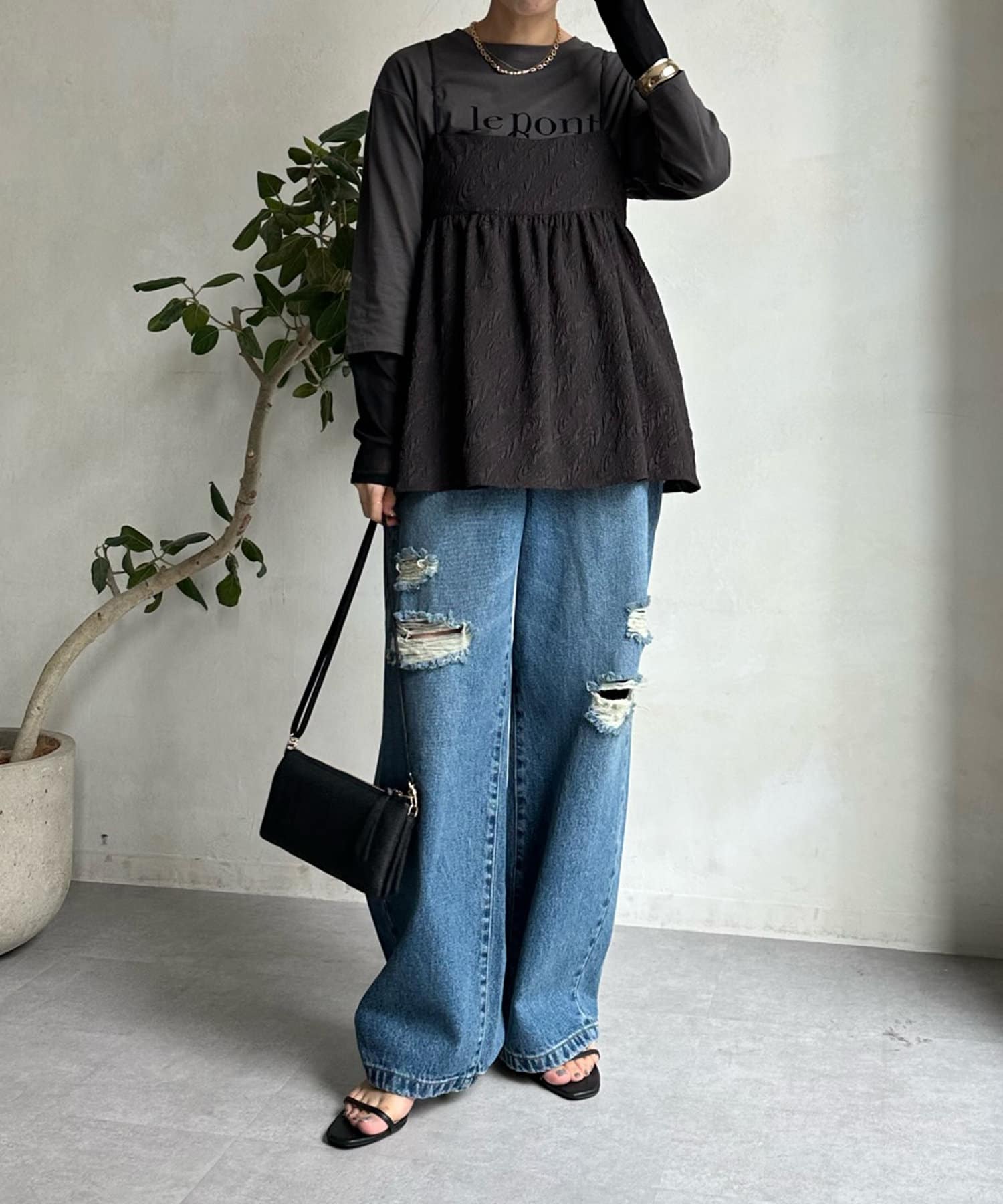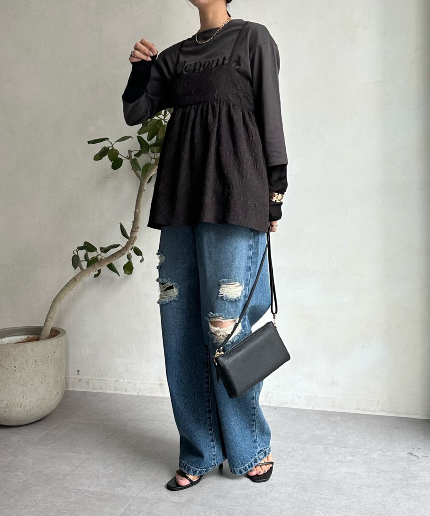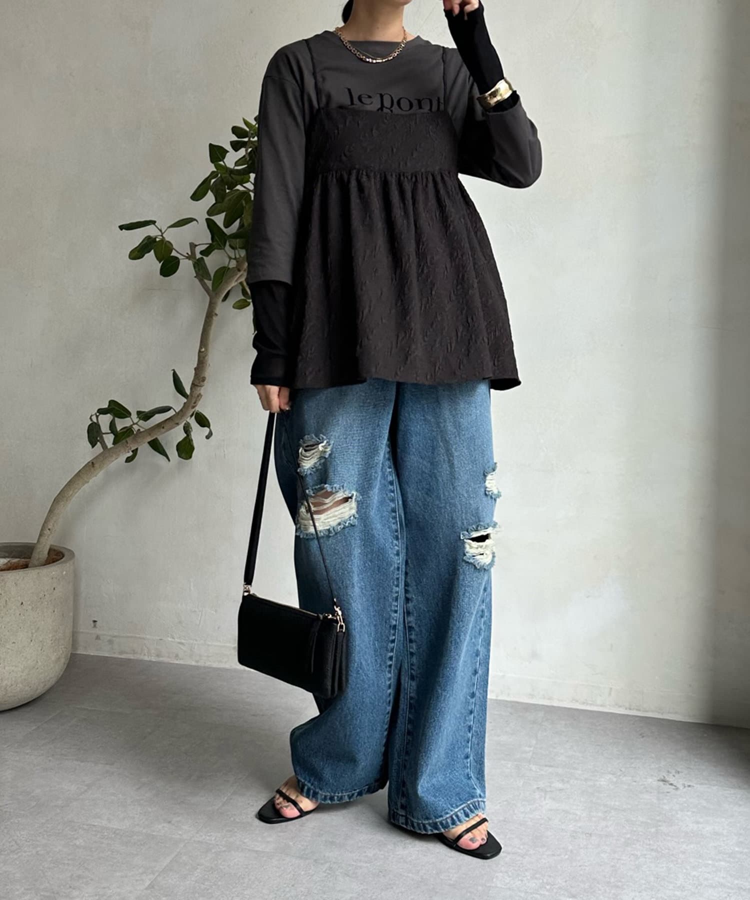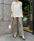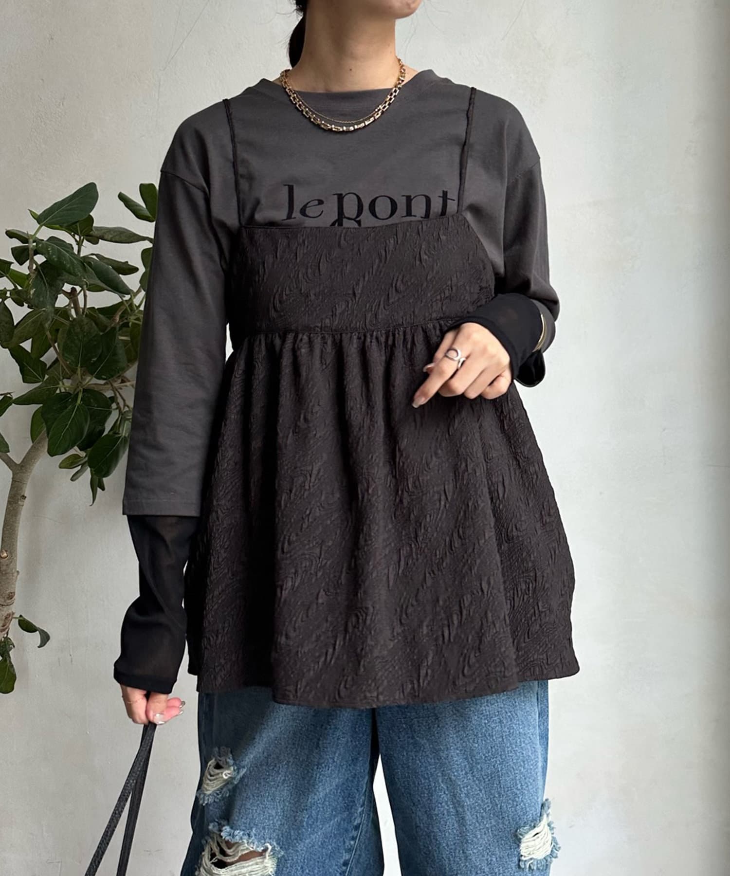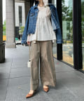 カットソーなどシンプルなアイテムとレイヤードするだけで甘くなりすぎず、簡単に今らしいスタイルが完成しますよ!