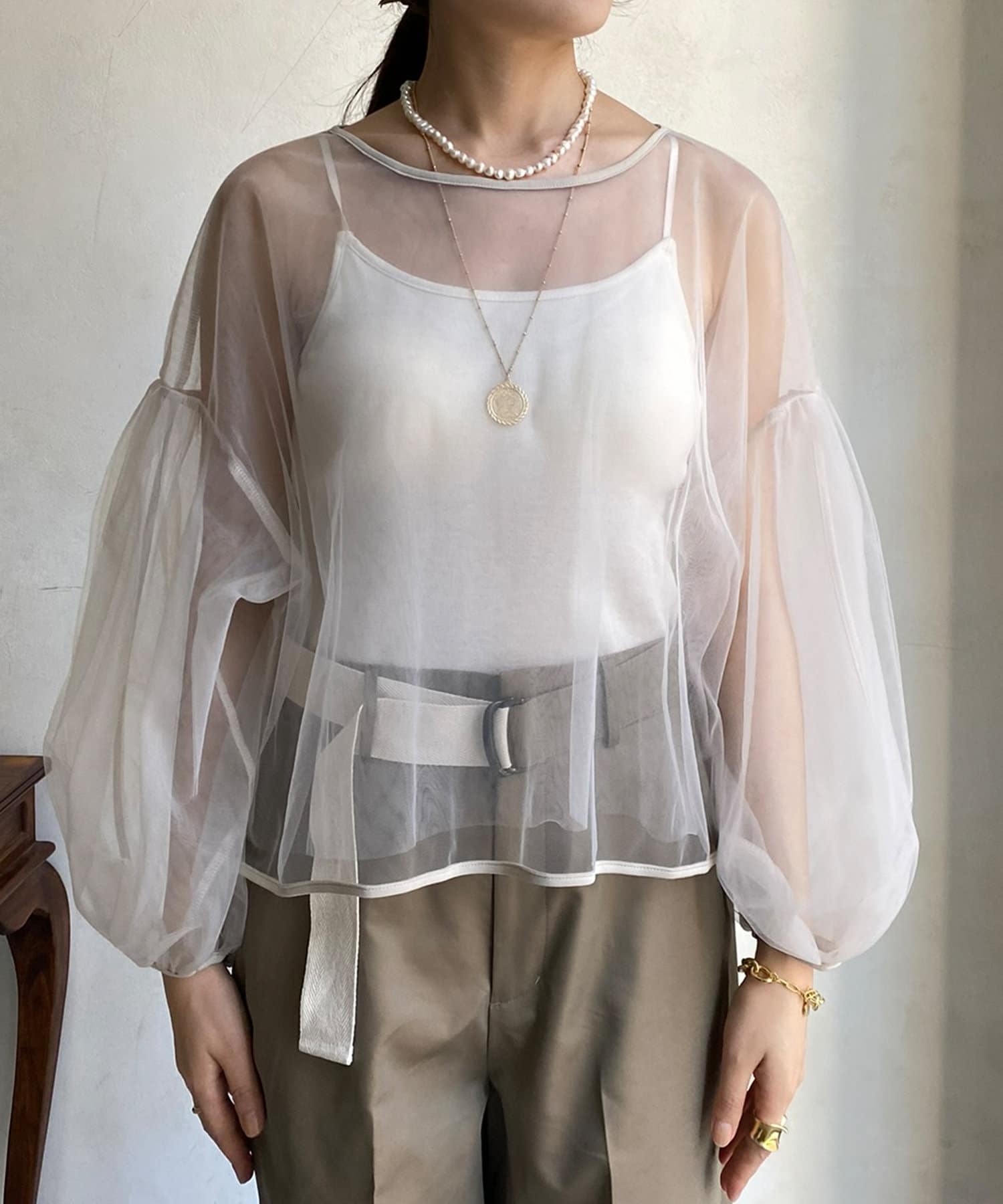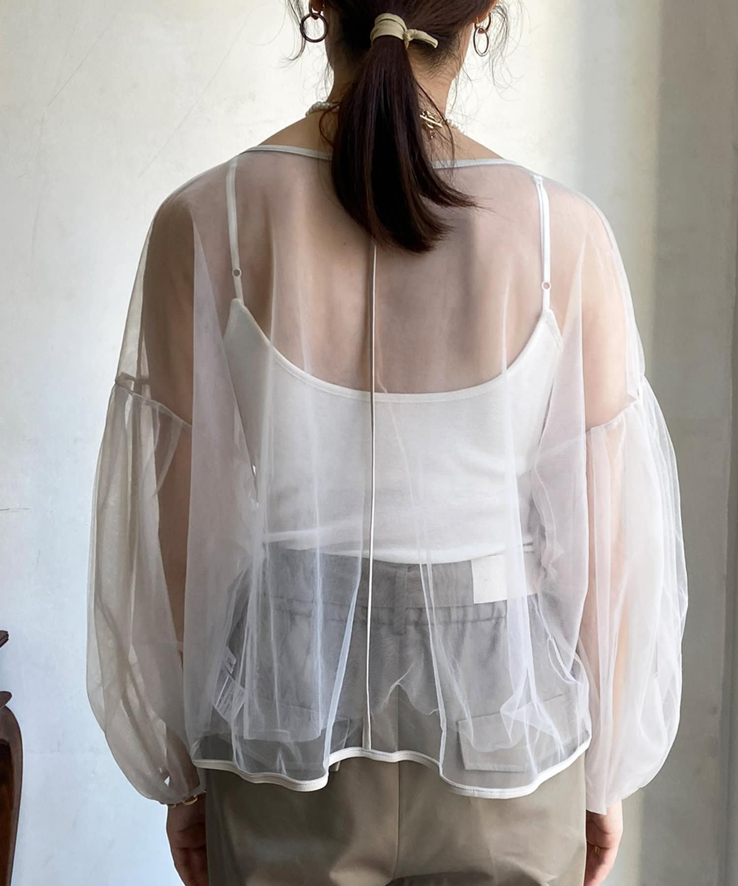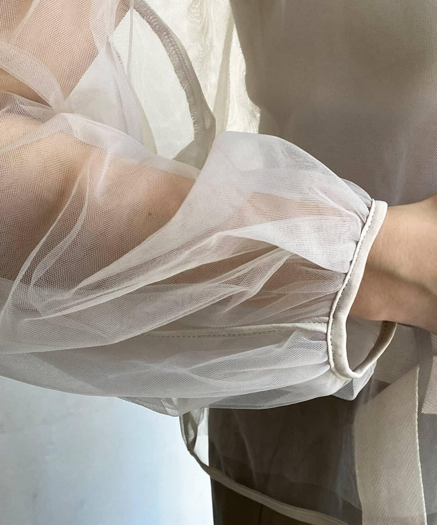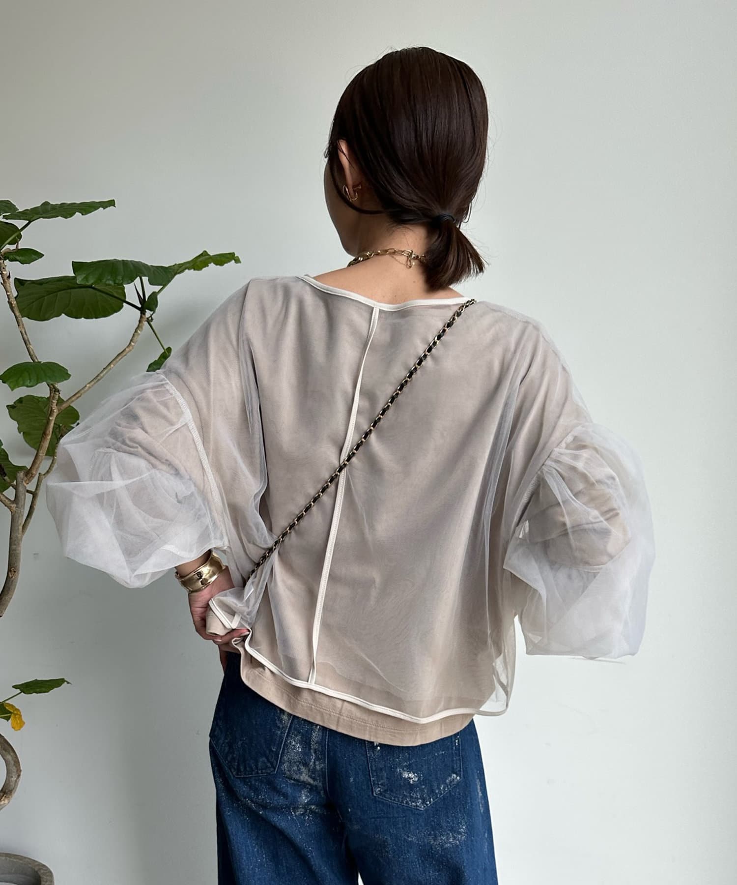 トレンドのシアー素材とボリューム袖を兼ね備えたチュールのブラウス。