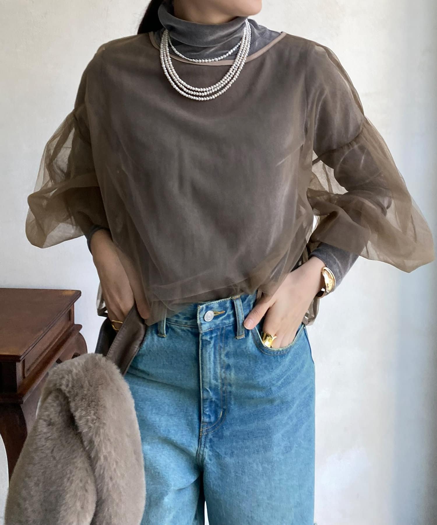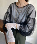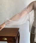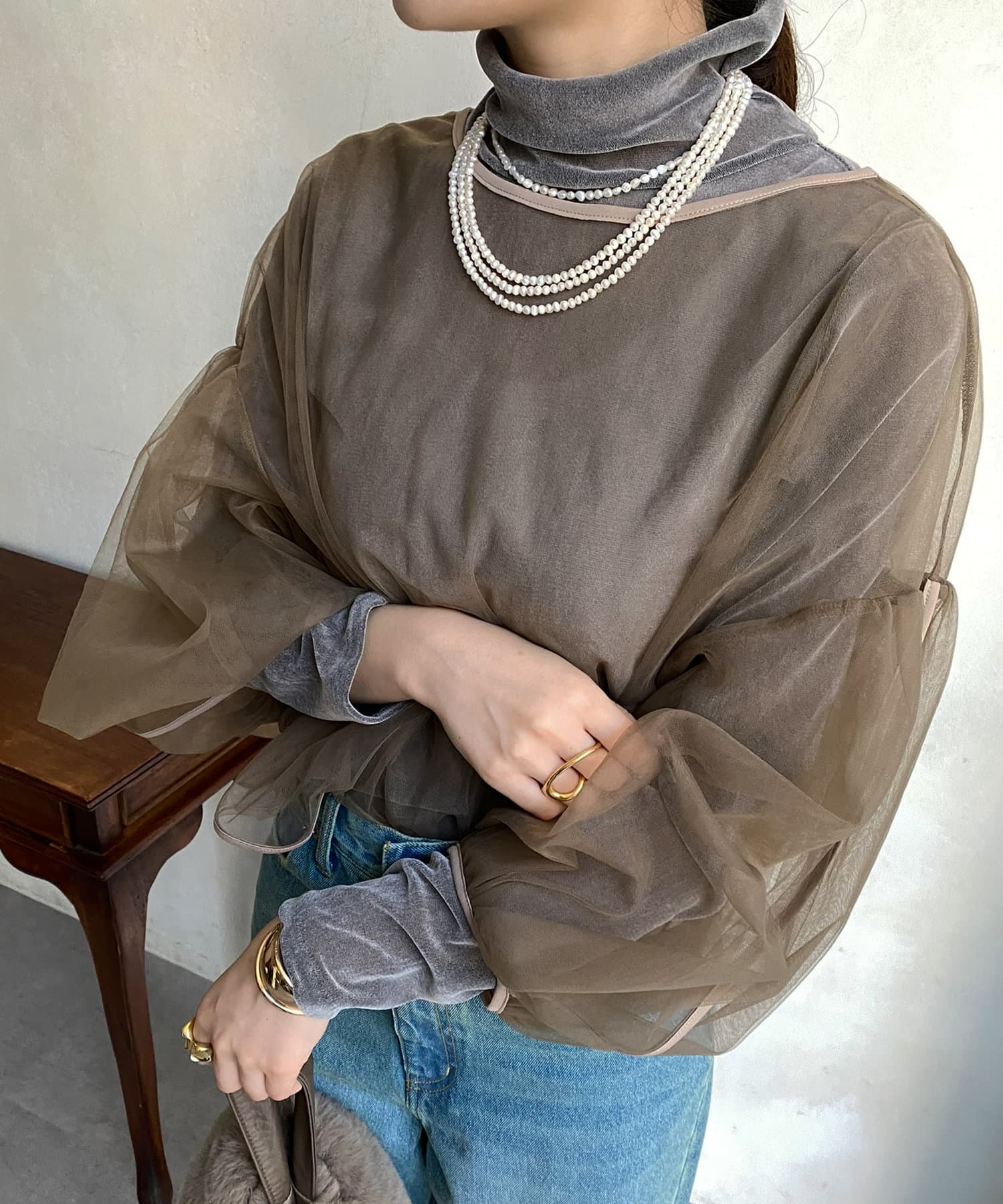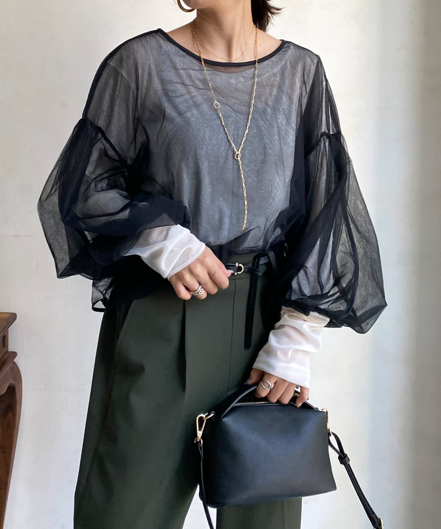 トレンドのシアー素材とボリューム袖を兼ね備えたチュールのブラウス。