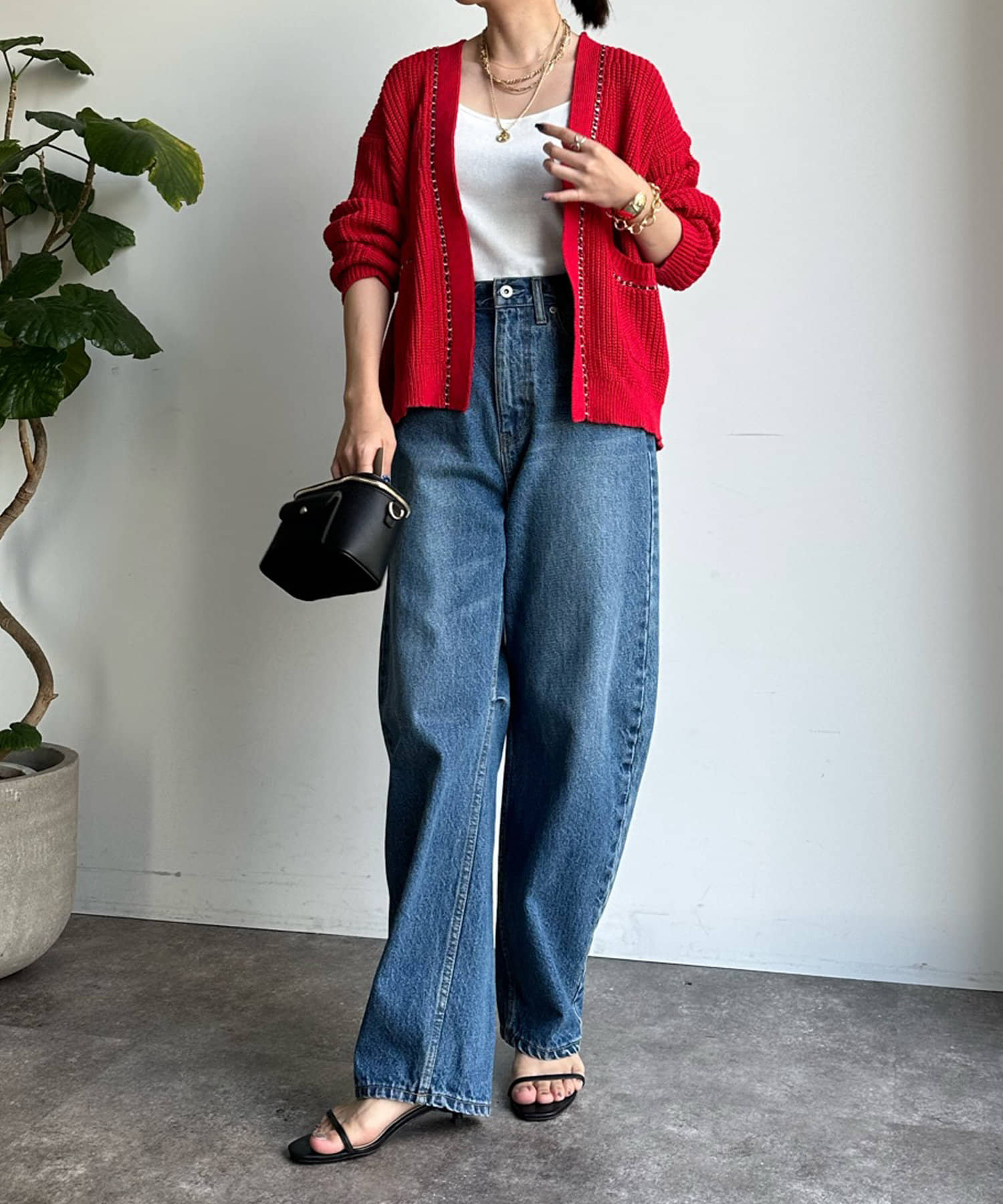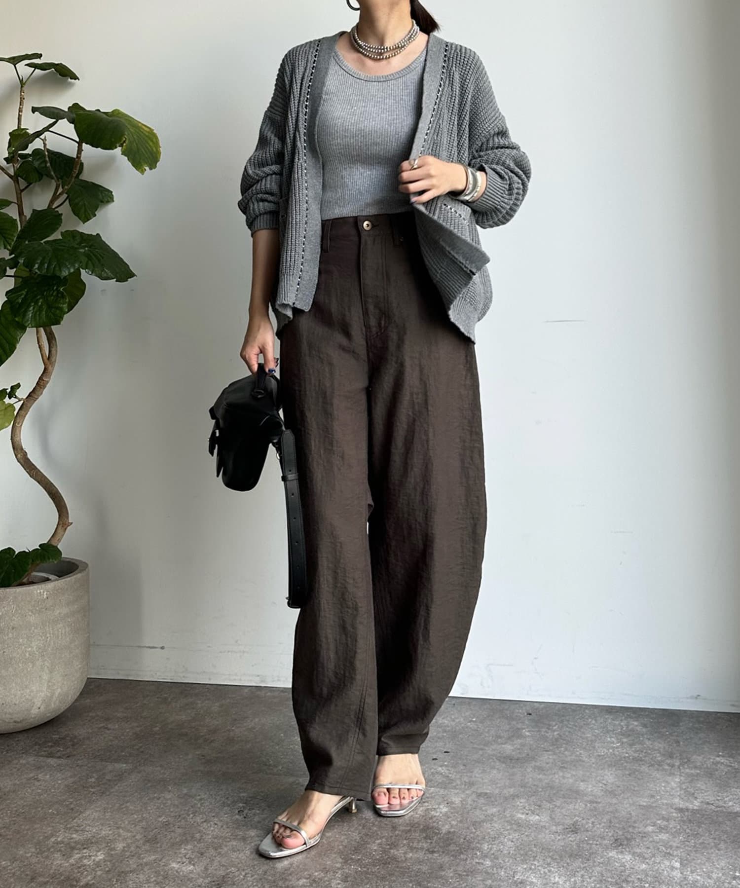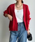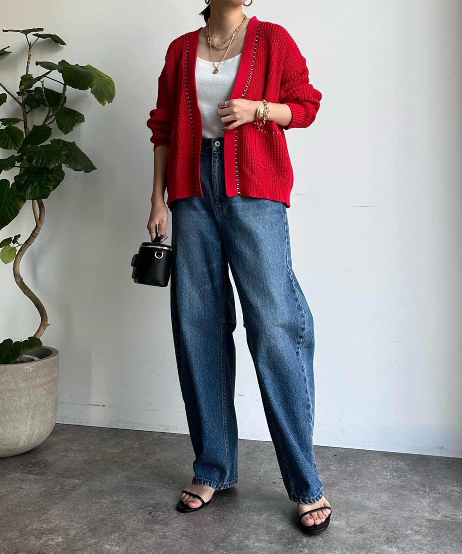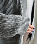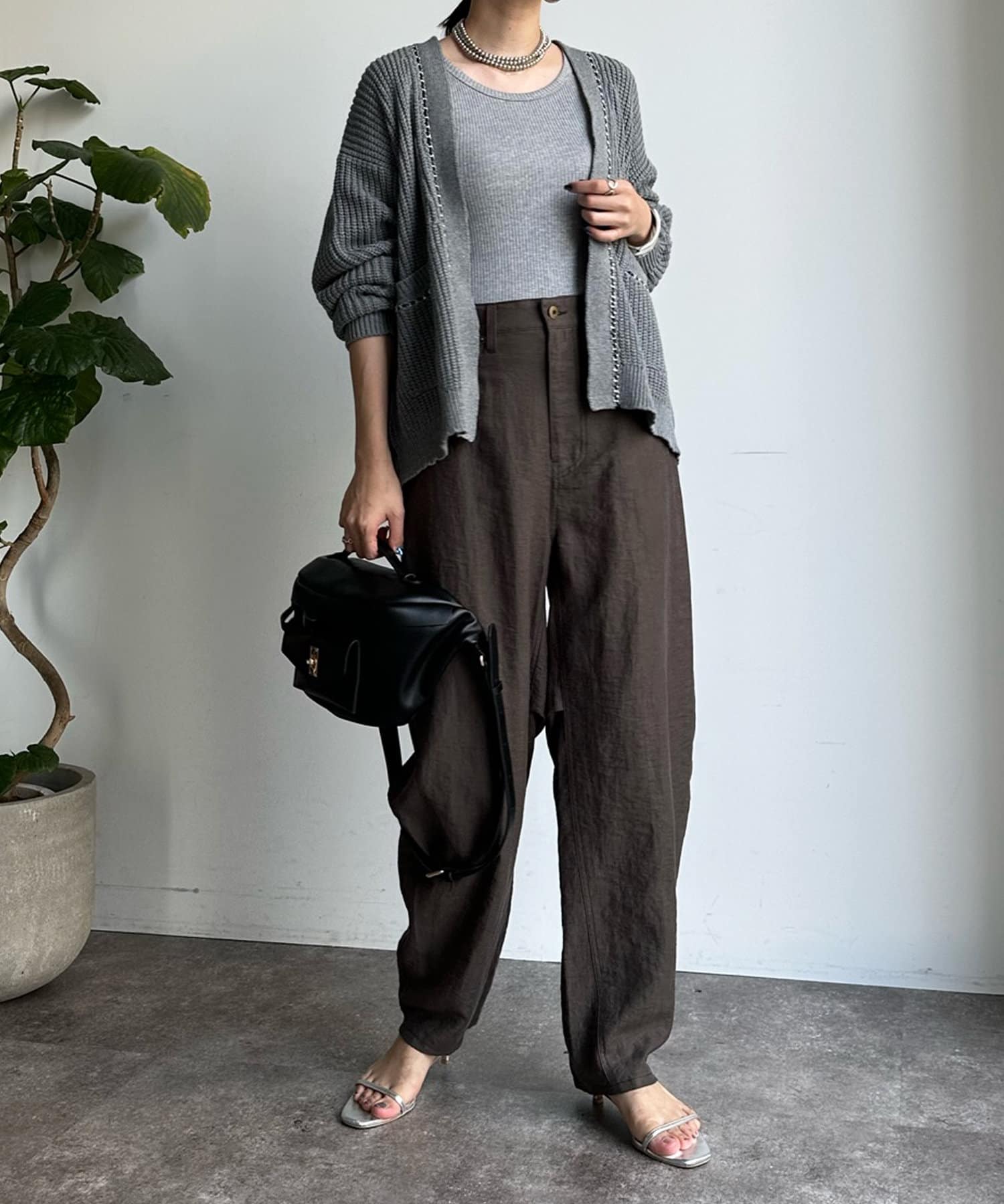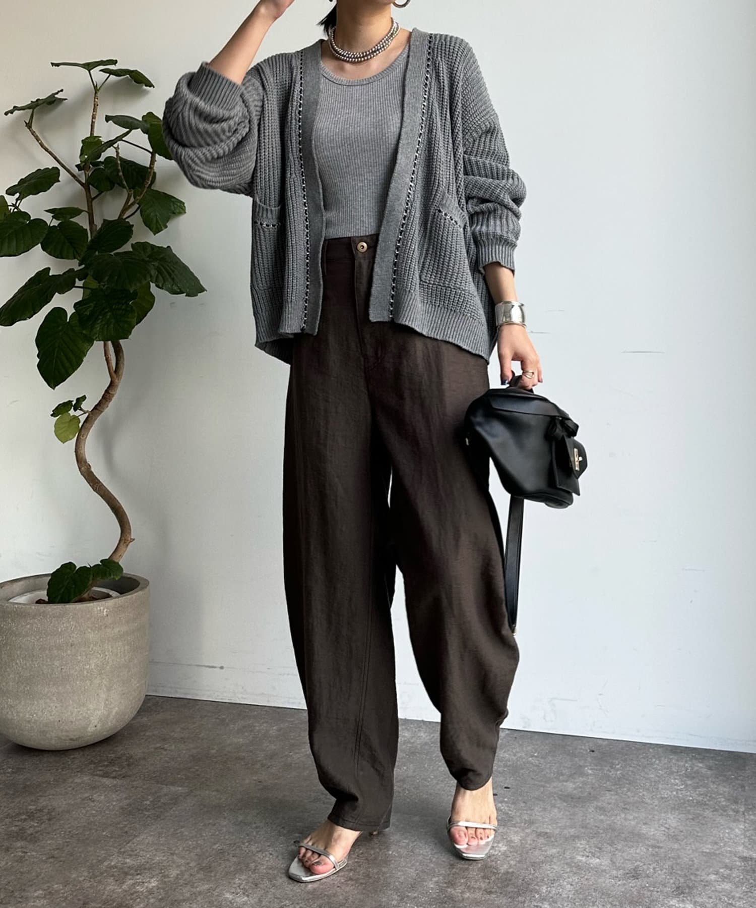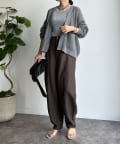 長すぎない丈感と、ボタンレスでさっと羽織りやすいのがうれしいポイントです。