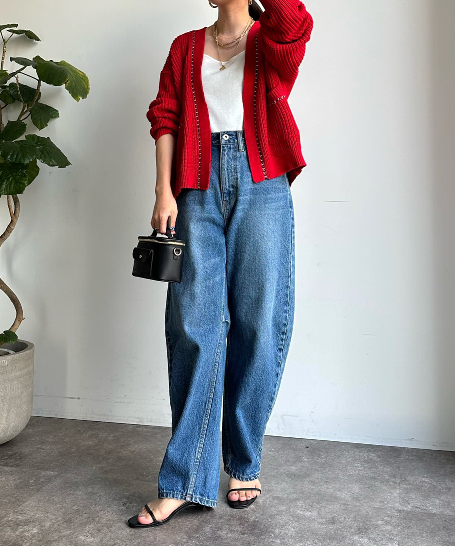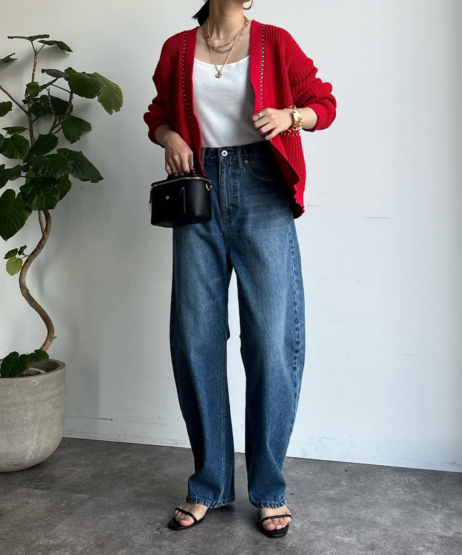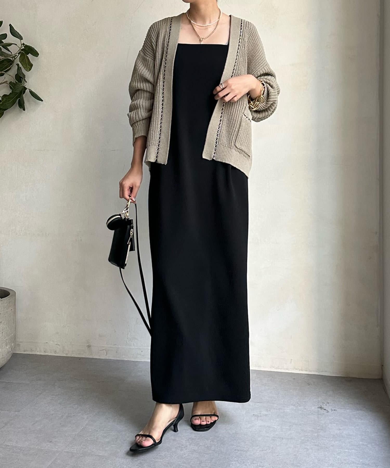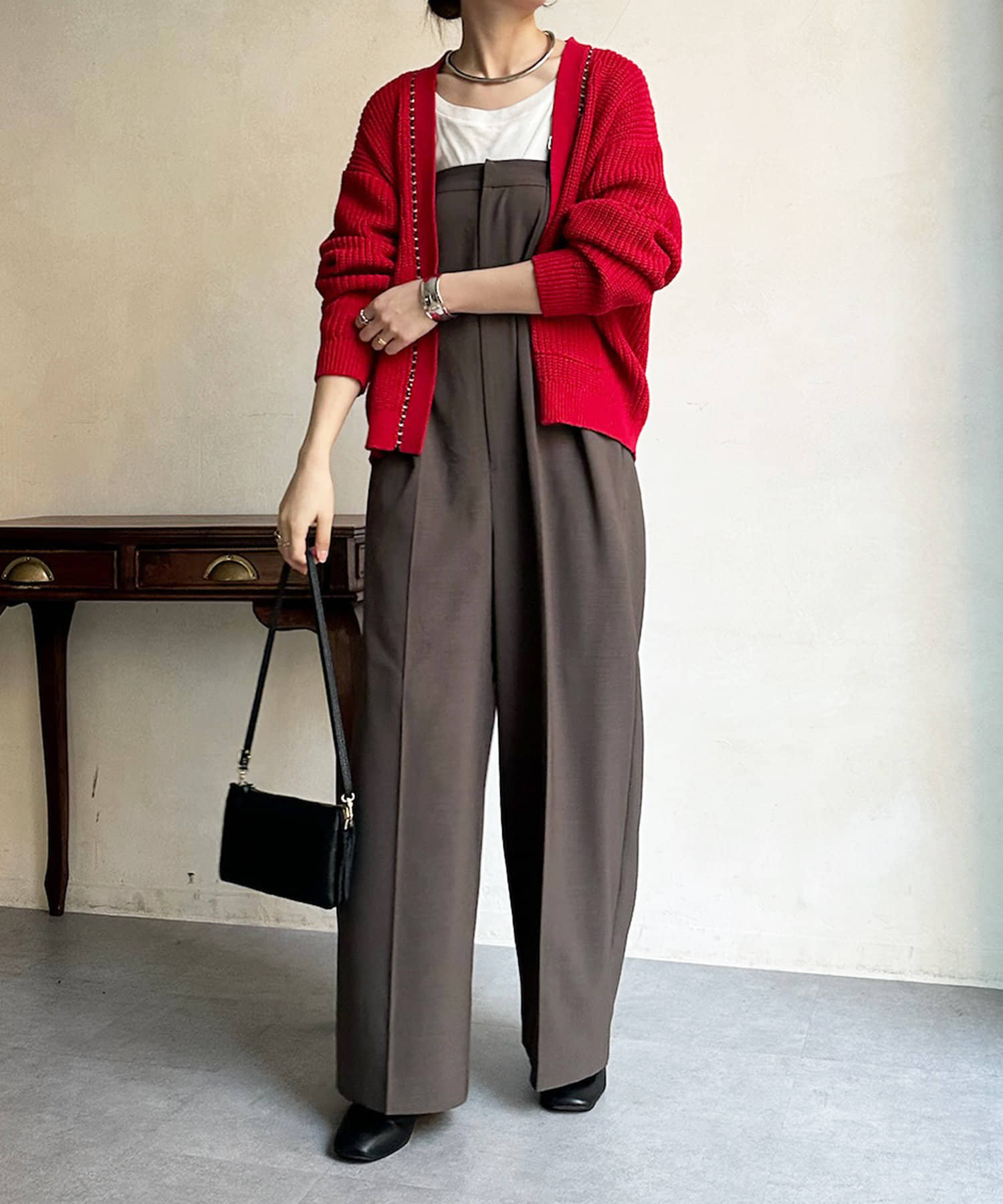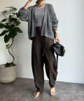 長すぎない丈感と、ボタンレスでさっと羽織りやすいのがうれしいポイントです。