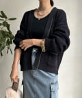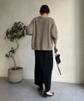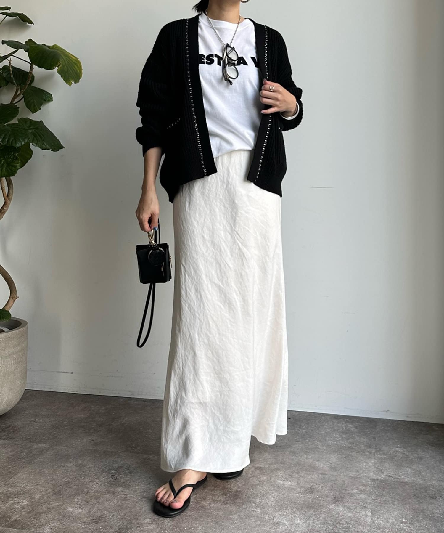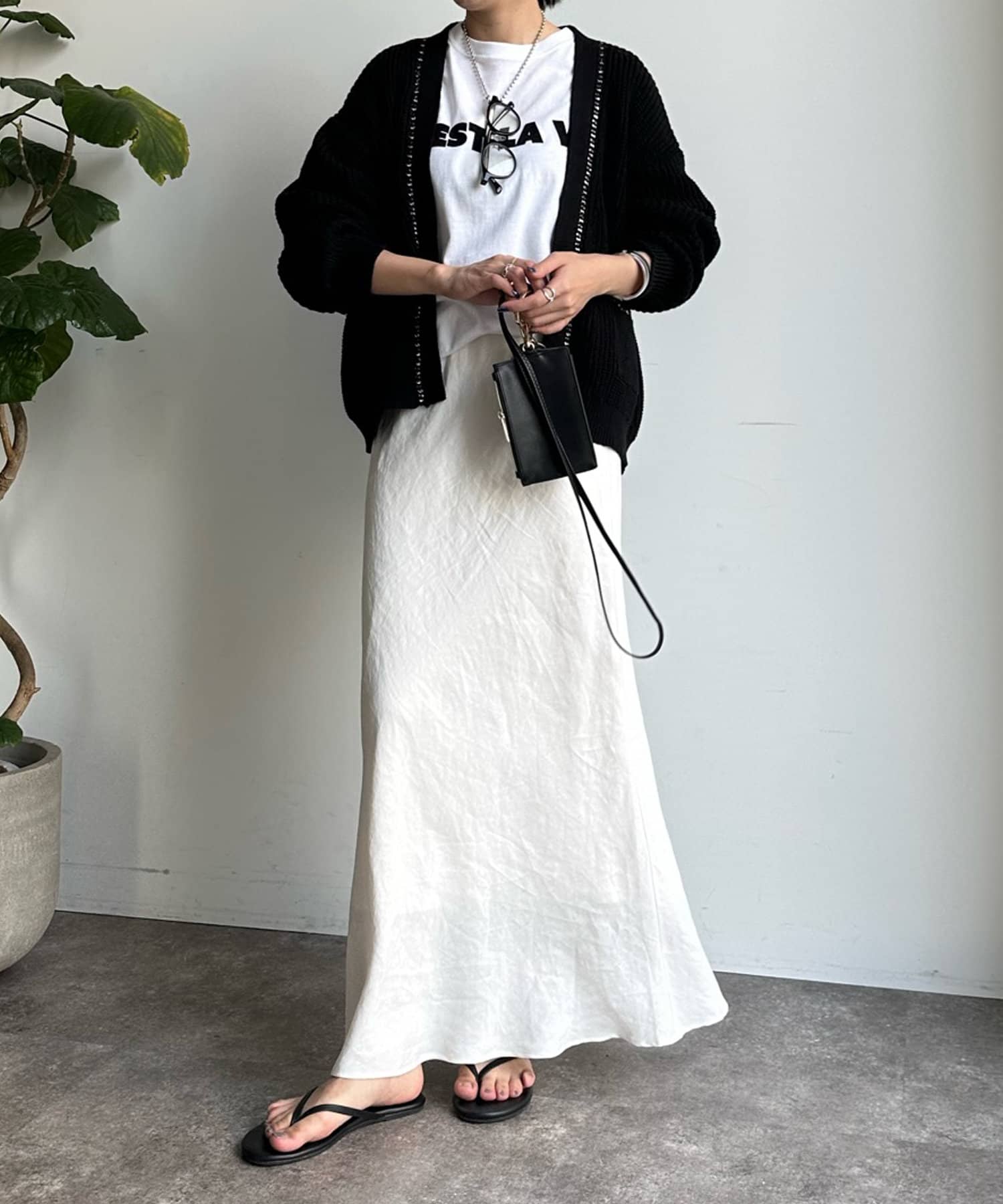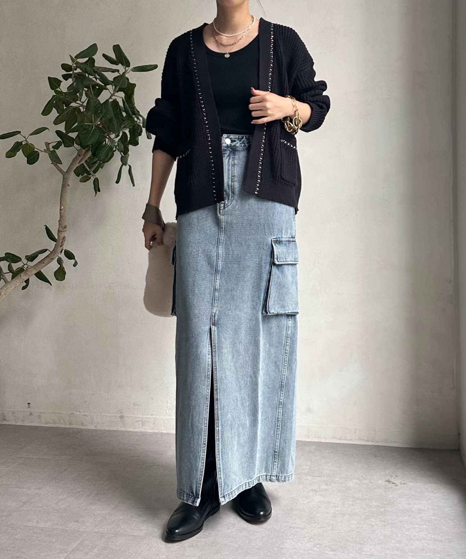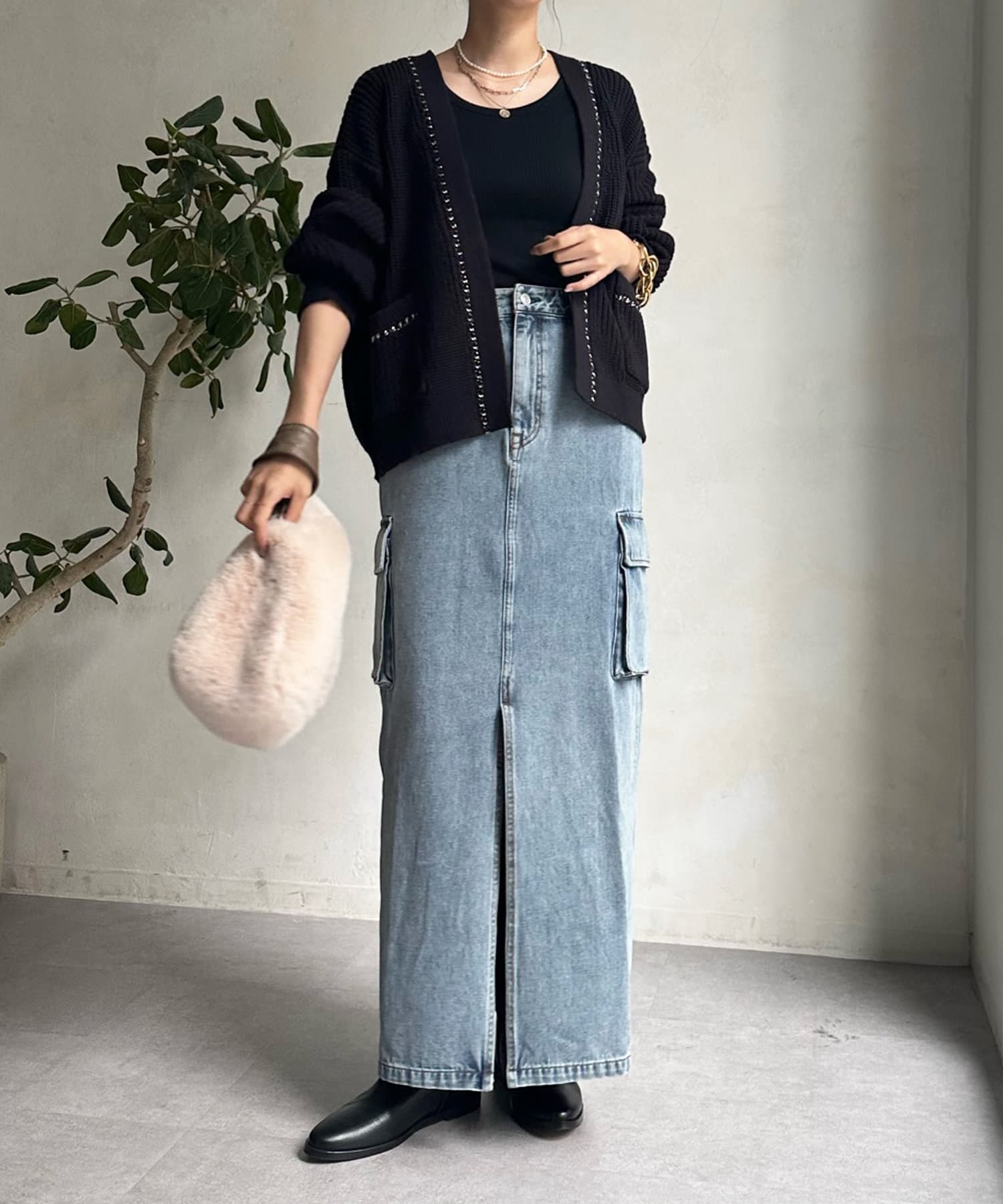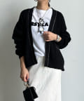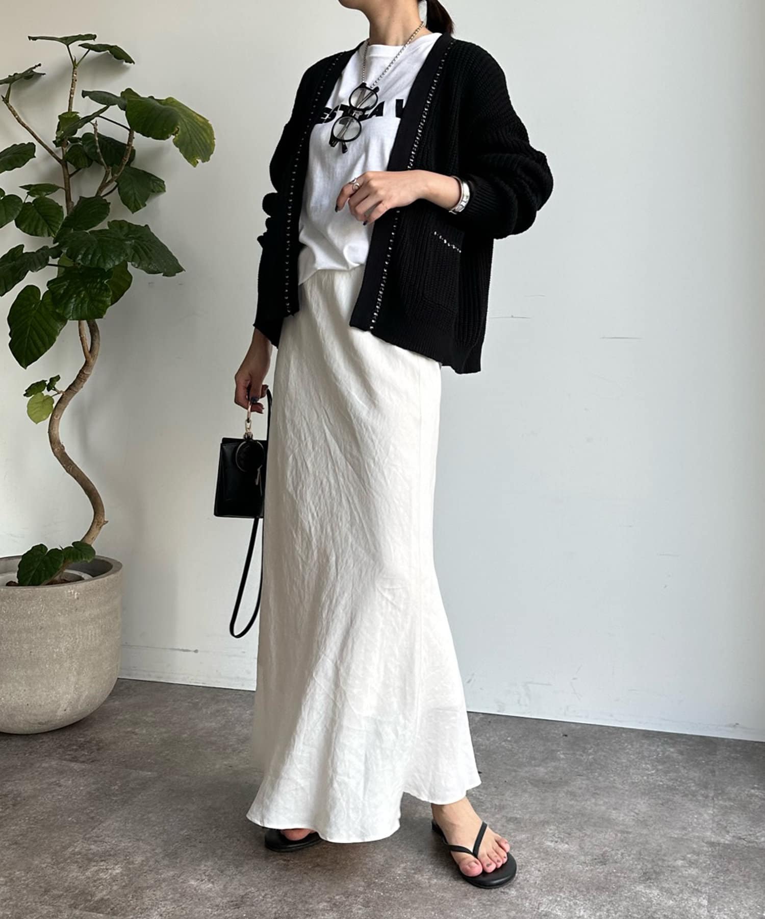 長すぎない丈感と、ボタンレスでさっと羽織りやすいのがうれしいポイントです。