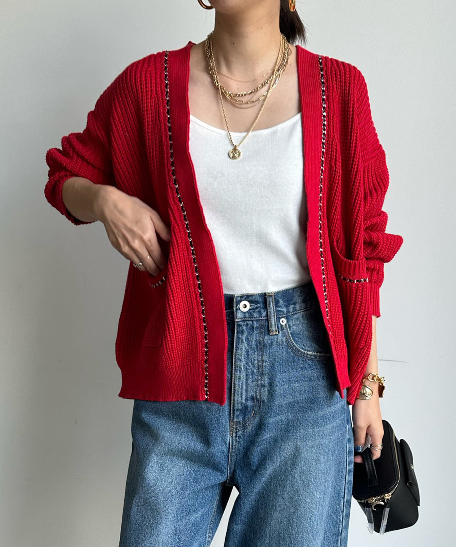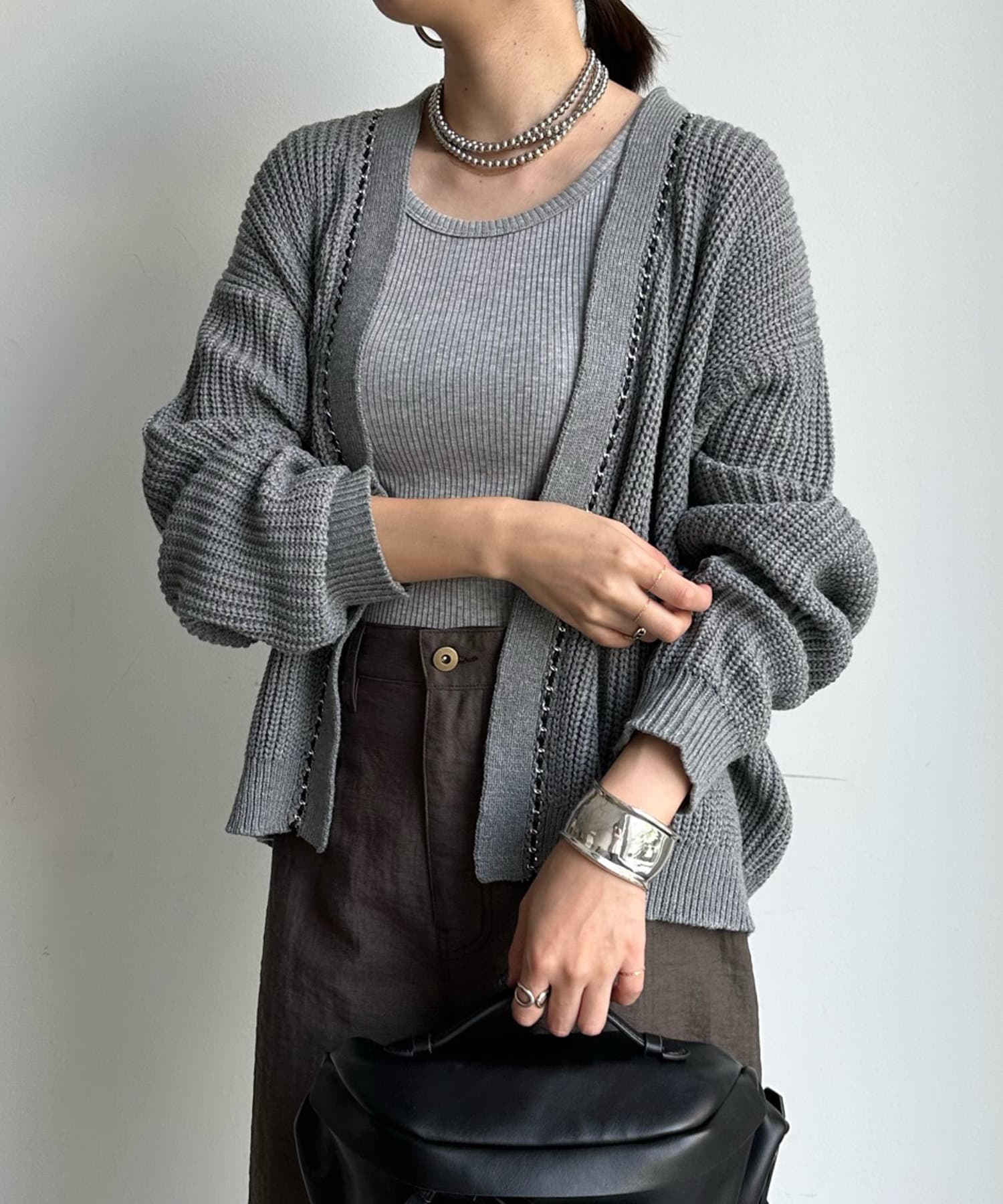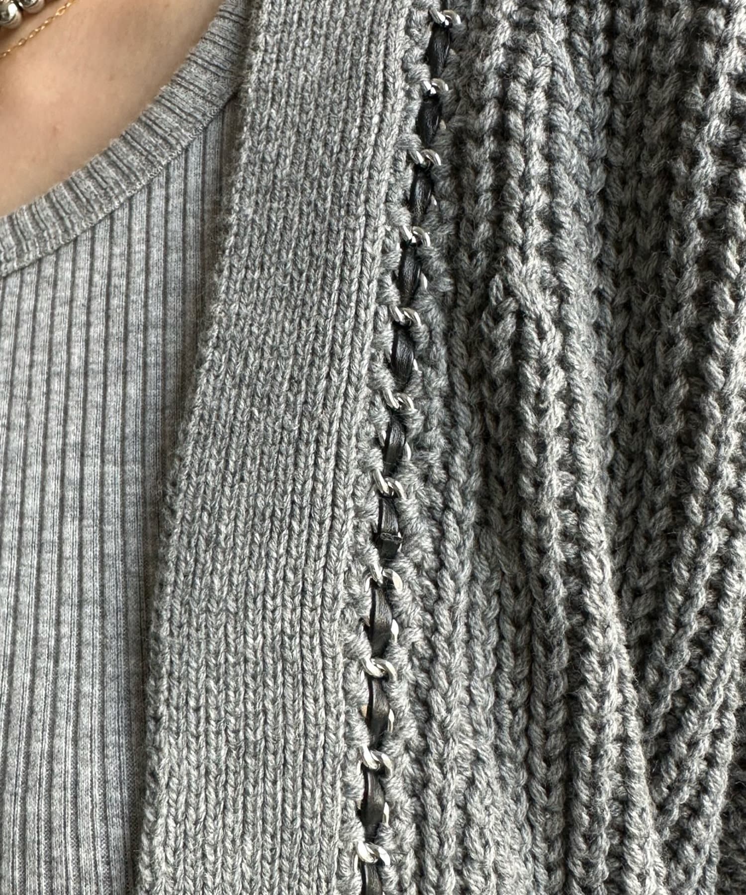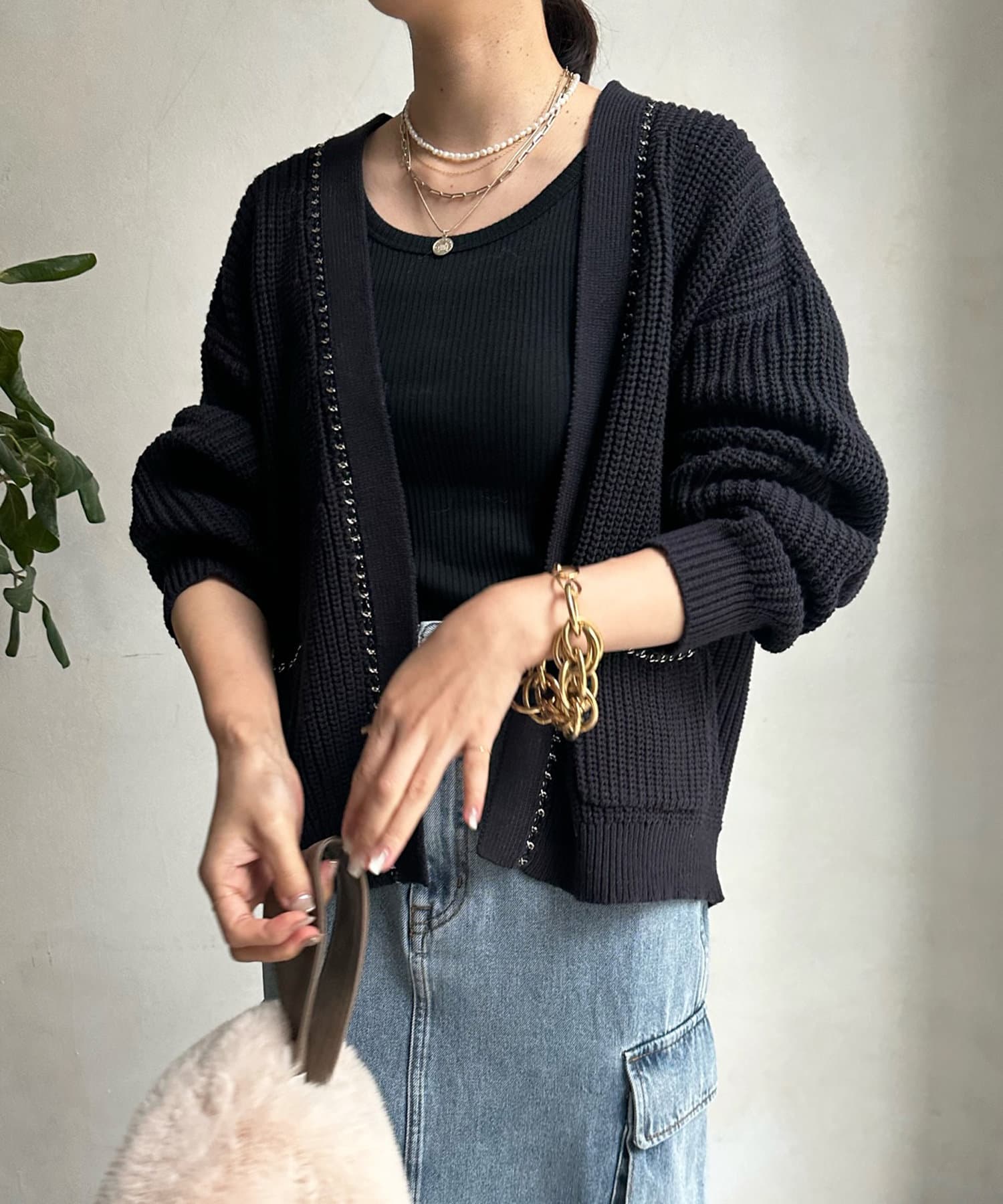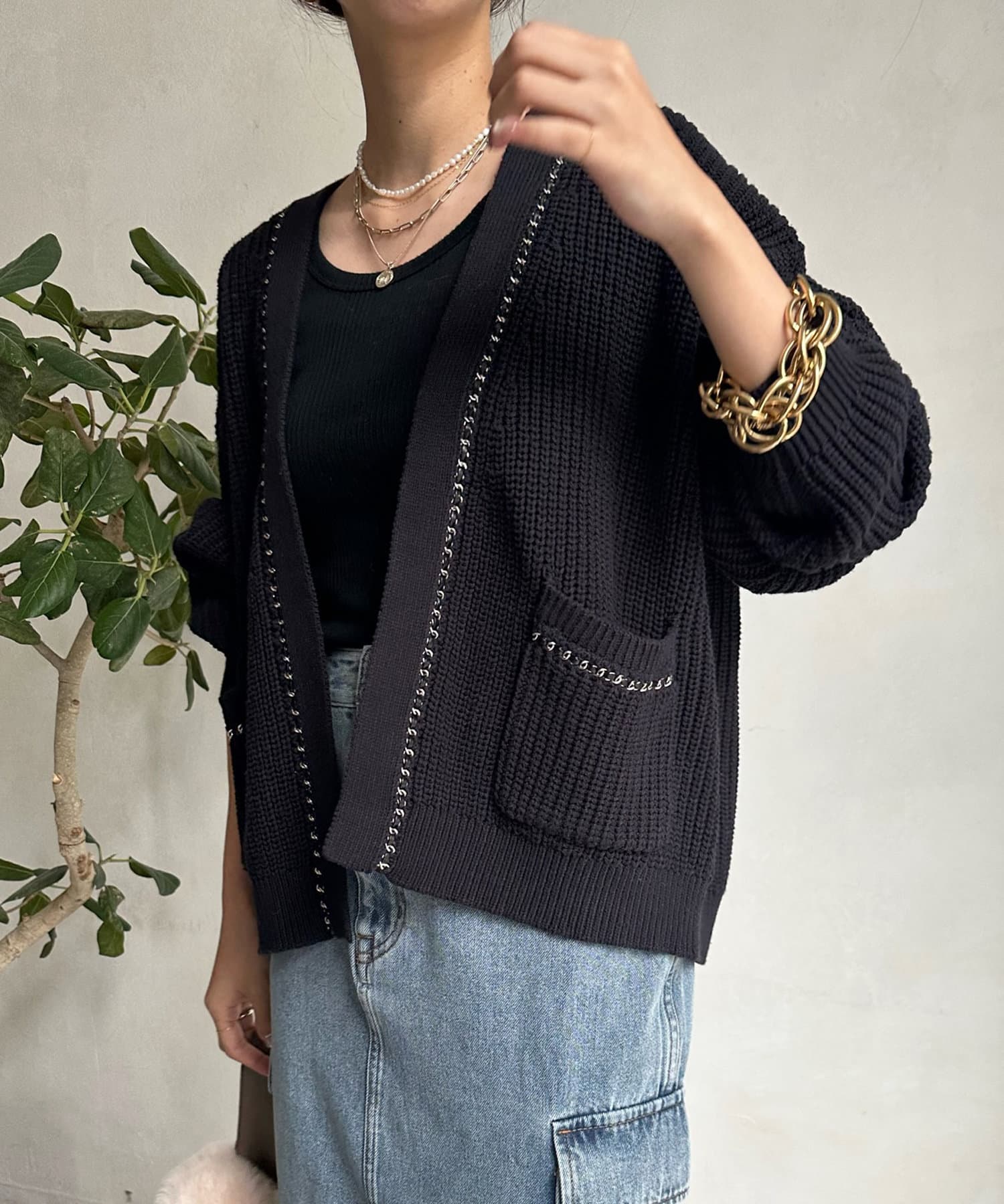 首元からフロントにかけて連なったチェーンのデザインがポイントのカーディガン。