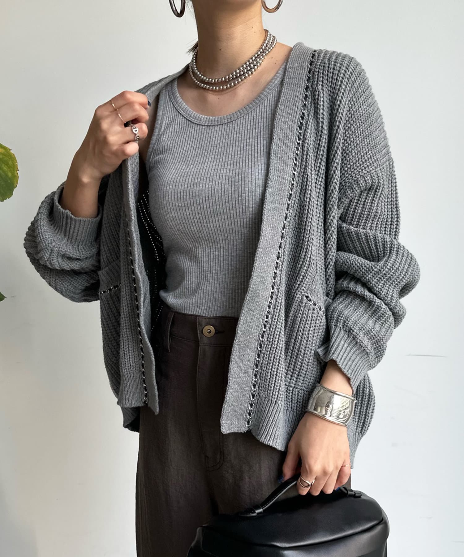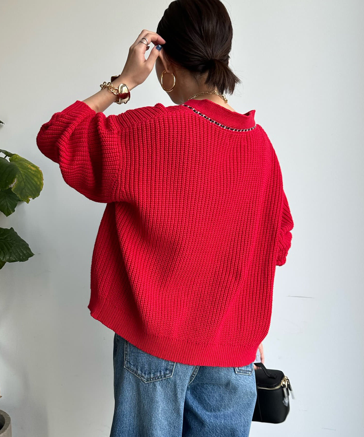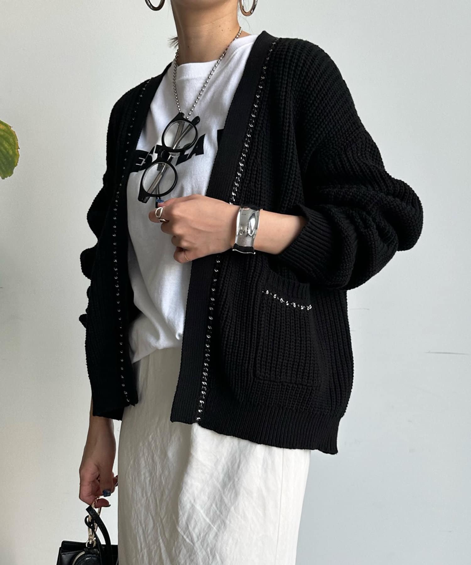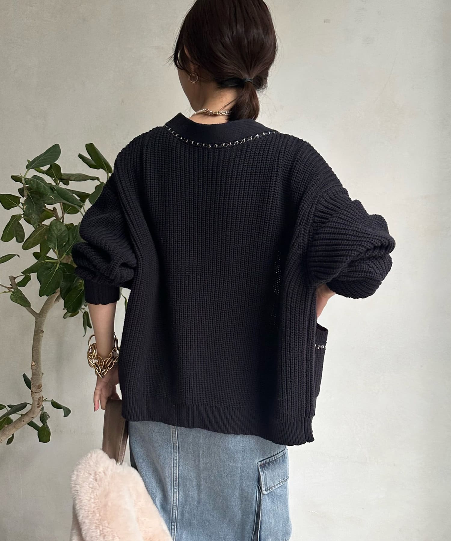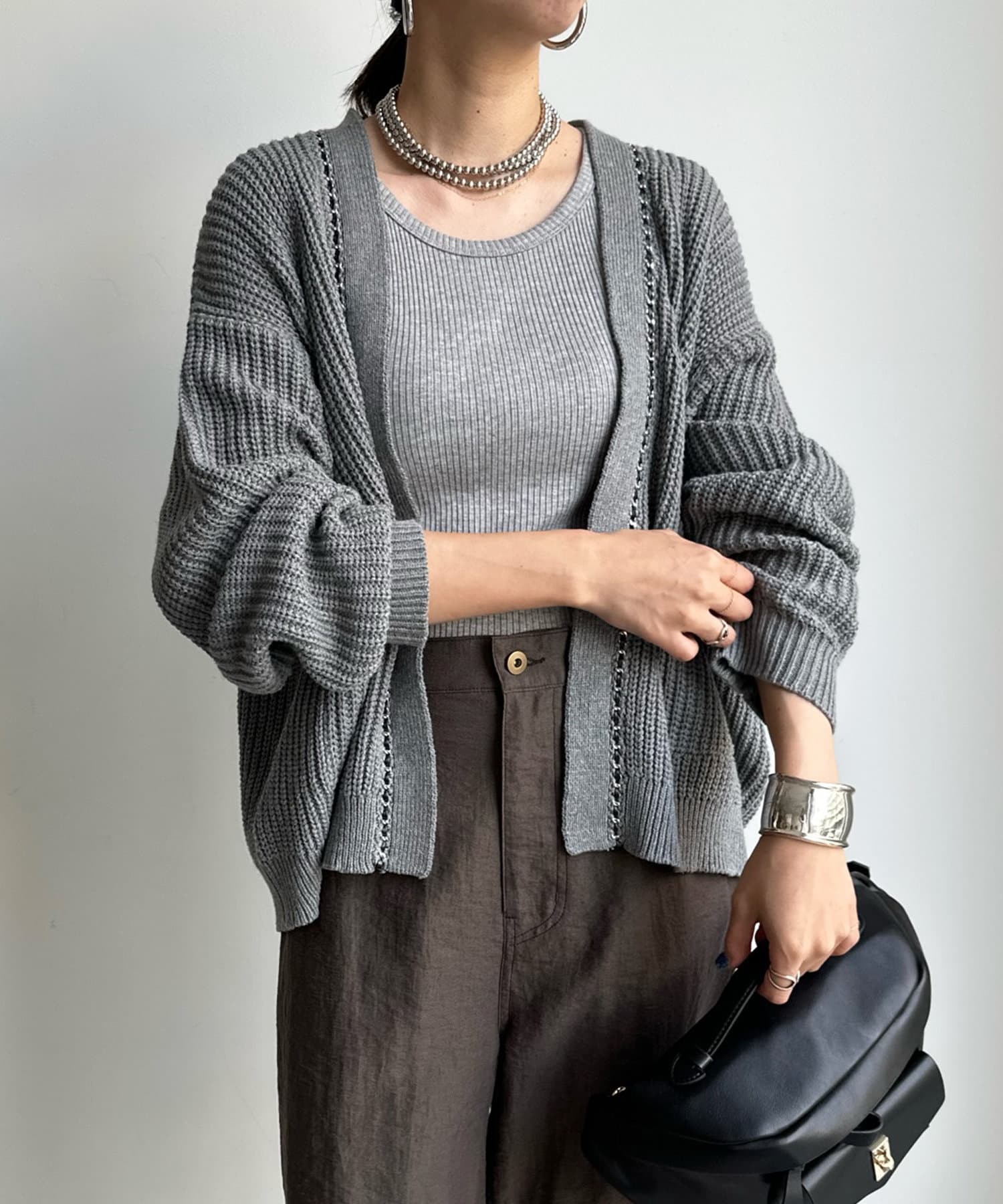 首元からフロントにかけて連なったチェーンのデザインがポイントのカーディガン。
