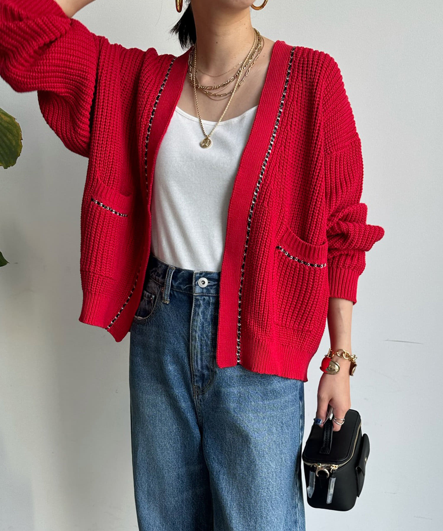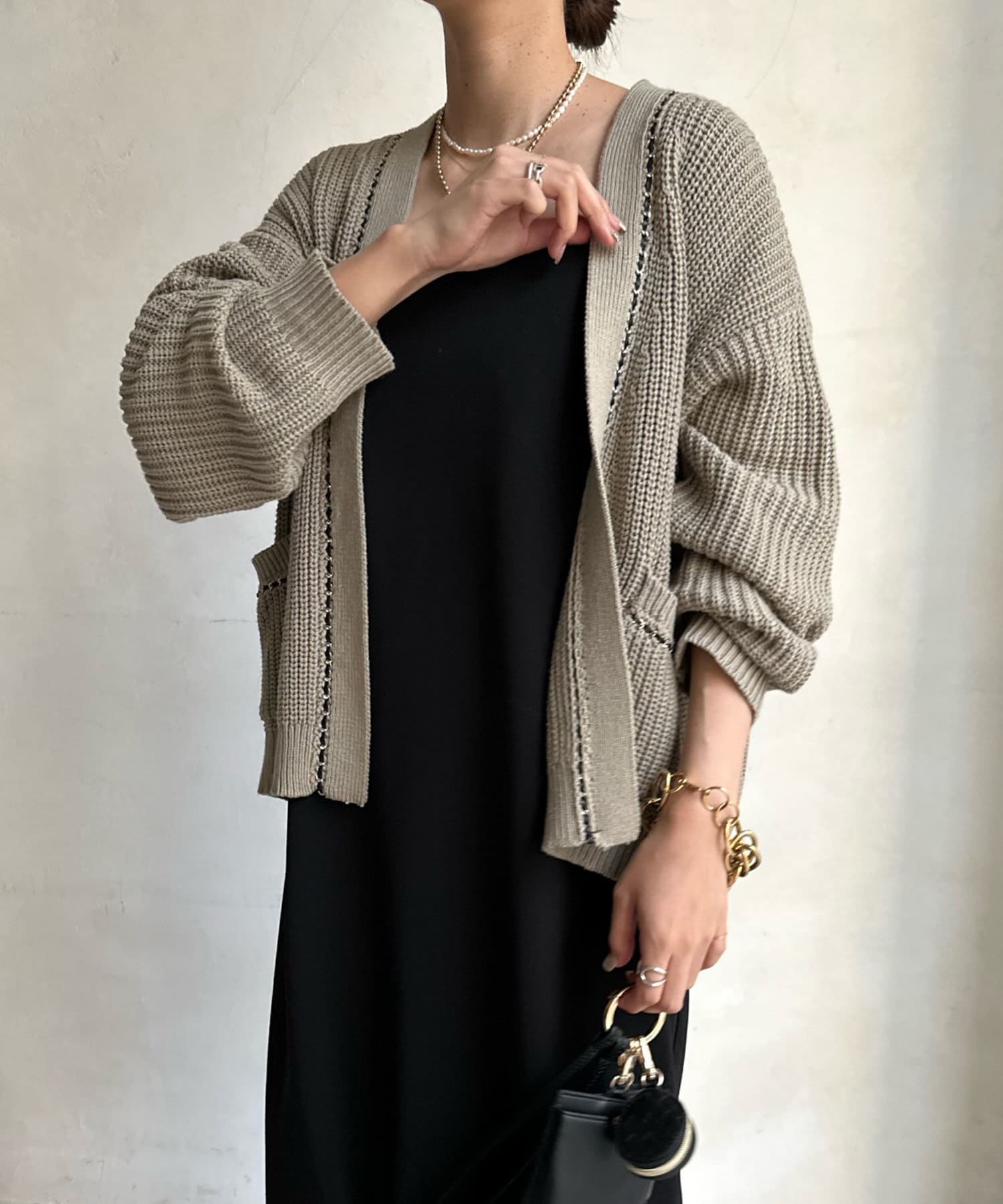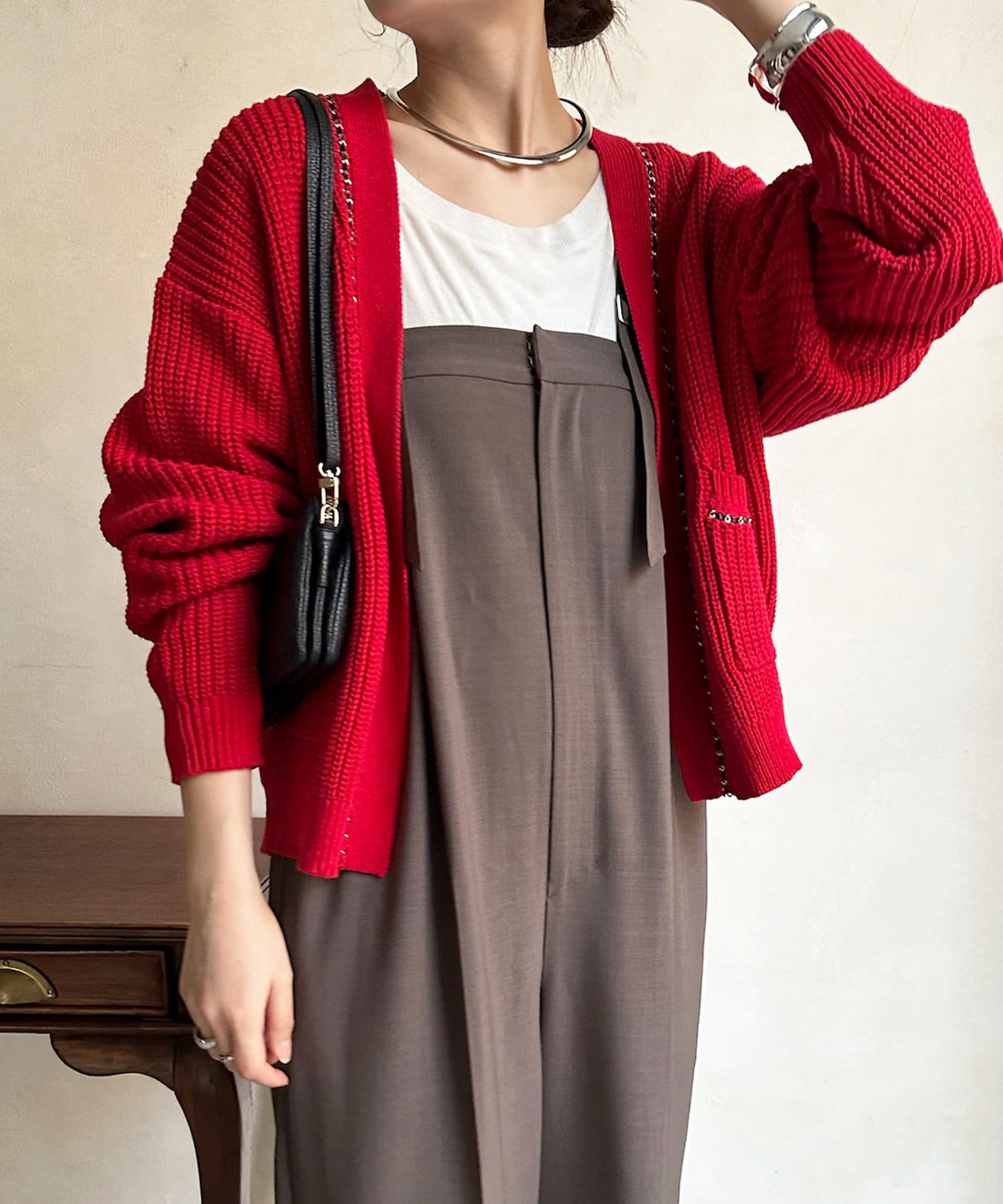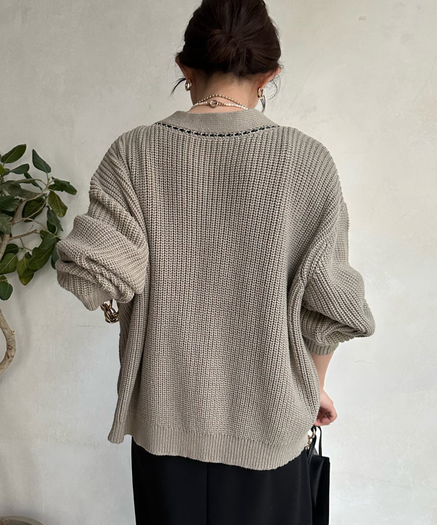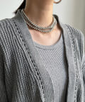 首元からフロントにかけて連なったチェーンのデザインがポイントのカーディガン。