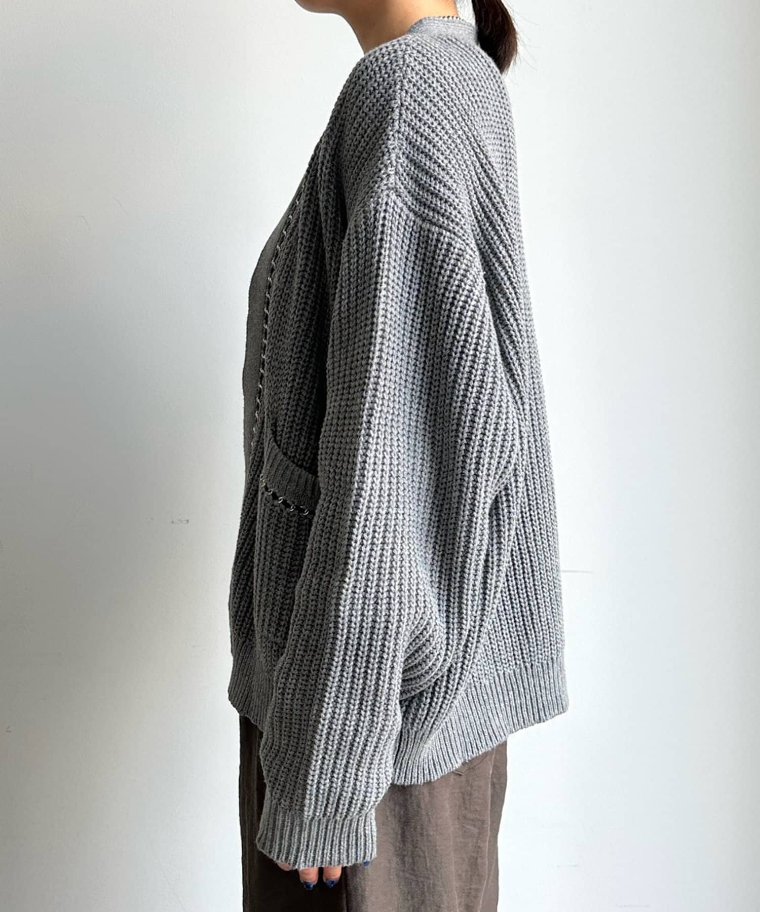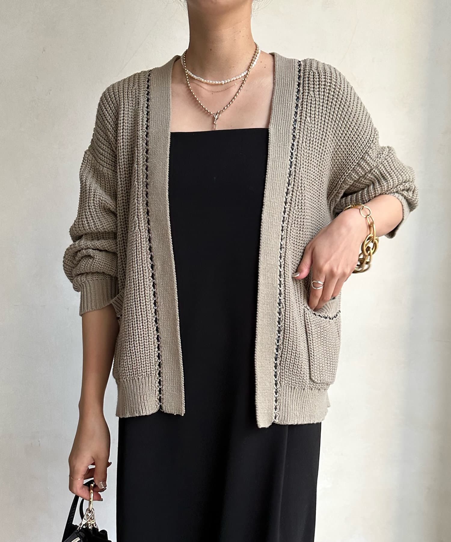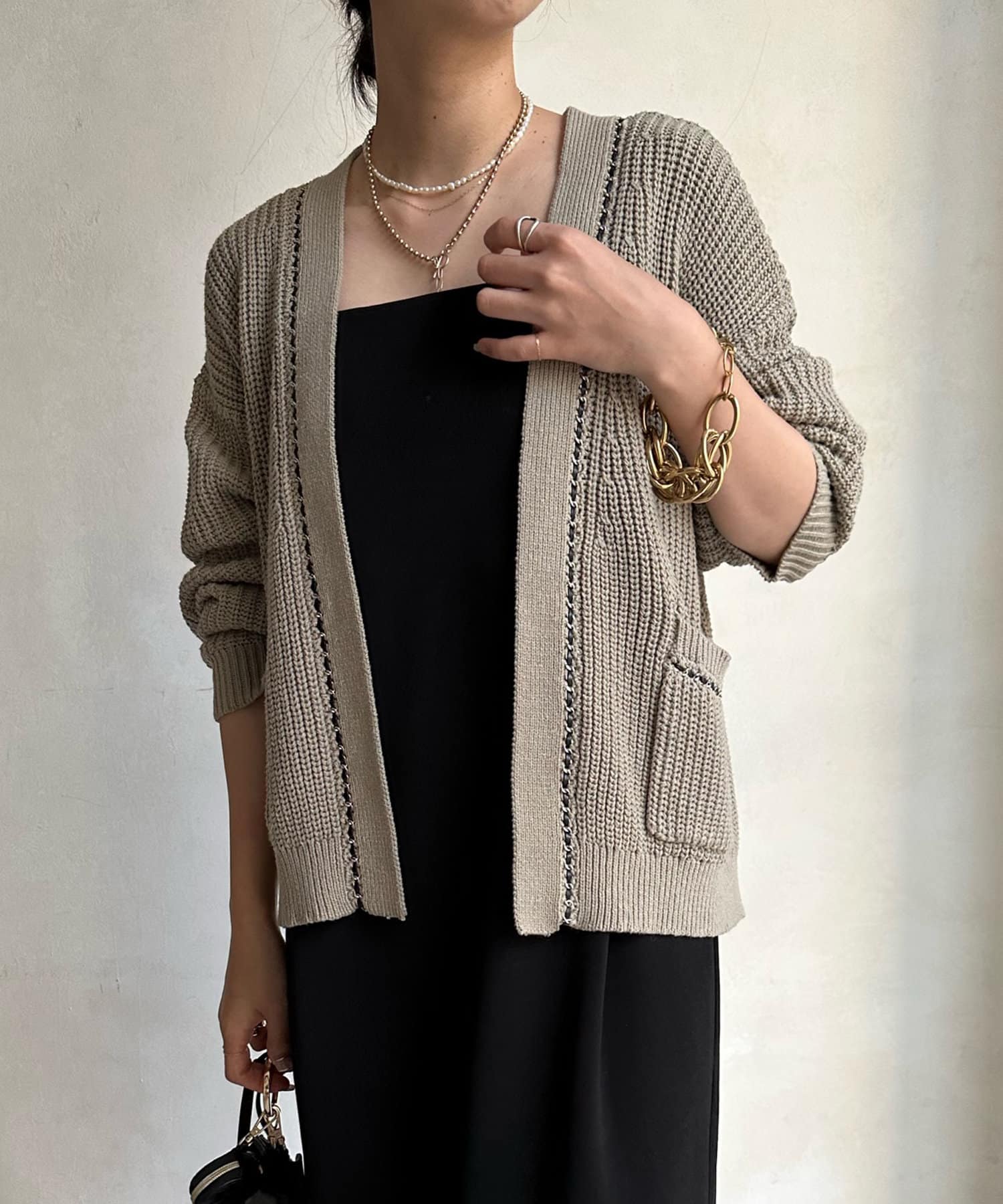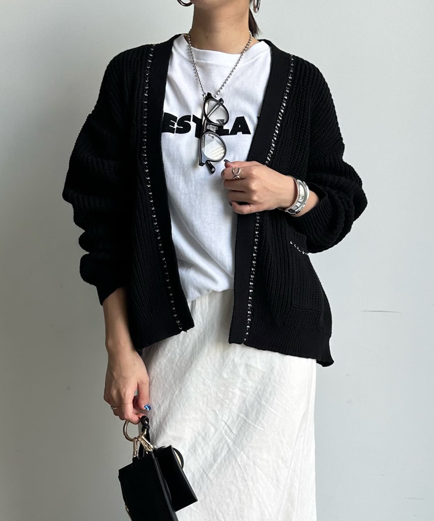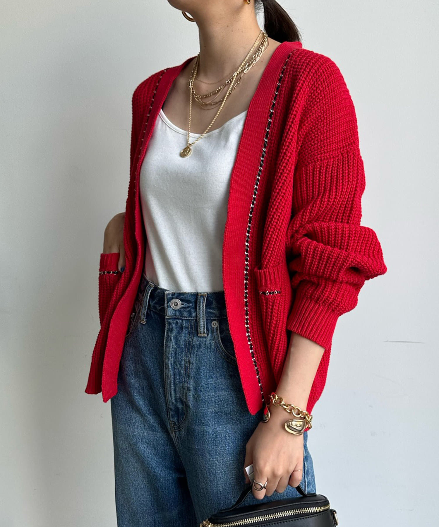 首元からフロントにかけて連なったチェーンのデザインがポイントのカーディガン。