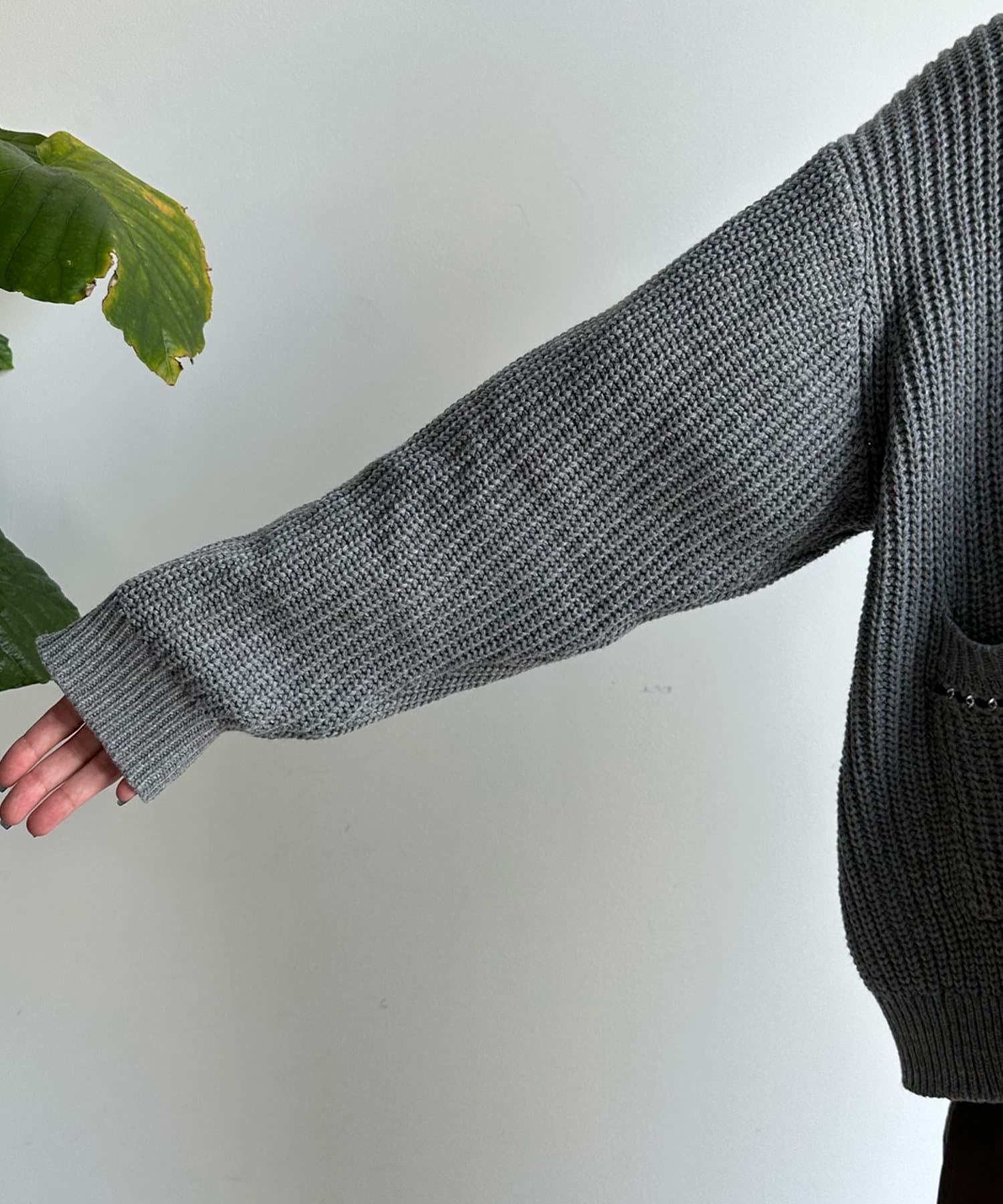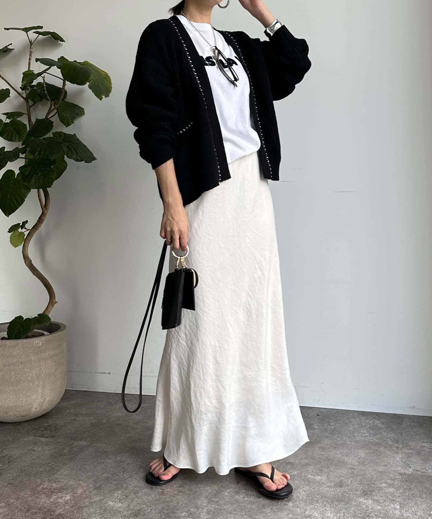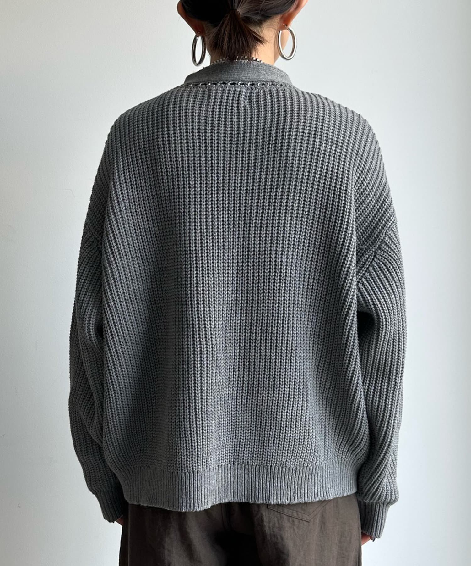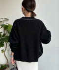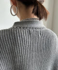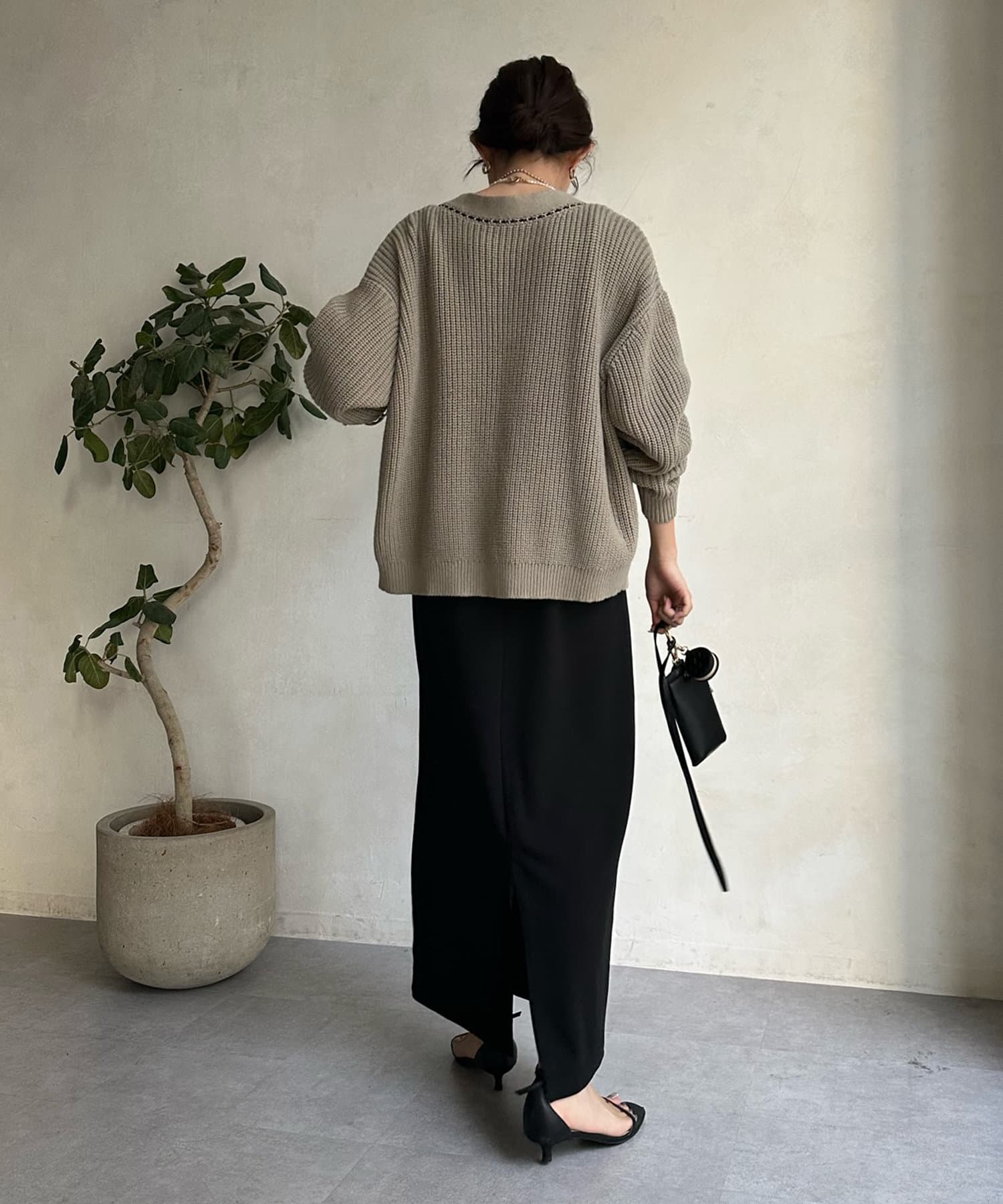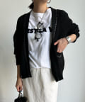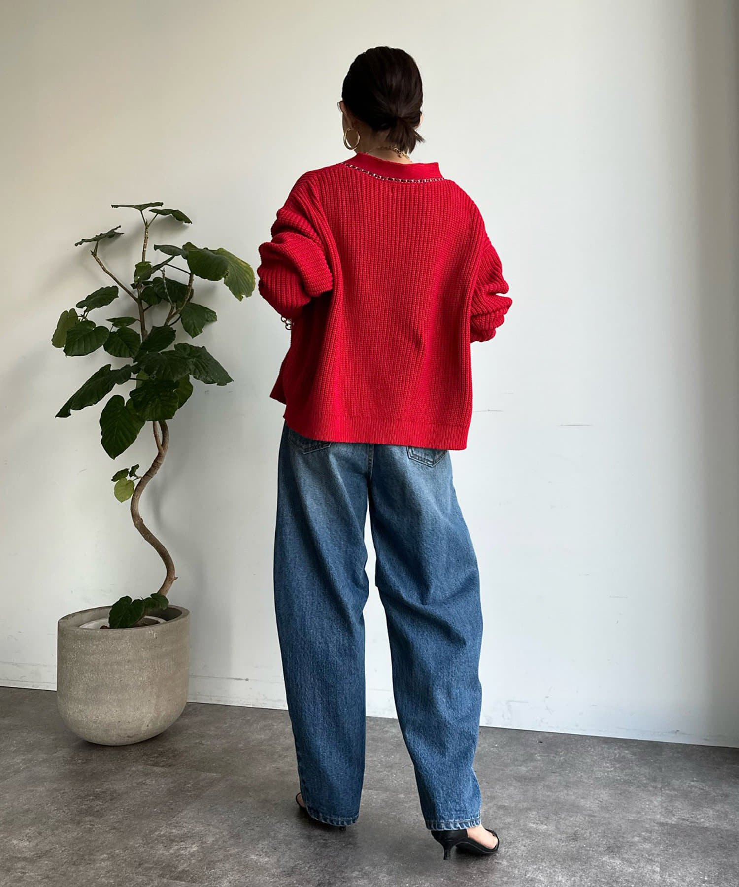 首元からフロントにかけて連なったチェーンのデザインがポイントのカーディガン。