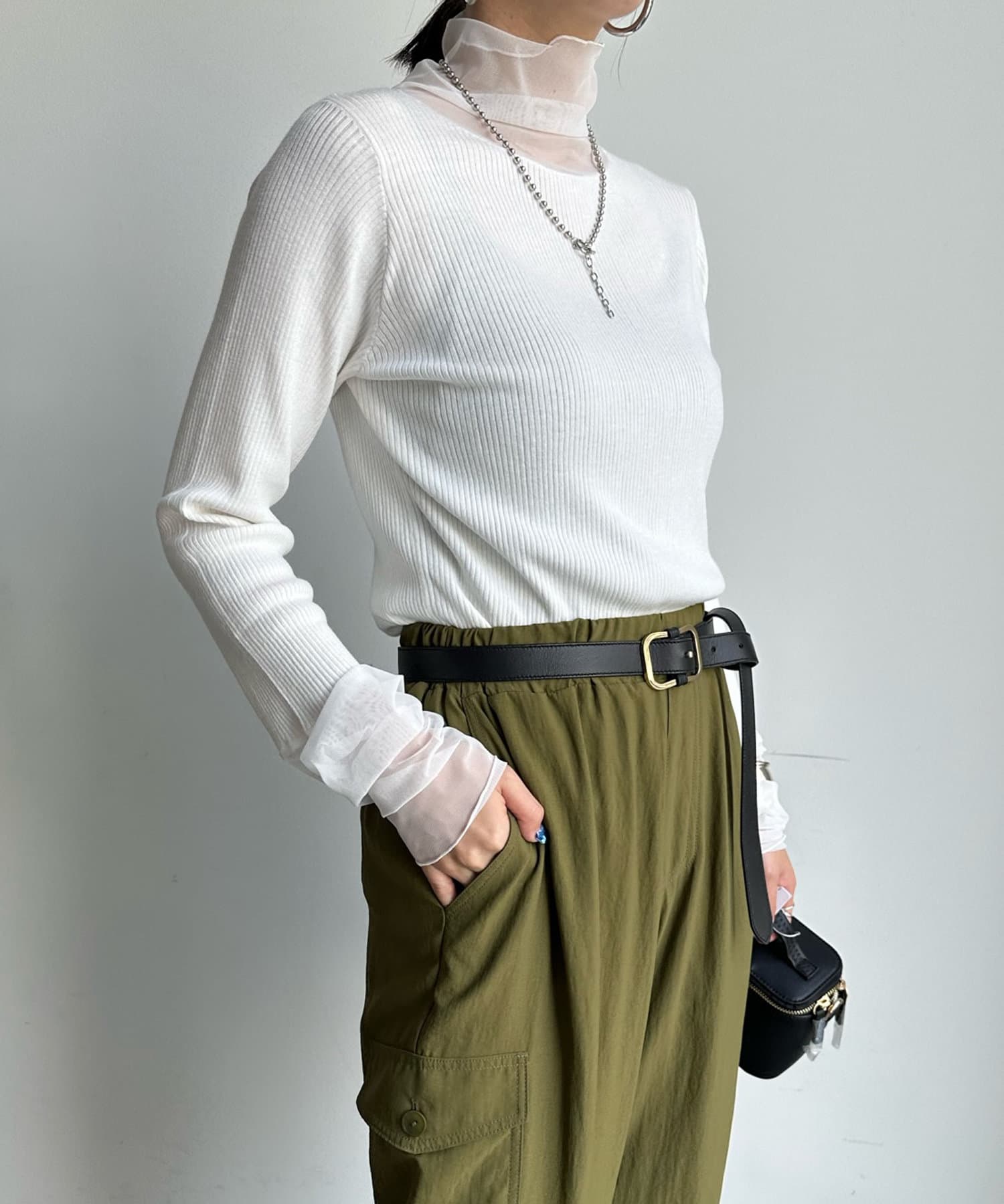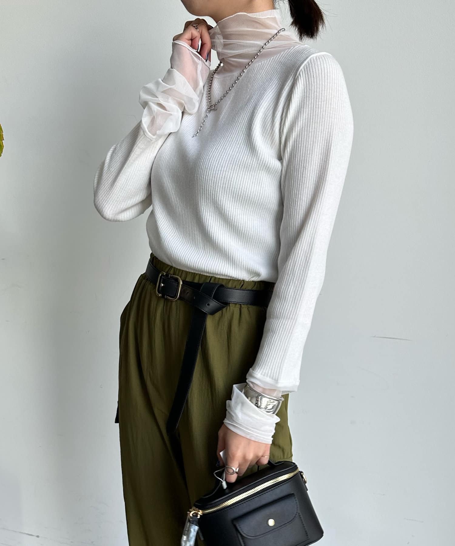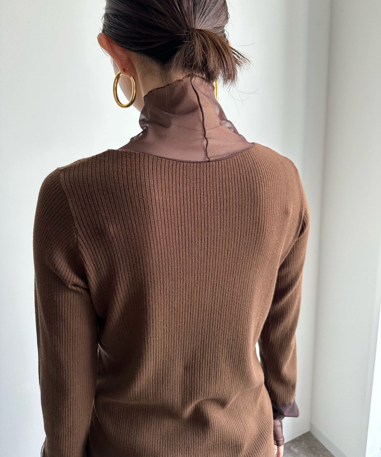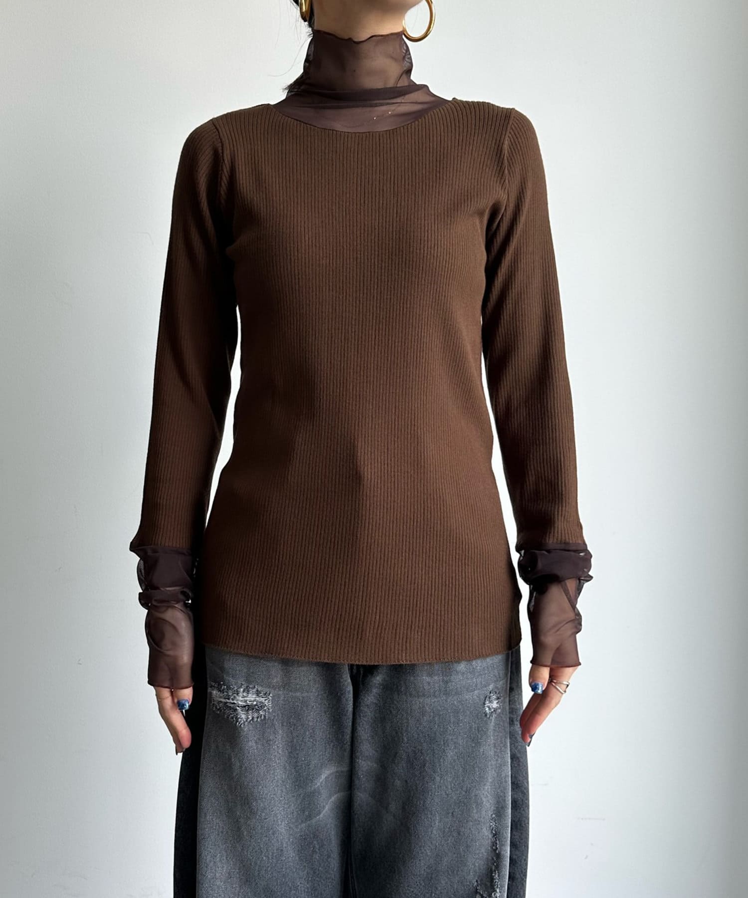 タートル部分と袖を薄手のチュールに切り替えたニットが登場!