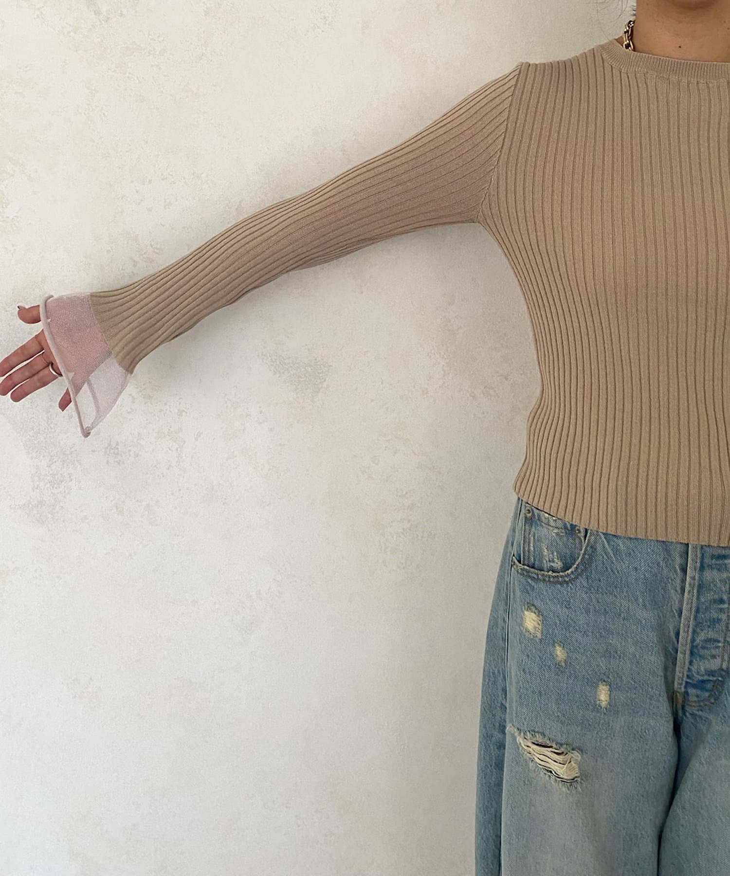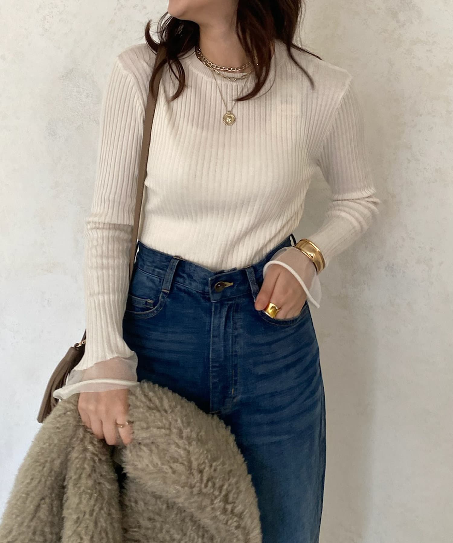 シンプルなデザインの中に広がった袖シアーがあるため女性らしさを演出!
