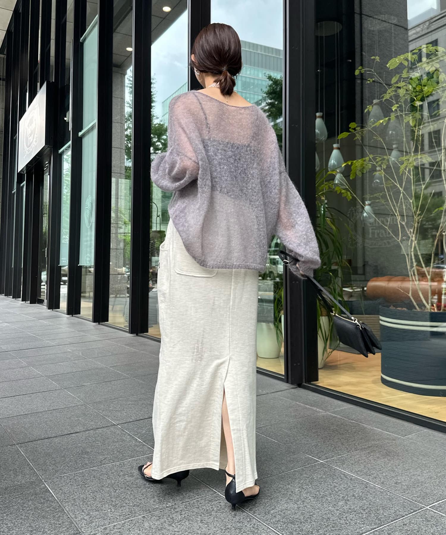詰まりすぎないネックラインが抜け感のある印象をプラスし、お顔周りの印象もすっきり。