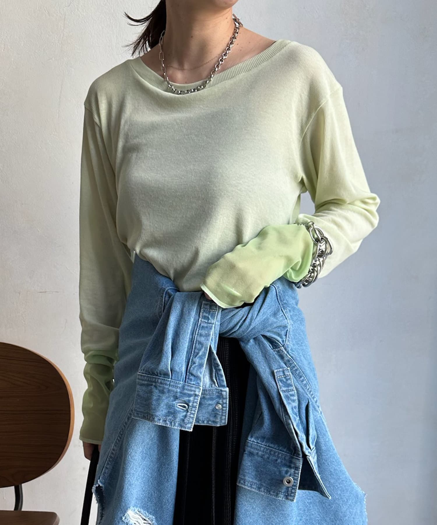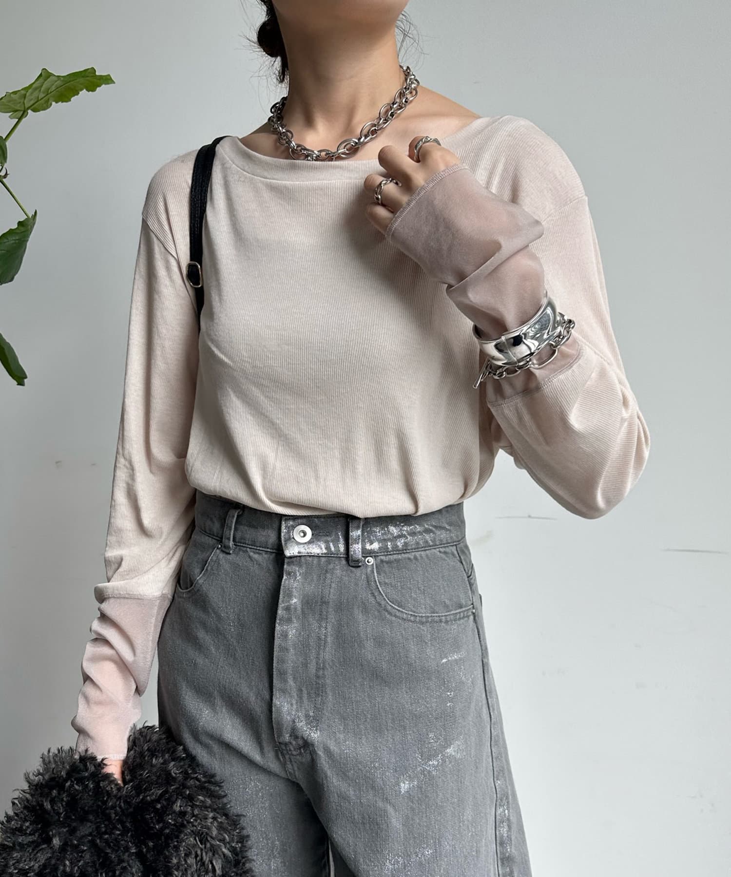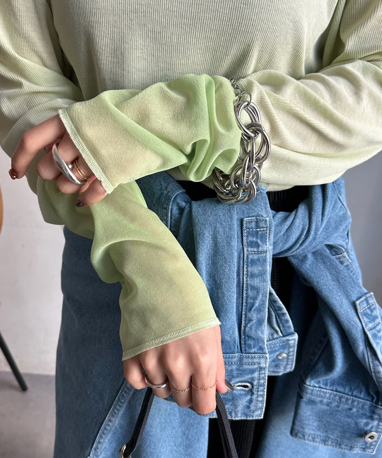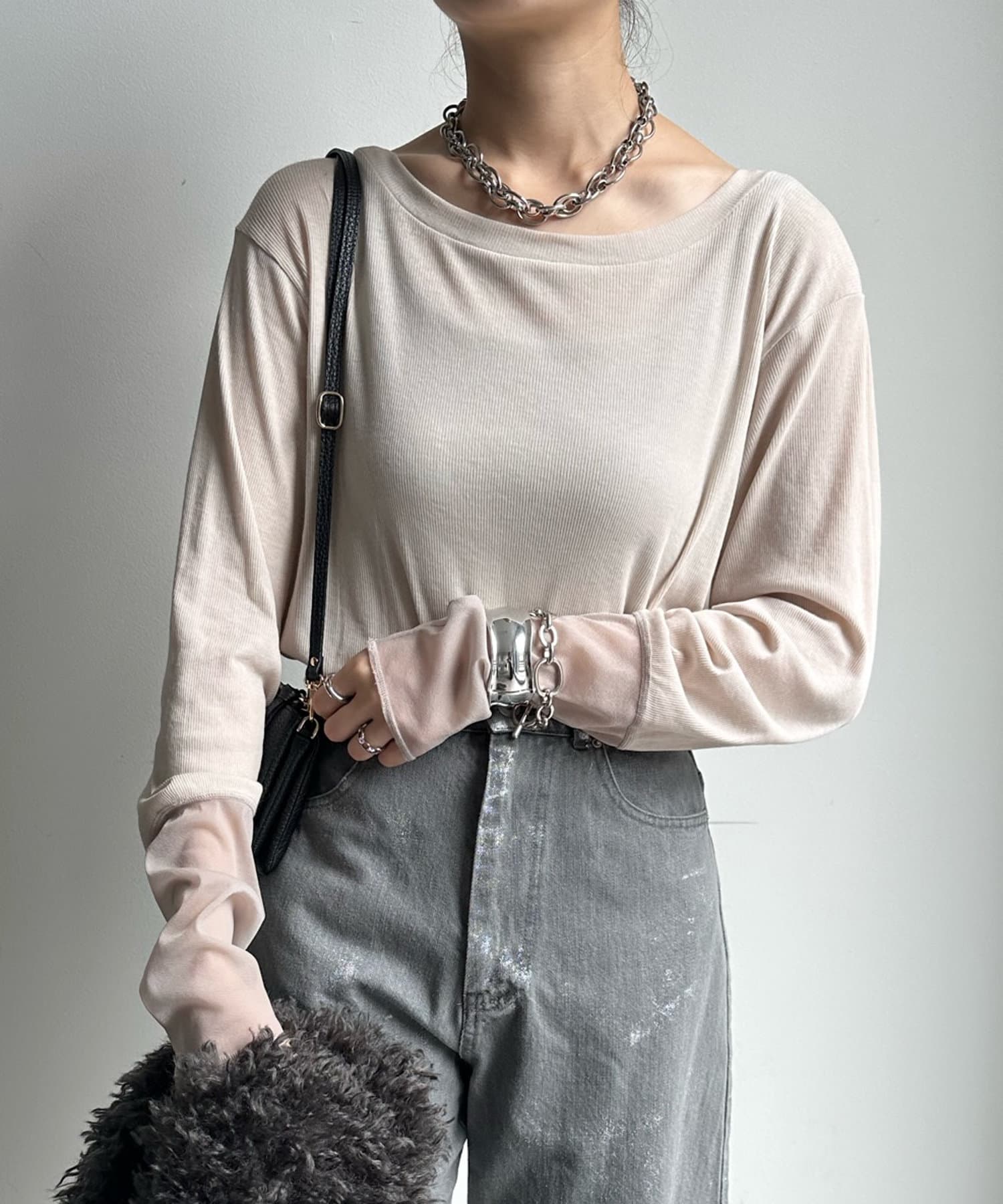 伸びやかなリブ素材をベースに、お袖はトレンド感のあるシアー素材に切り替え。