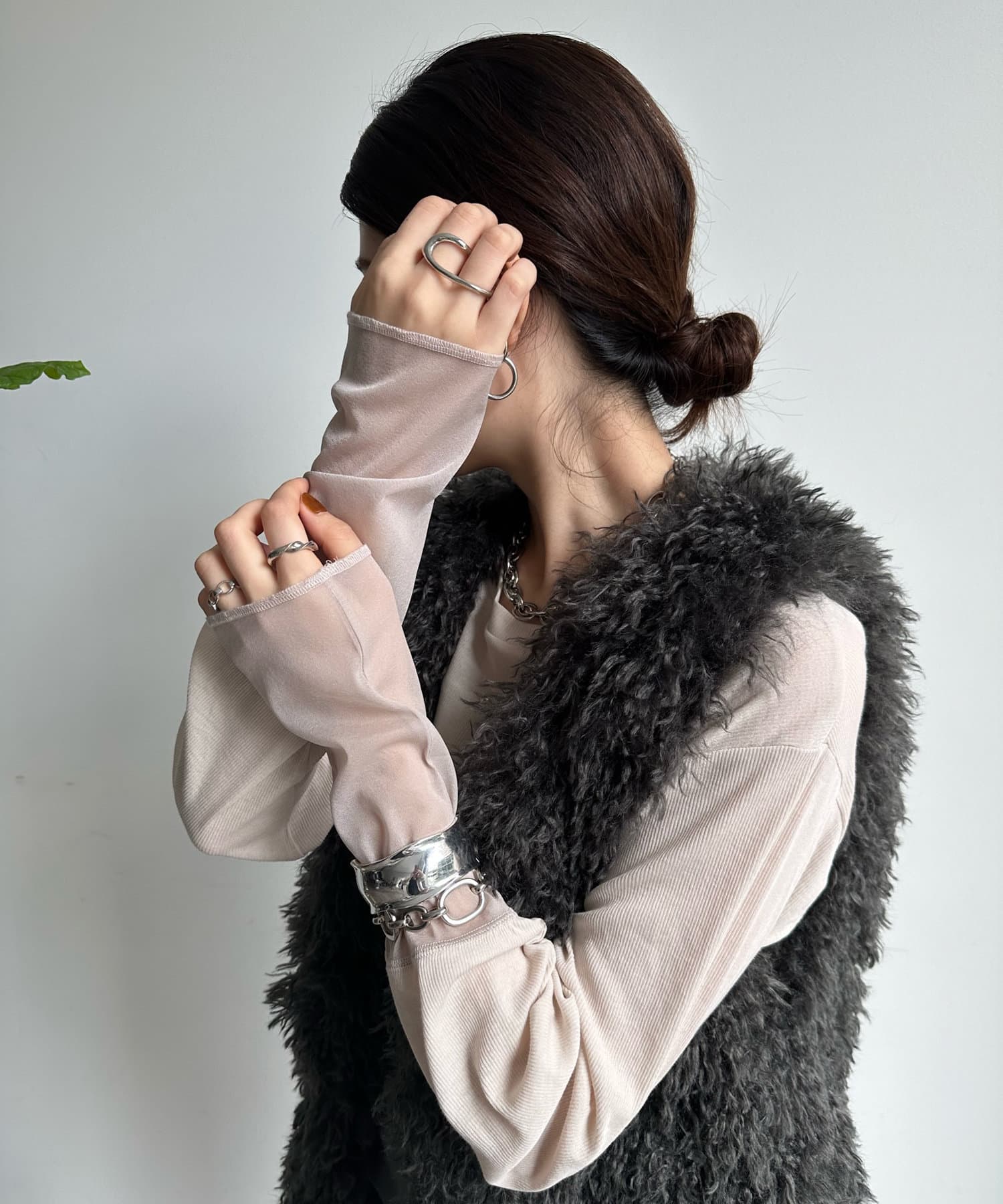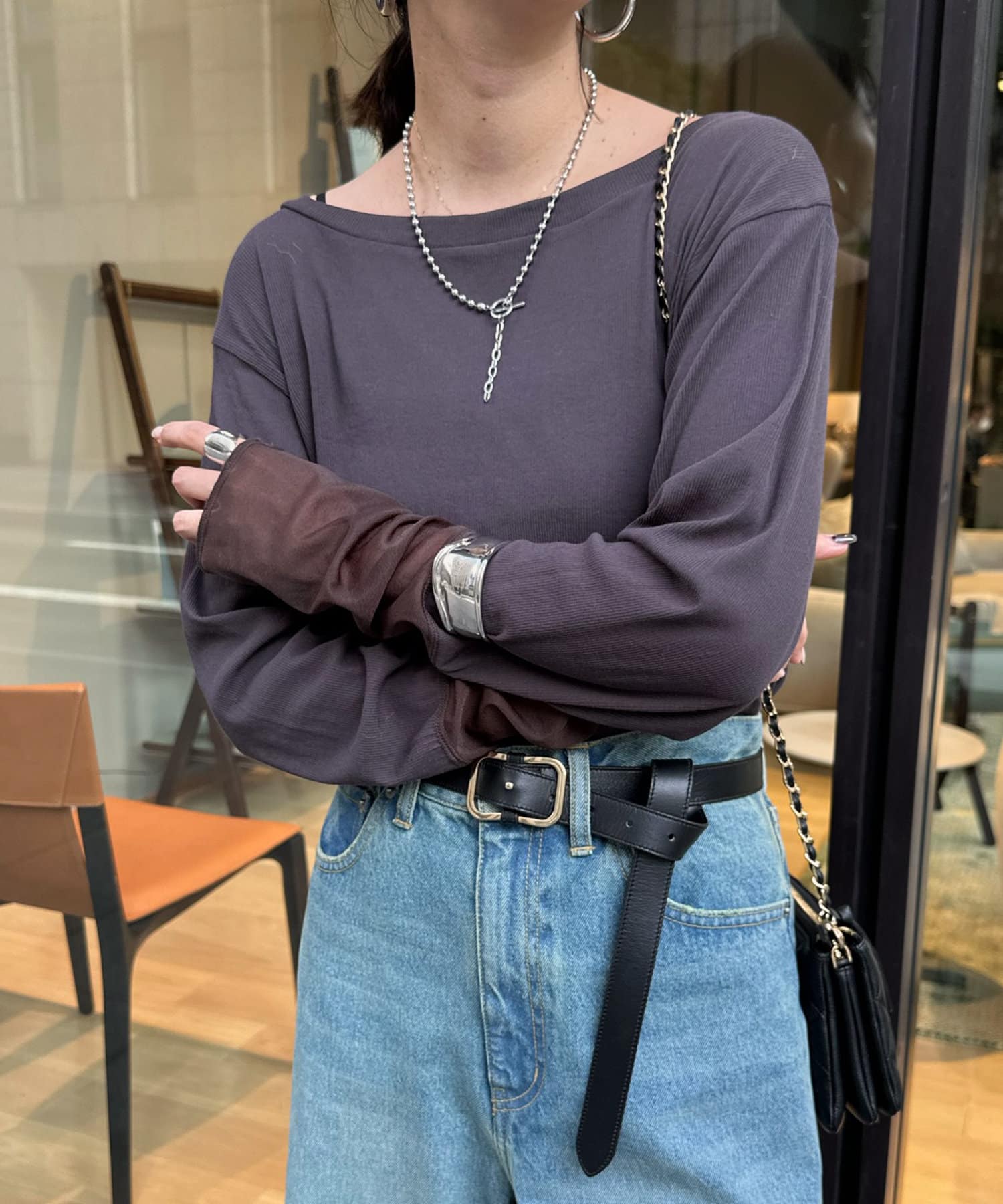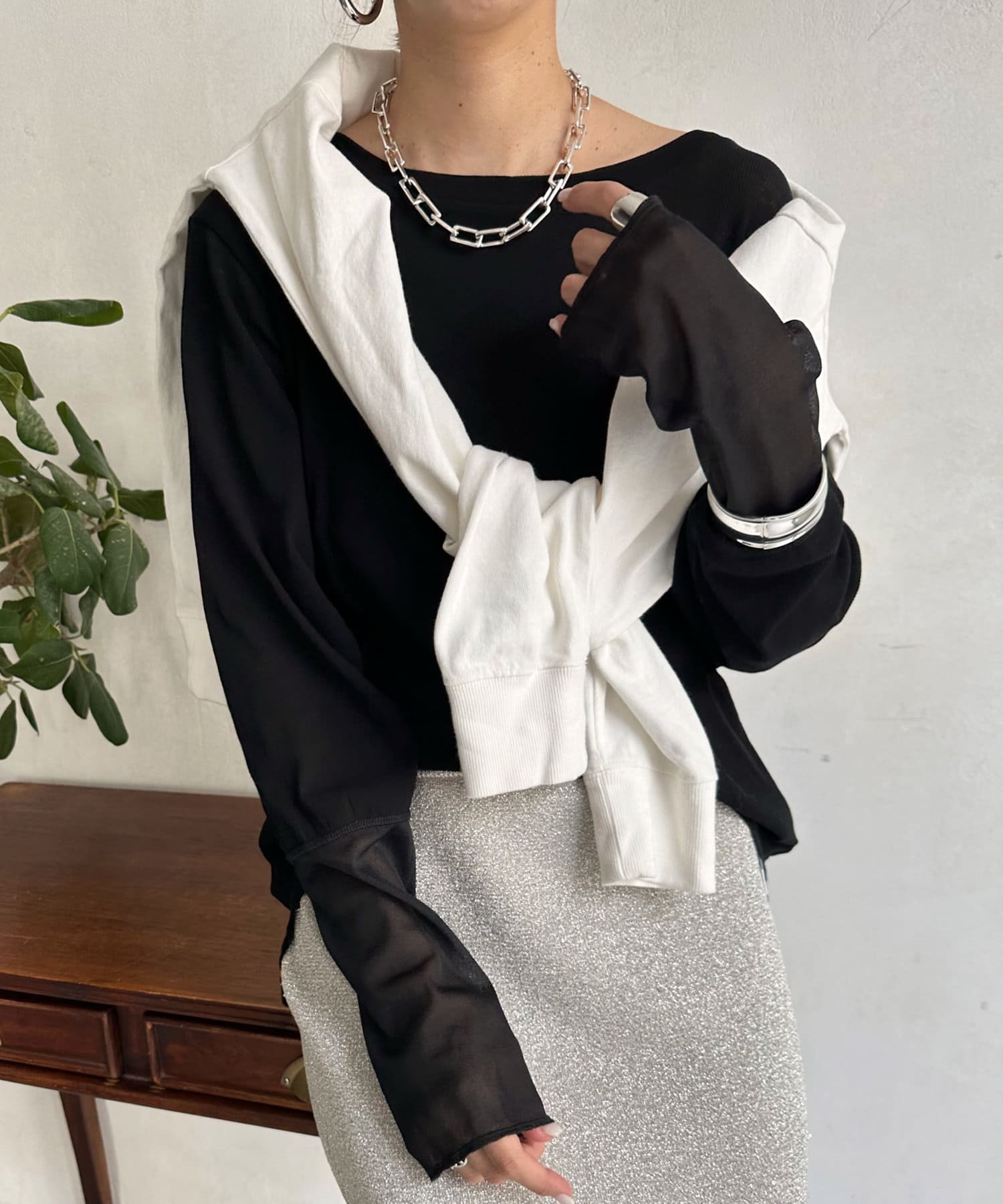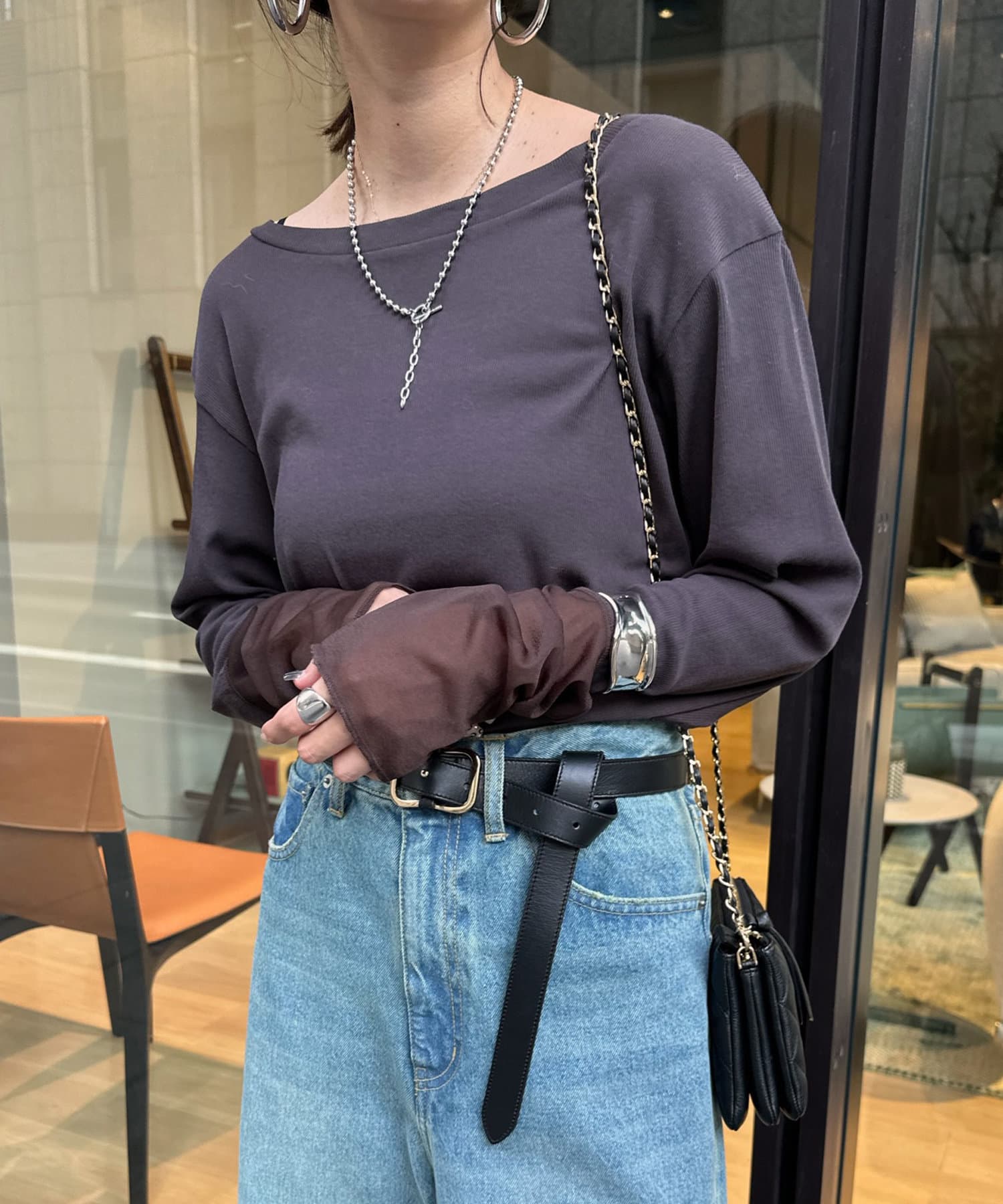 伸びやかなリブ素材をベースに、お袖はトレンド感のあるシアー素材に切り替え。