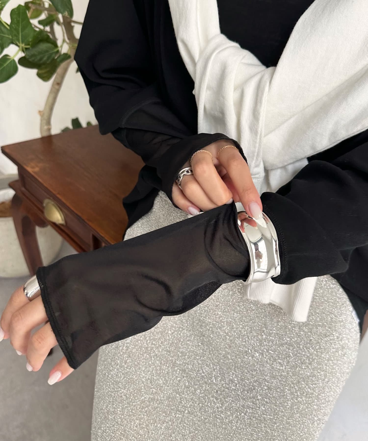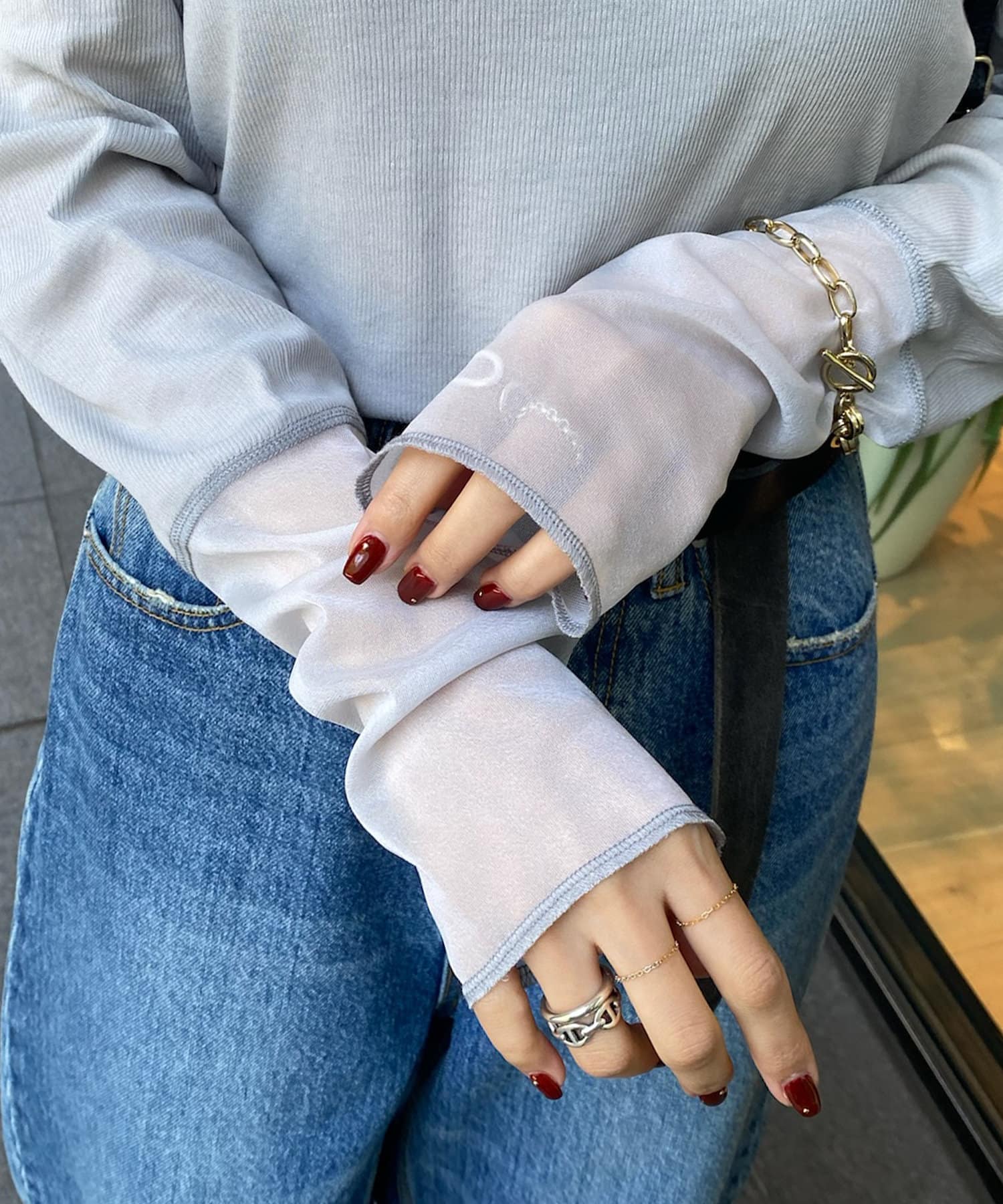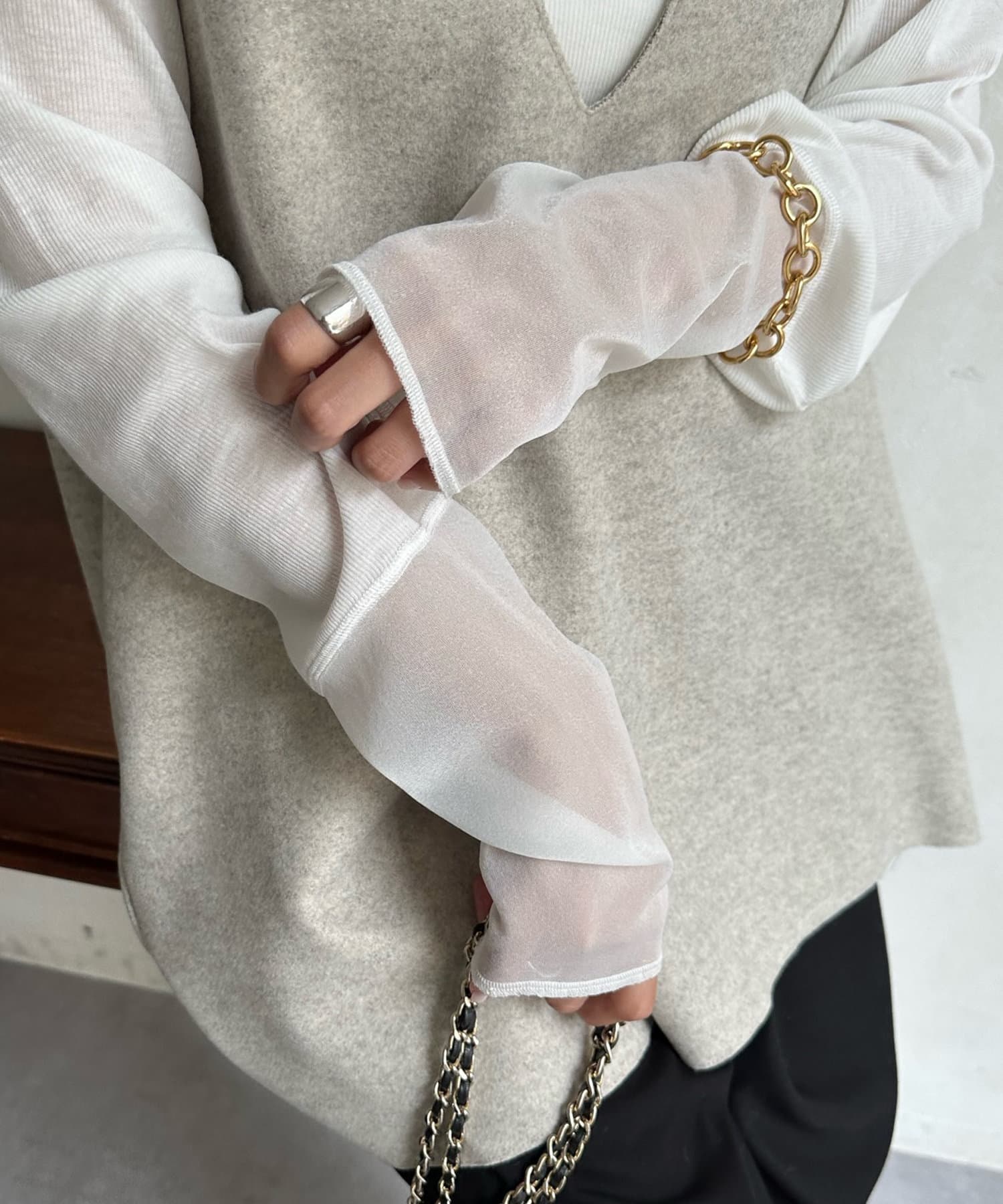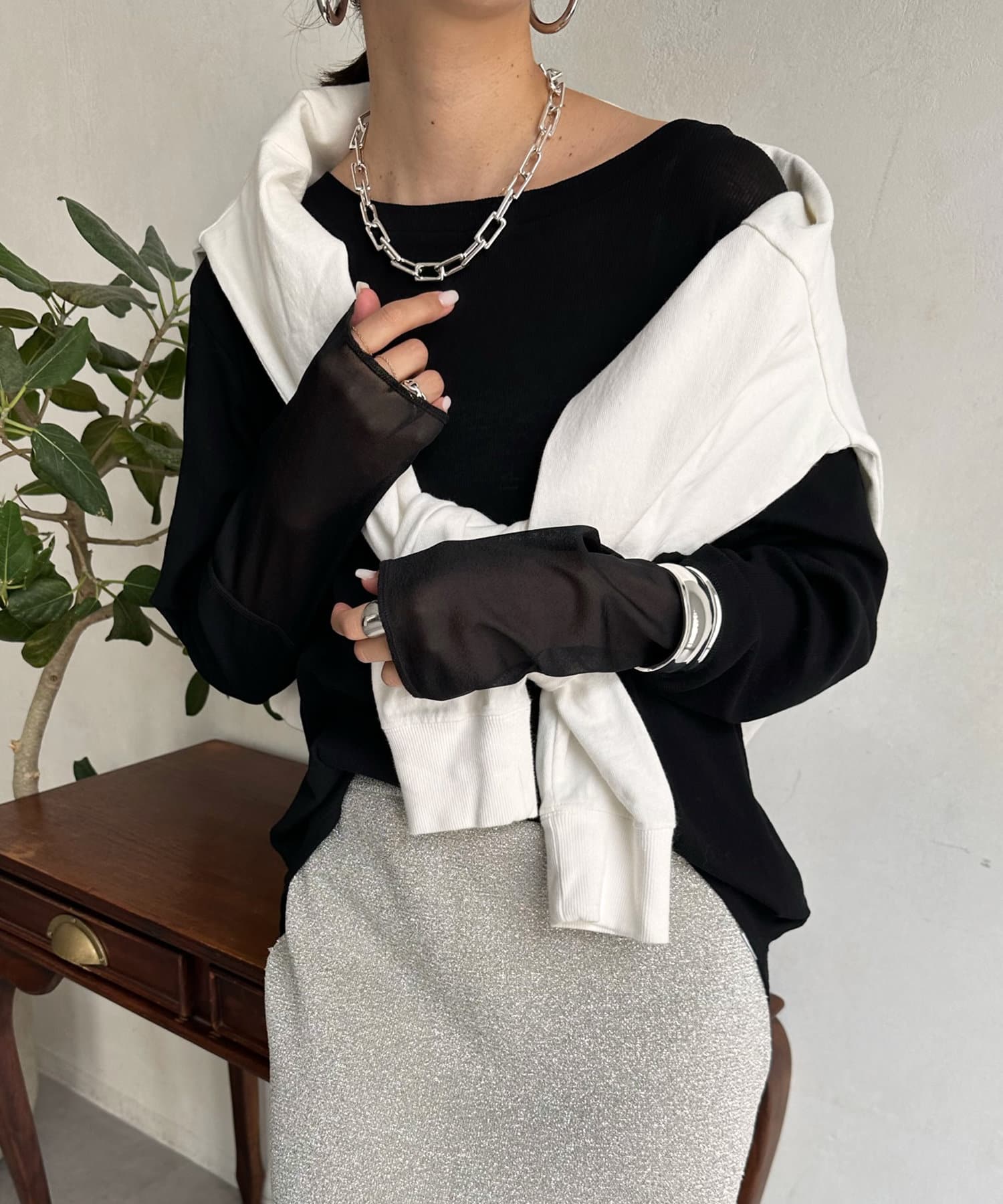伸びやかなリブ素材をベースに、お袖はトレンド感のあるシアー素材に切り替え。