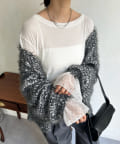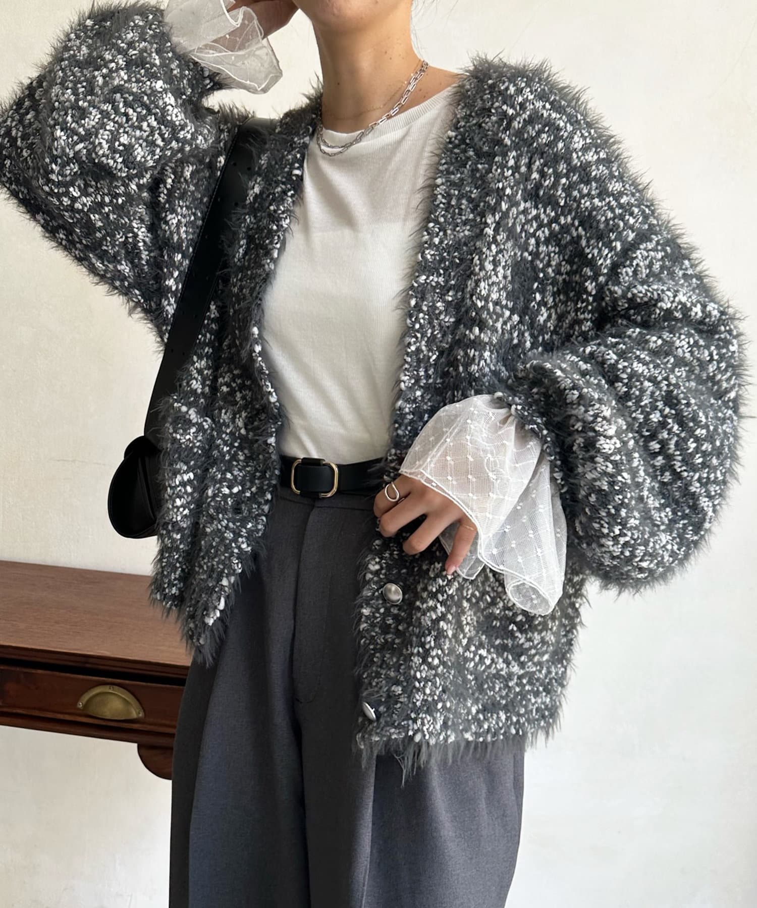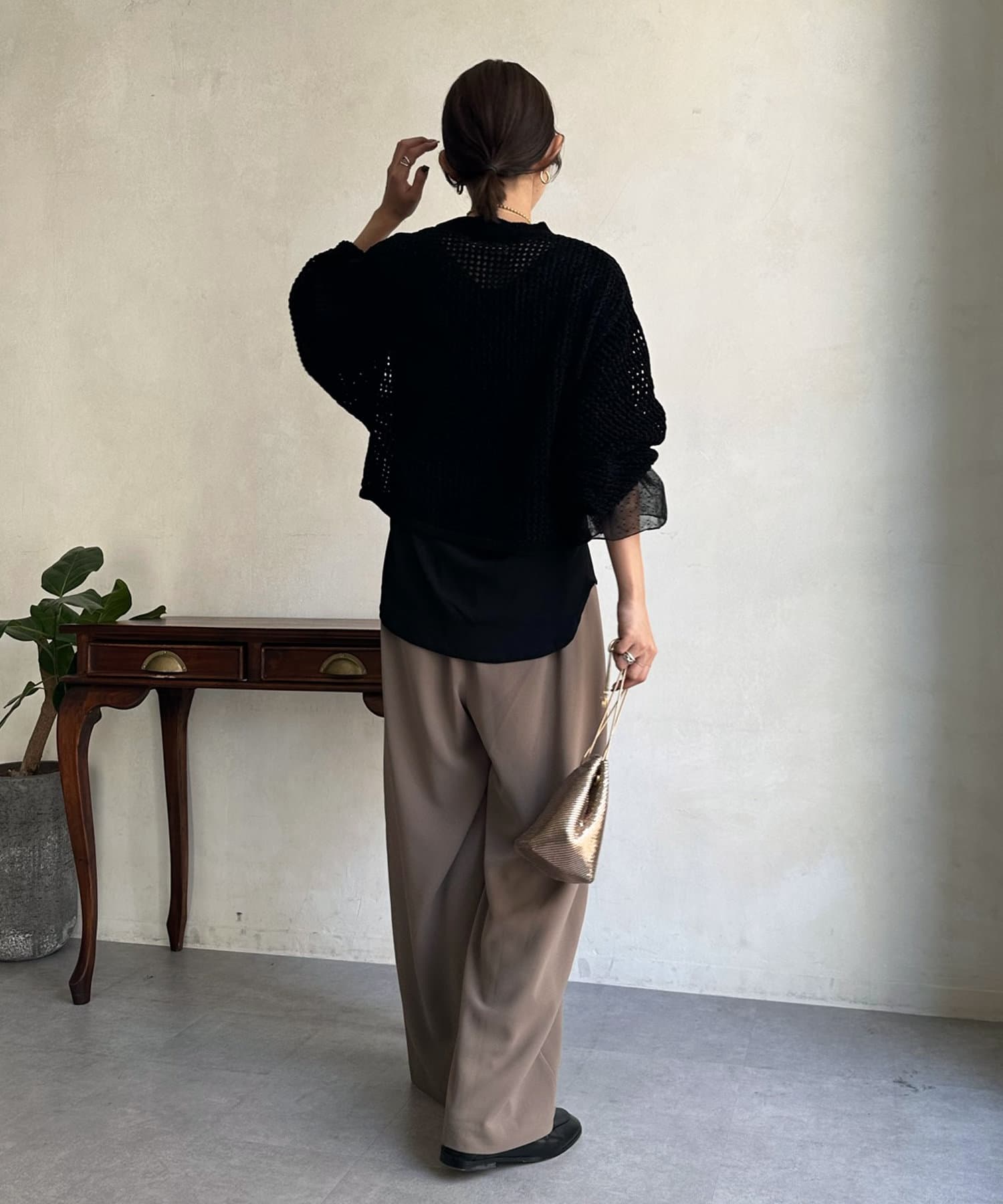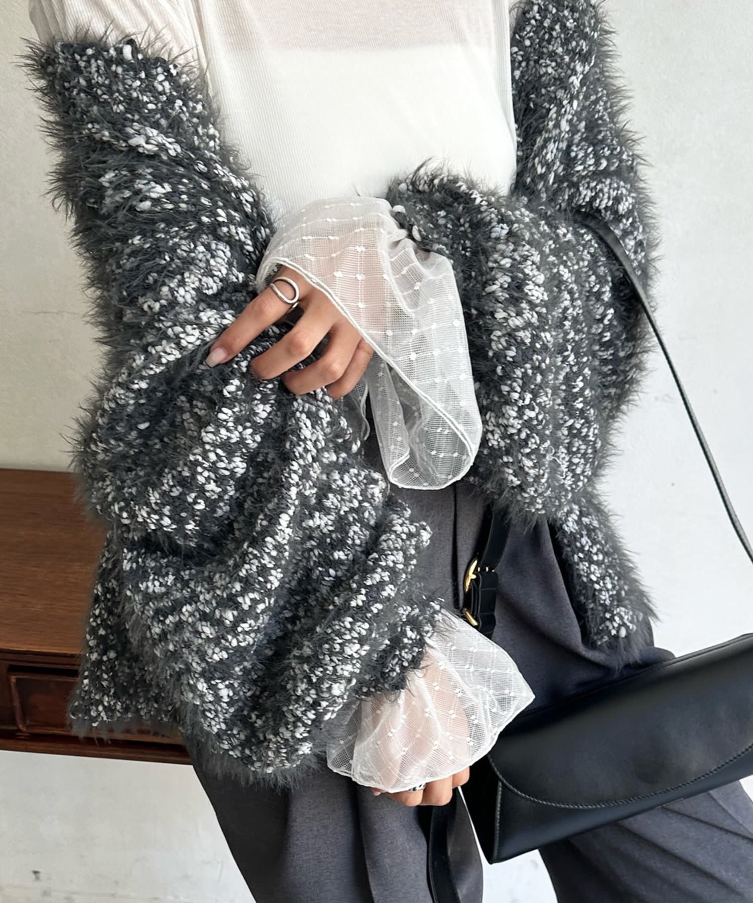 袖口をひらっと広がるドット柄のチュール素材に切り替えることで、スタイリングに少し甘めの要素をプラスします。