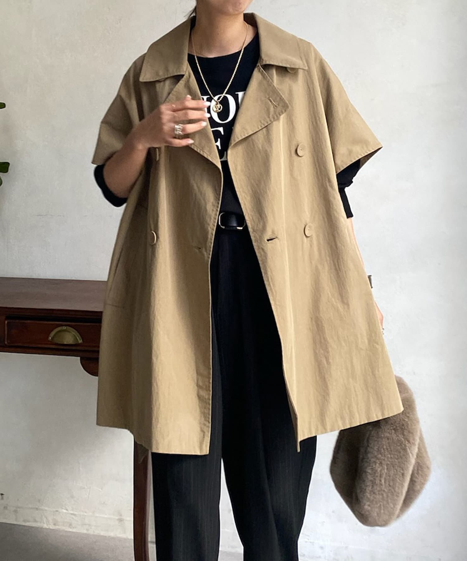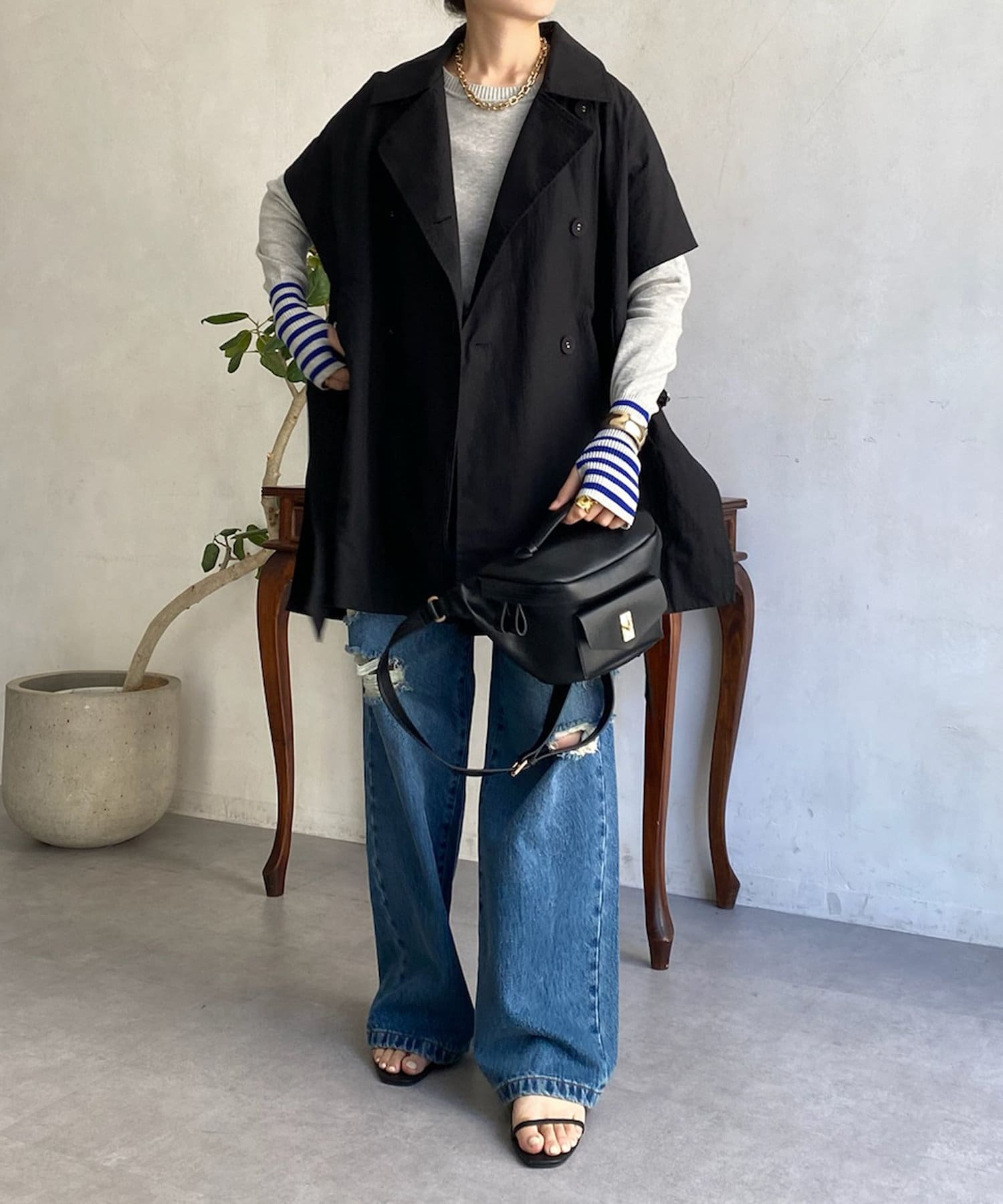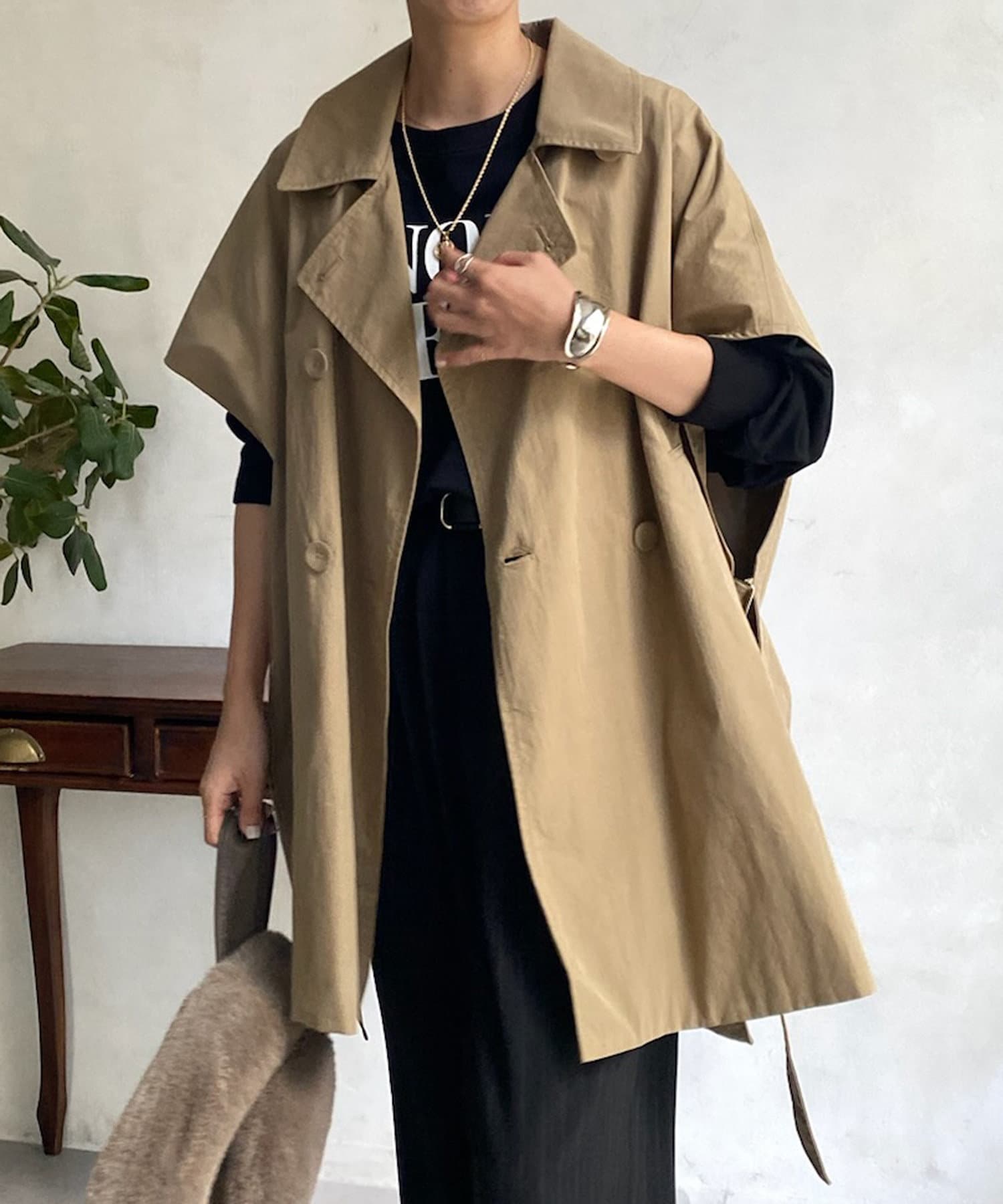 カジュアルコーディネイトでも羽織るだけでモードな雰囲気に様変わりするトレンチベスト!