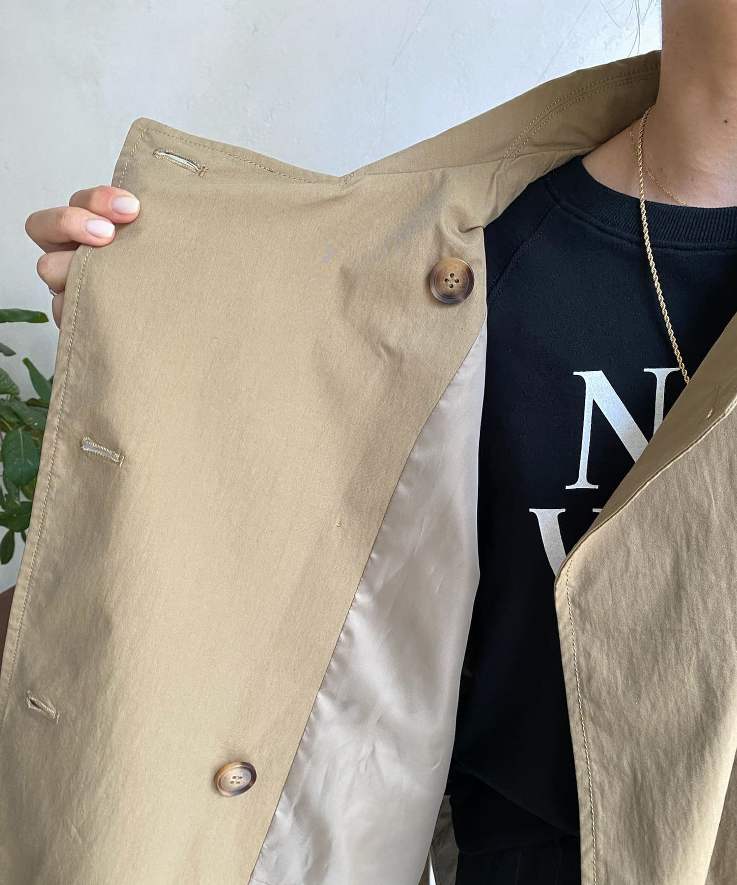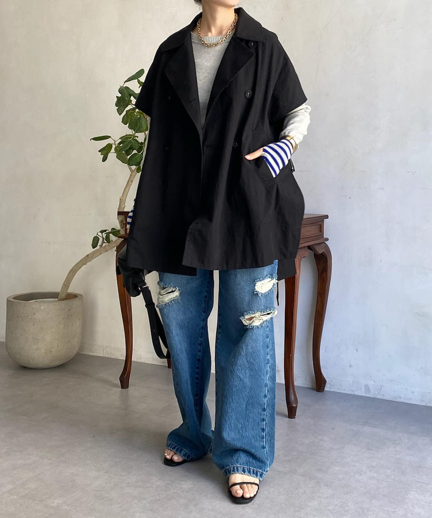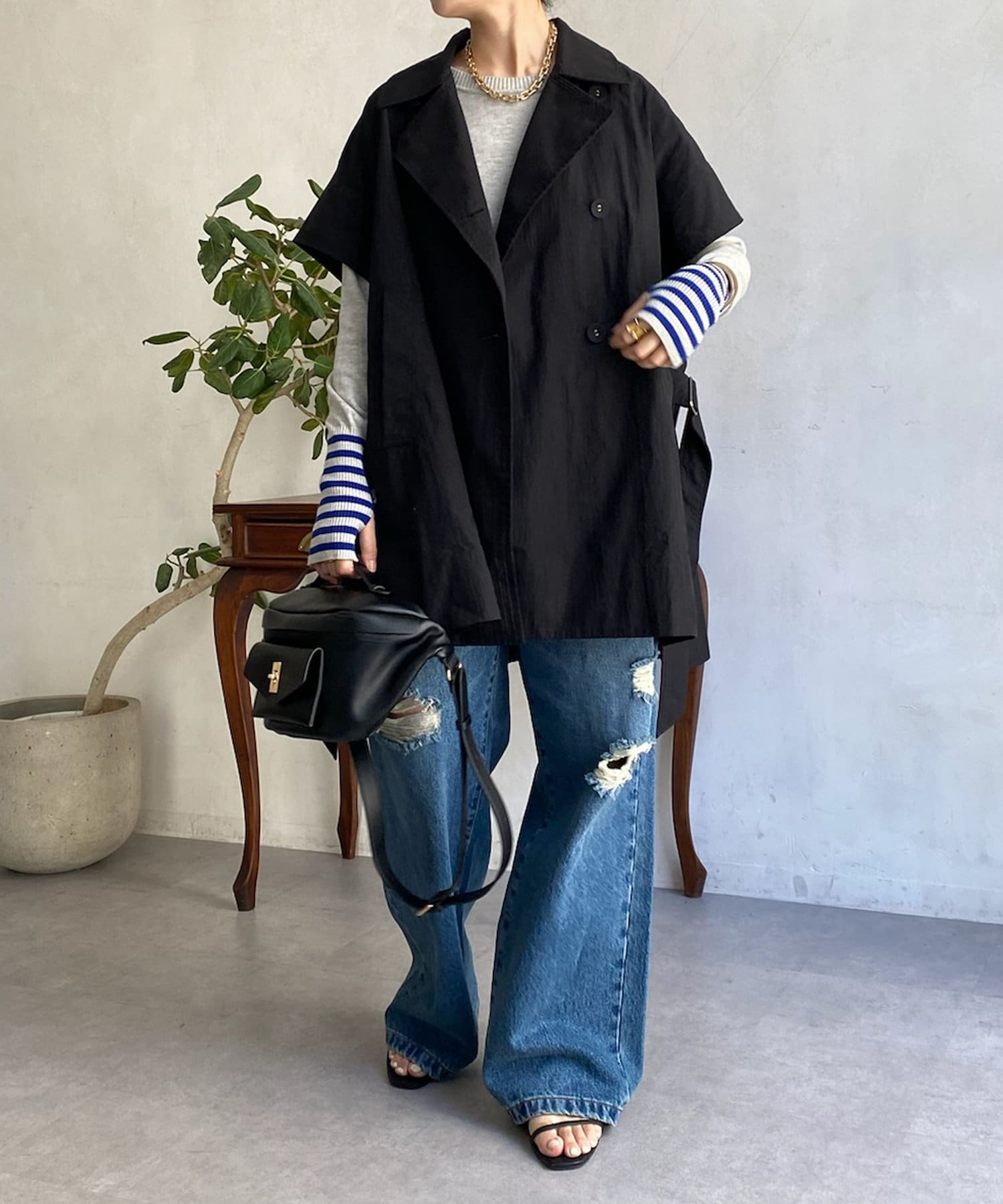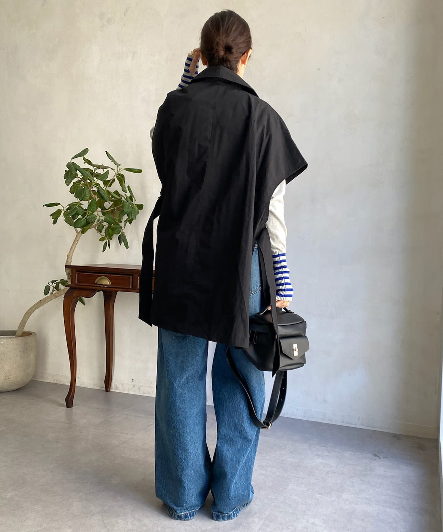 カジュアルコーディネイトでも羽織るだけでモードな雰囲気に様変わりするトレンチベスト!