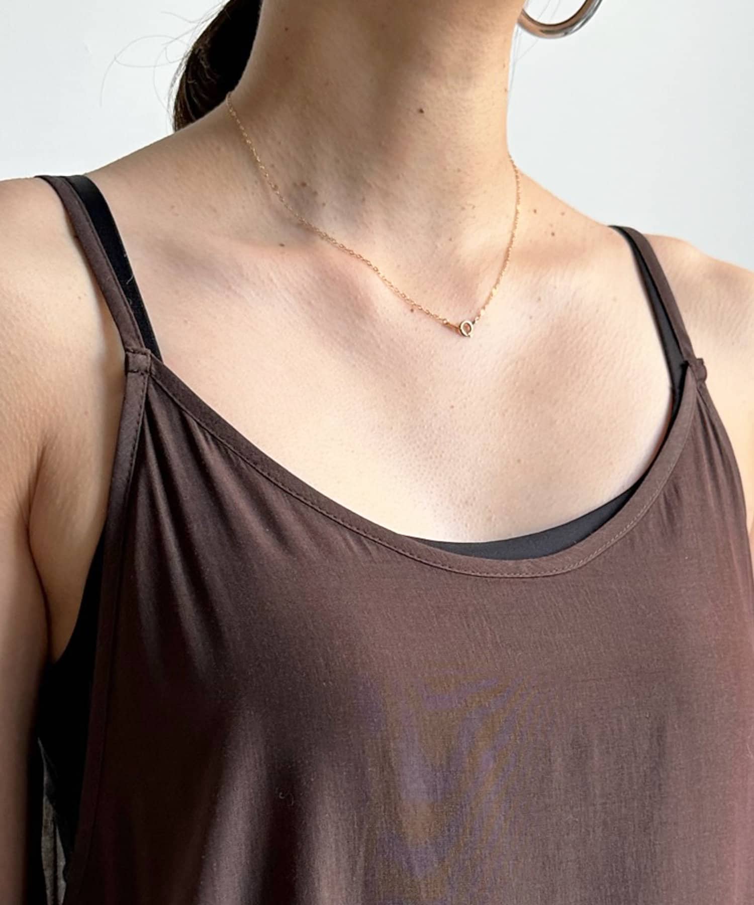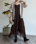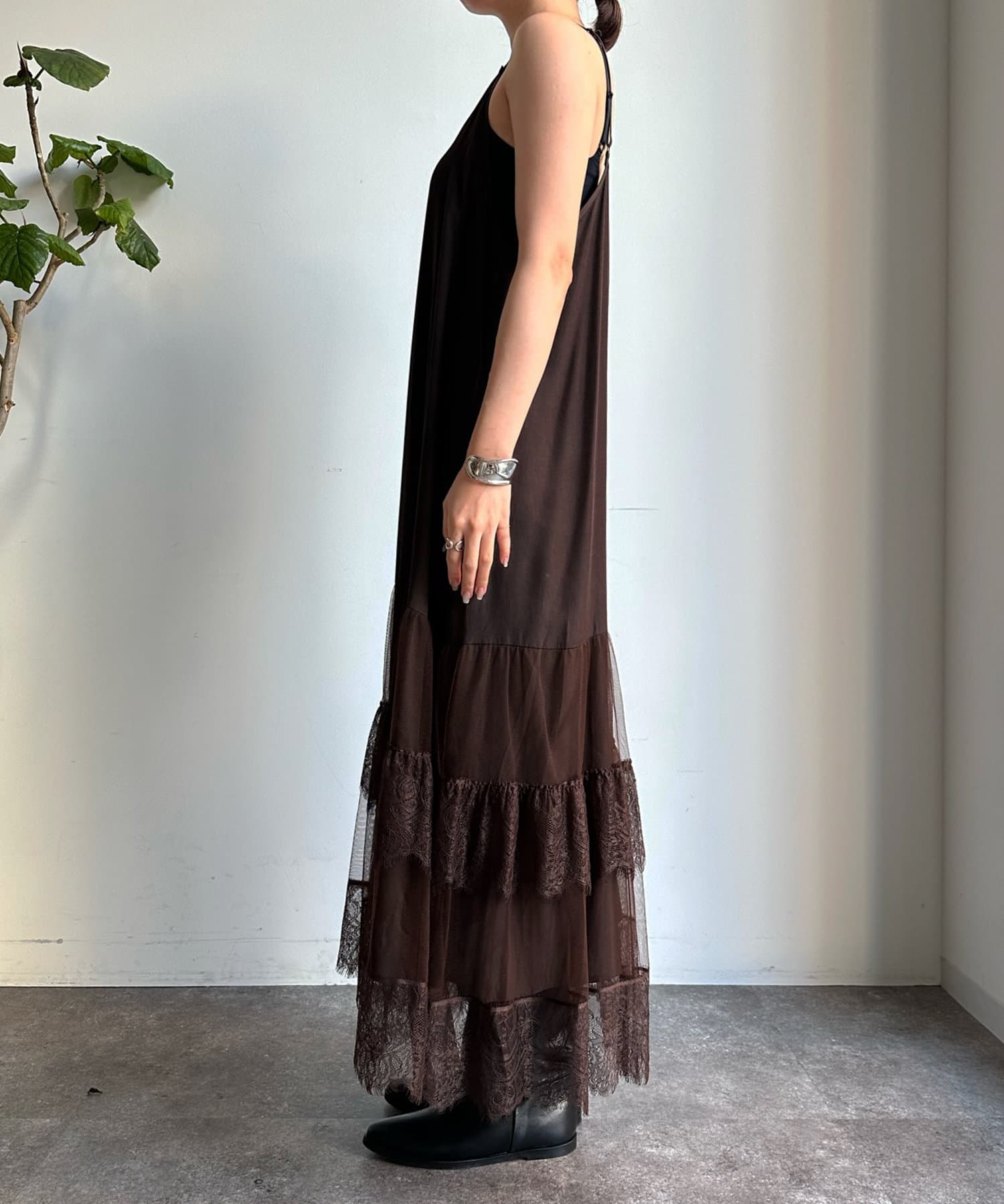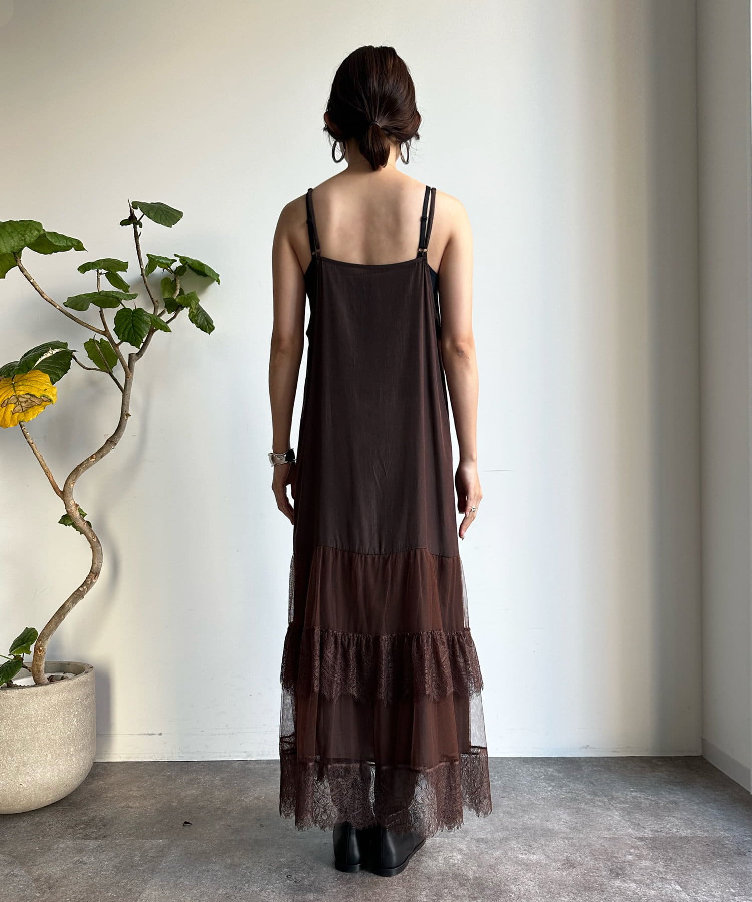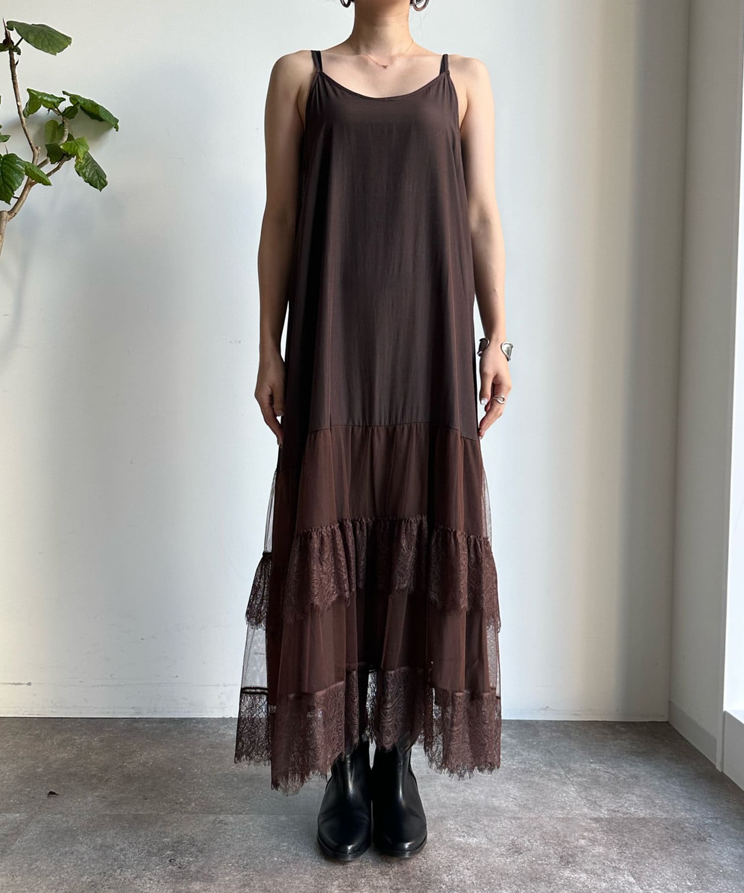 テロっと落ち感のある素材感+裾をレースに切り替えを施したキャミワンピース。