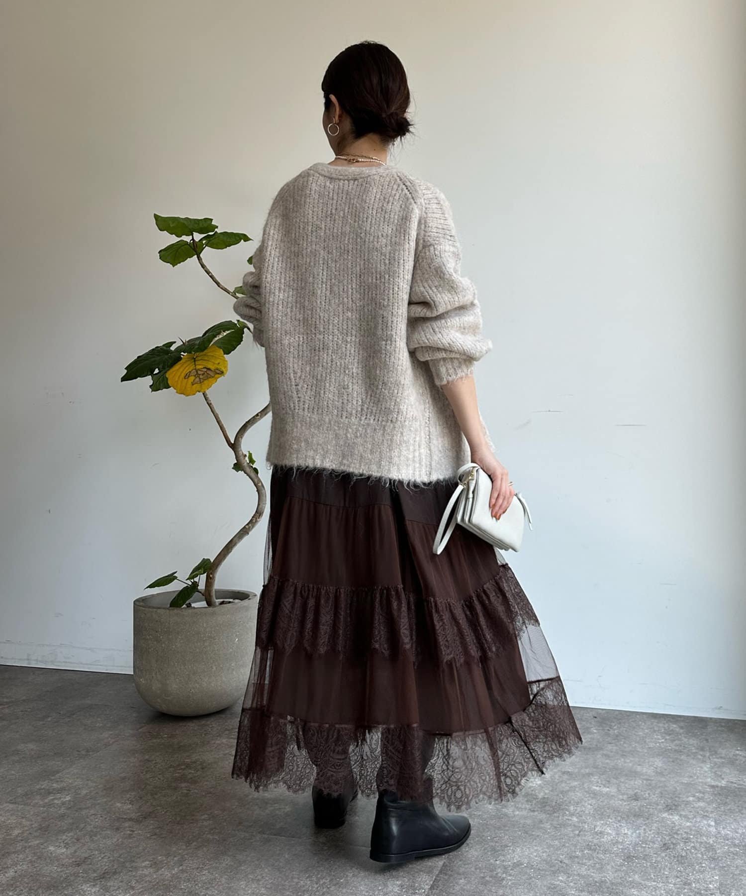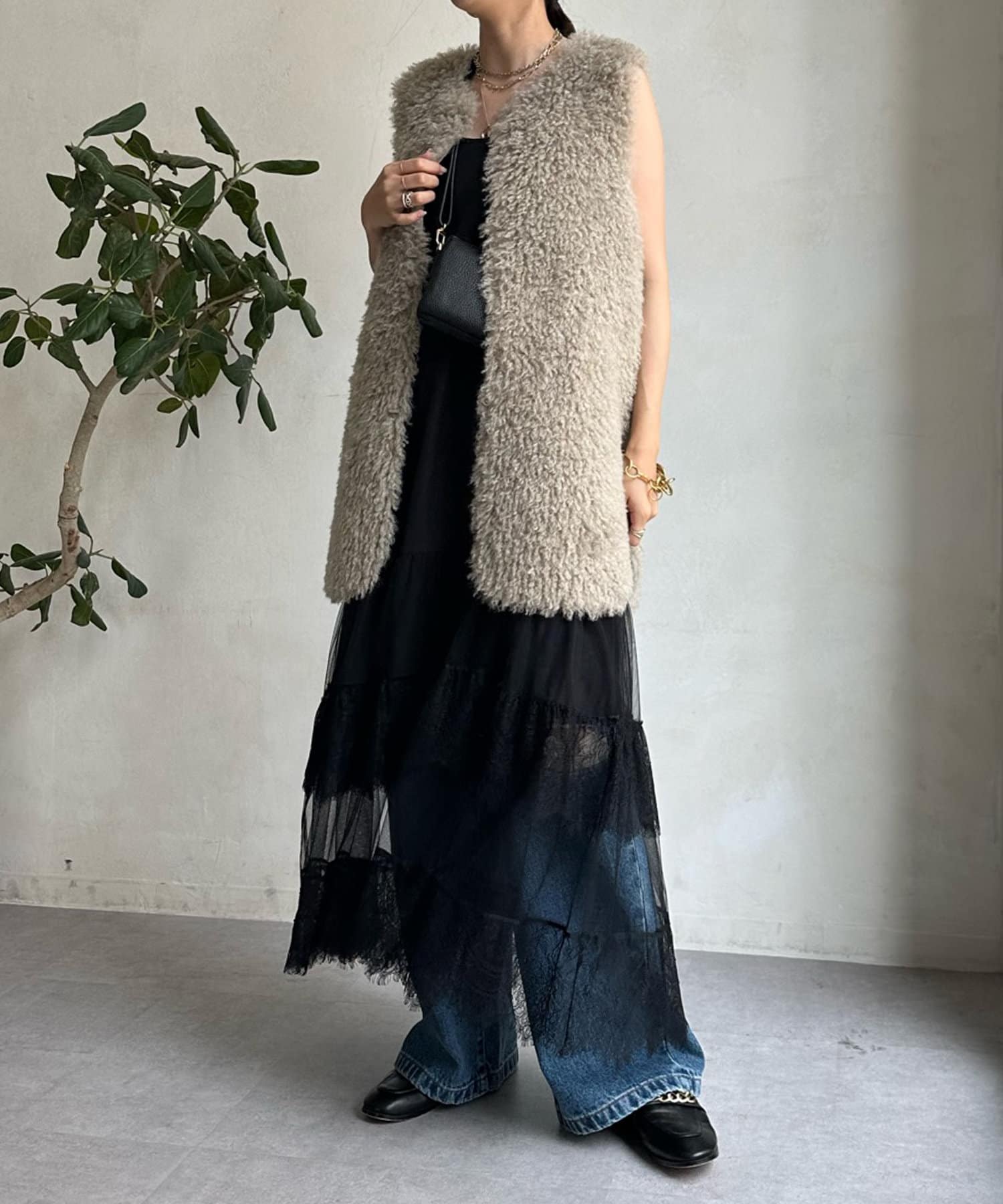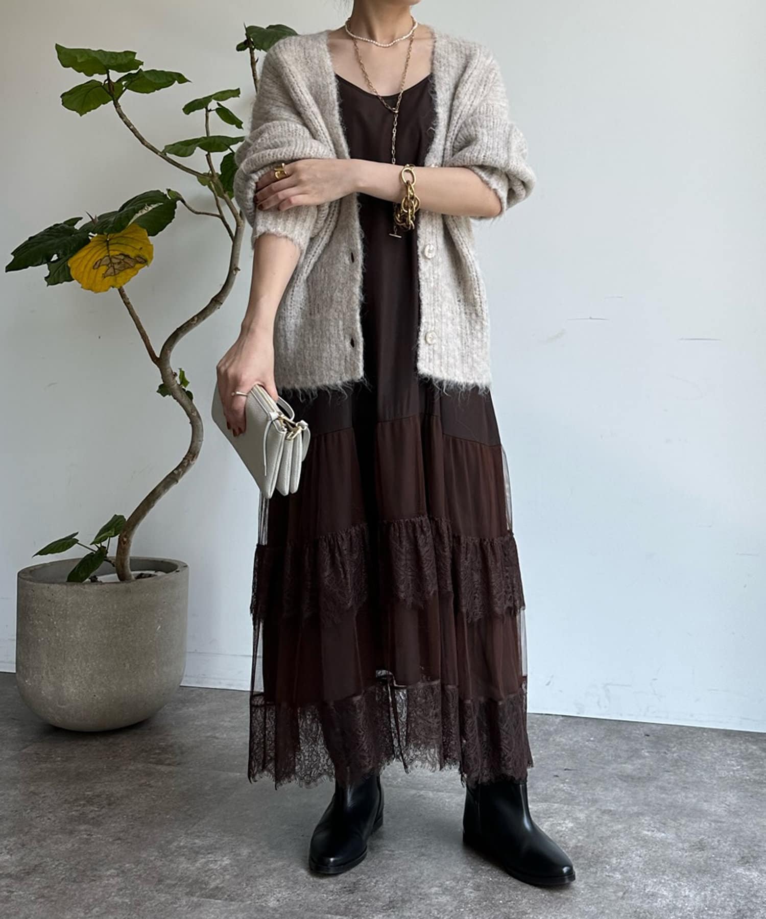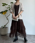 裾には透け感があるため、デニムなどのカジュアルなボトムをレイヤードするのもおしゃれですよ。