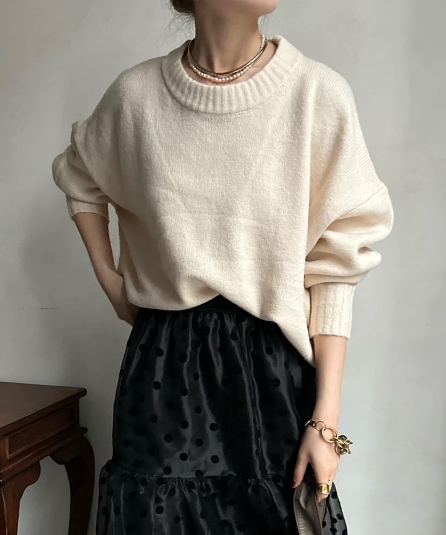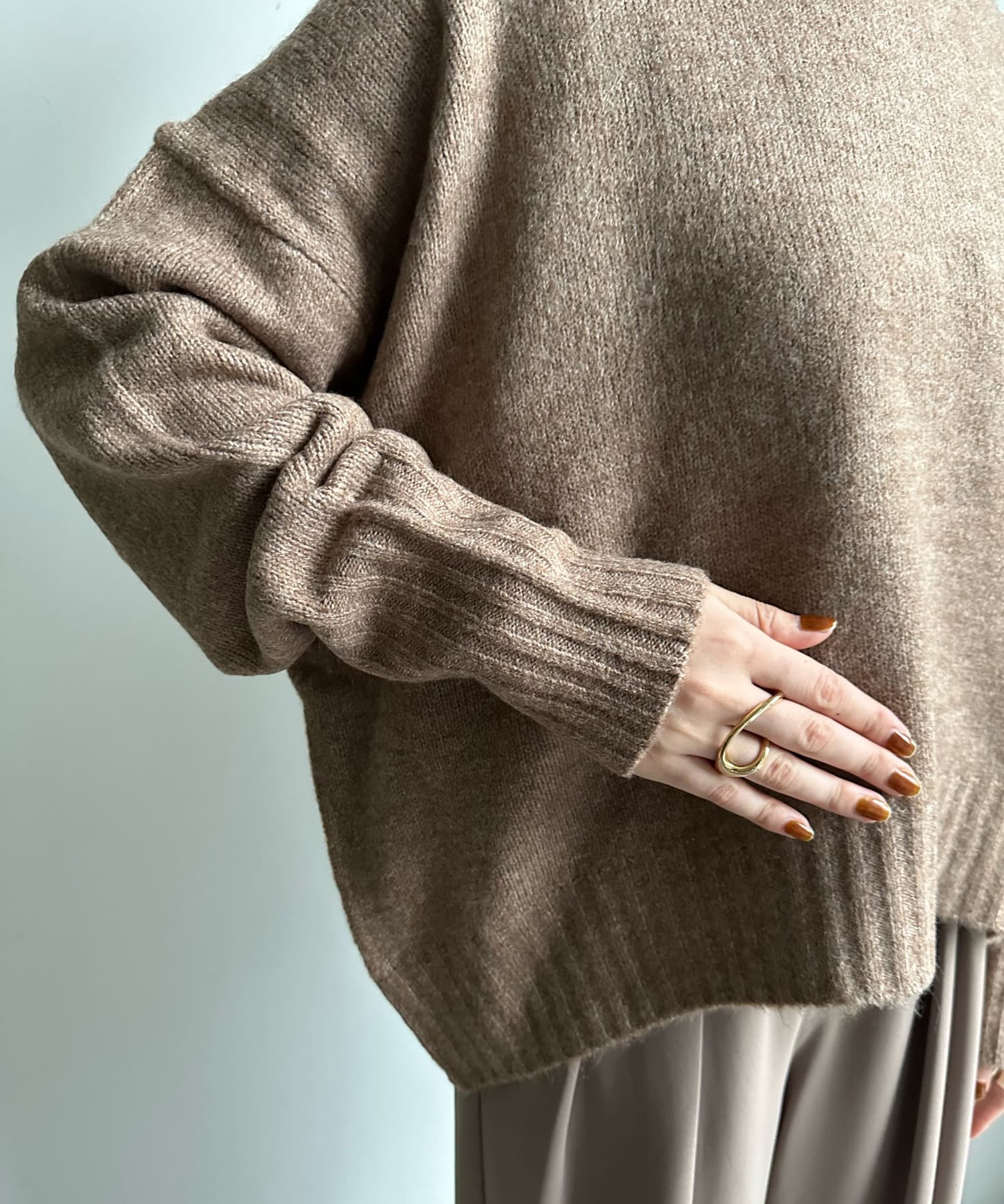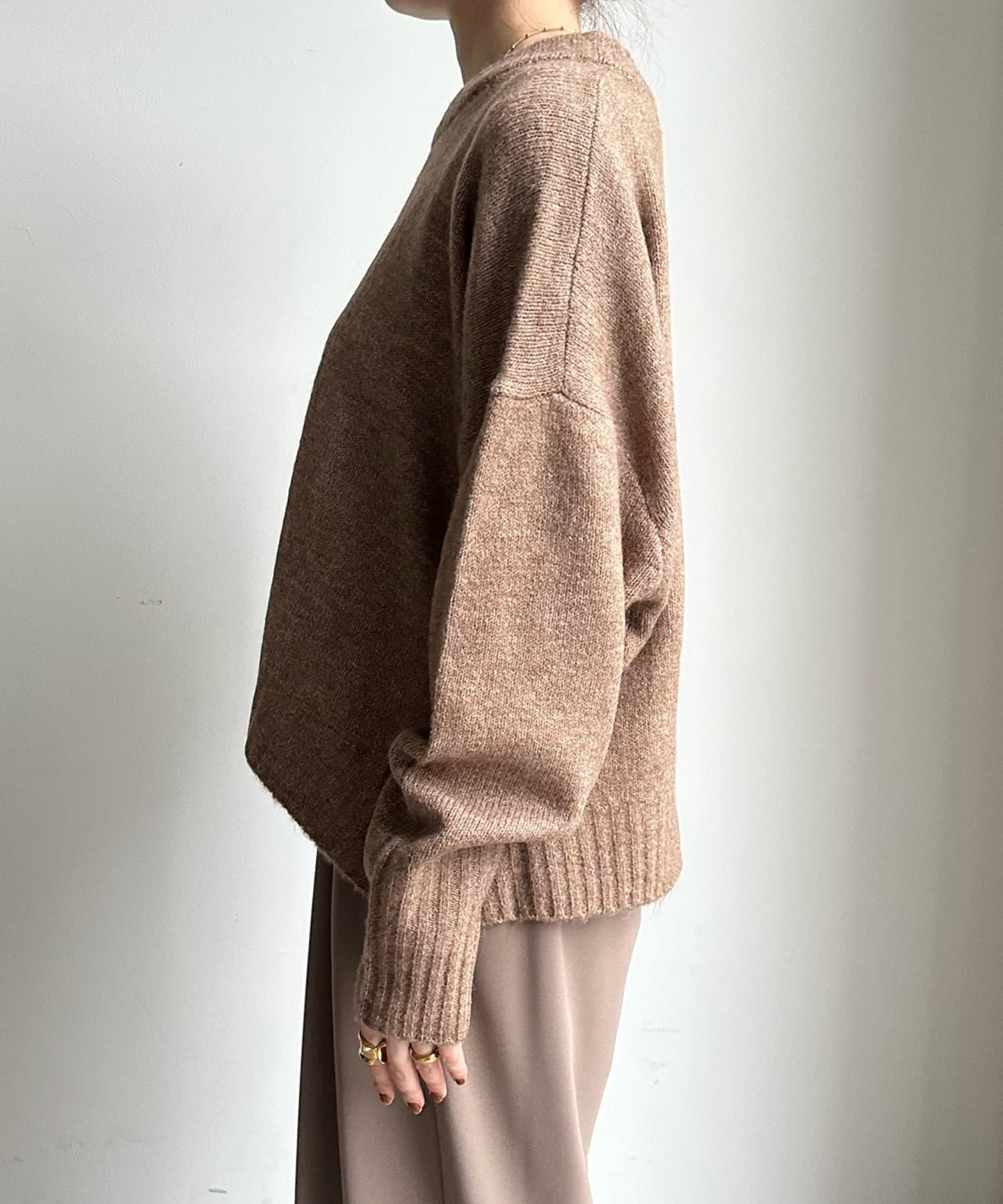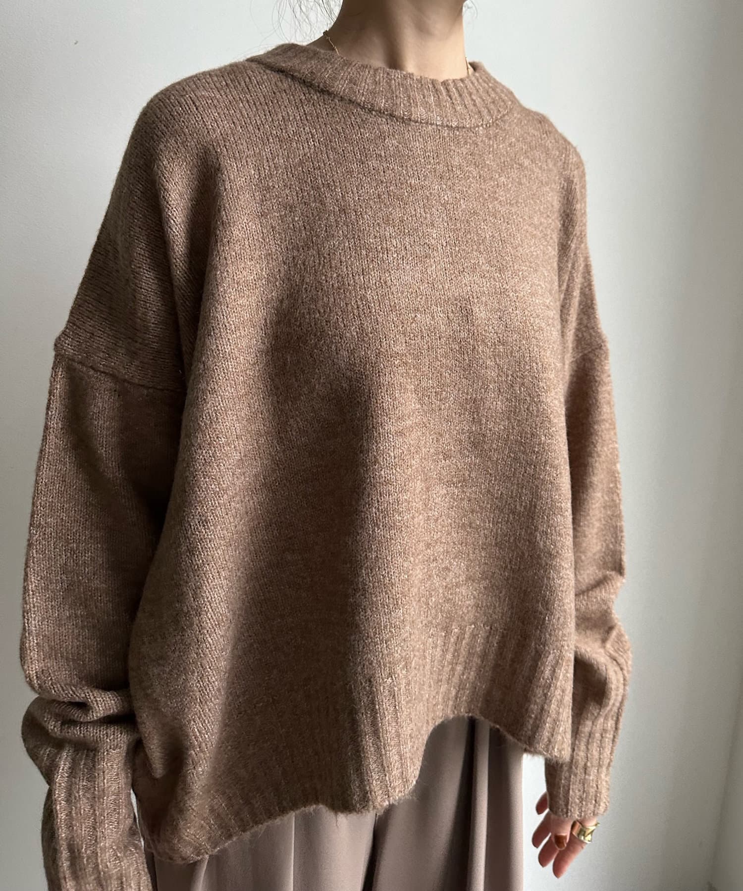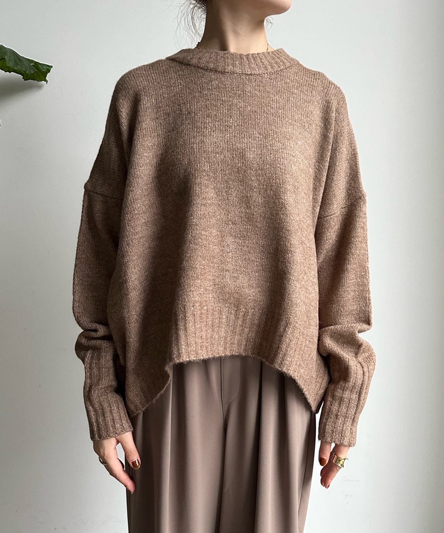 身幅が広くショルダーの落としたデザインと程よくコンパクトな丈感が、様々なシルエットのボトムにマッチしてくれるニット。