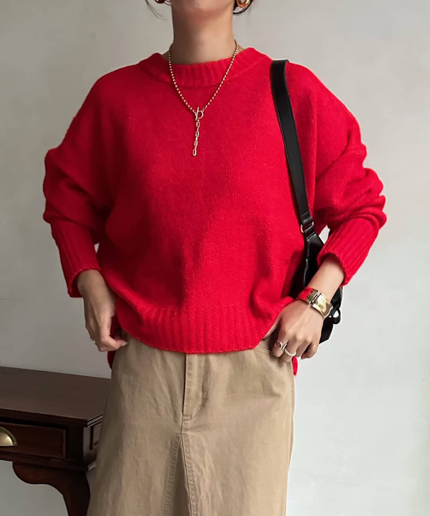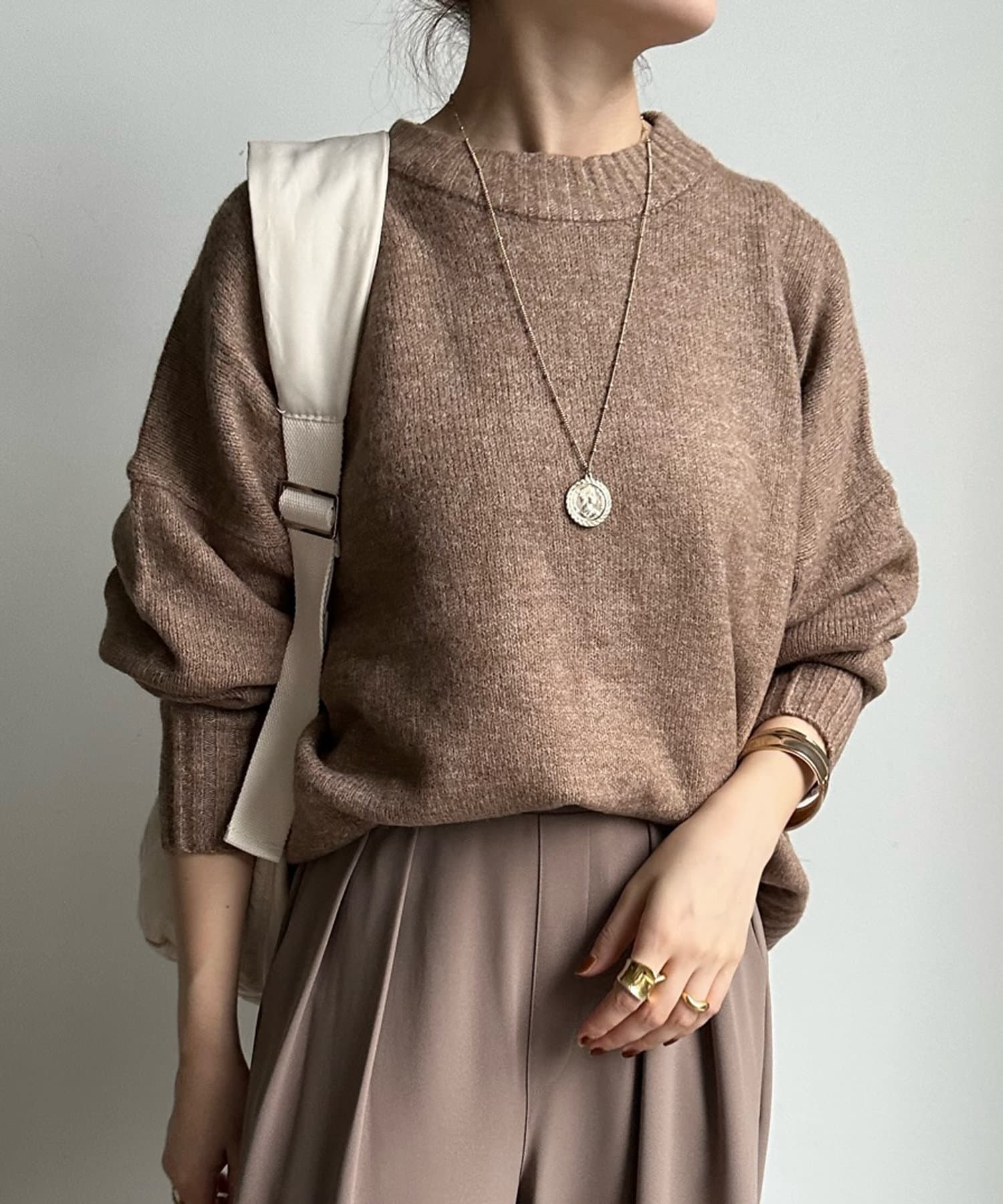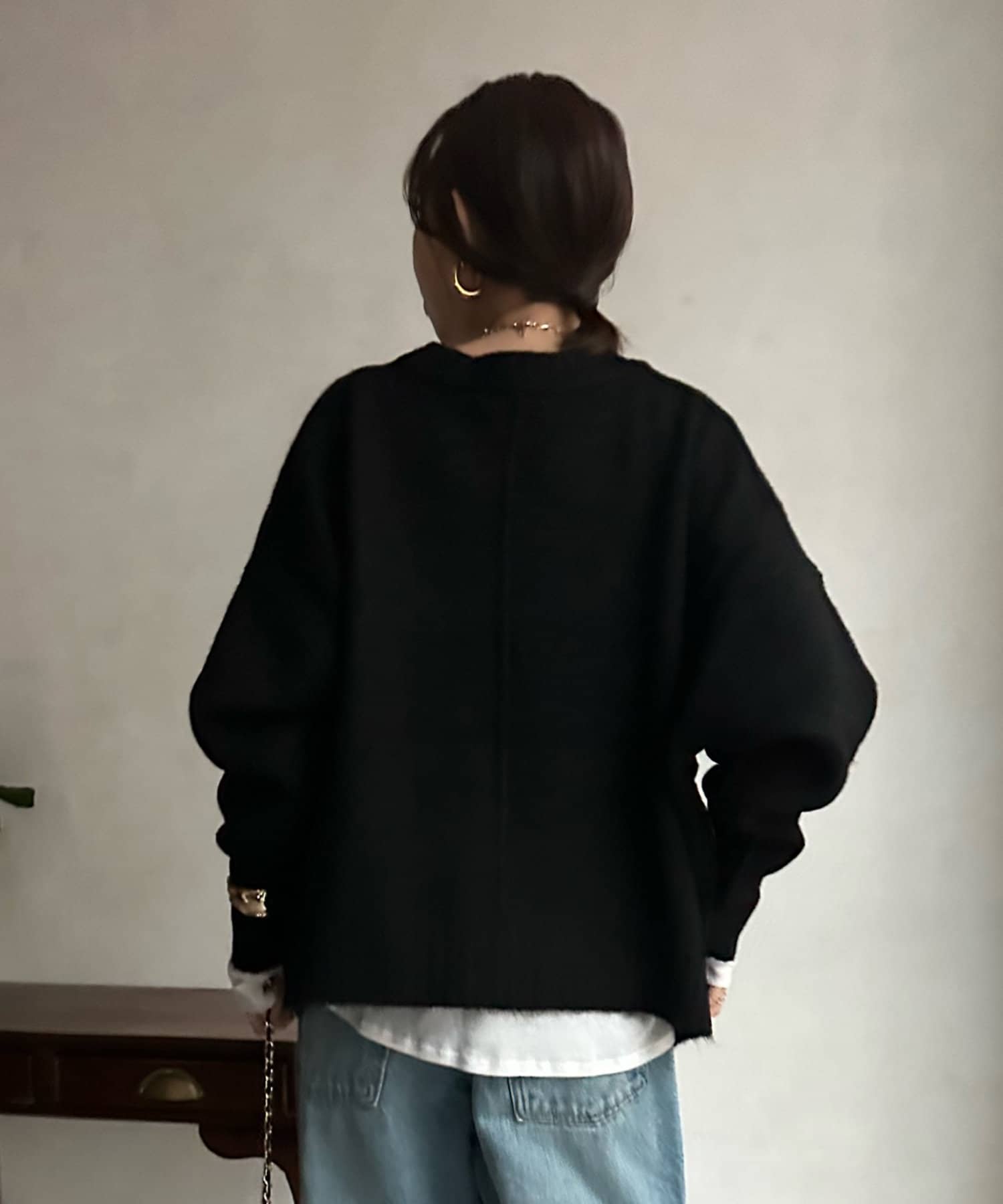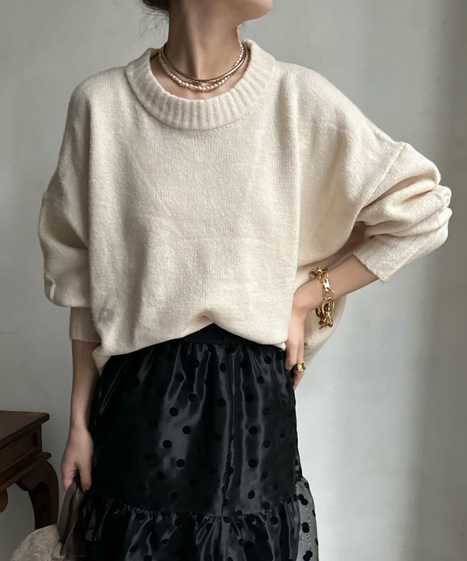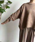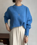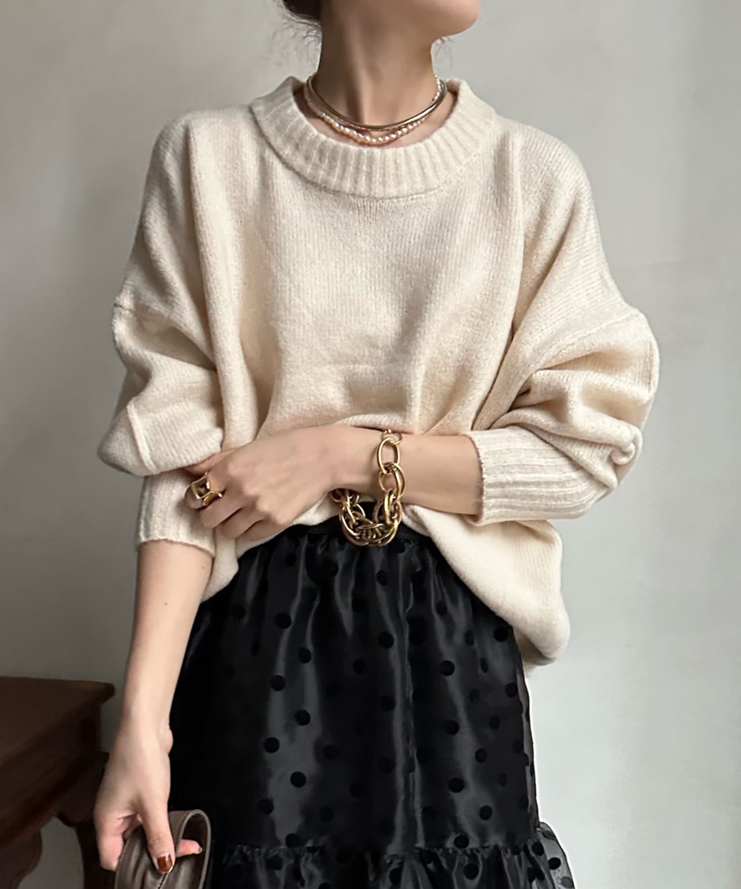 身幅が広くショルダーの落としたデザインと程よくコンパクトな丈感が、様々なシルエットのボトムにマッチしてくれるニット。