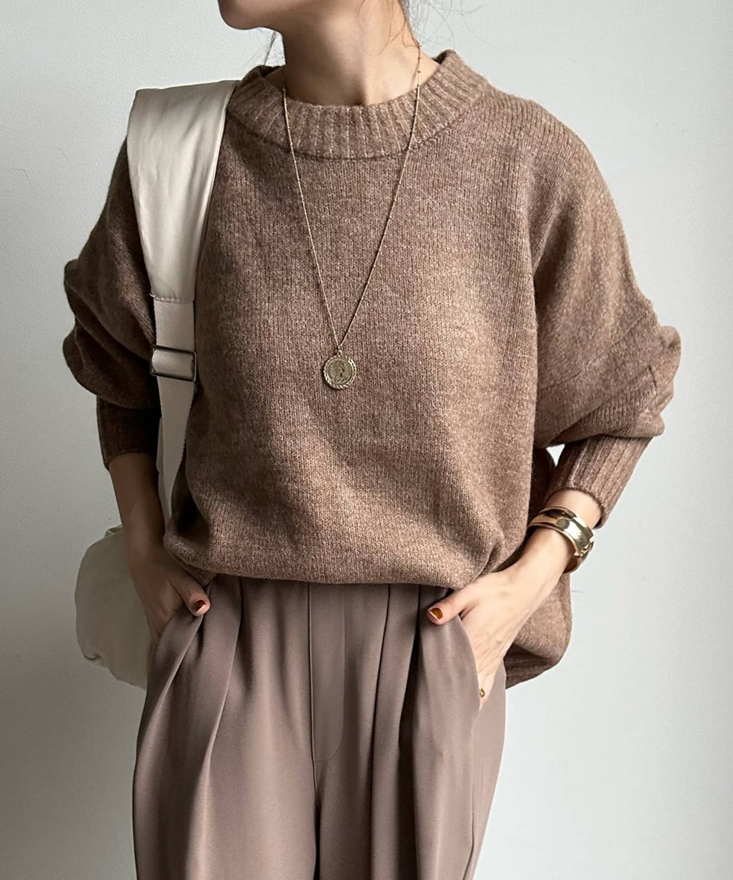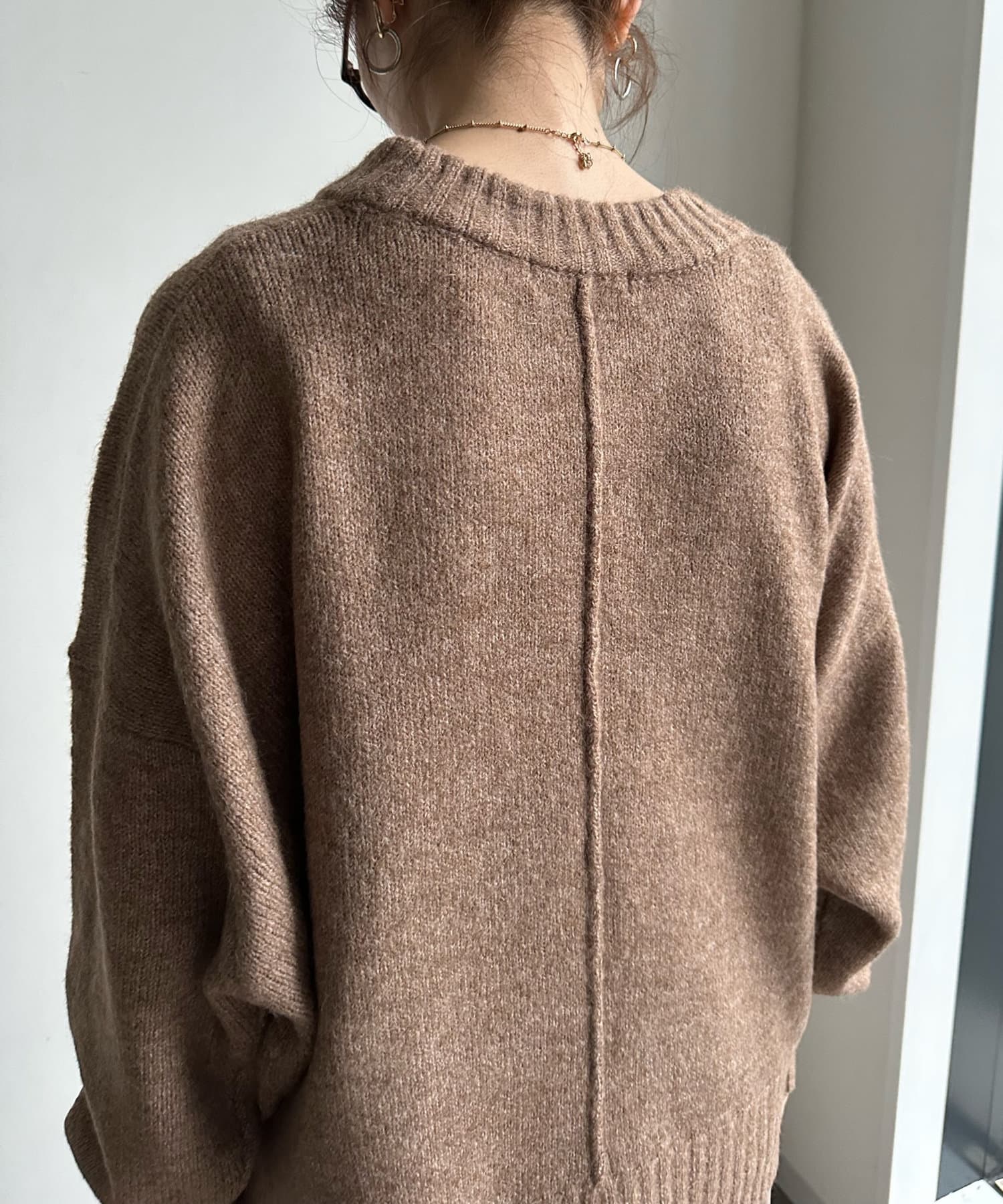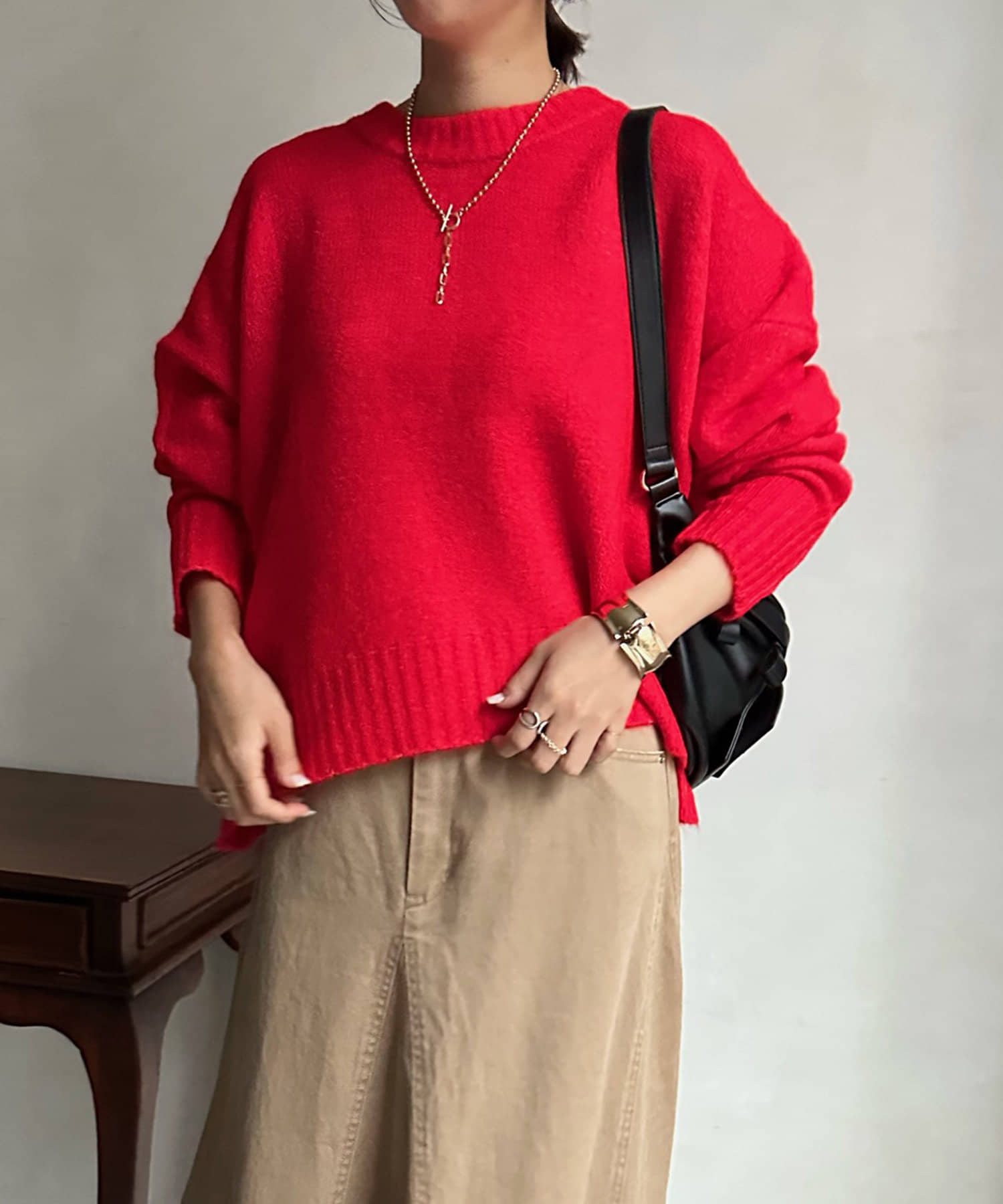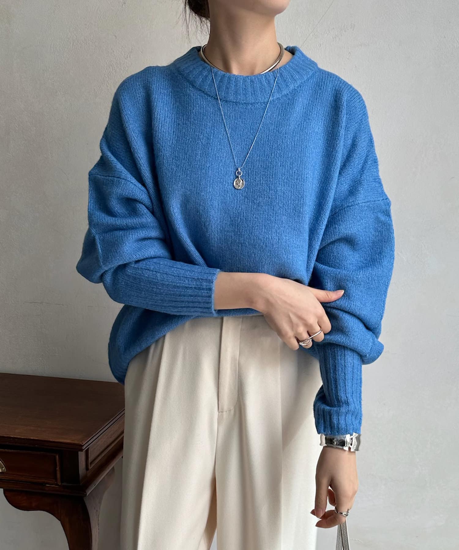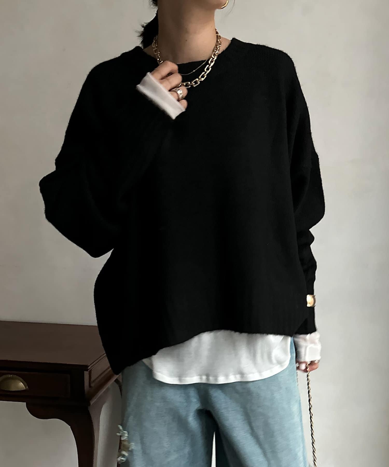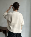 身幅が広くショルダーの落としたデザインと程よくコンパクトな丈感が、様々なシルエットのボトムにマッチしてくれるニット。