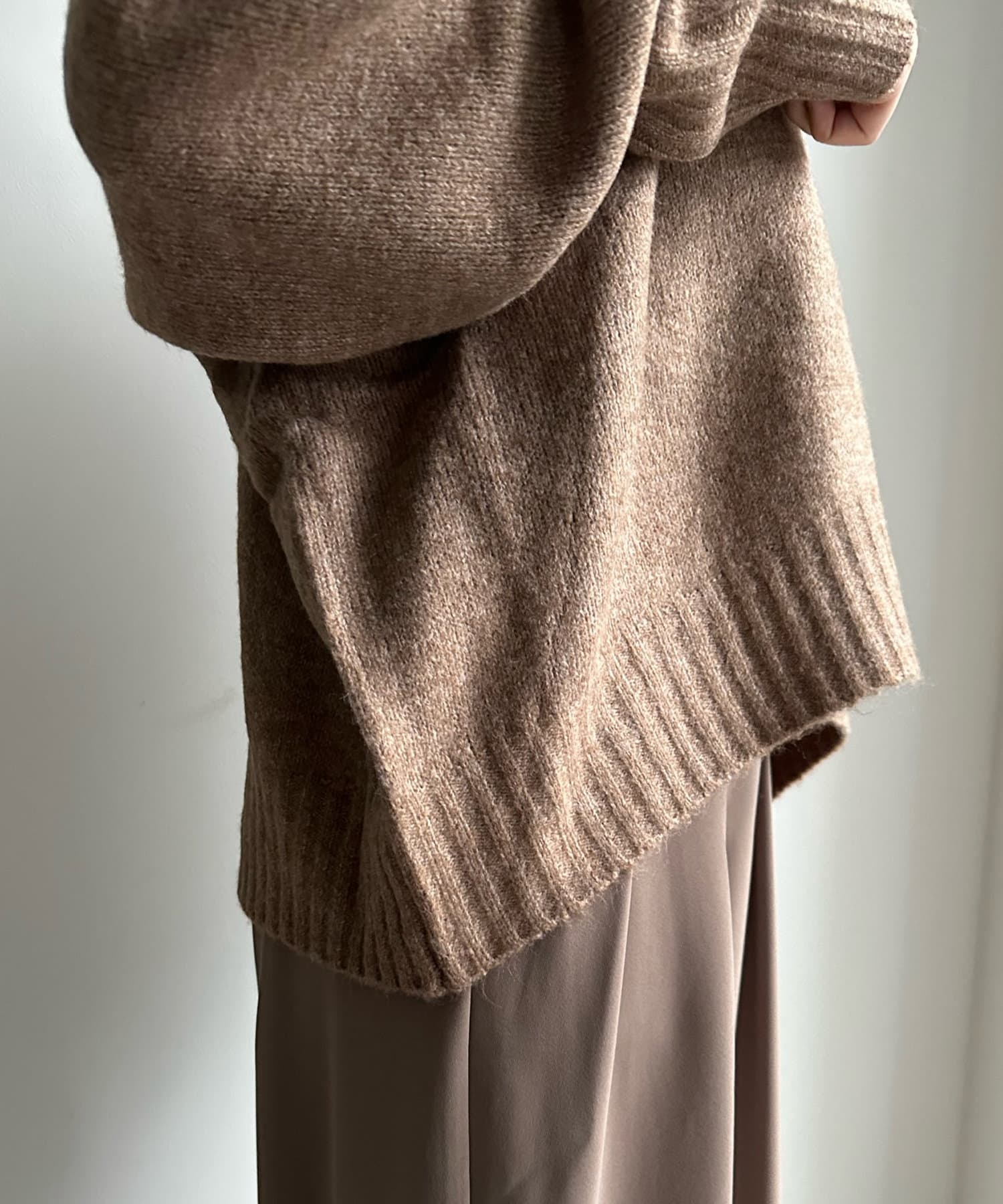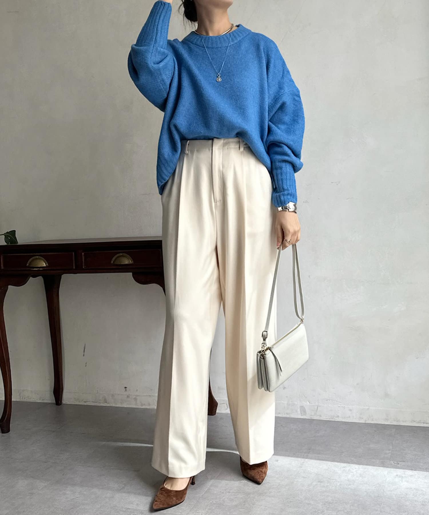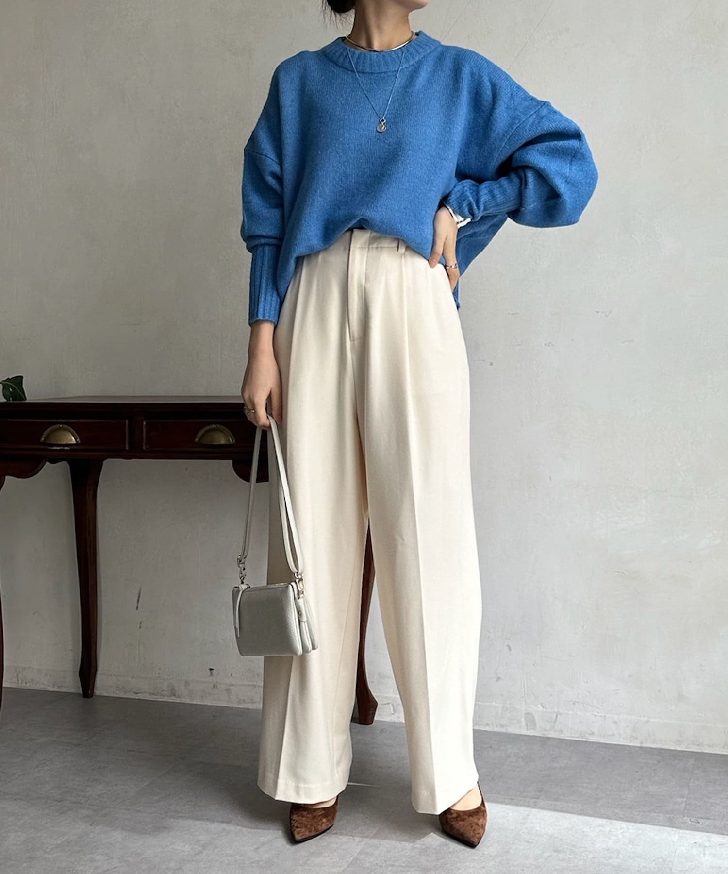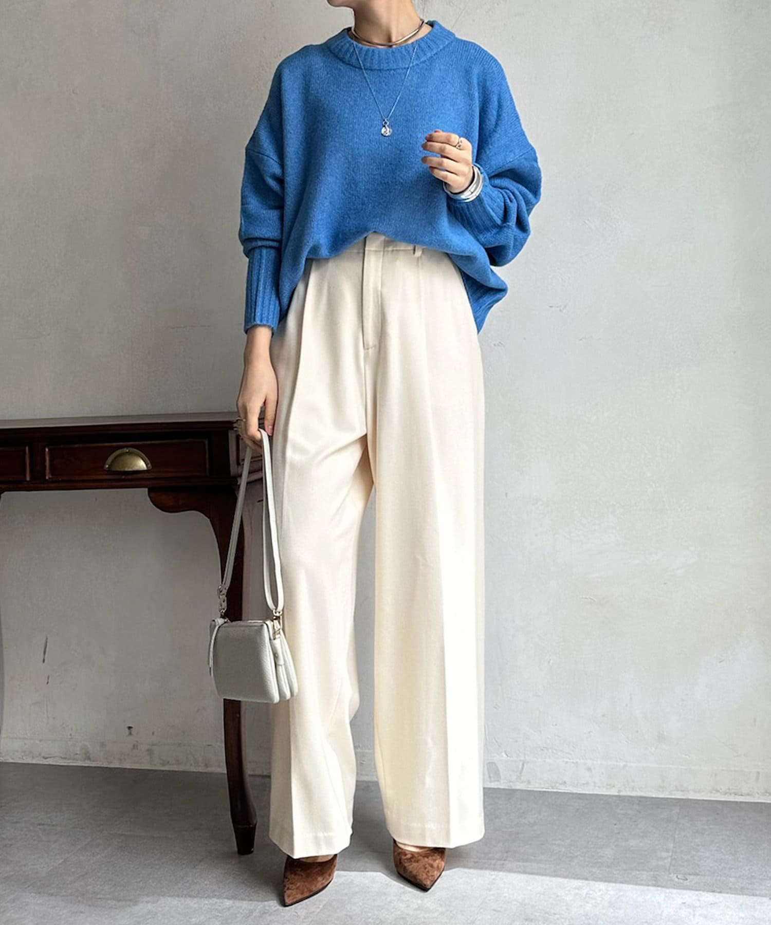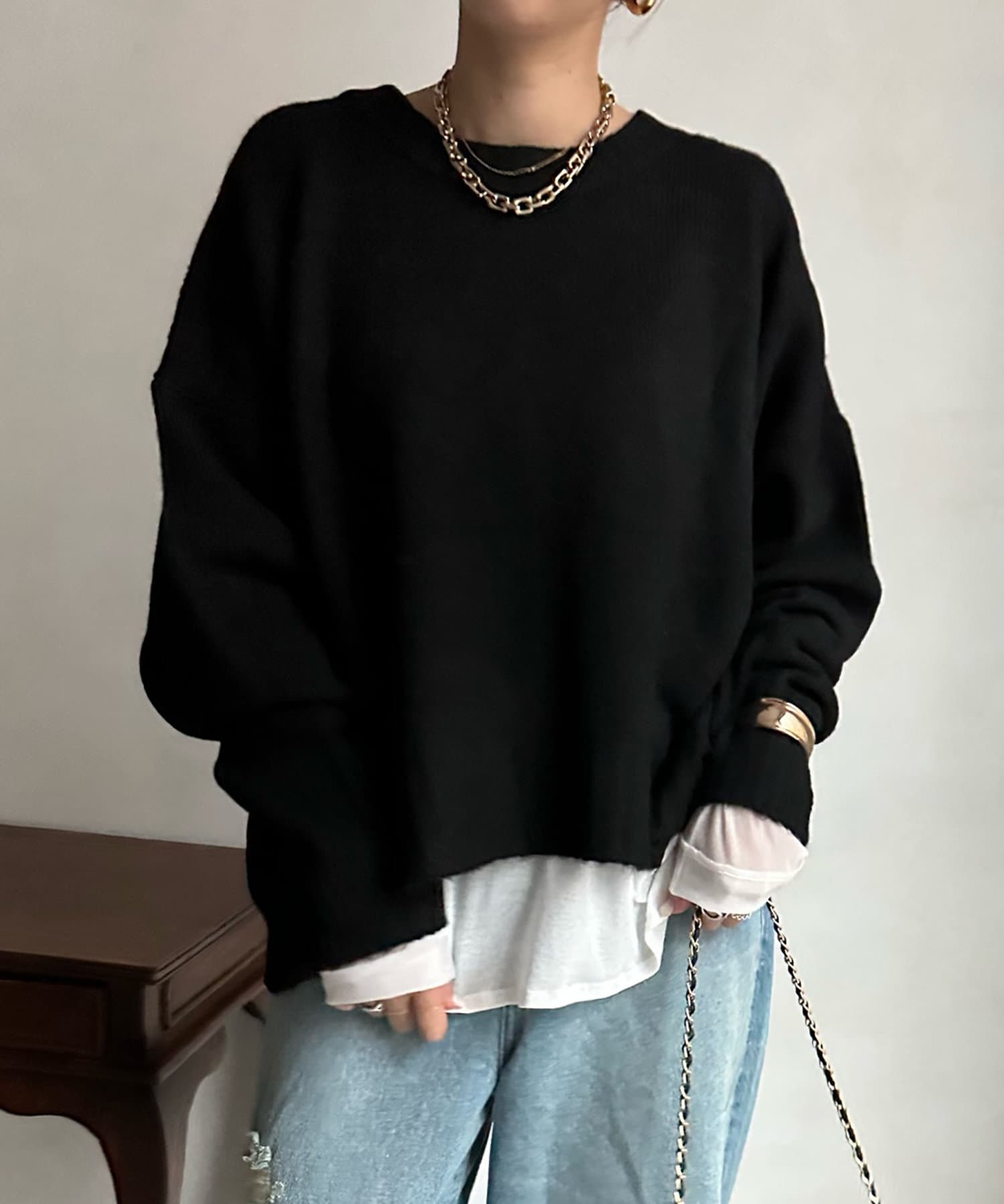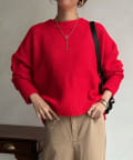 身幅が広くショルダーの落としたデザインと程よくコンパクトな丈感が、様々なシルエットのボトムにマッチしてくれるニット。
