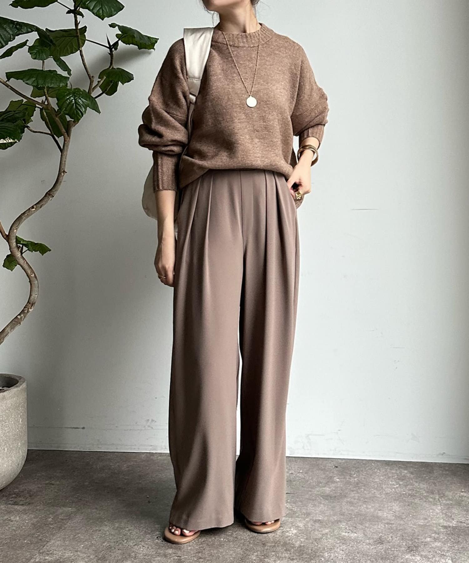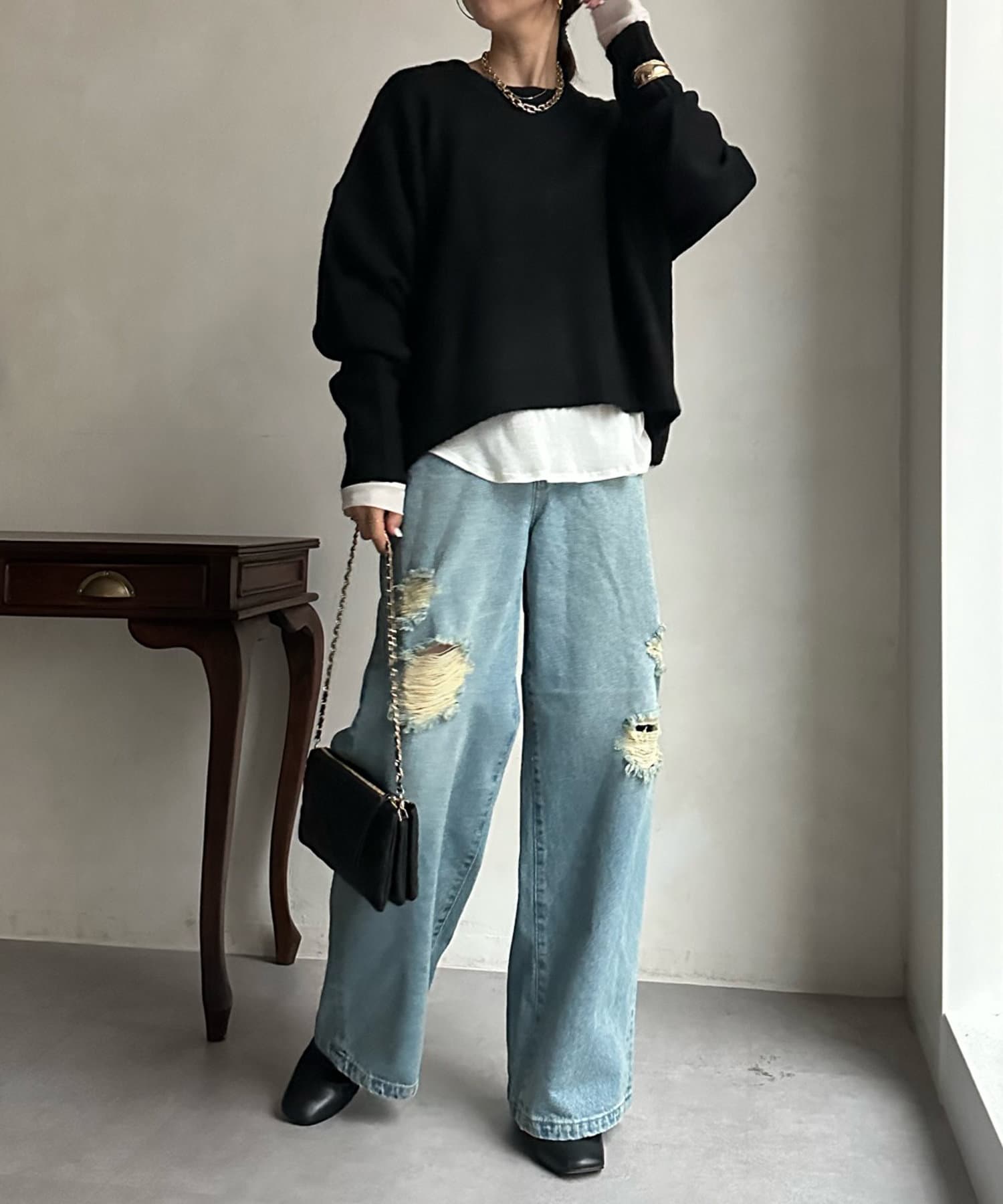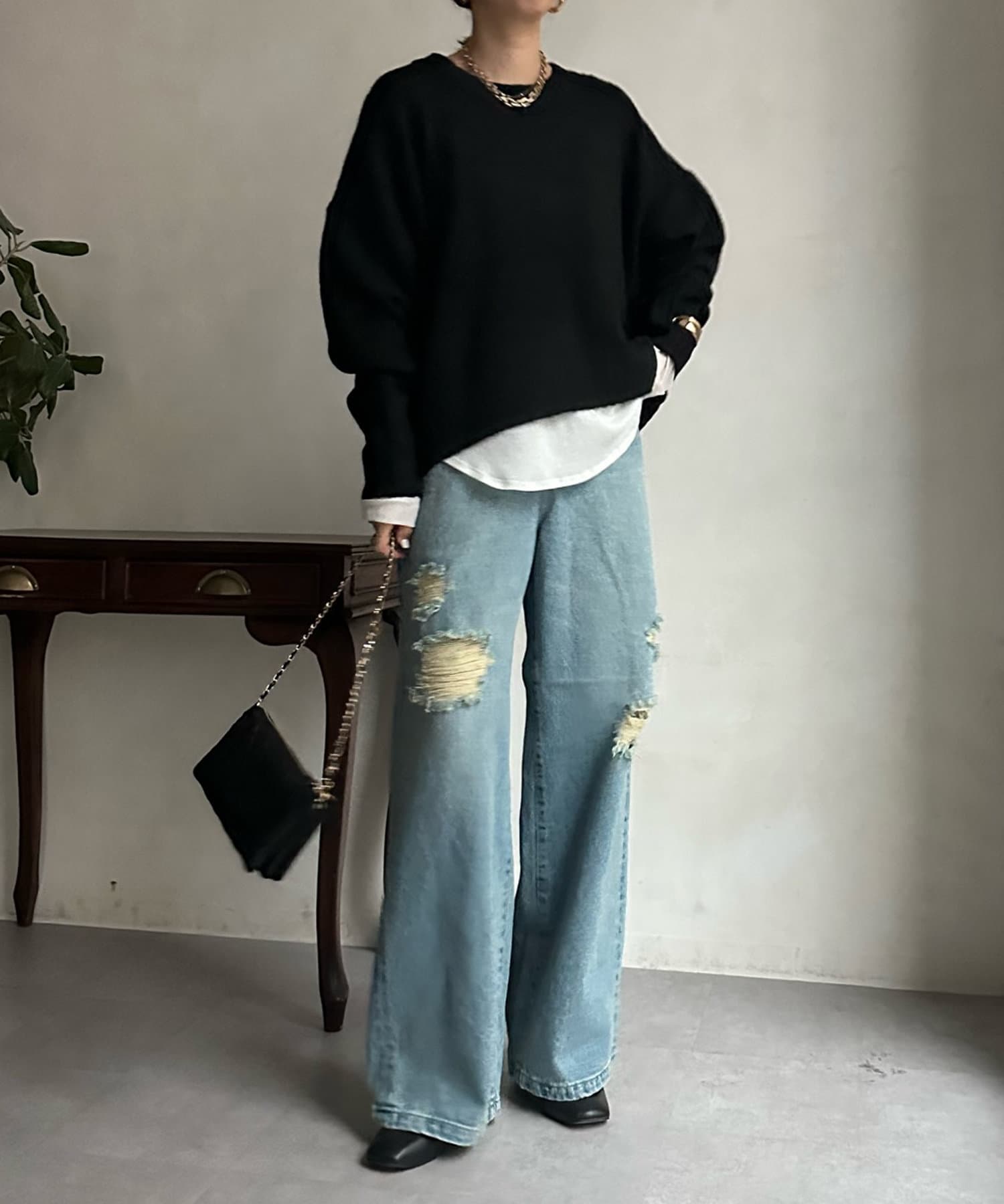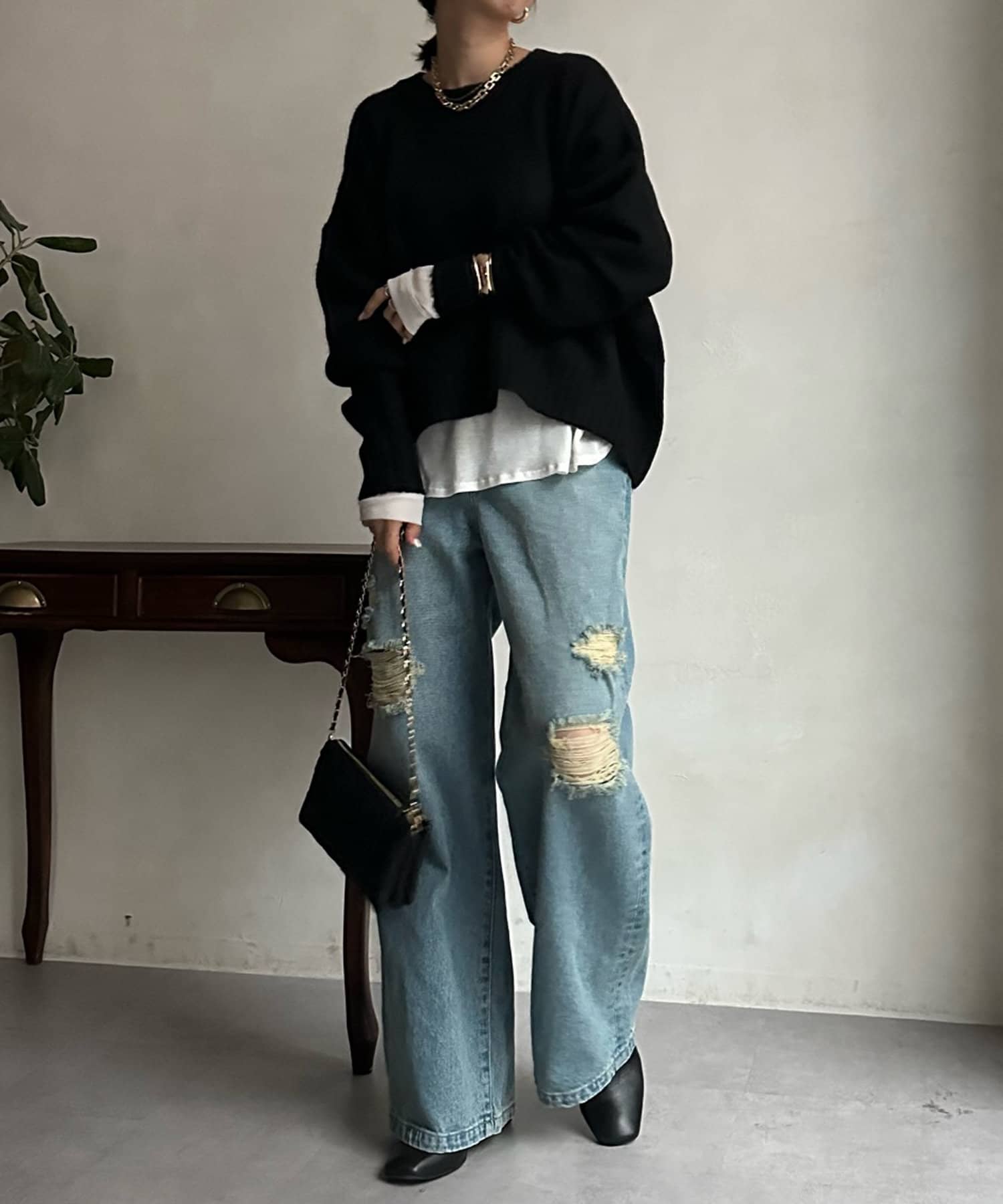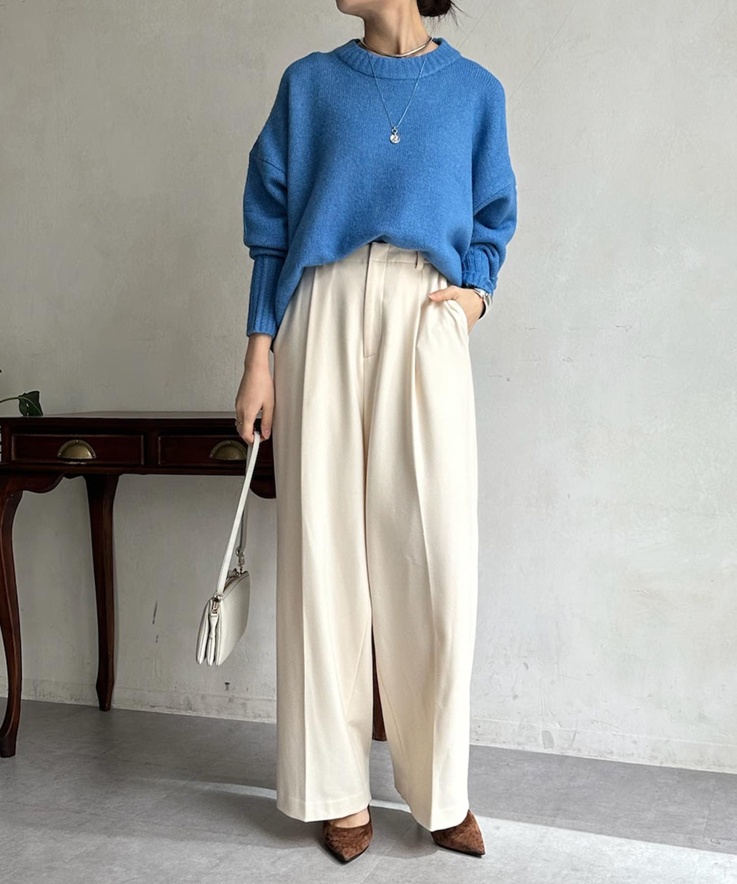 身幅が広くショルダーの落としたデザインと程よくコンパクトな丈感が、様々なシルエットのボトムにマッチしてくれるニット。
