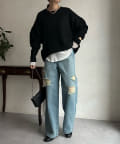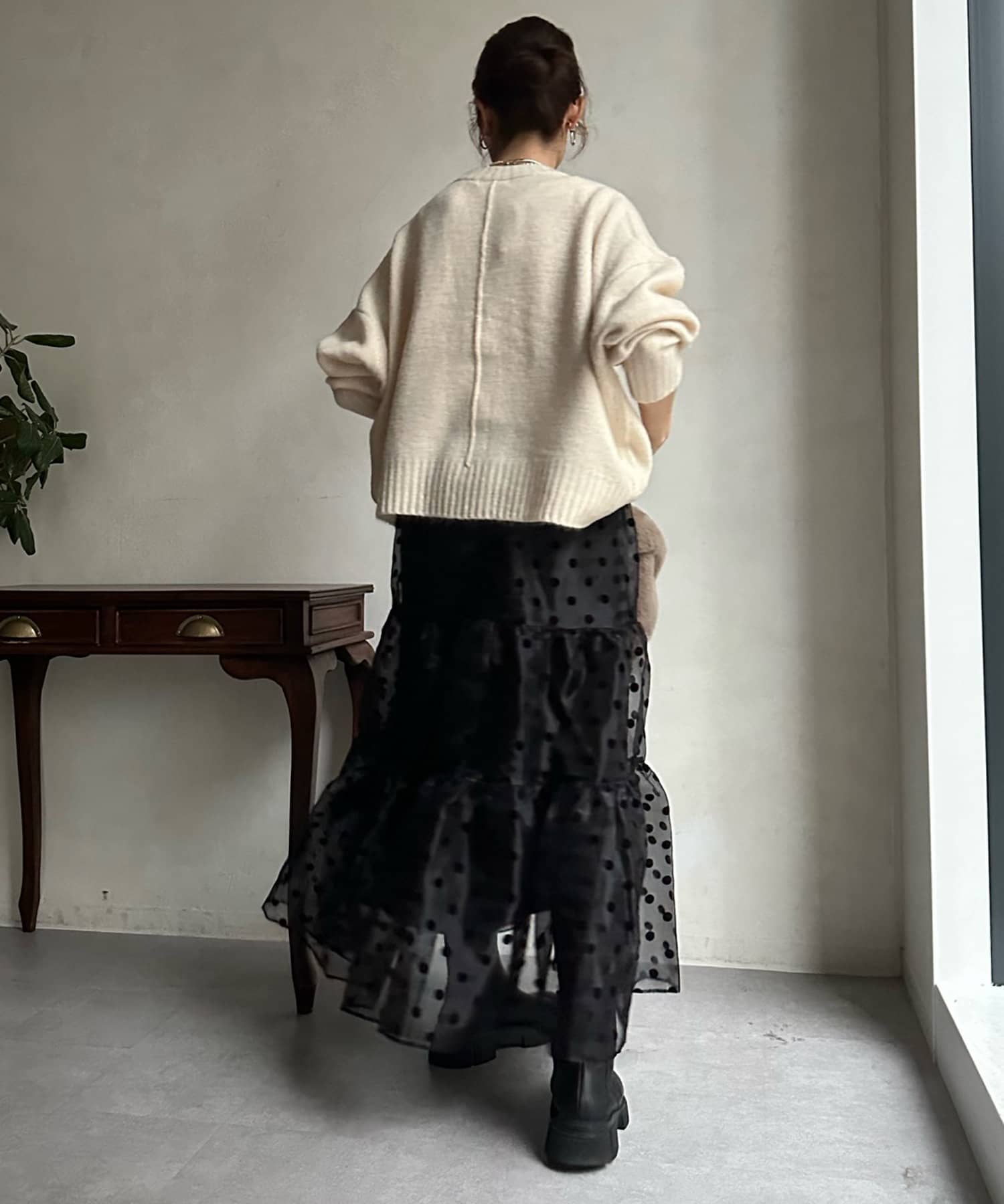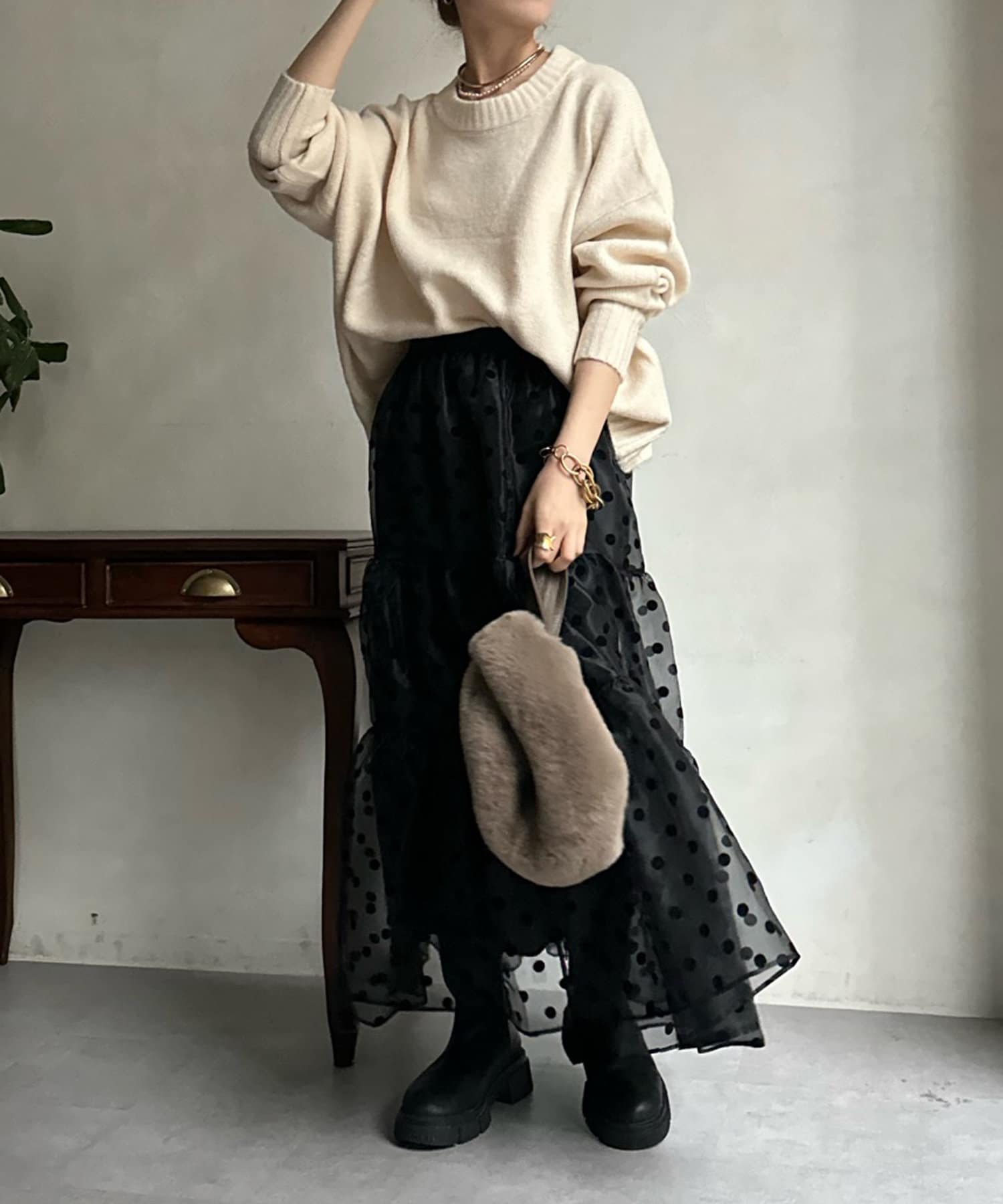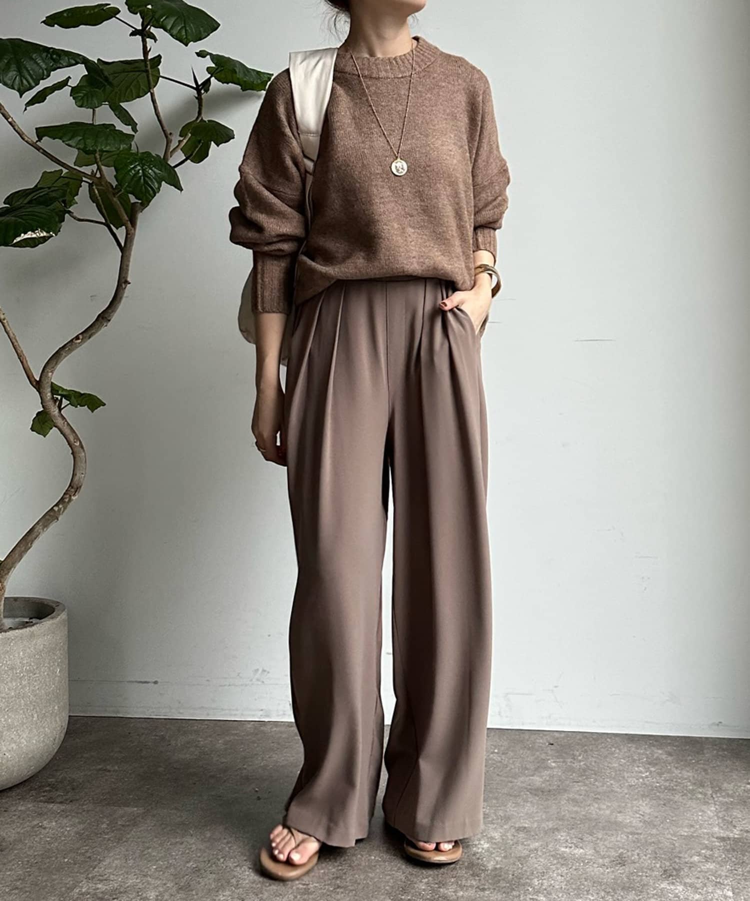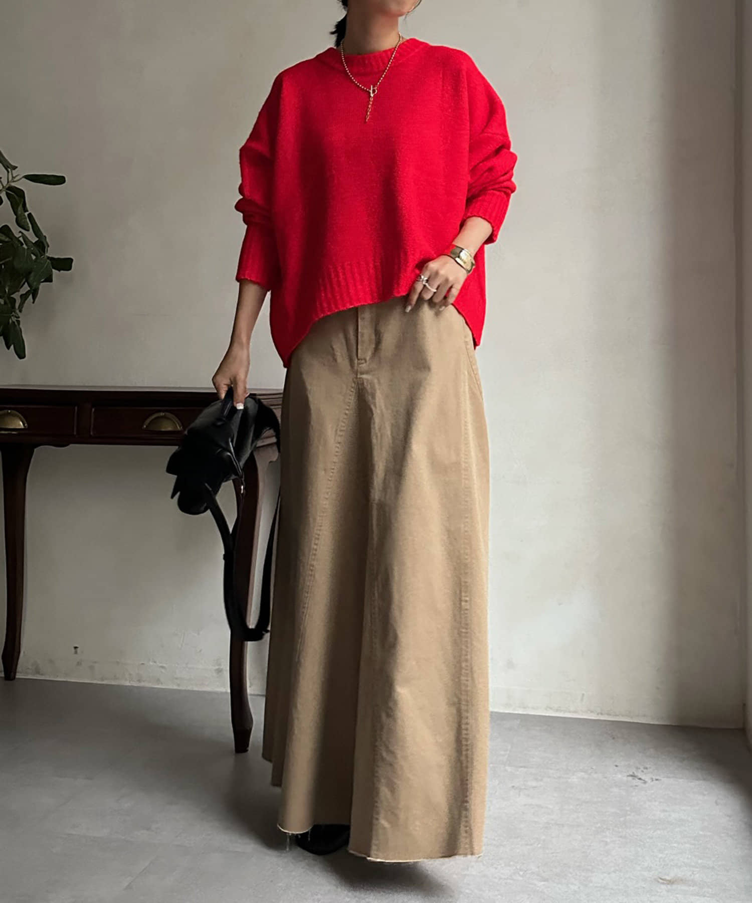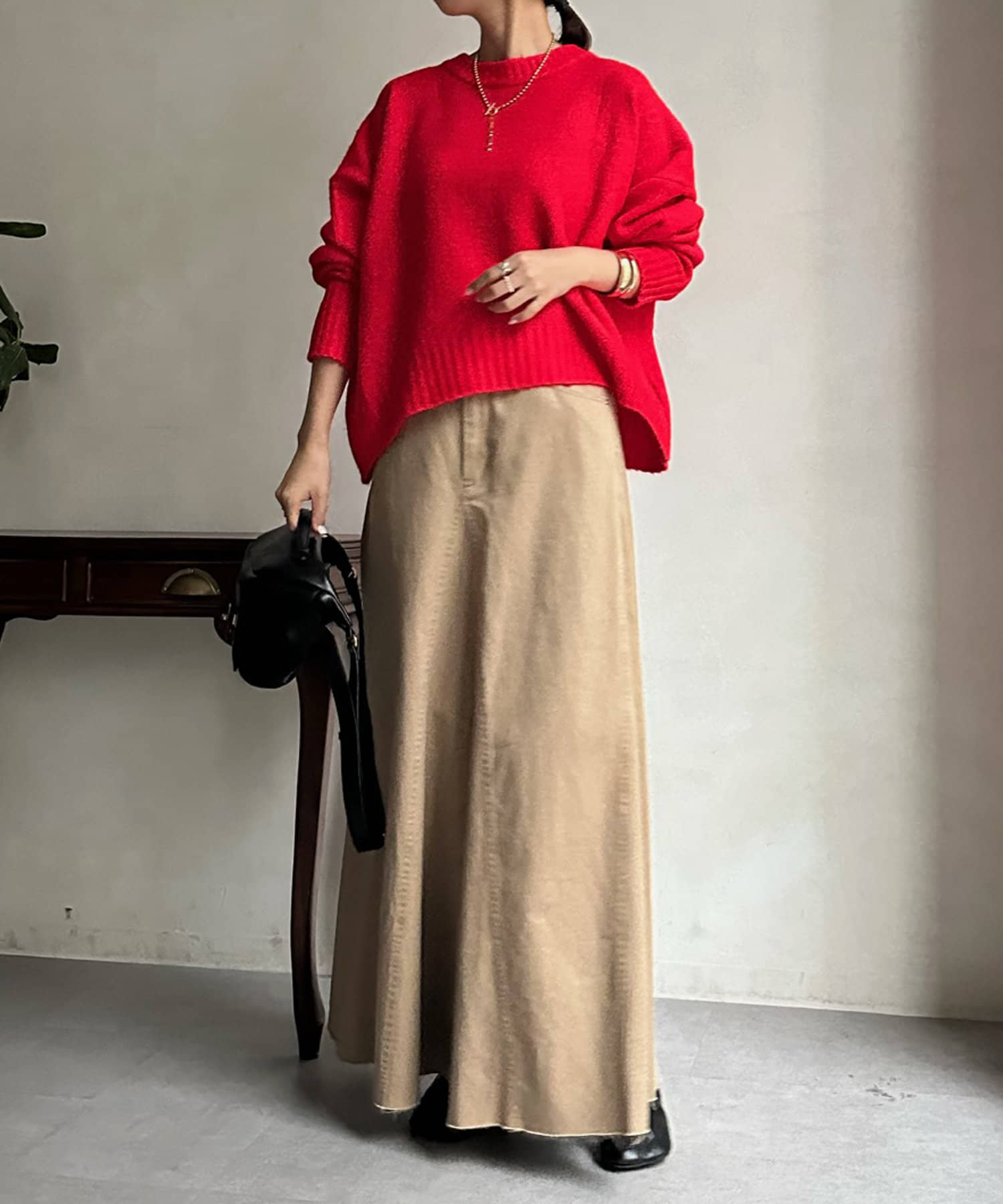 身幅が広くショルダーの落としたデザインと程よくコンパクトな丈感が、様々なシルエットのボトムにマッチしてくれるニット。