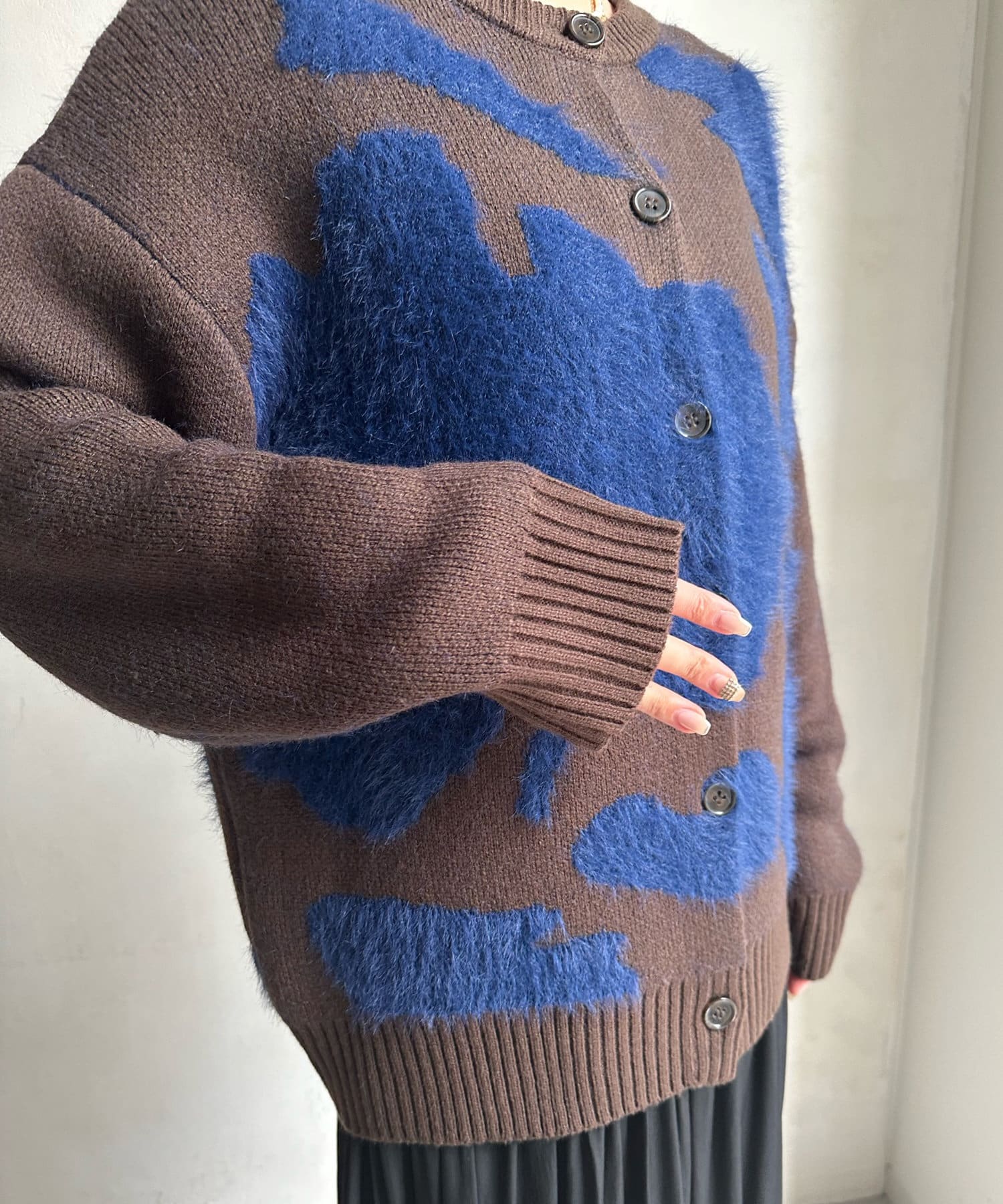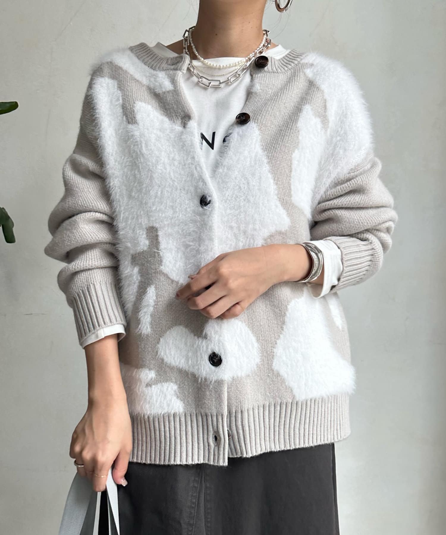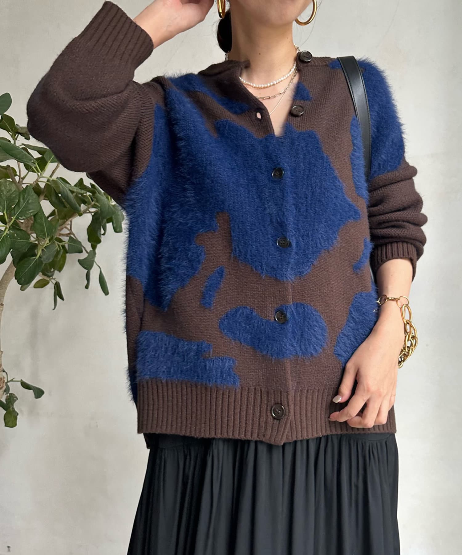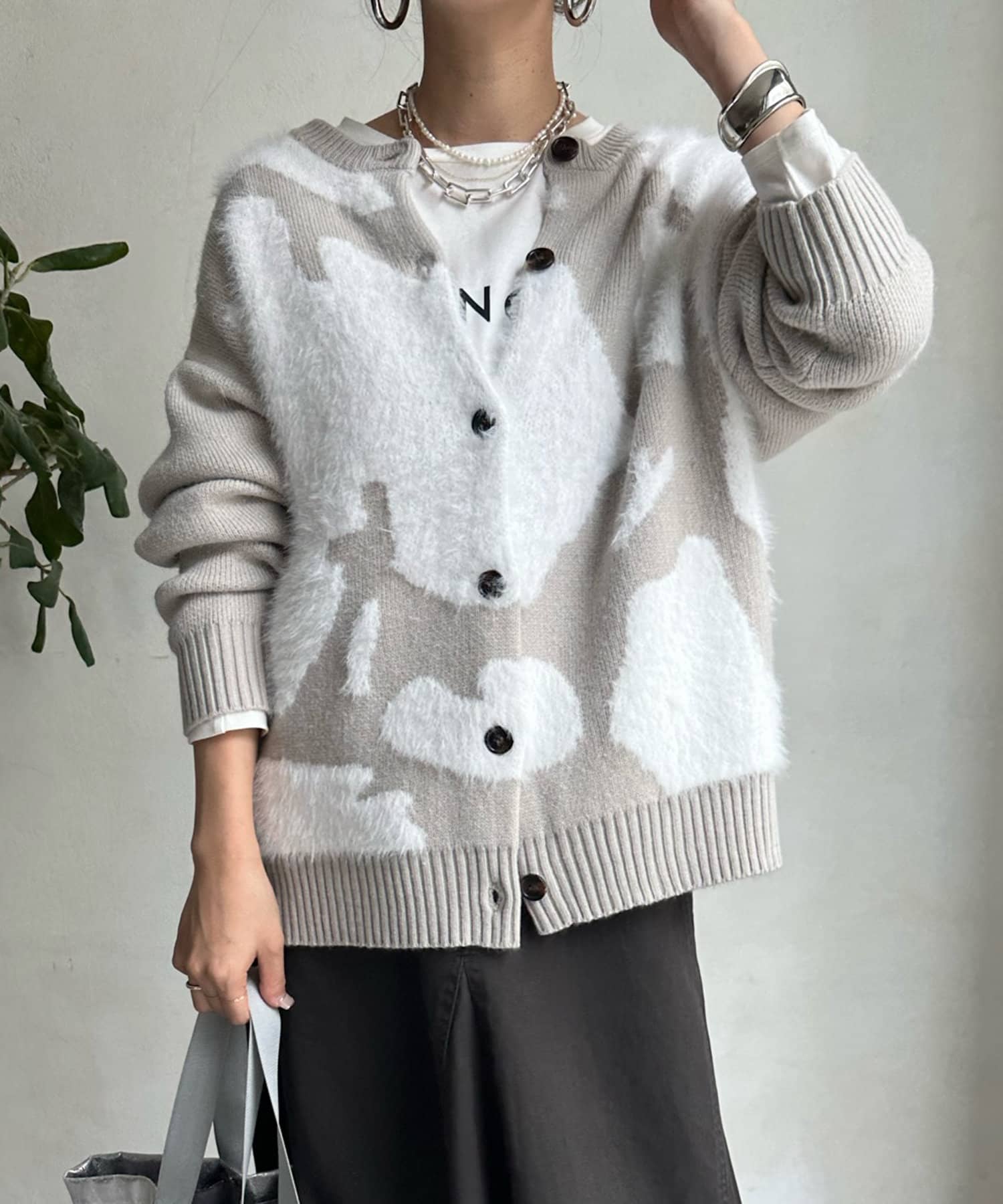 柄を引き立てる雰囲気ある起毛感がポイントのカーディガン。