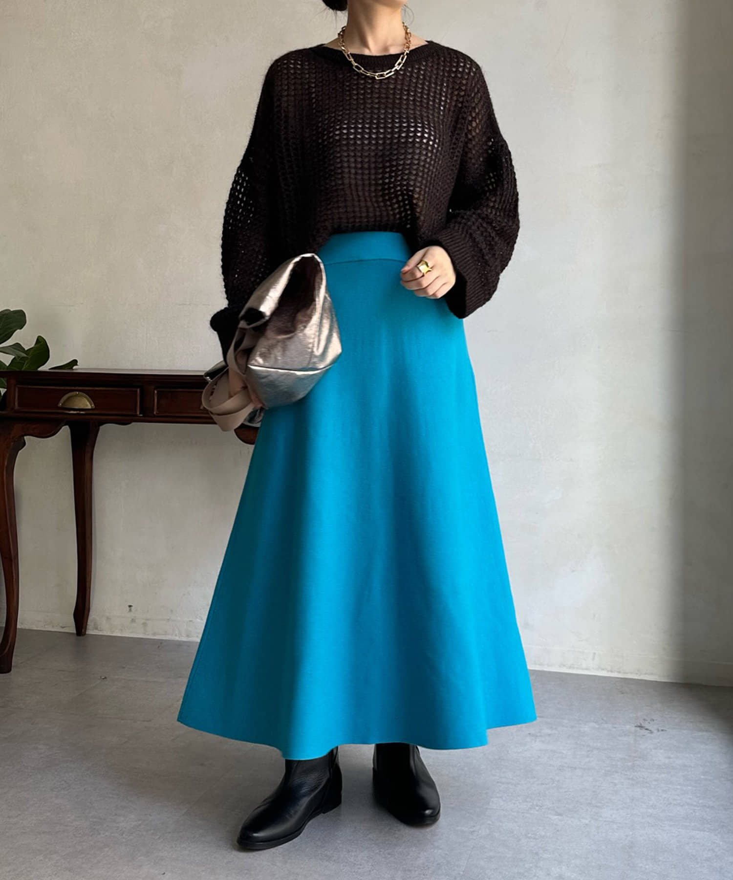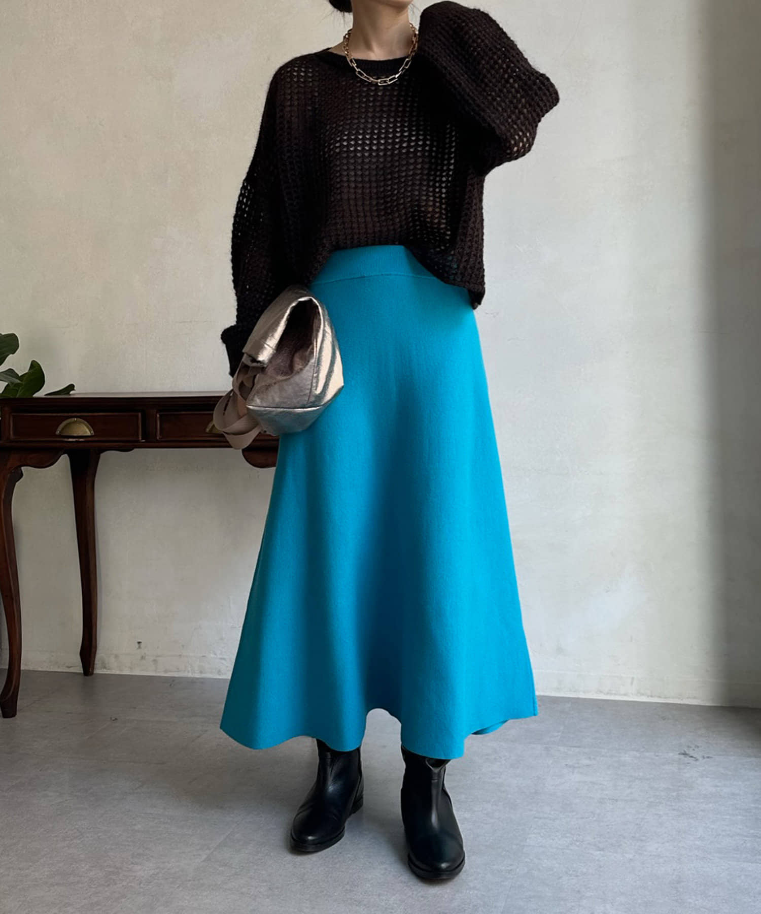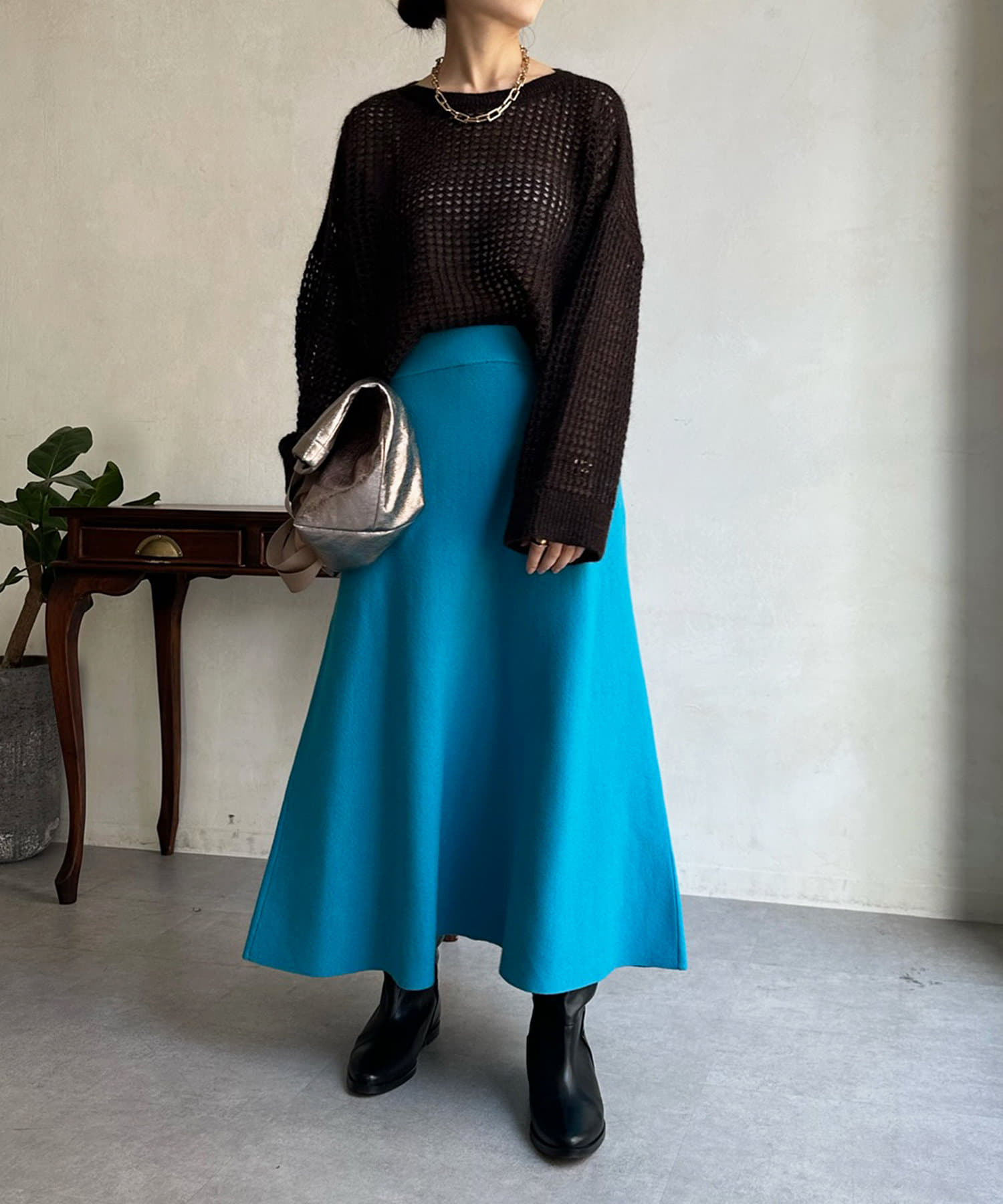 粗めの編地はインナー次第でガラリと印象を変えてくれるので、様々な着こなしを楽しんでいただけますよ。