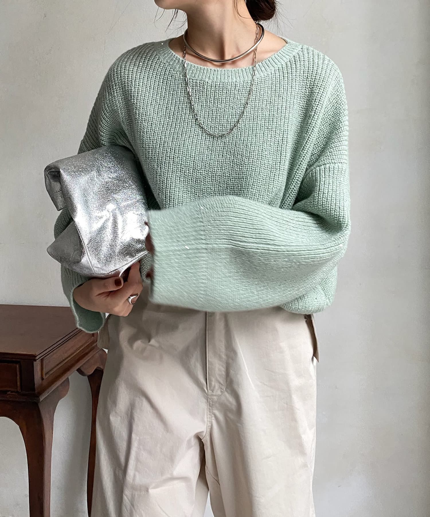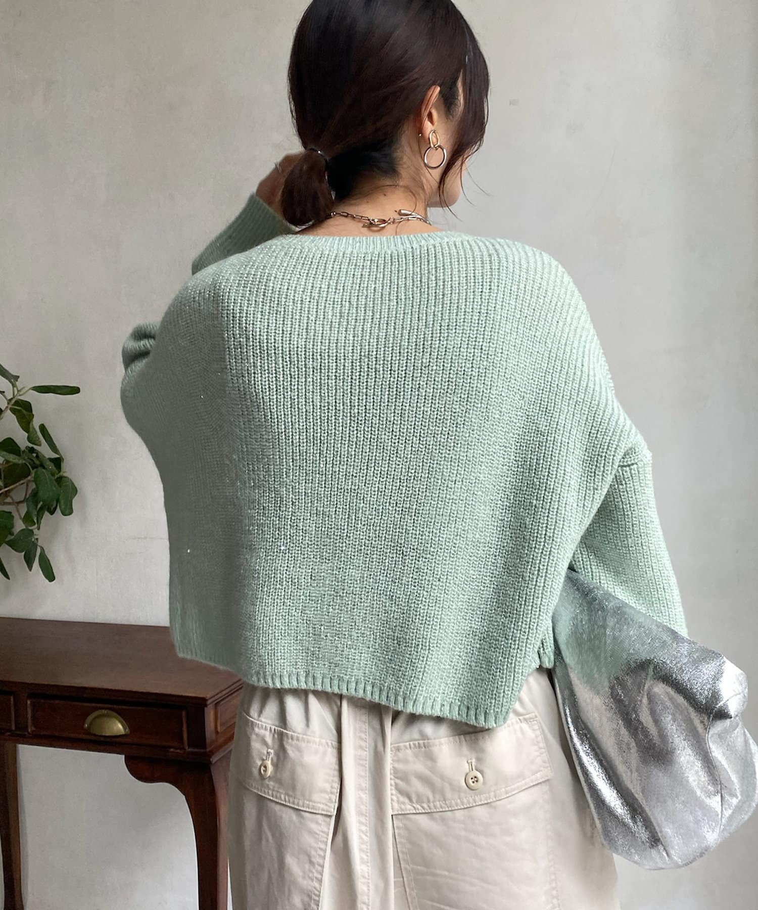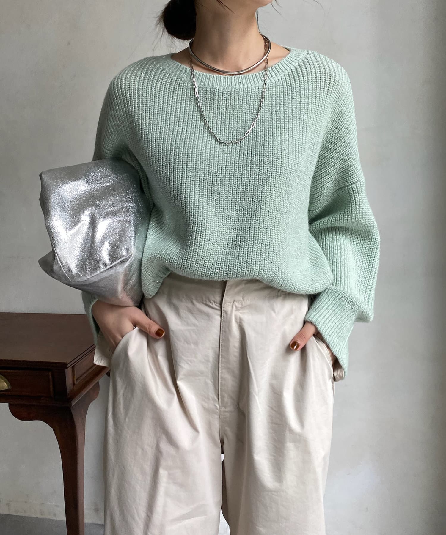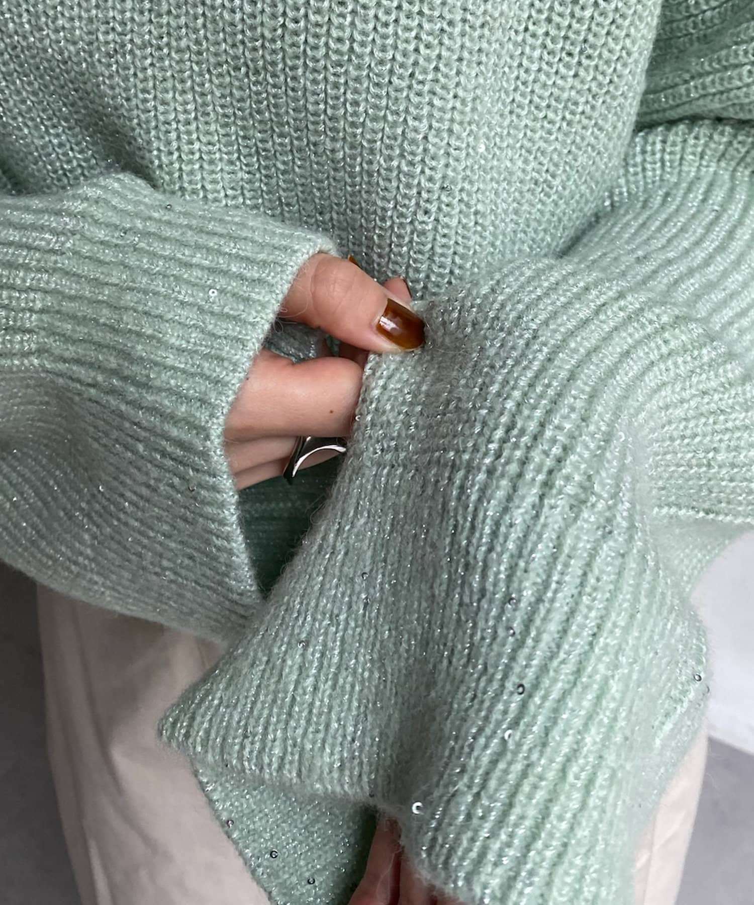 ギラギラとしすぎず、さりげない輝き感がトレンドアイテムながらも大人に決まるポイントですよ。