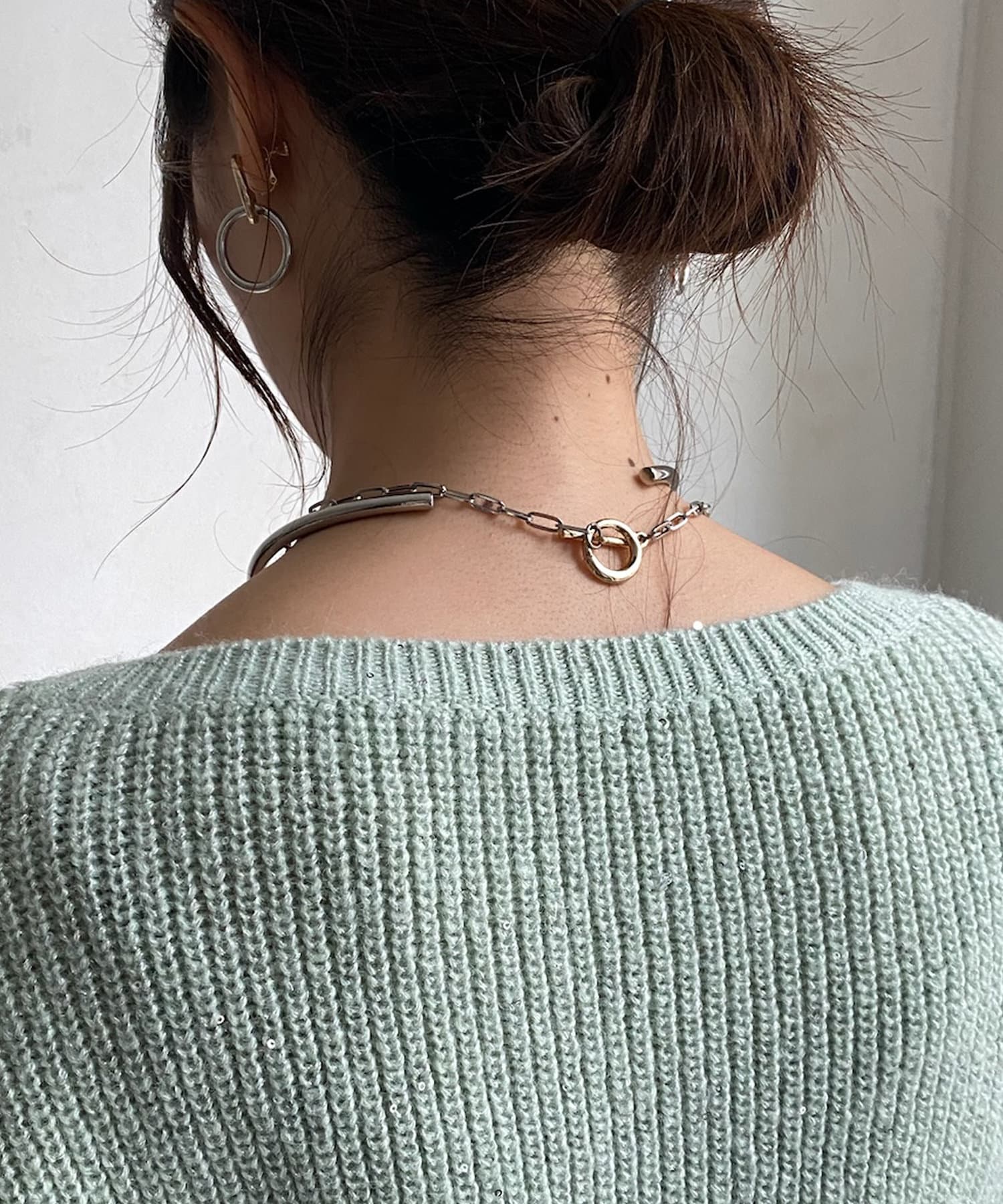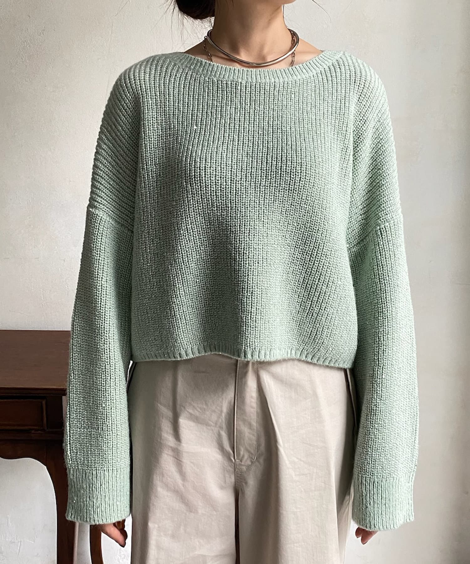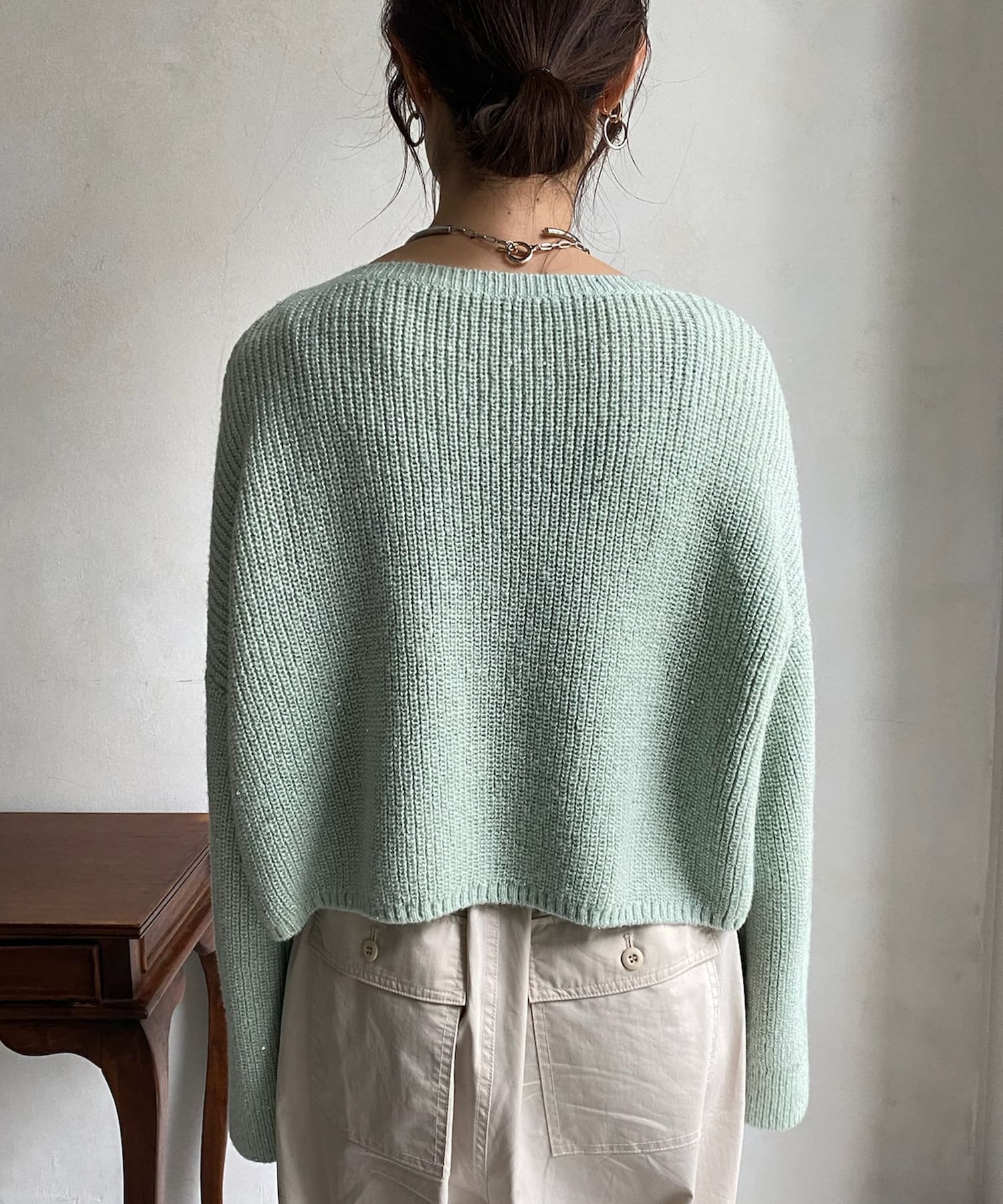 スパンコールが散りばめられたショート丈のニット。