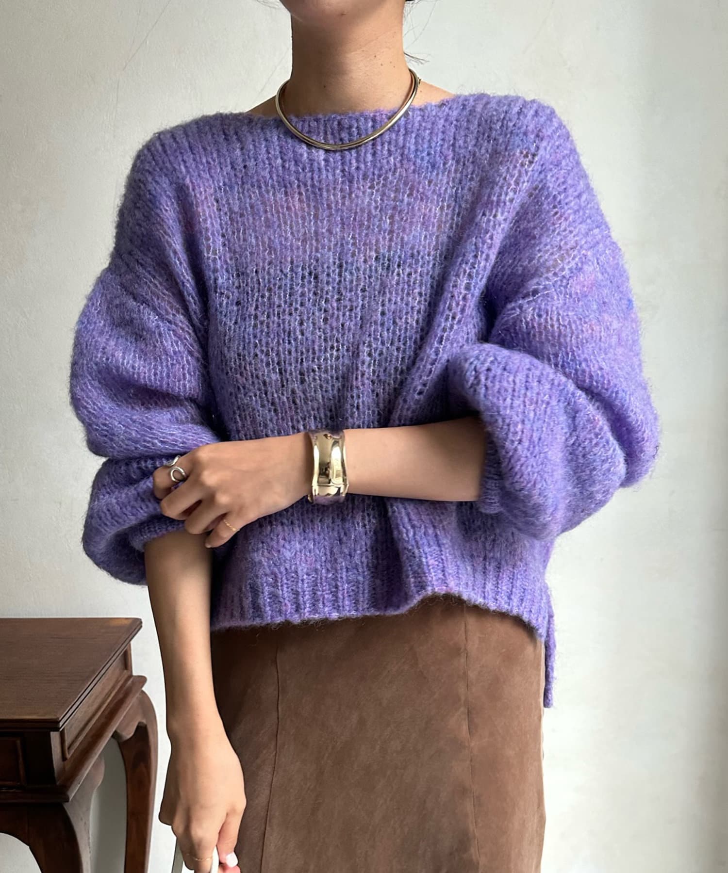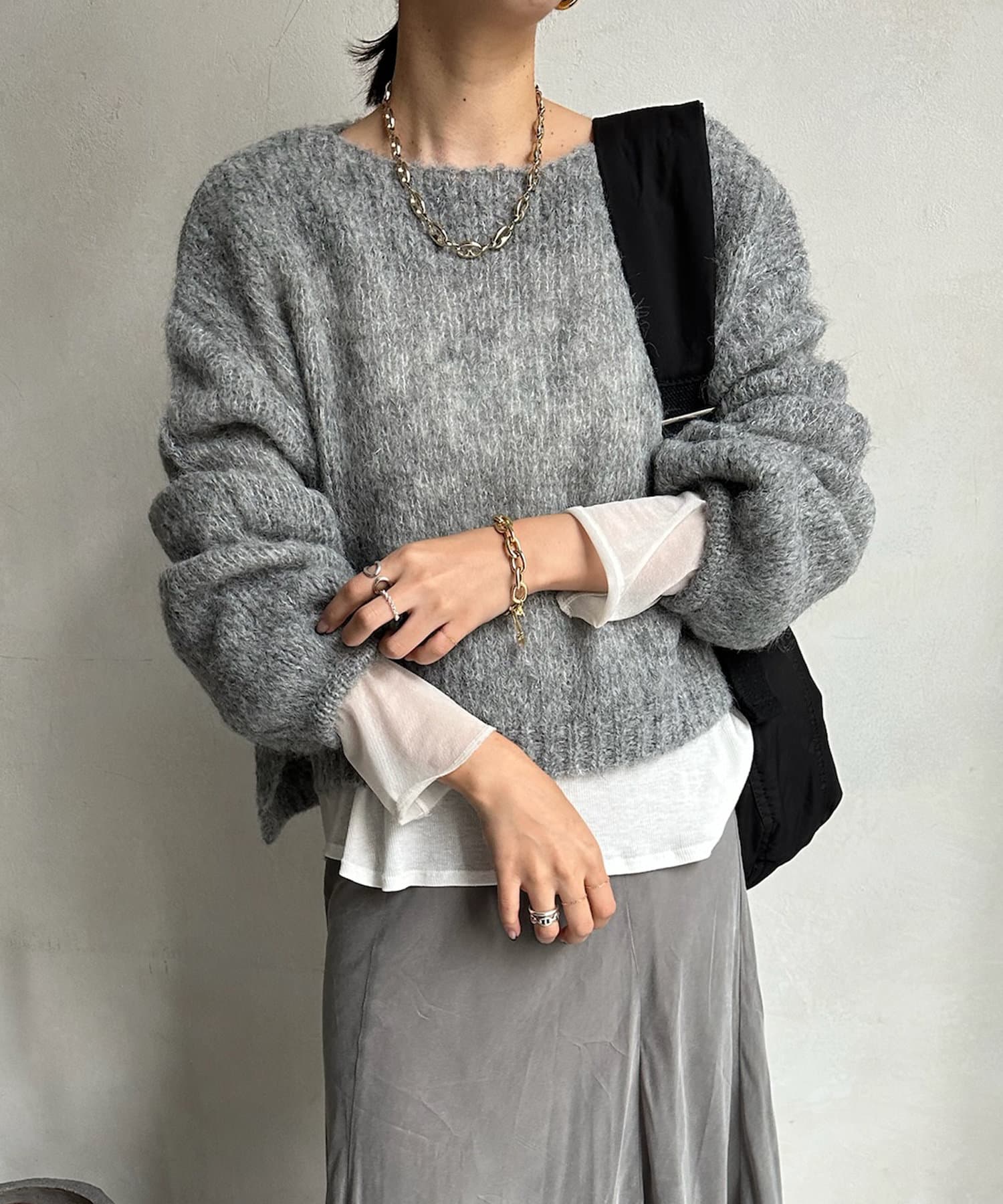 秋冬らしいモヘヤ混の素材のニットは、表情感が出るよう編み地をさり気なく切り替えているのがポイント。