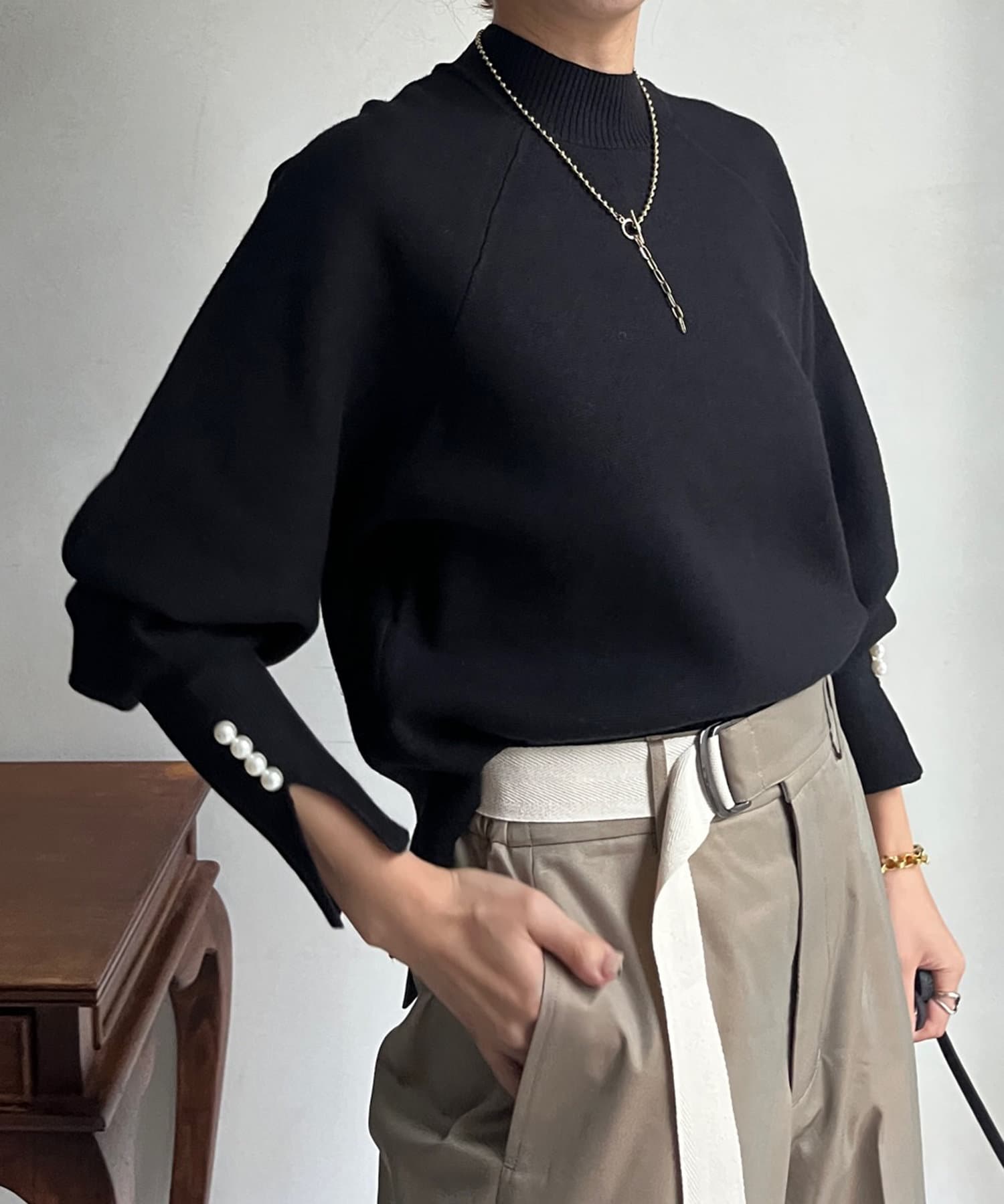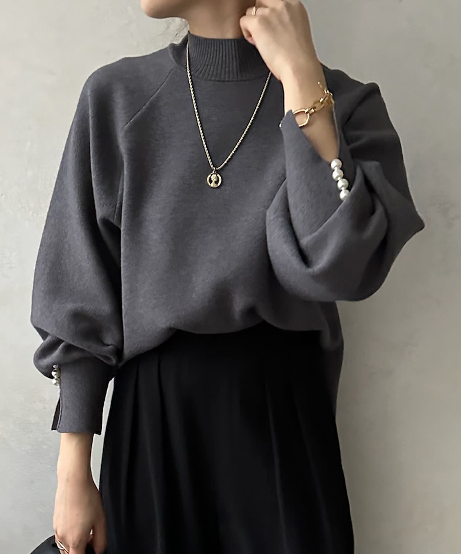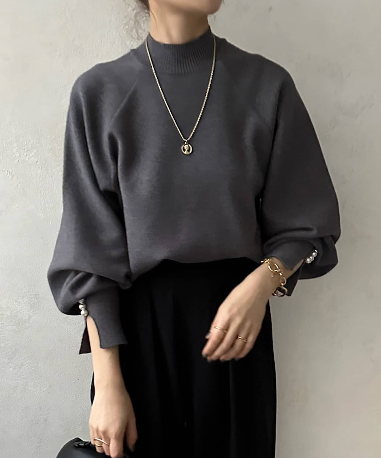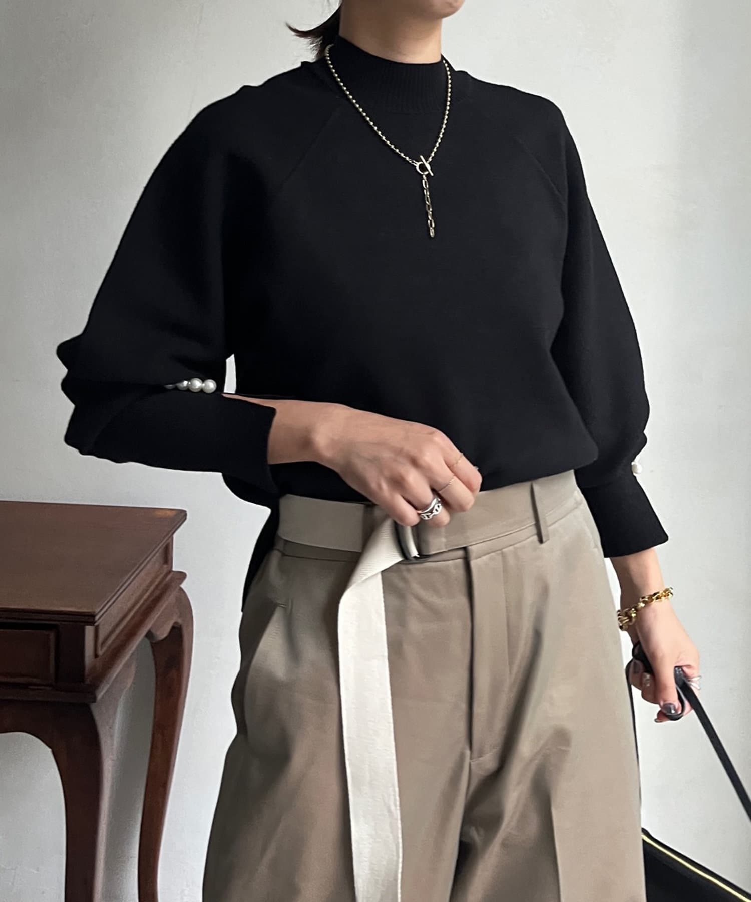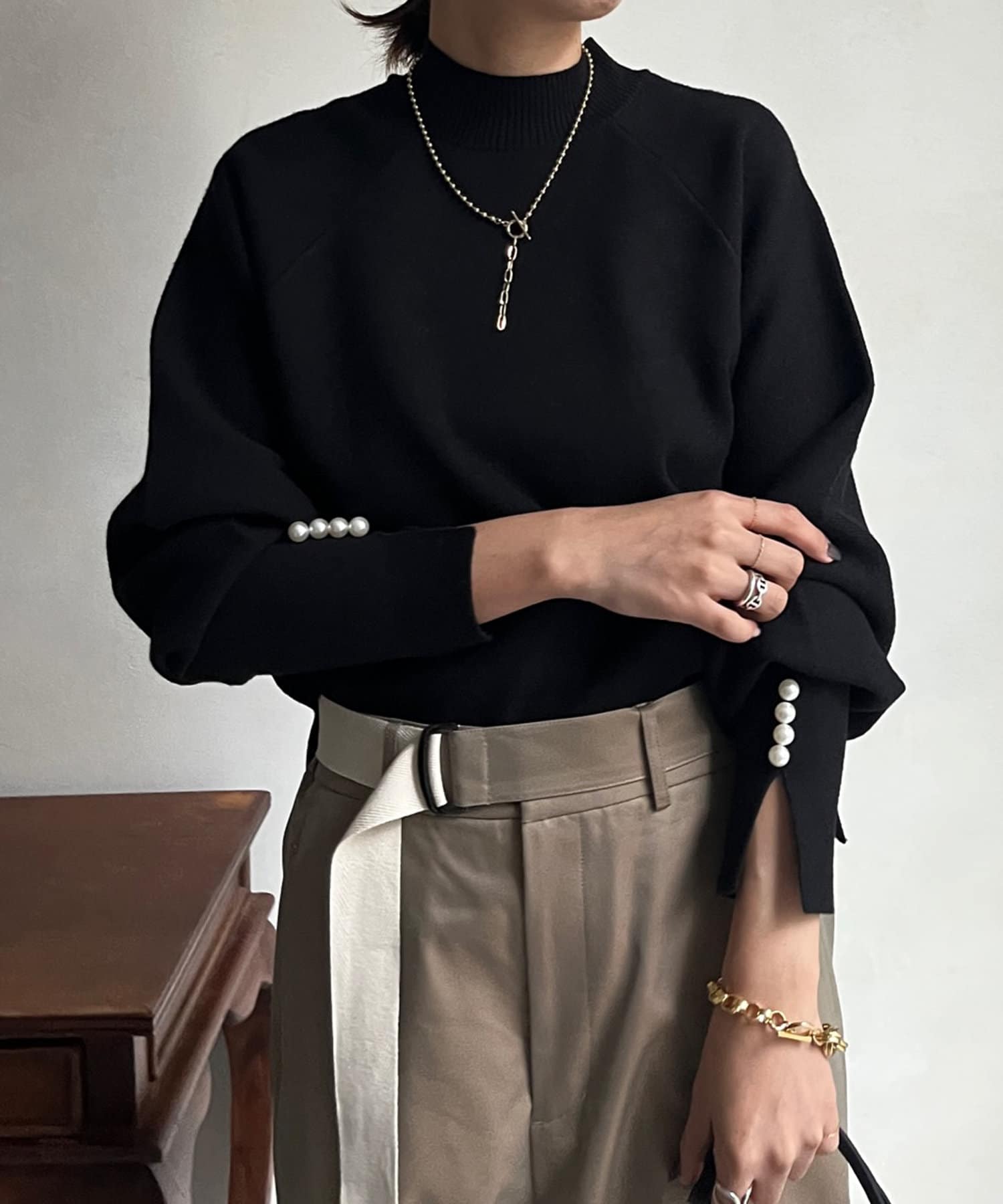 首元が詰まっているデザインと袖のパールとスリットがフェミニンな女性感をだしてくれます。