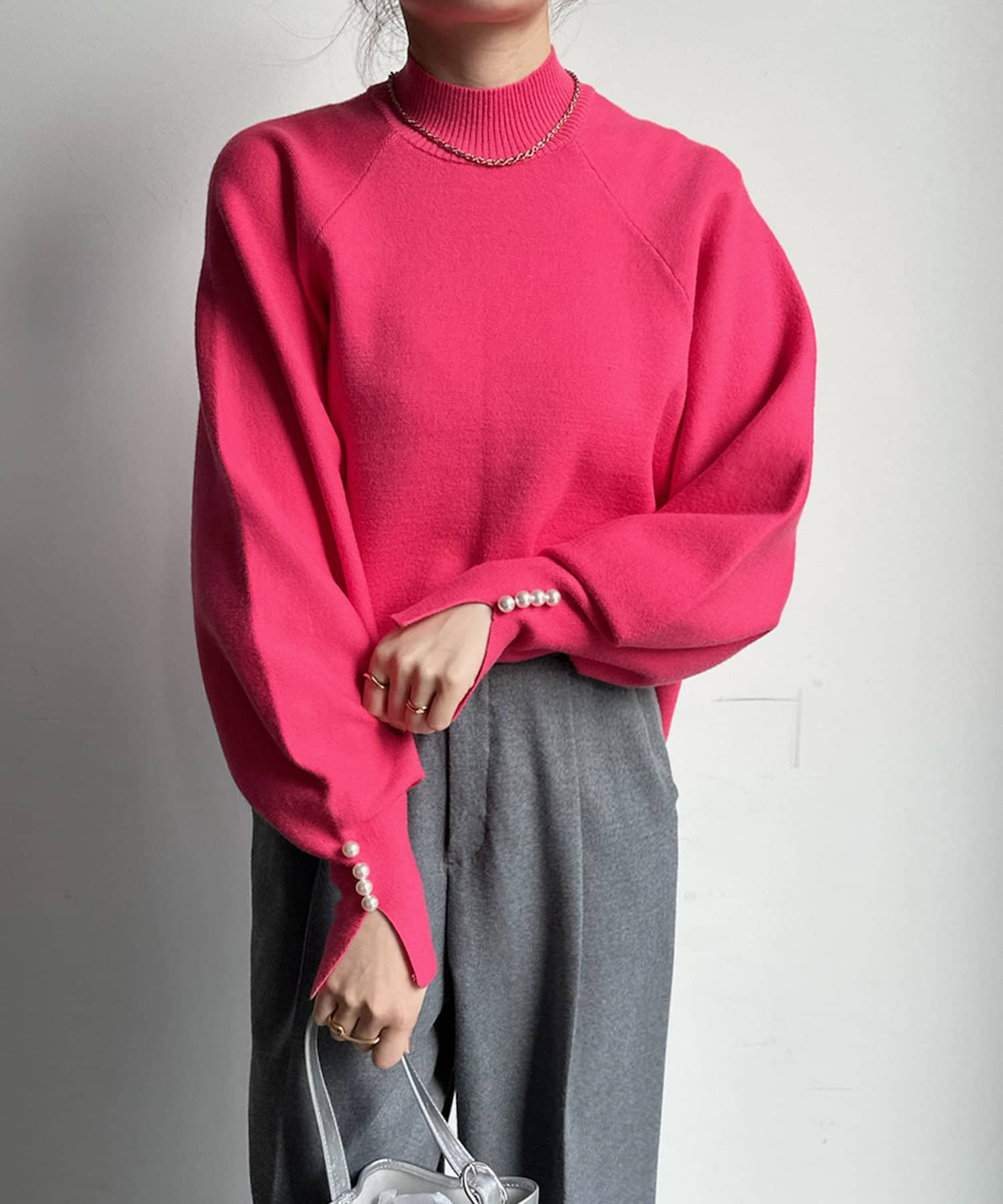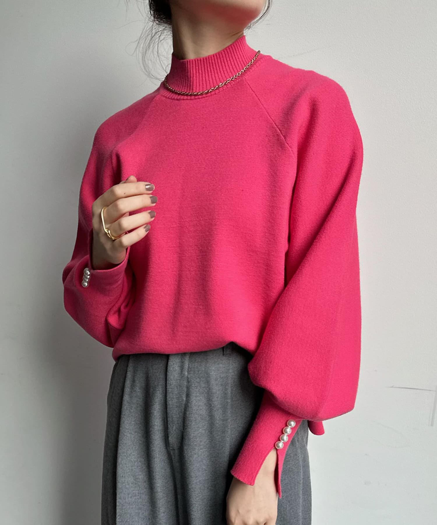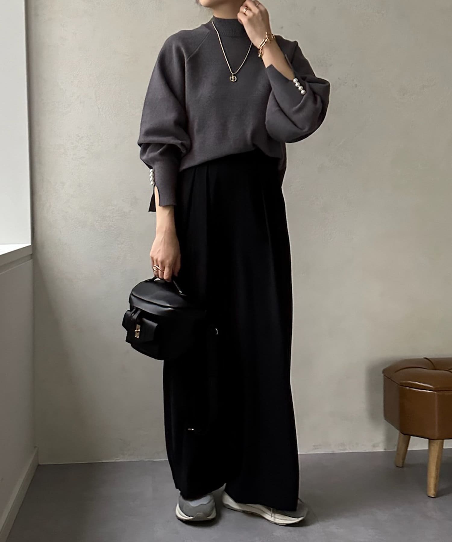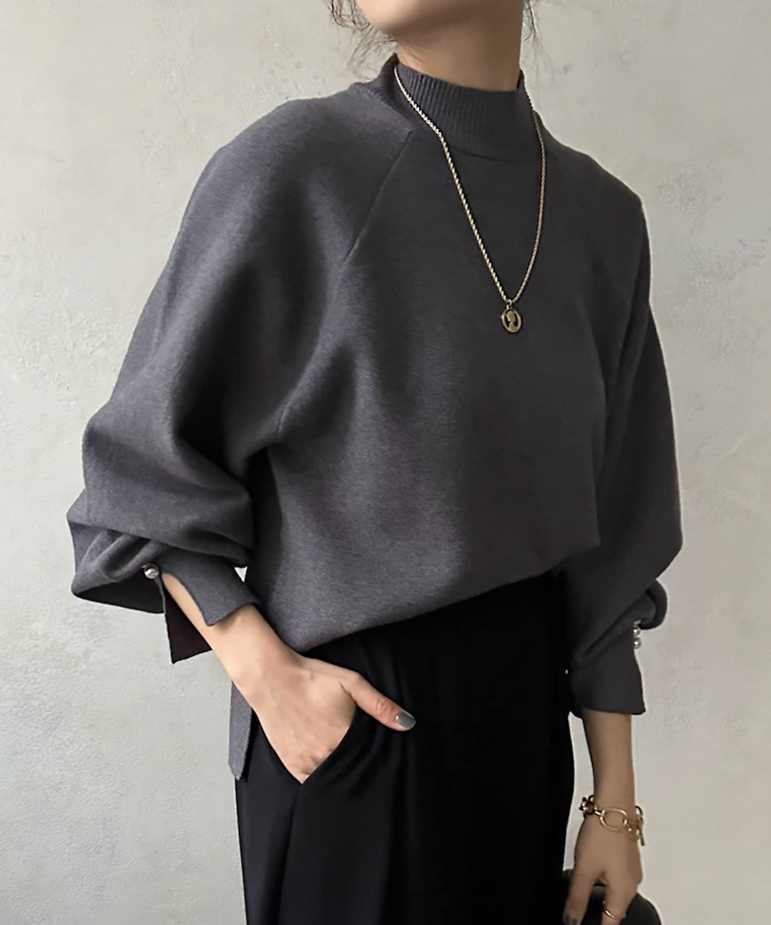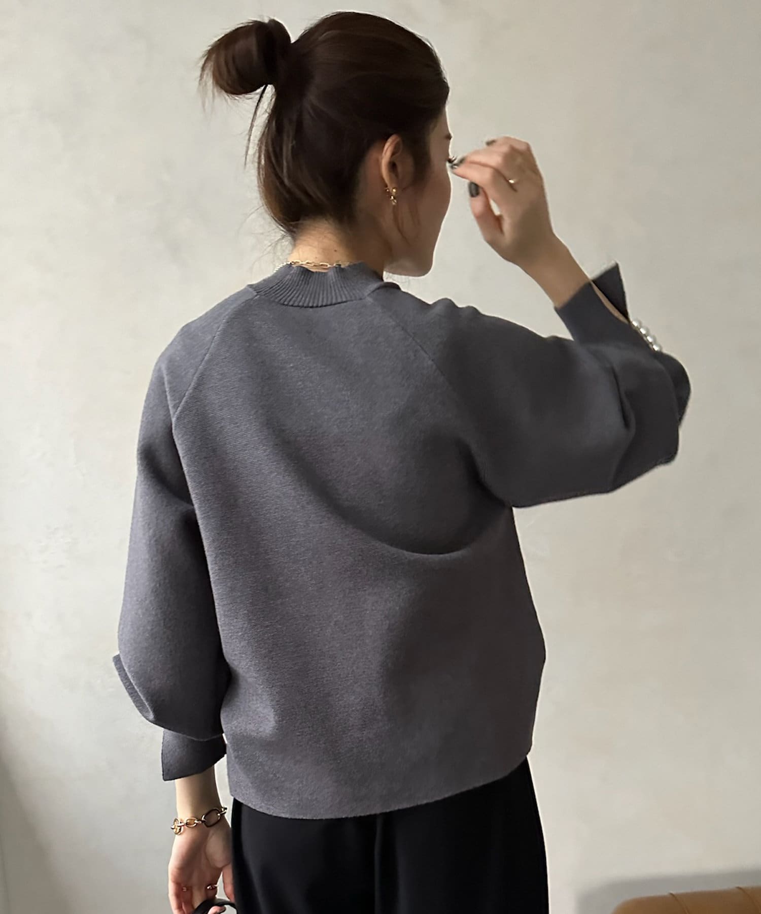 首元が詰まっているデザインと袖のパールとスリットがフェミニンな女性感をだしてくれます。