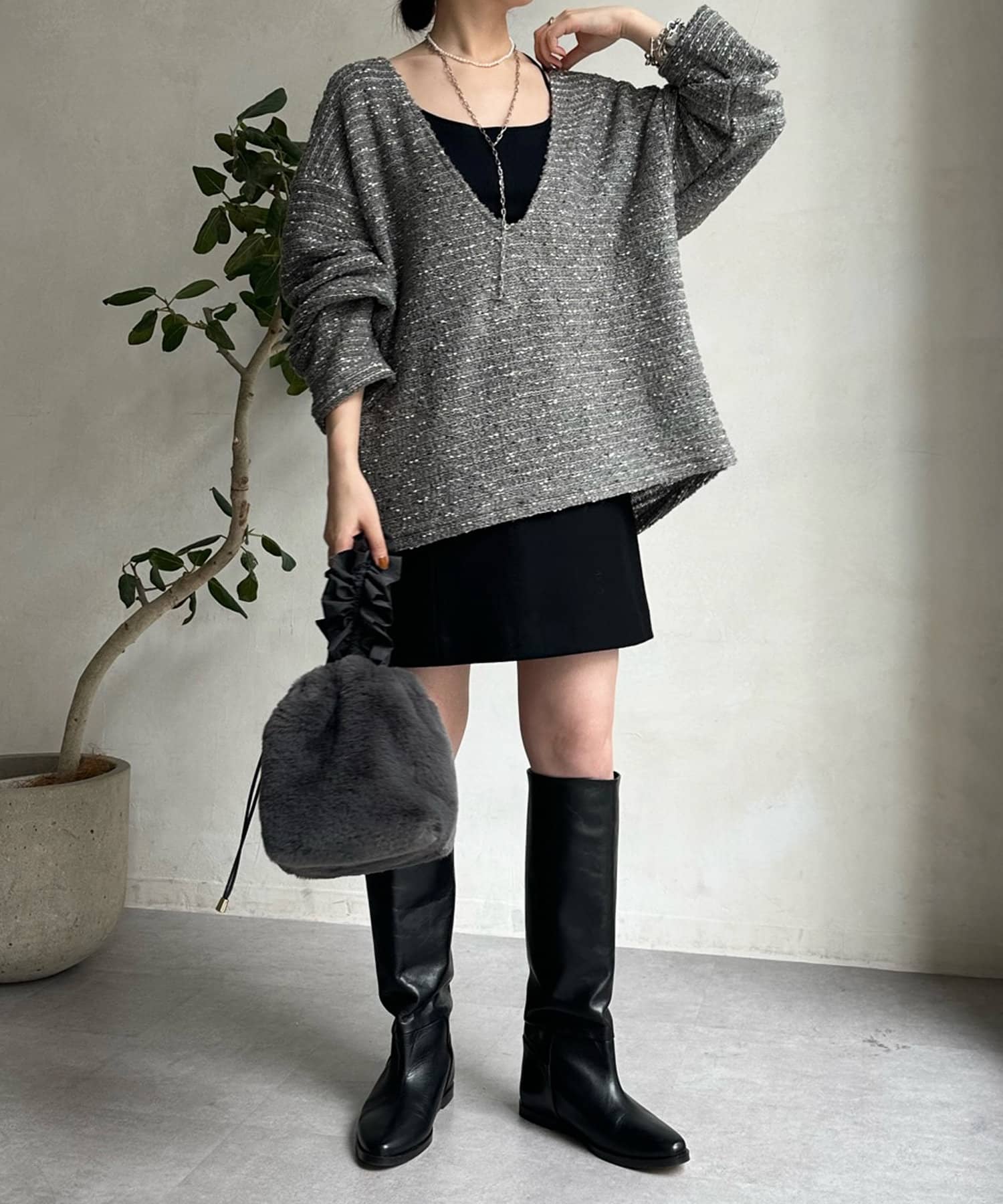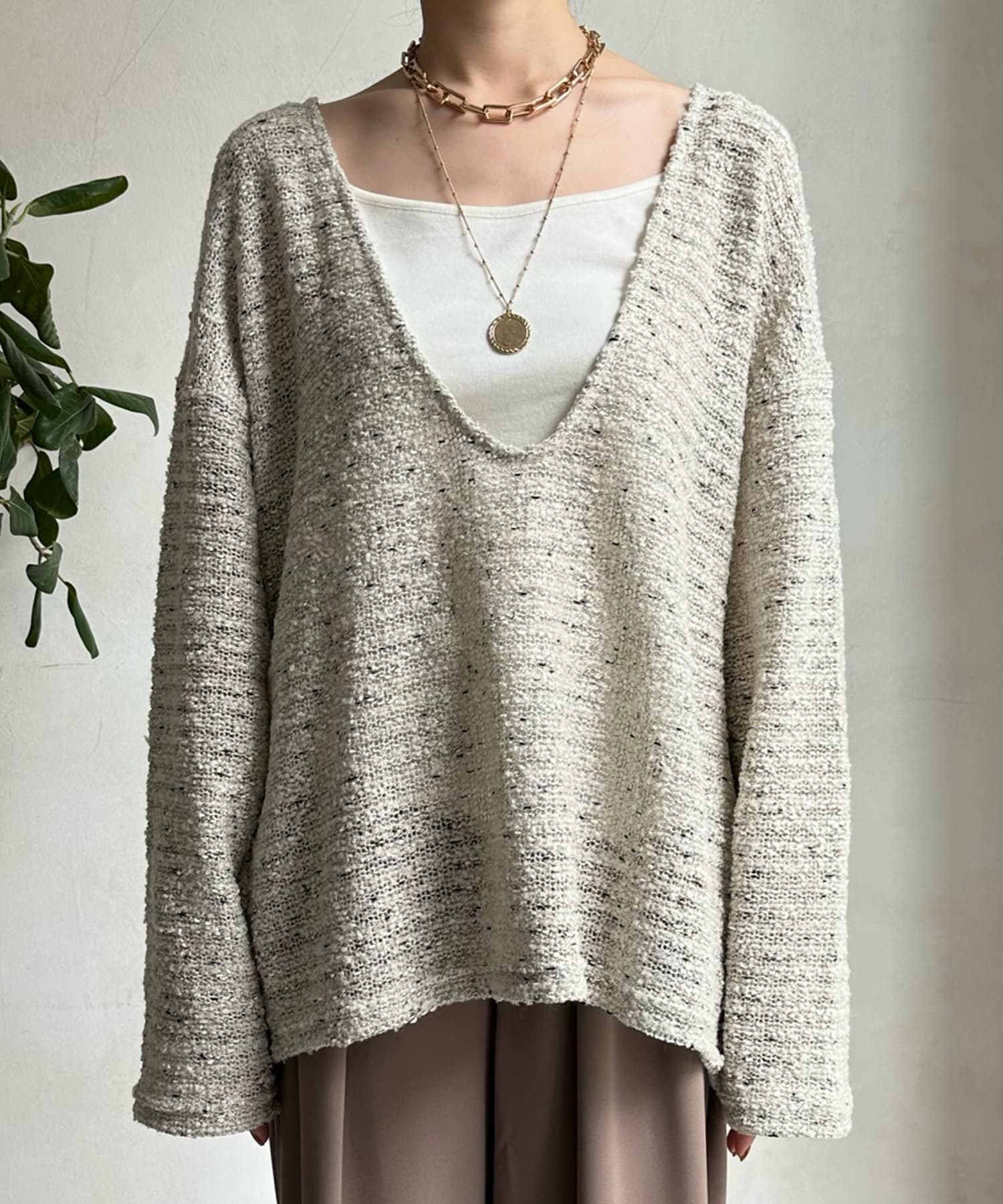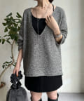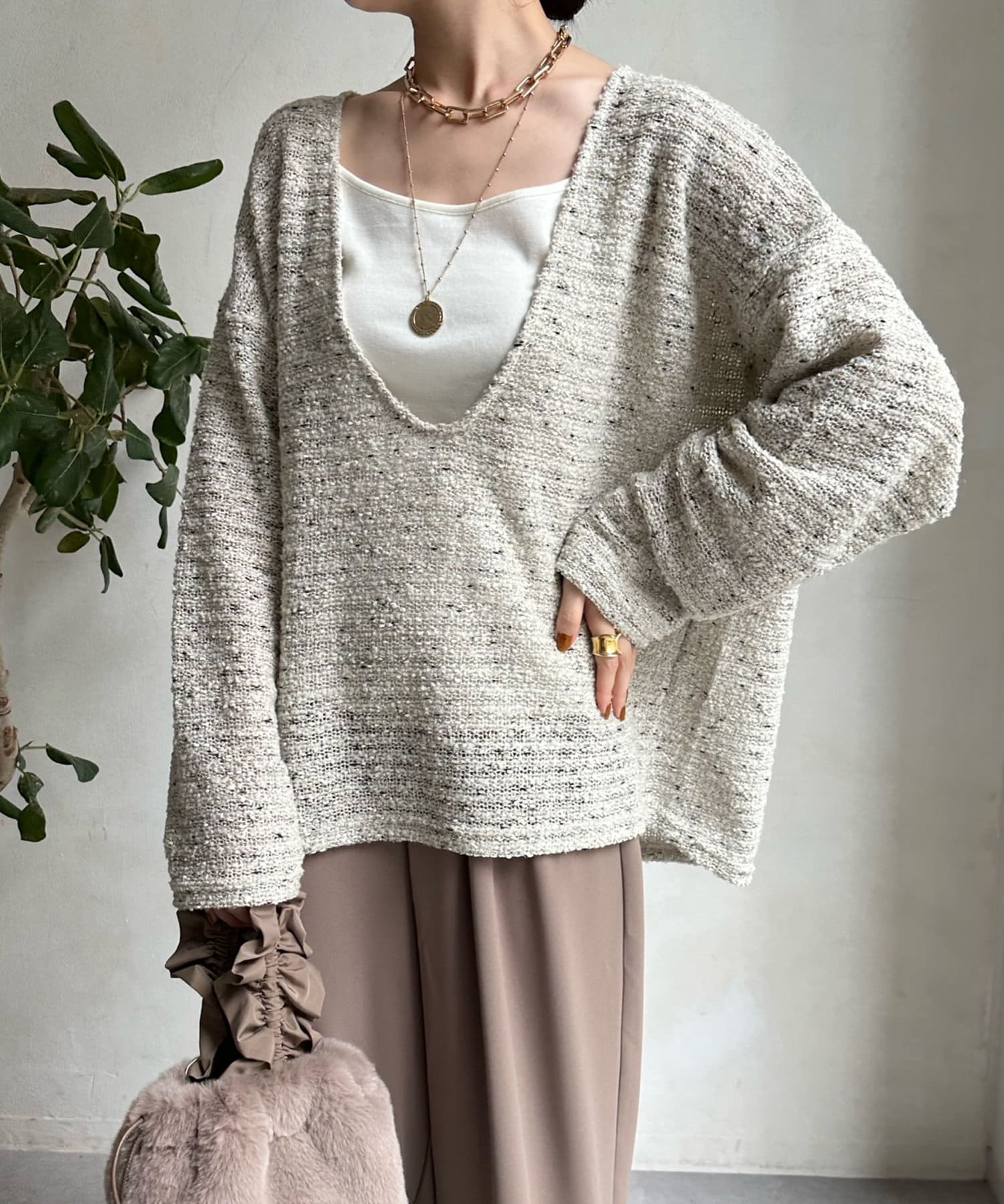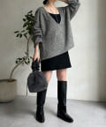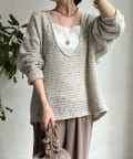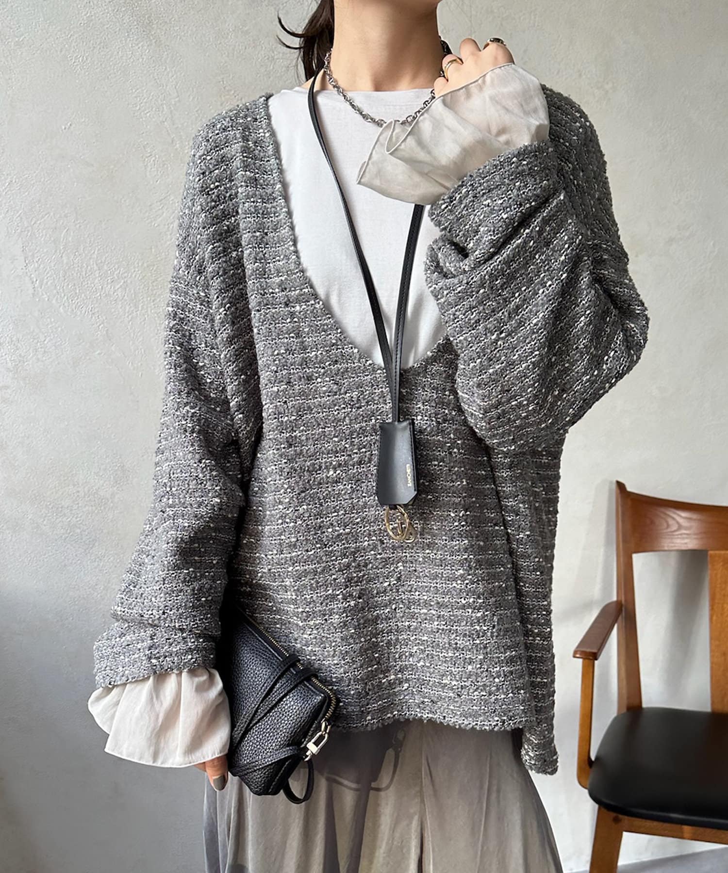 ざっくりとしたVネックがレイヤードのスタイルに映え、また、お顔周りをすっきりと見せてくれる効果も。
