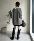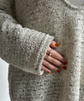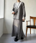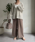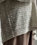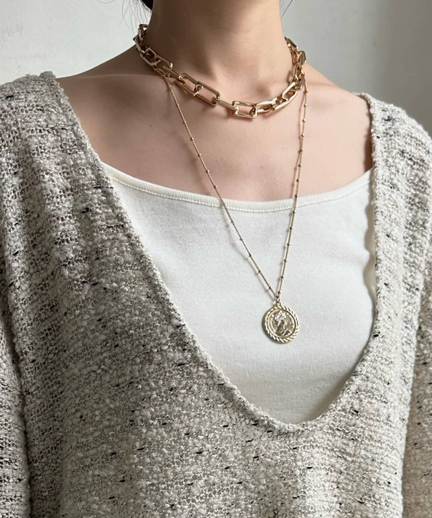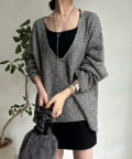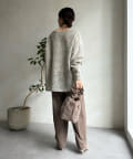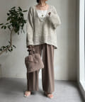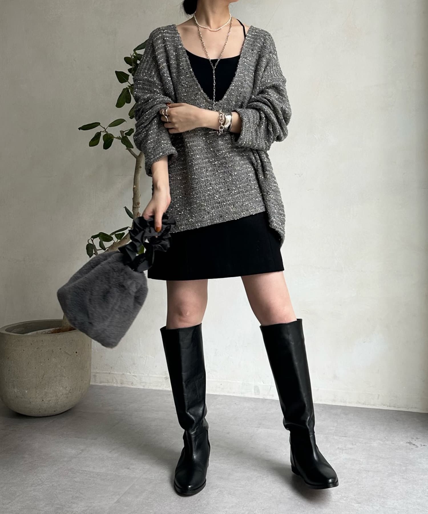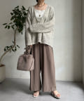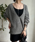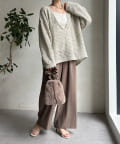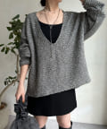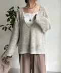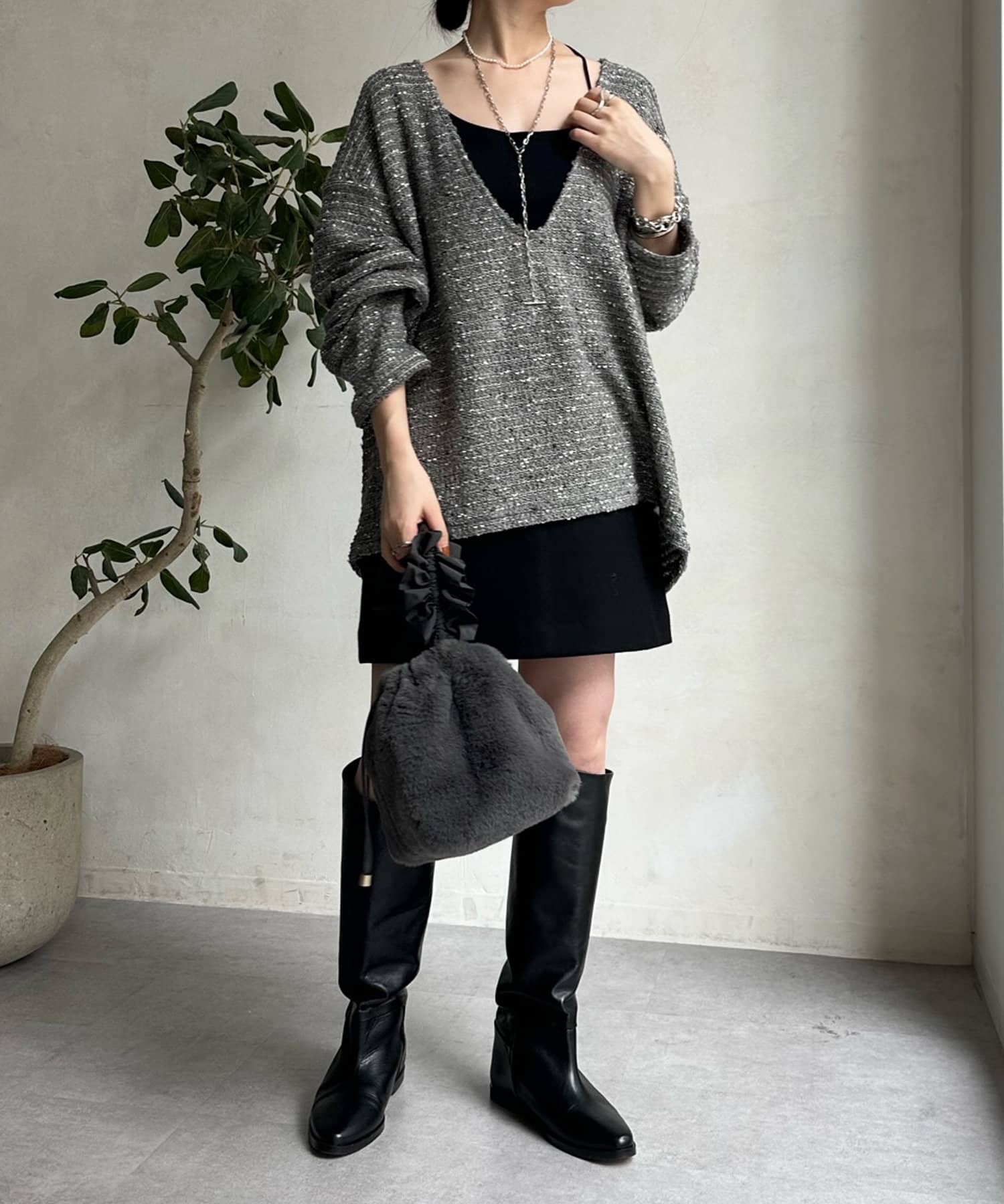 ざっくりとしたVネックがレイヤードのスタイルに映え、また、お顔周りをすっきりと見せてくれる効果も。