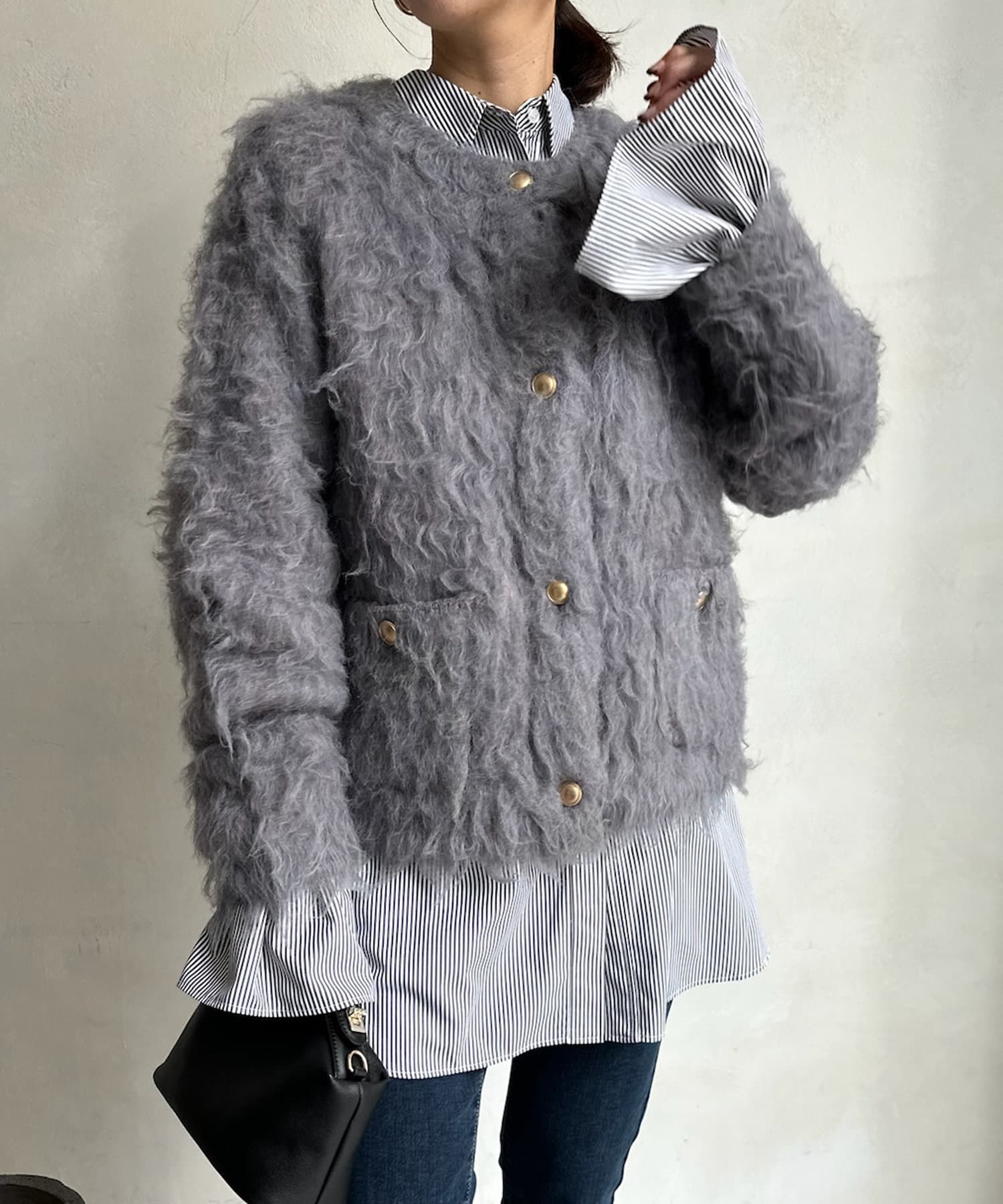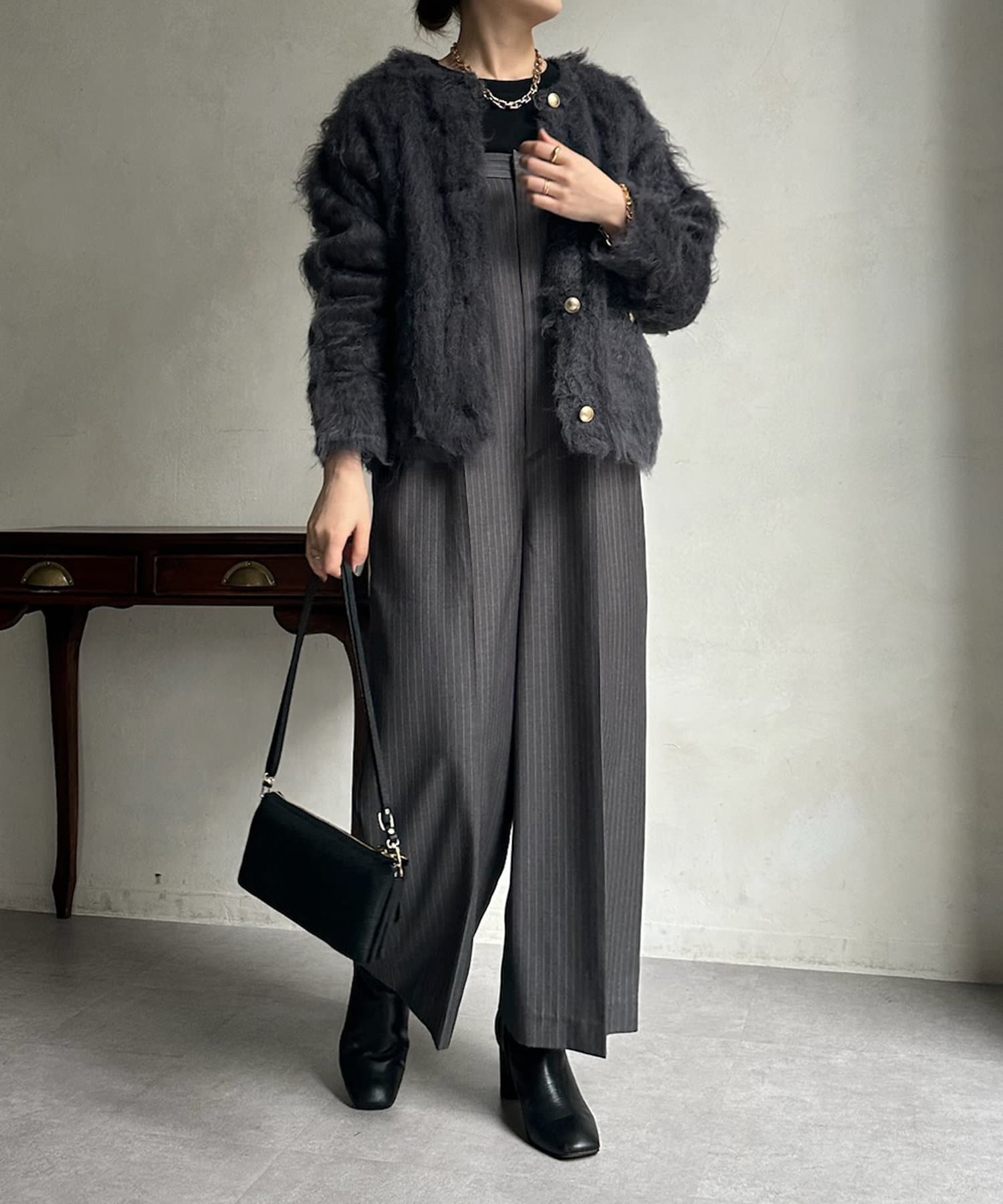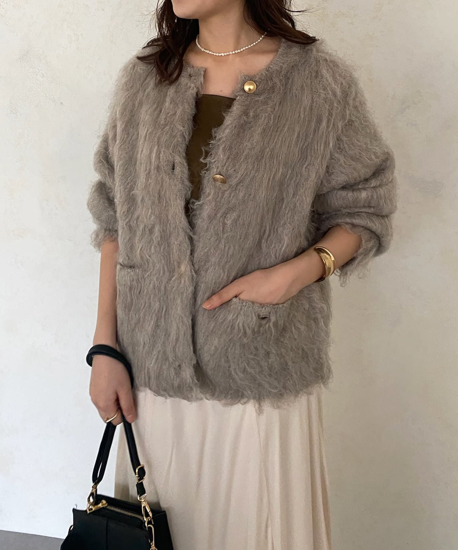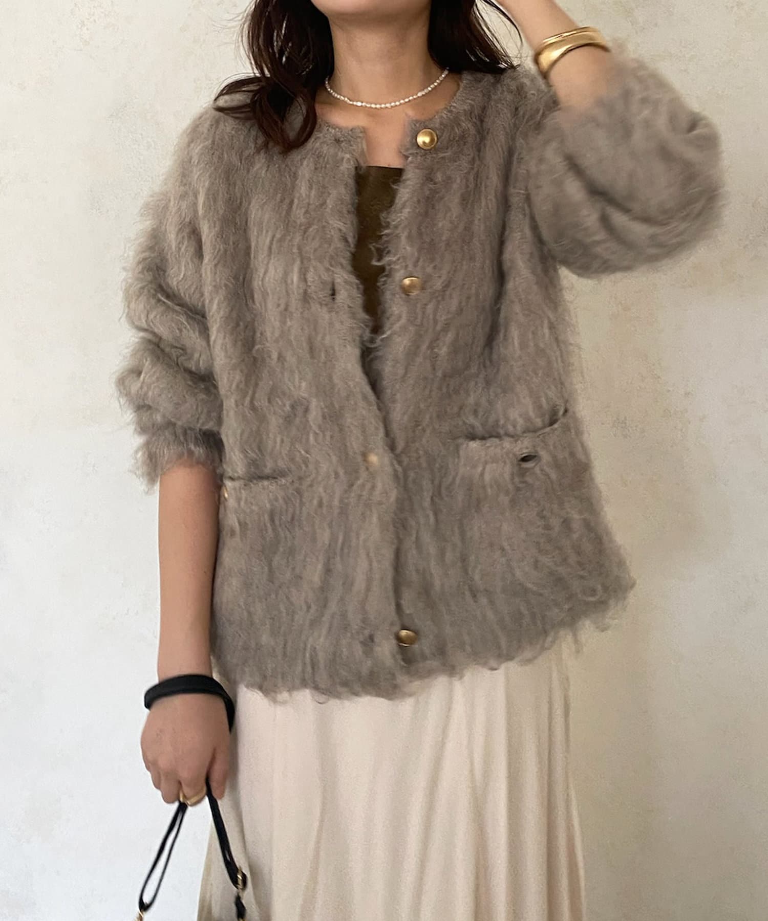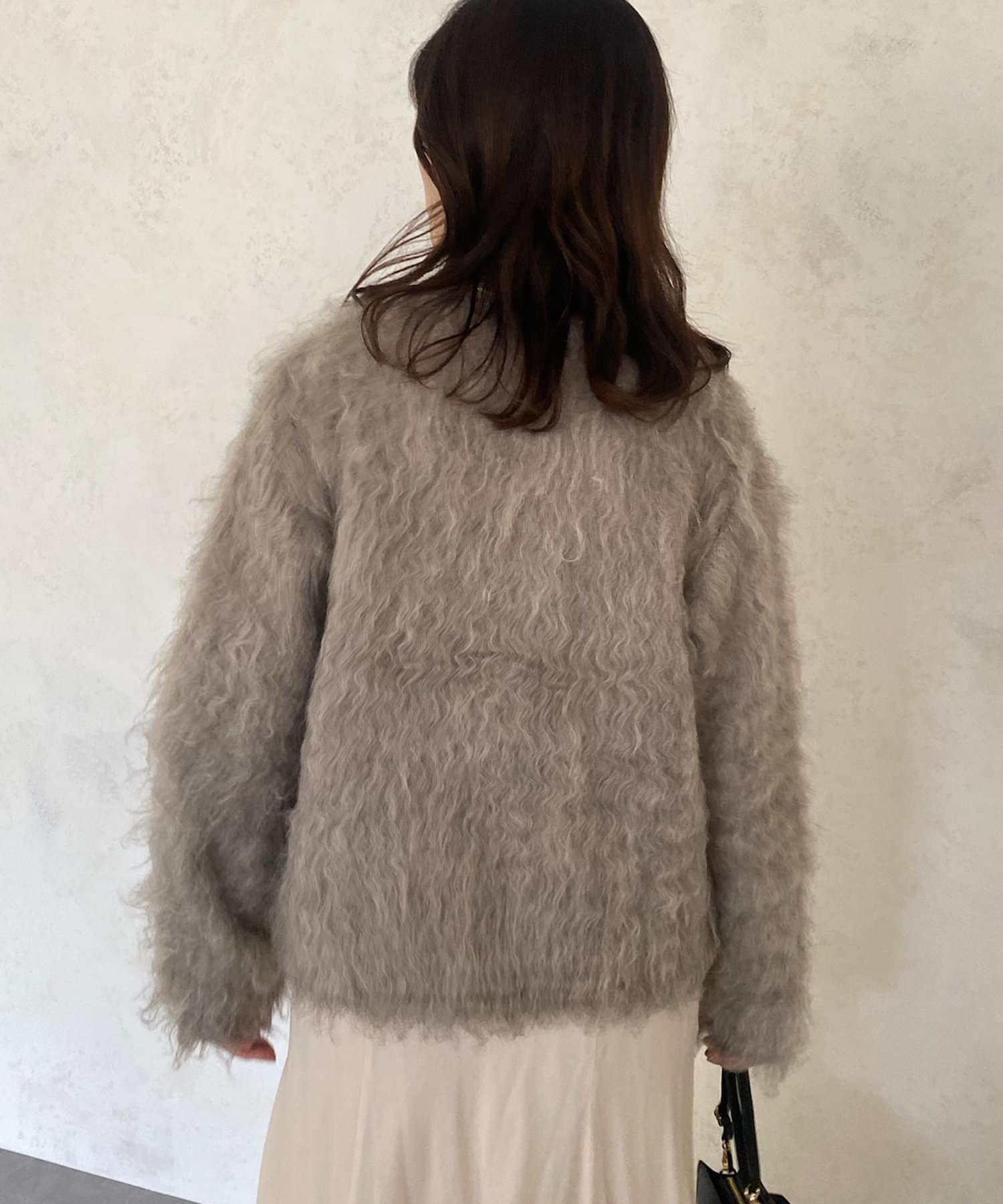 今年気になる毛足感のあるシャギーニットで仕上げた、ニットジャケット。