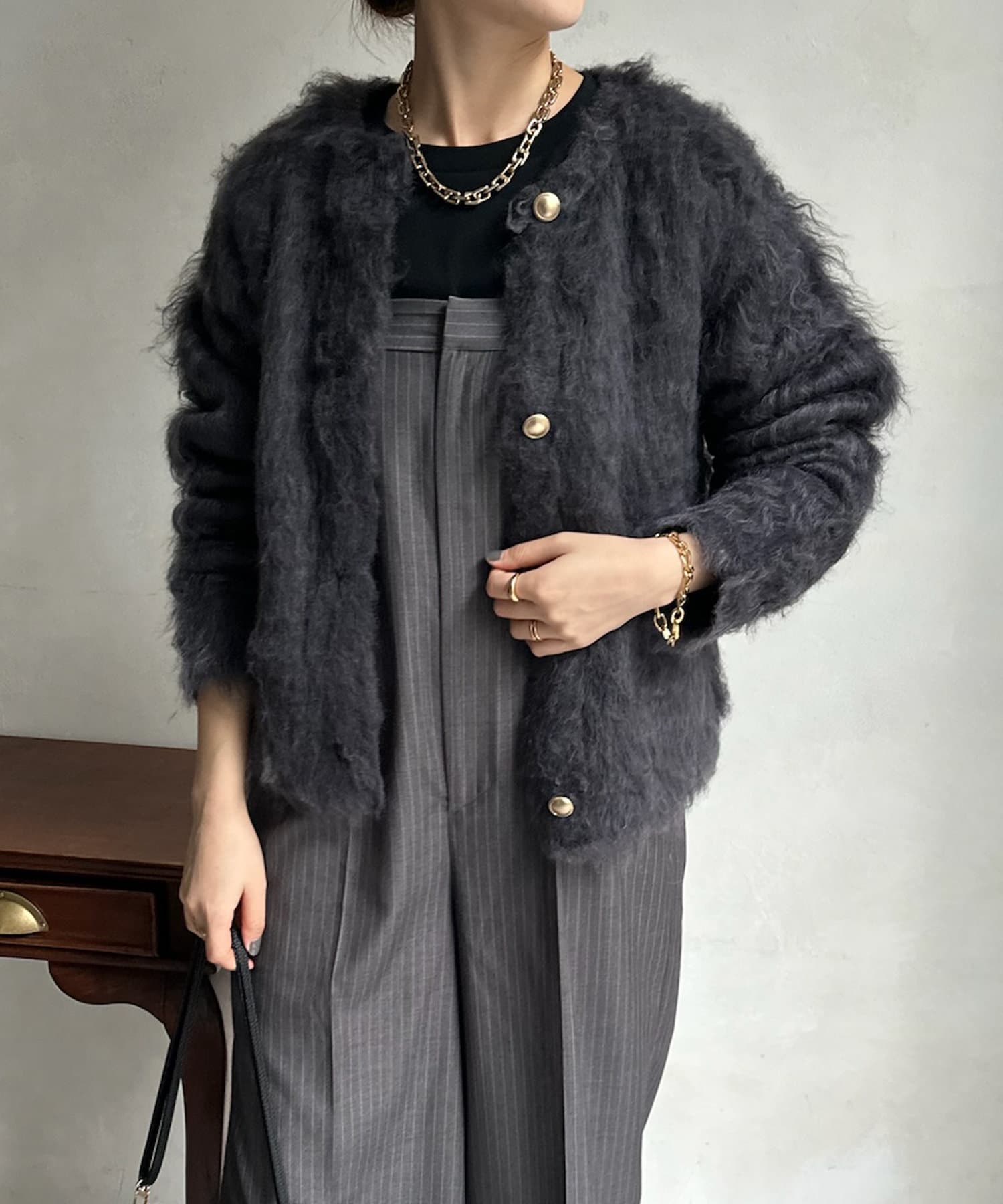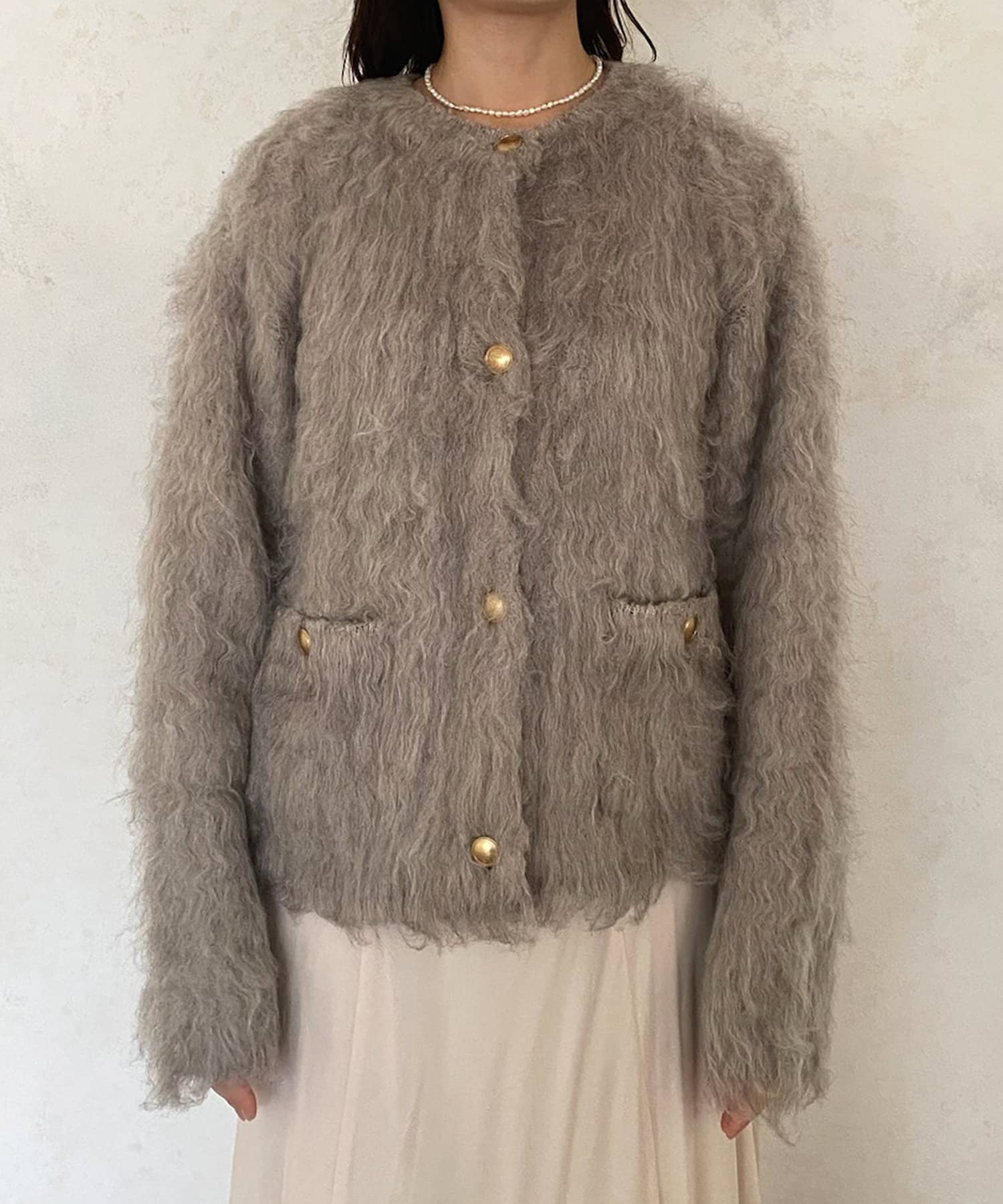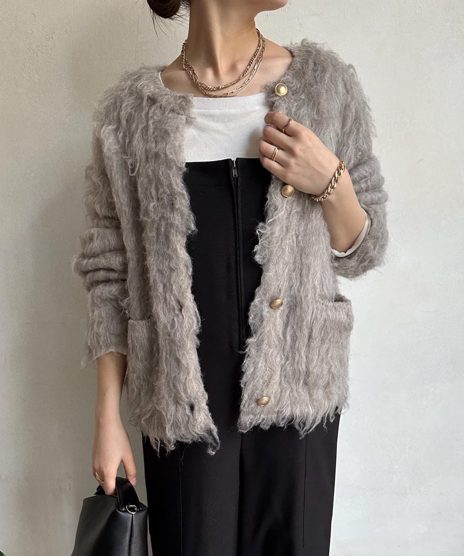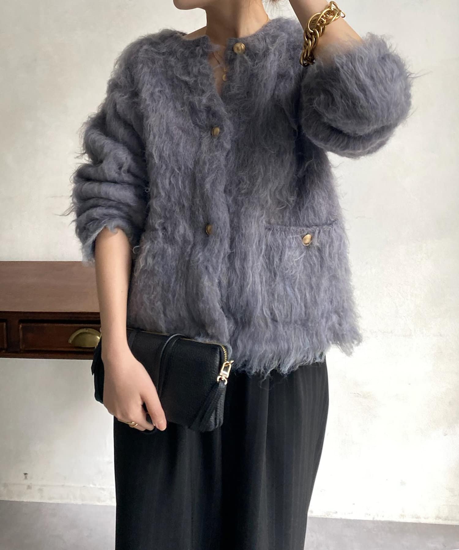 今年気になる毛足感のあるシャギーニットで仕上げた、ニットジャケット。