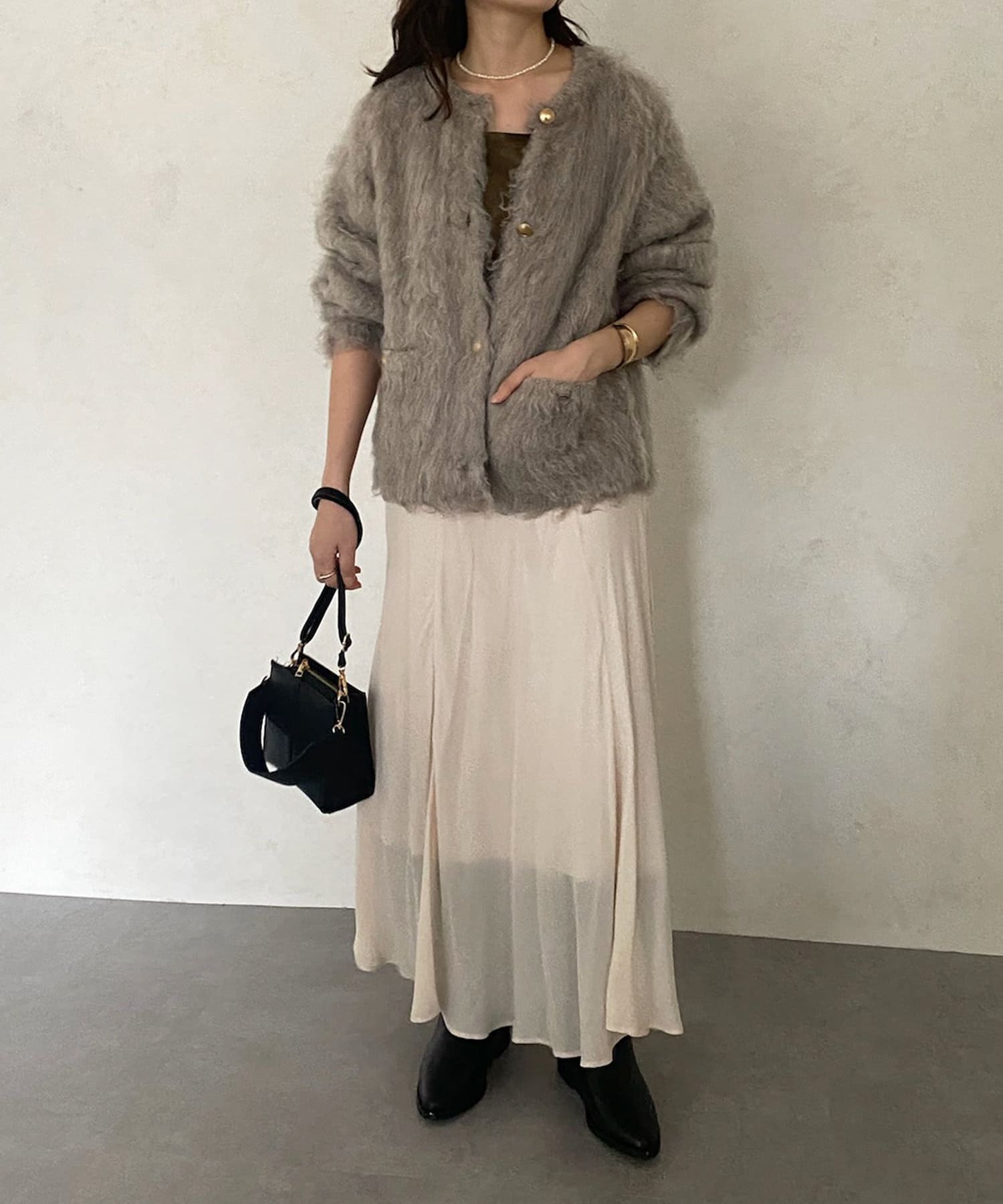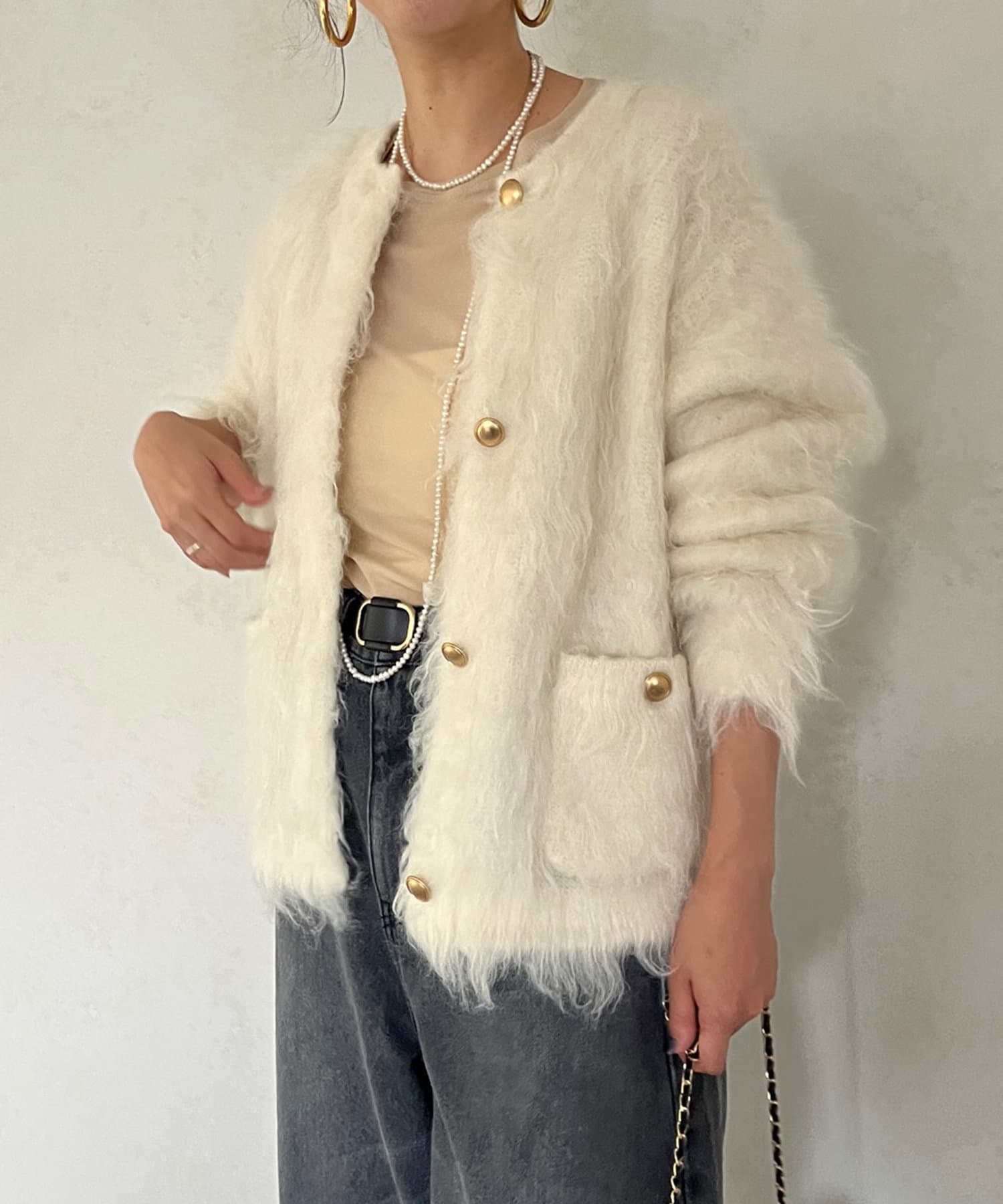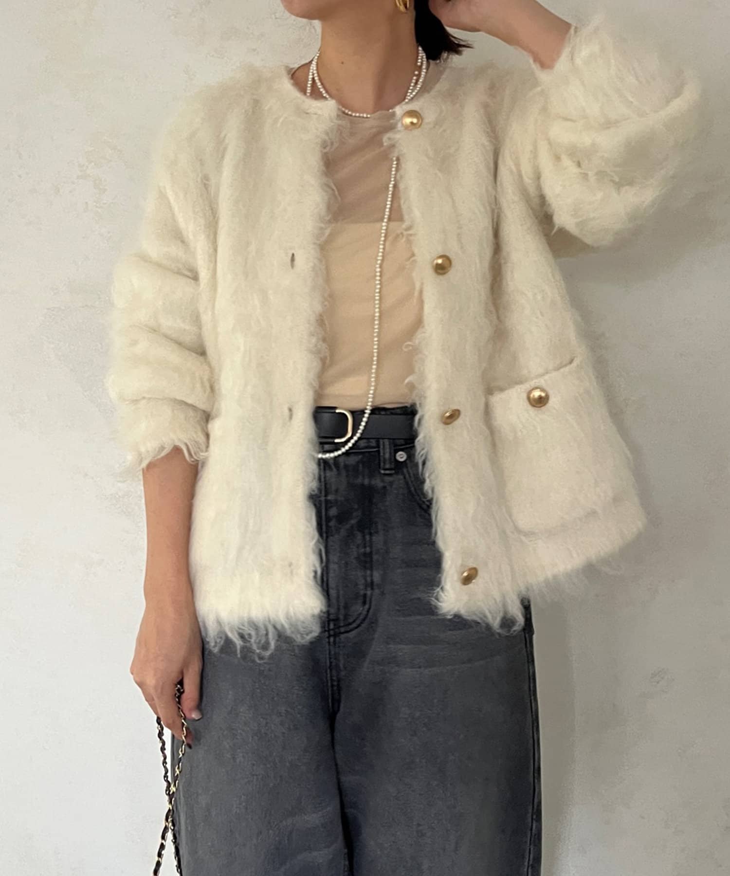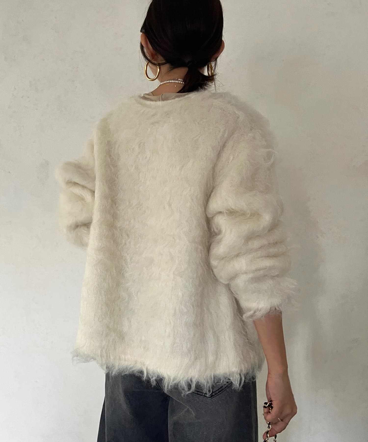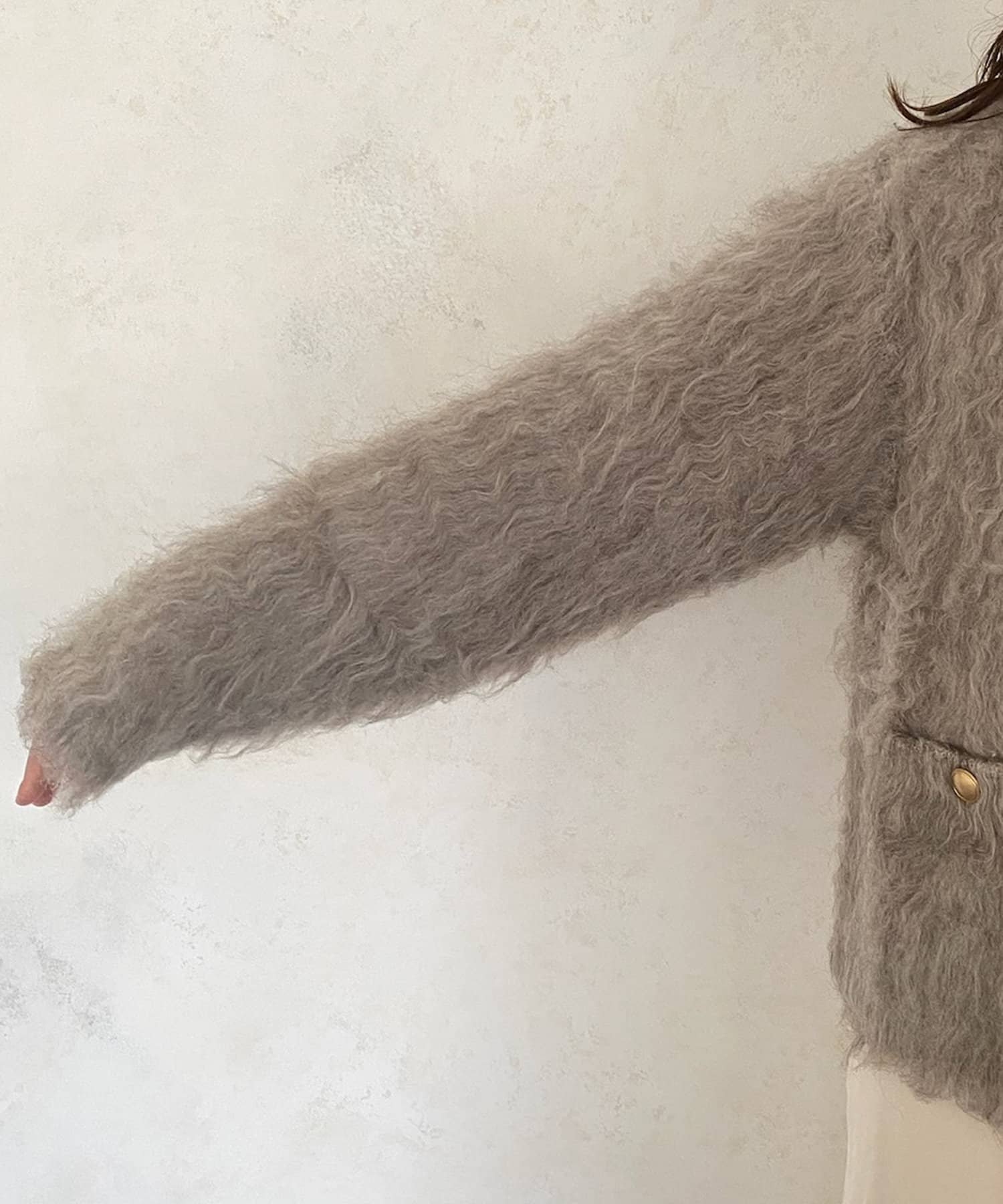 今年気になる毛足感のあるシャギーニットで仕上げた、ニットジャケット。
