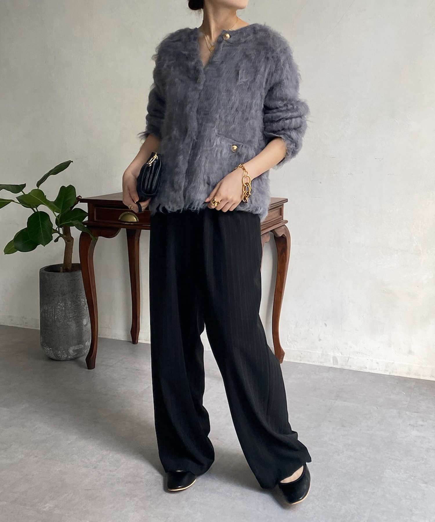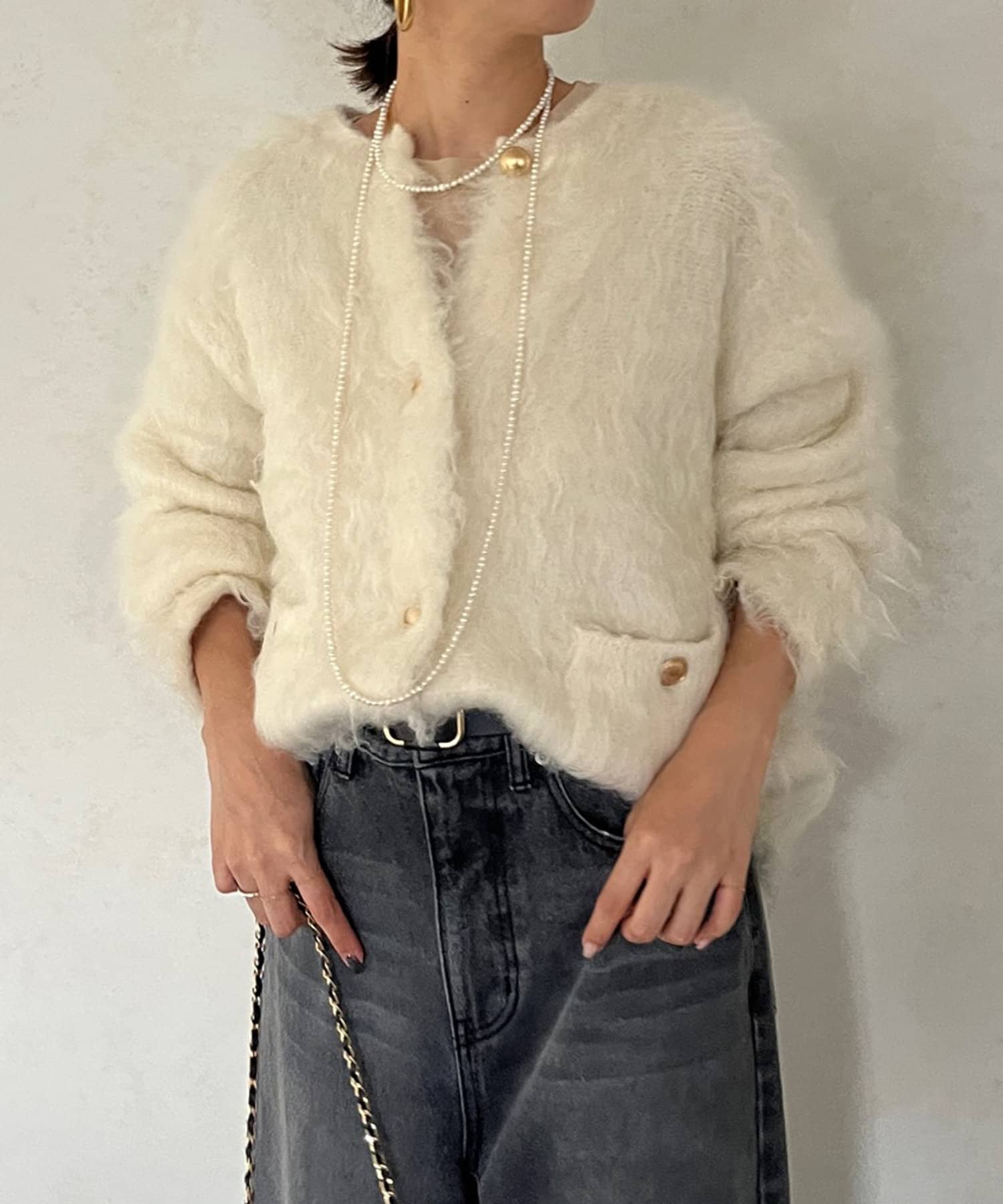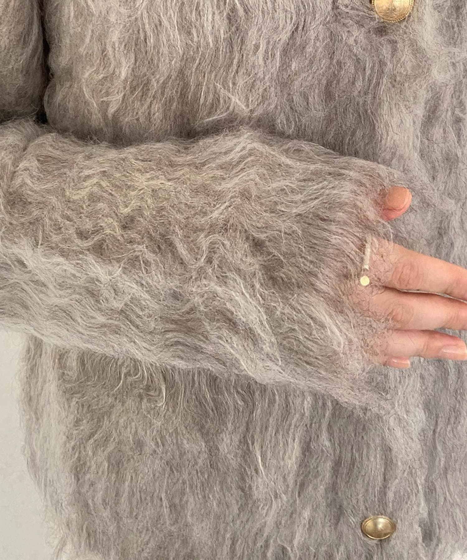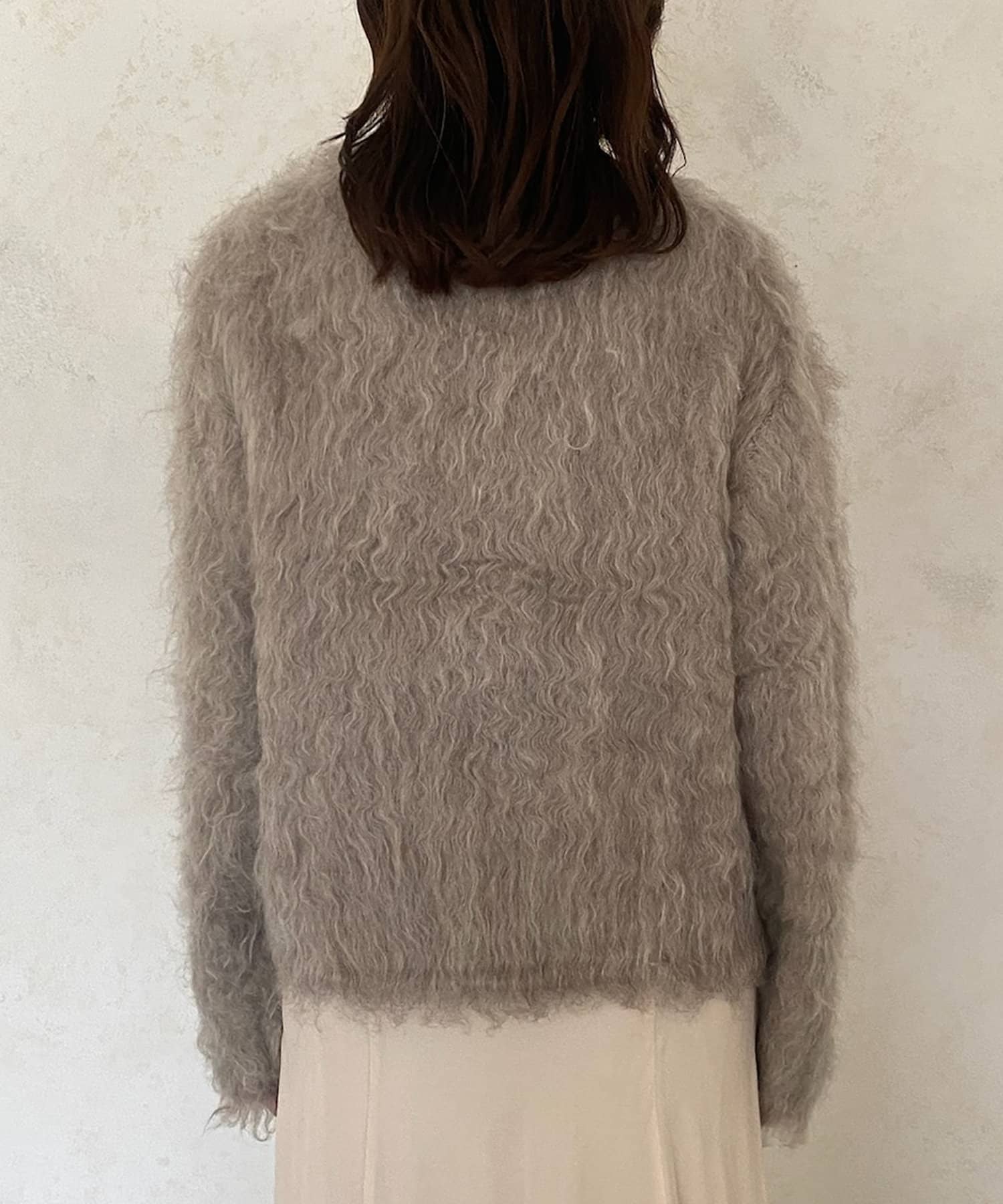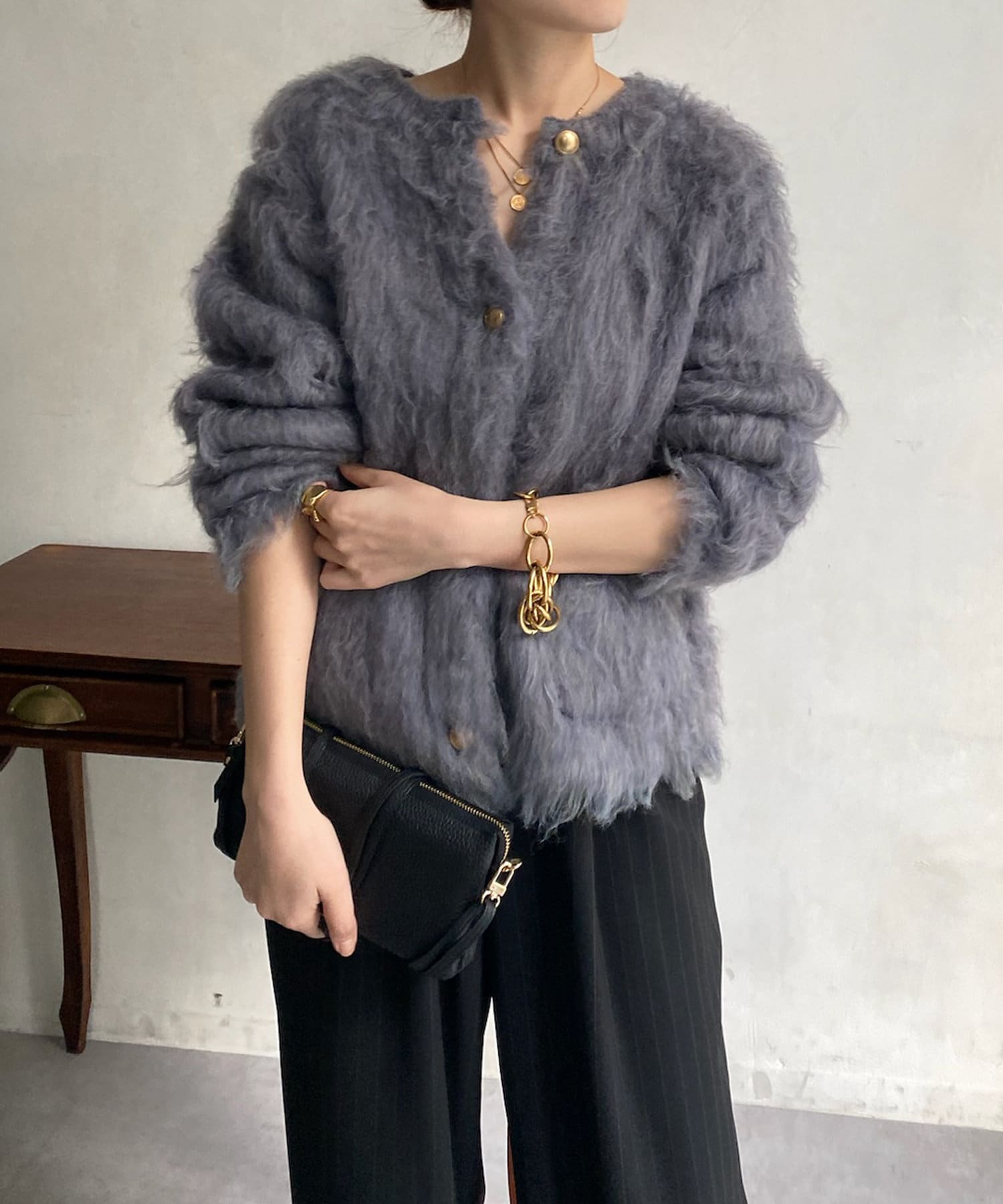 今年気になる毛足感のあるシャギーニットで仕上げた、ニットジャケット。