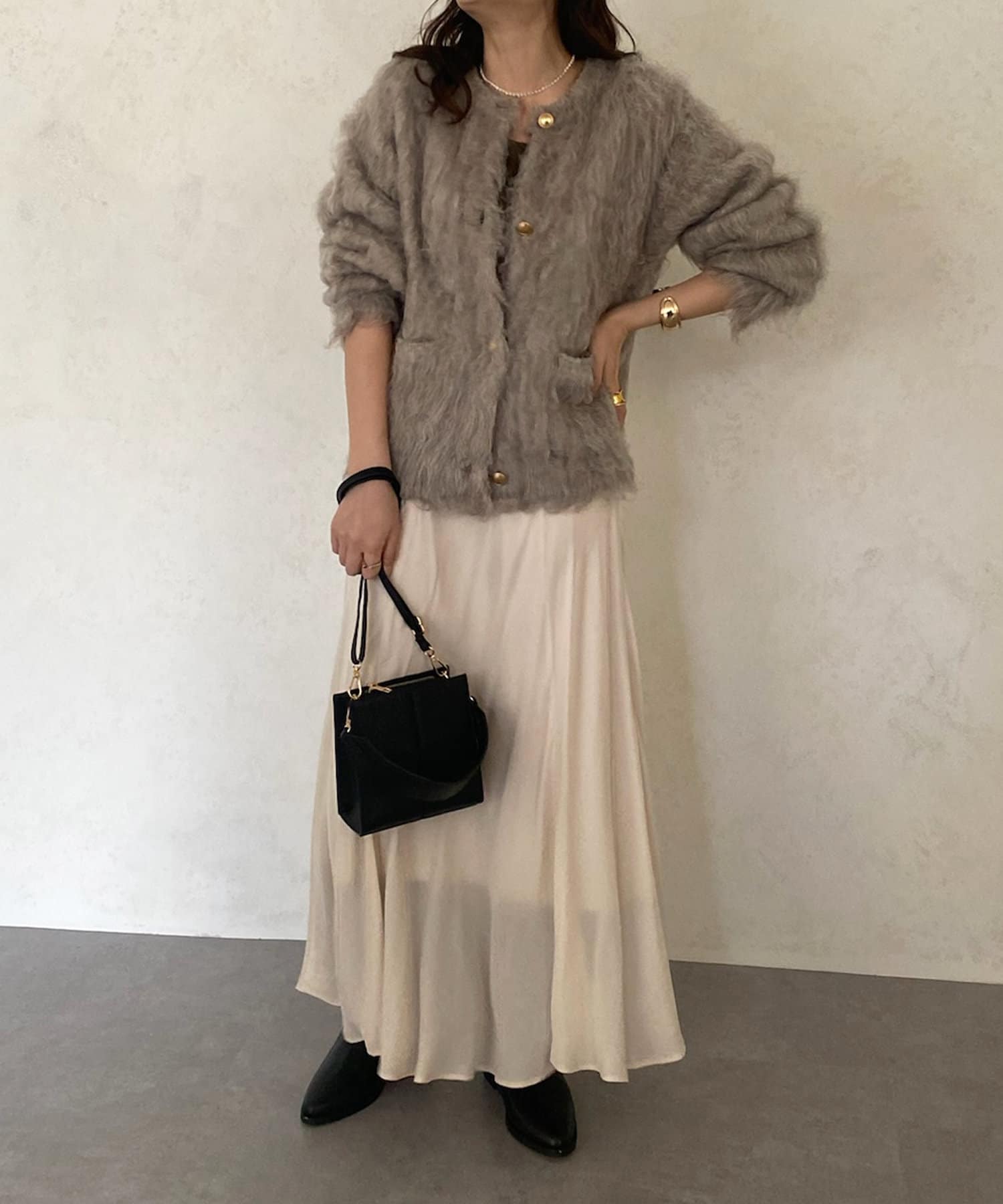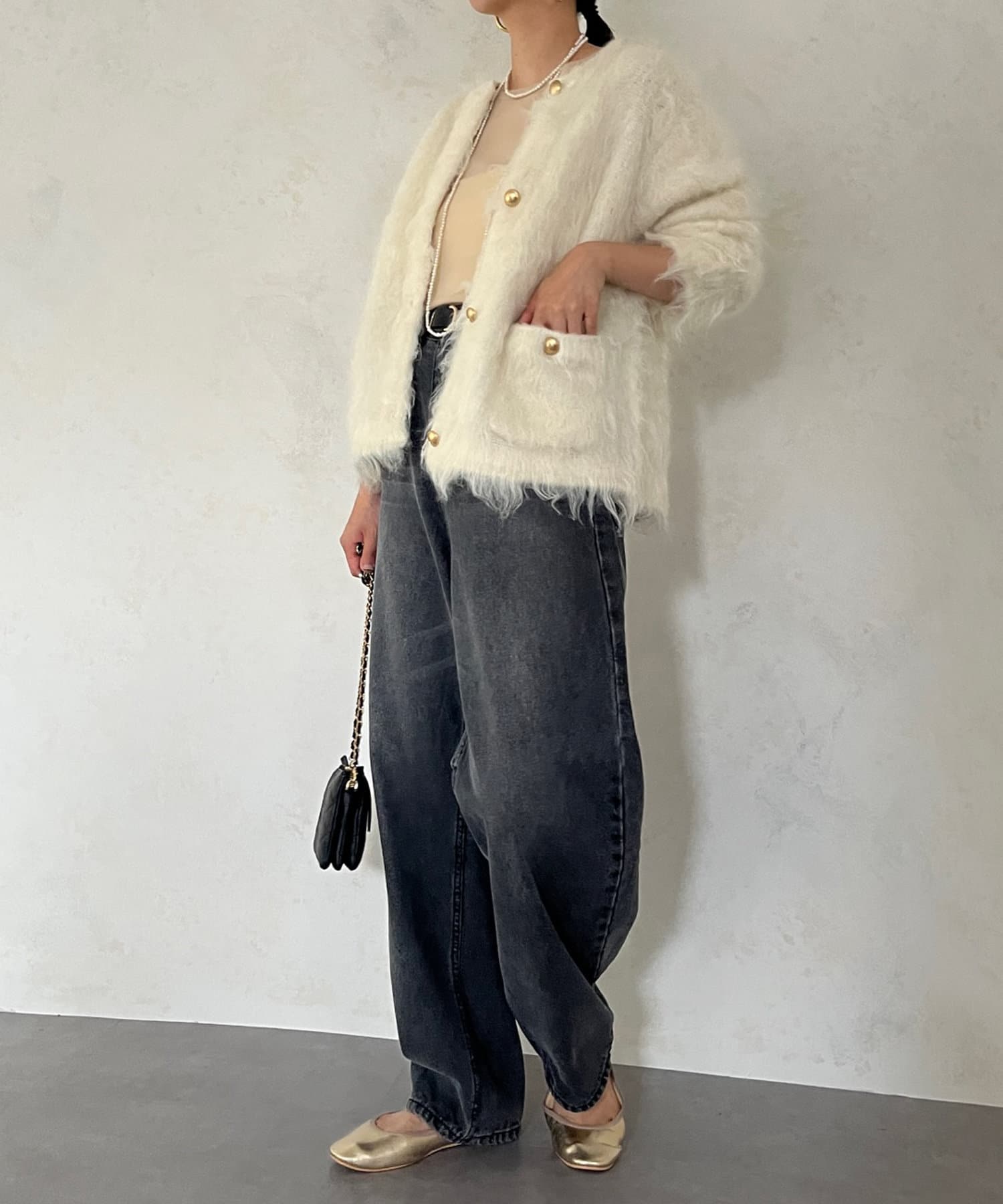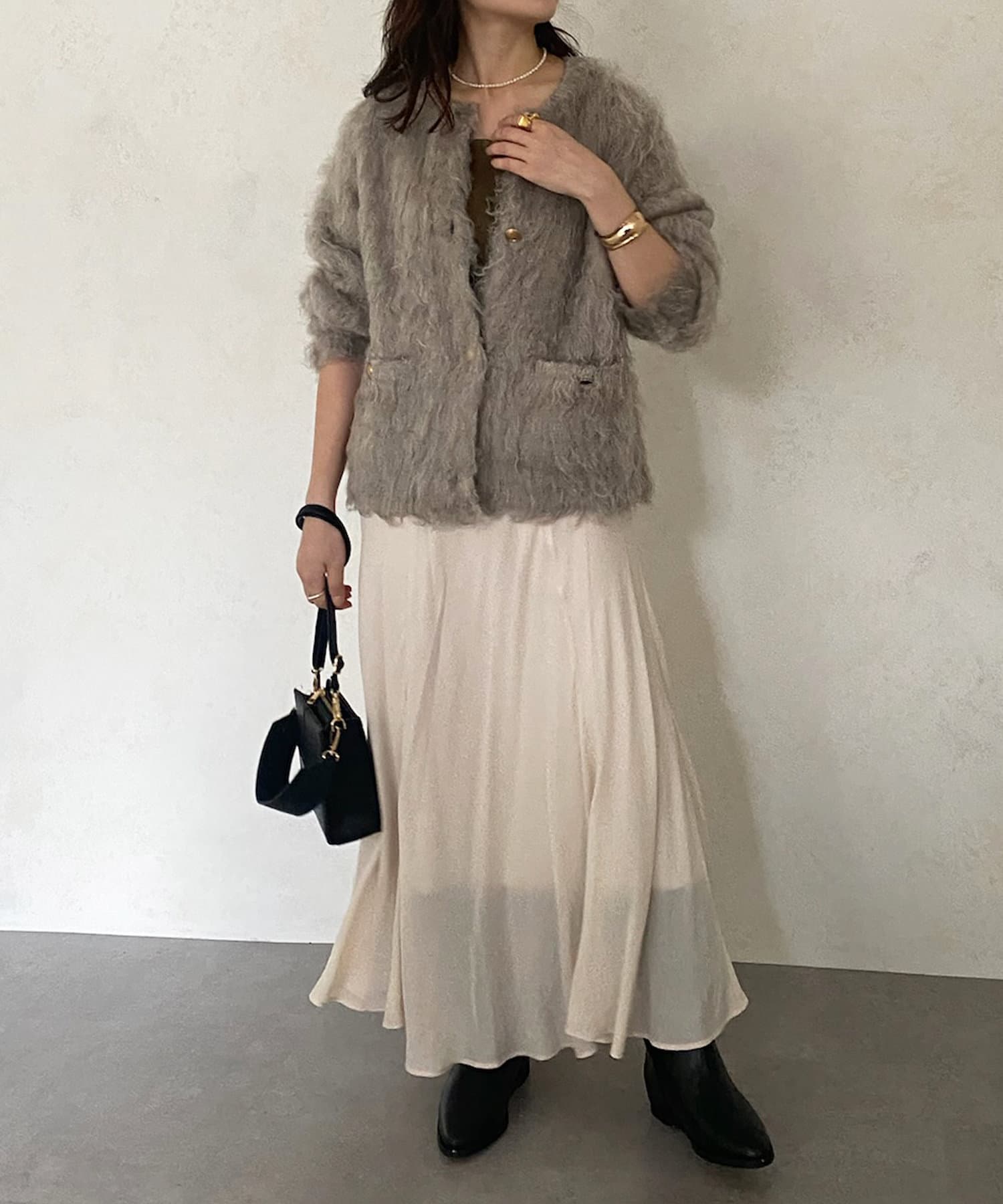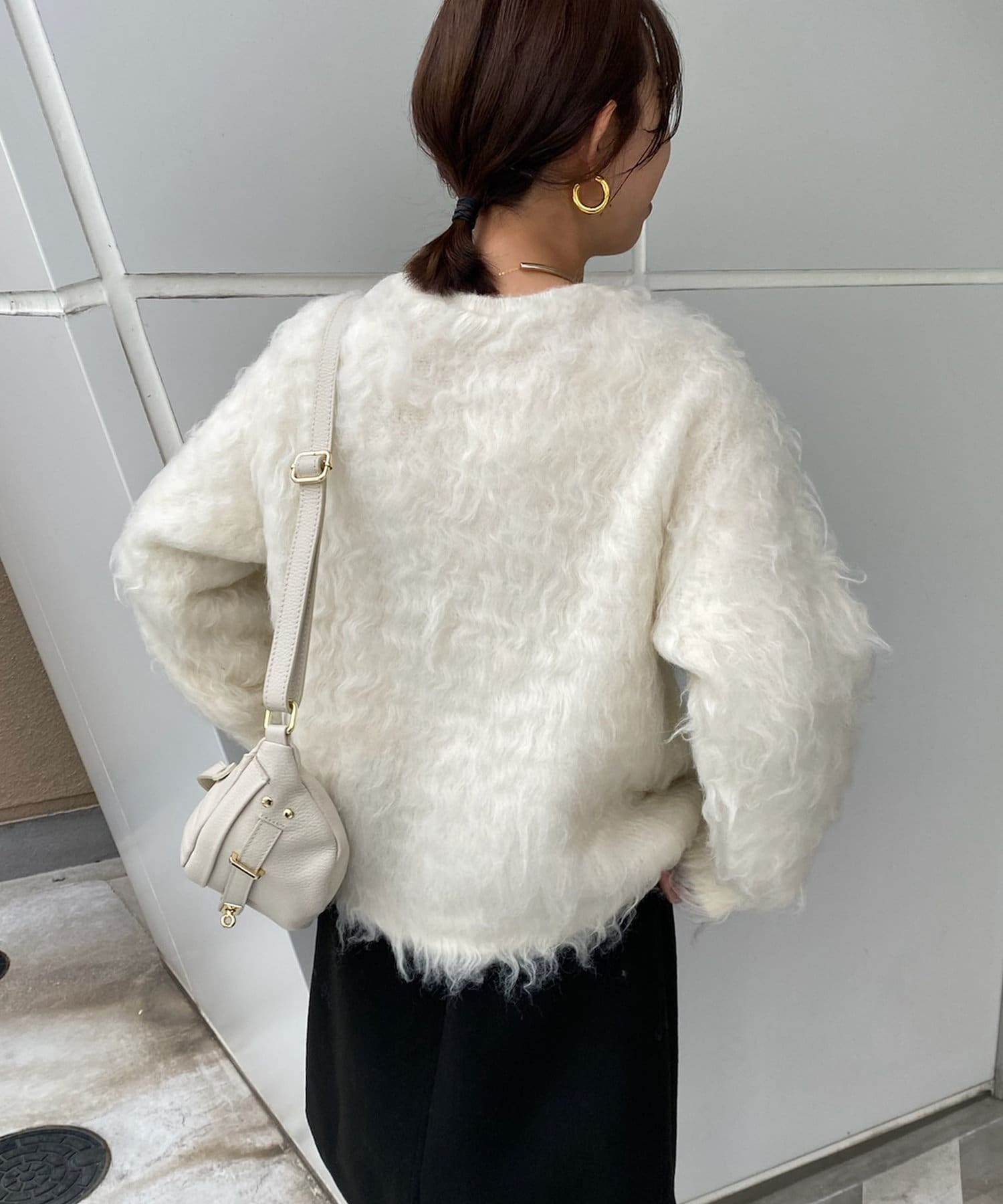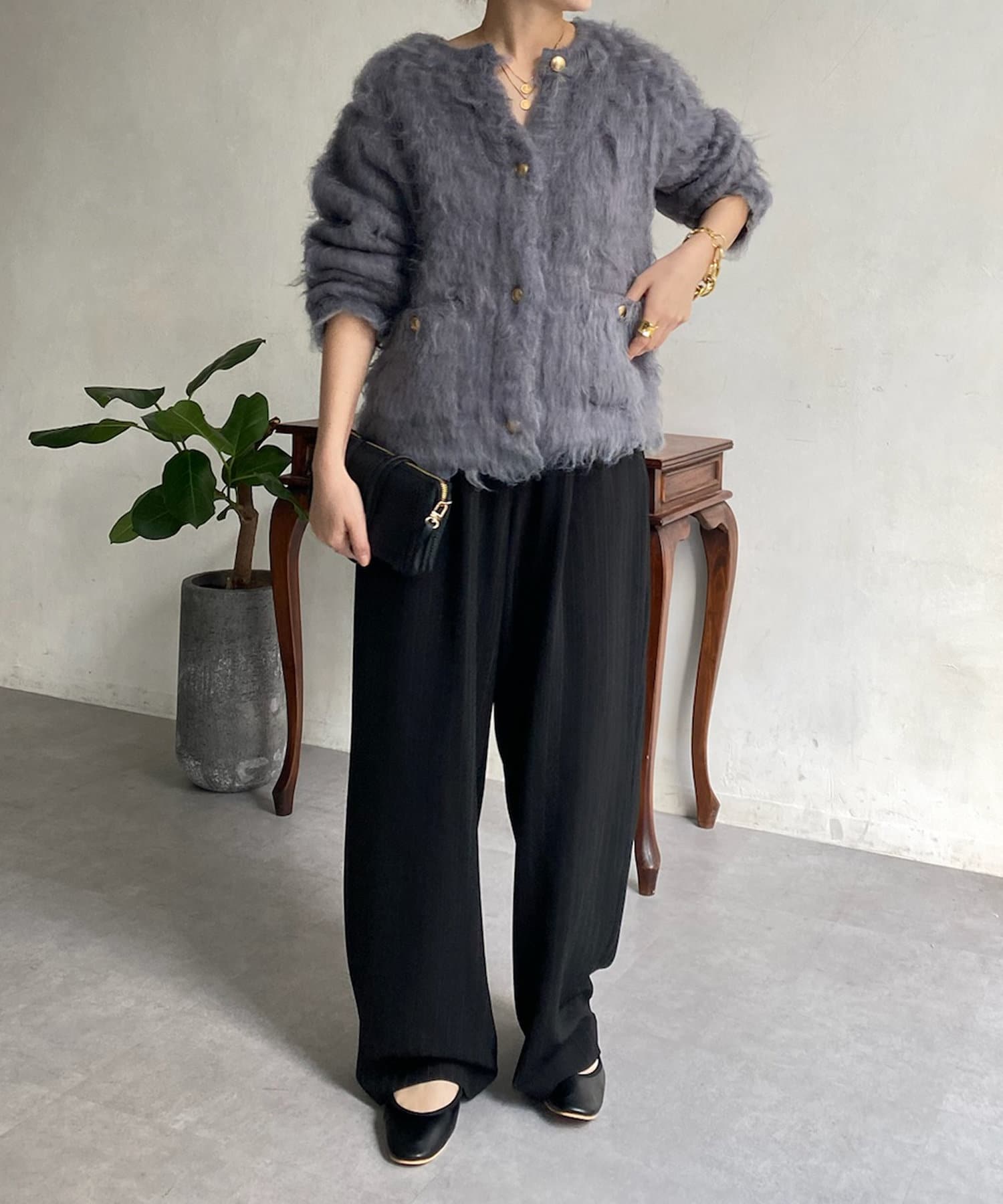 今年気になる毛足感のあるシャギーニットで仕上げた、ニットジャケット。