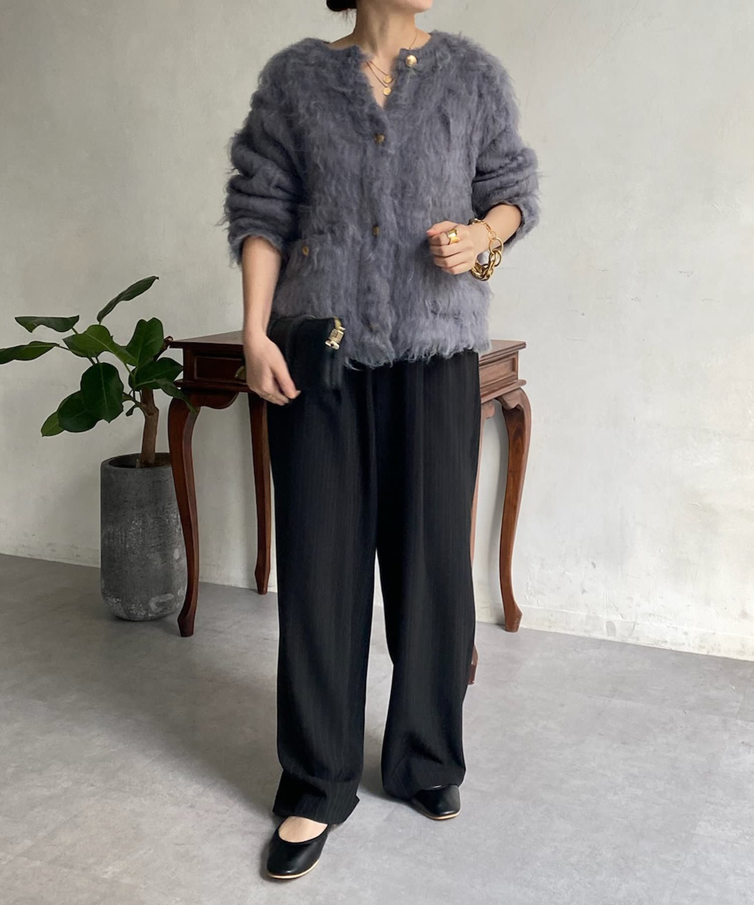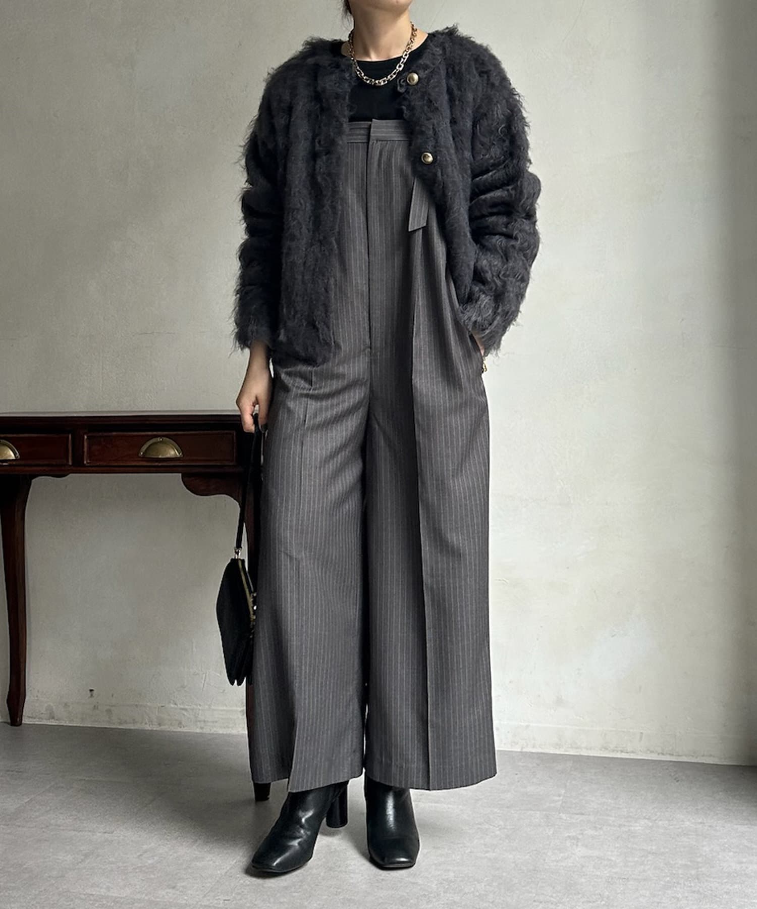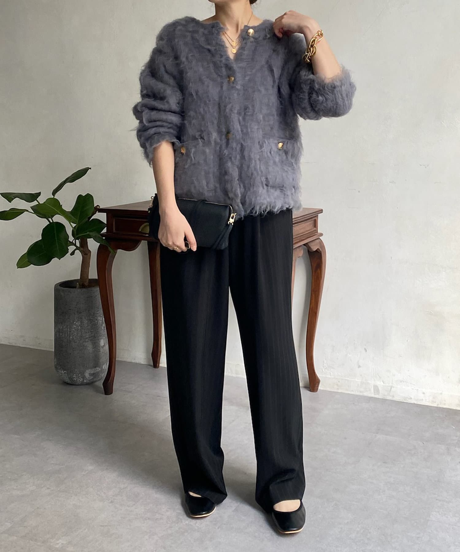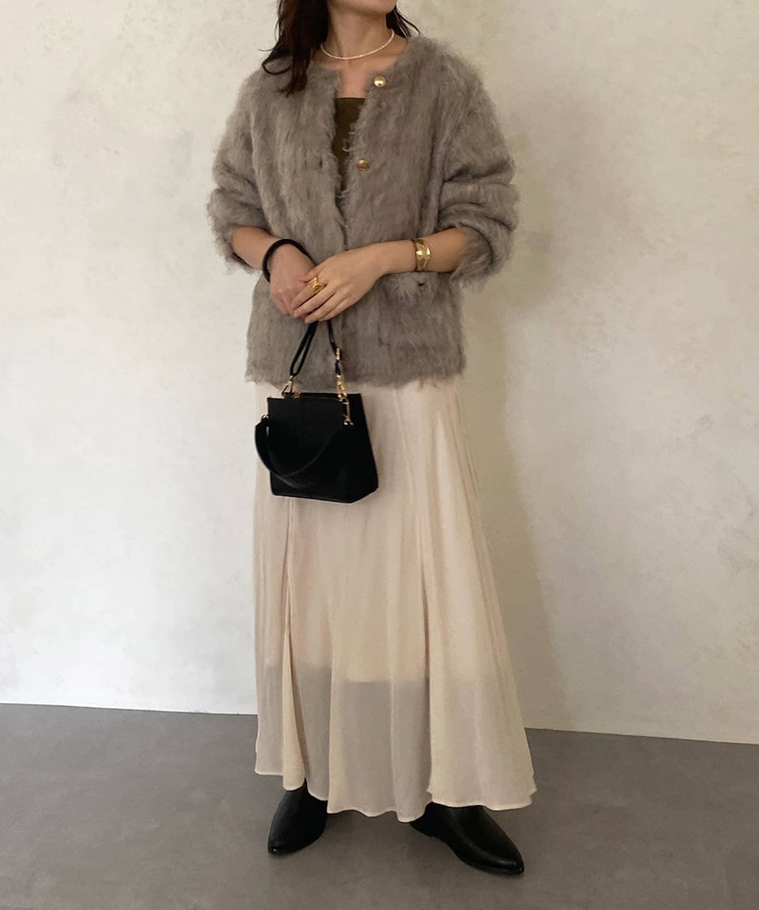 今年気になる毛足感のあるシャギーニットで仕上げた、ニットジャケット。