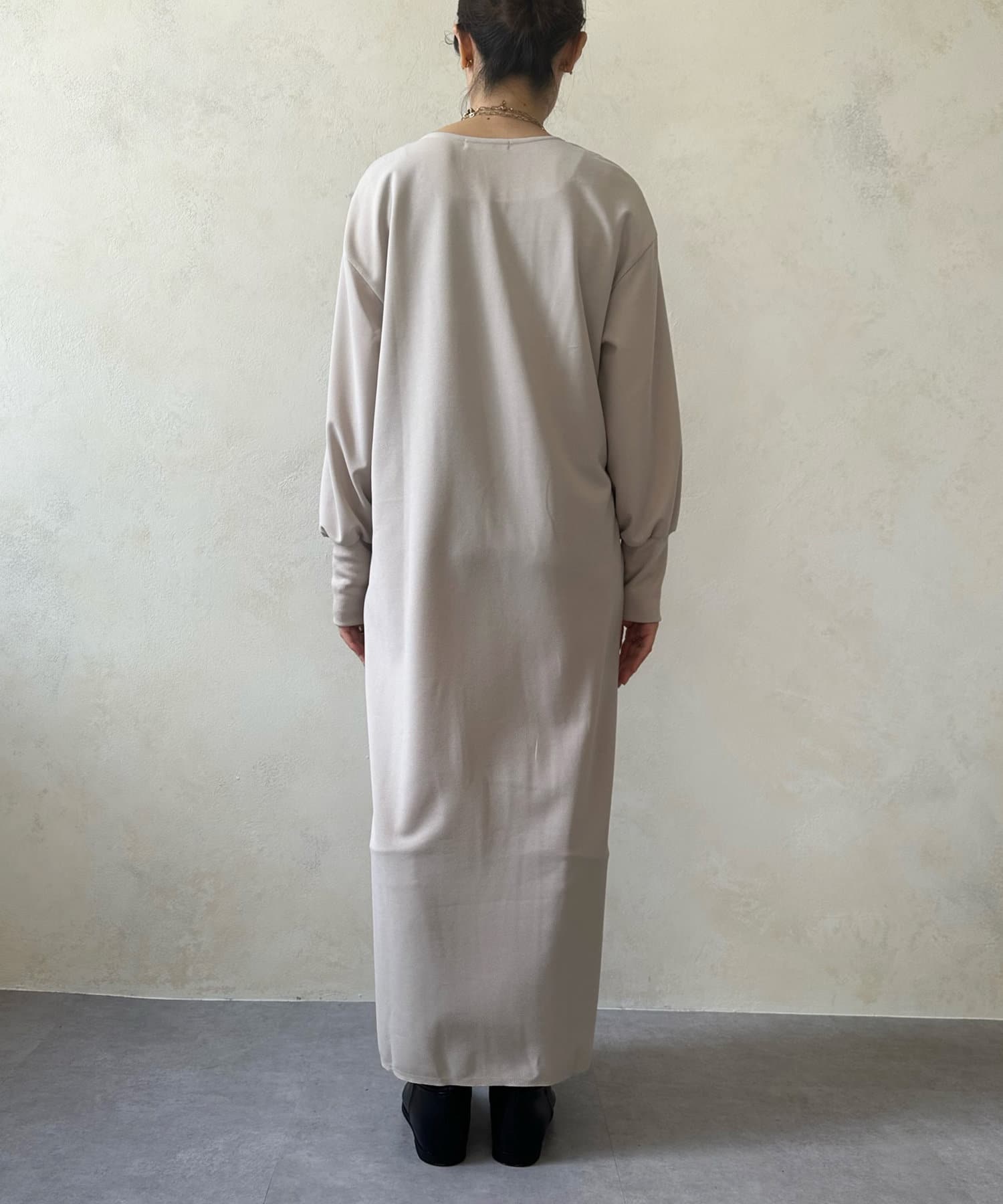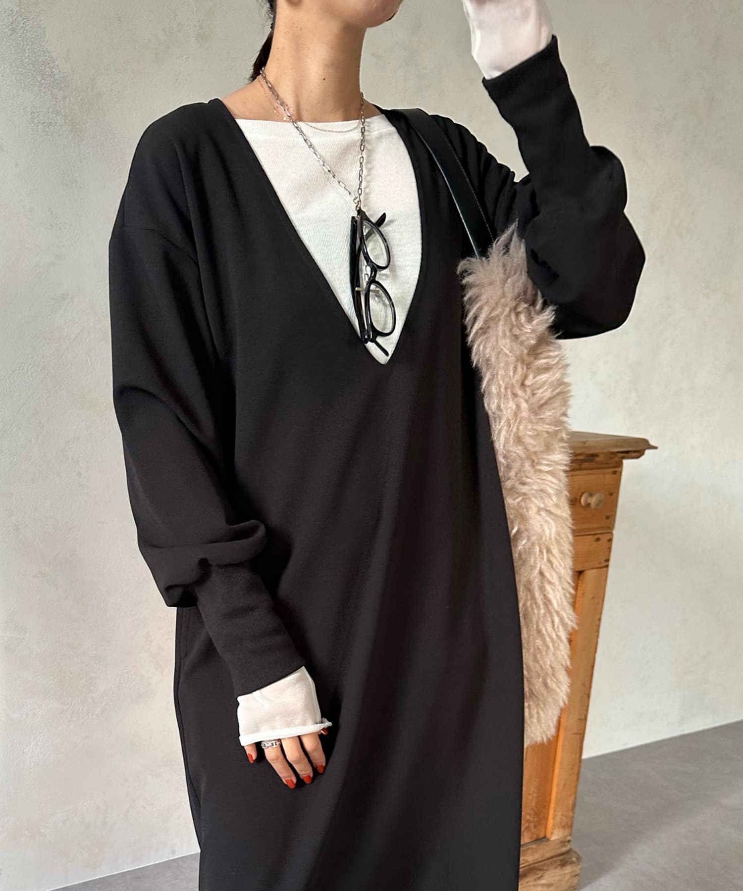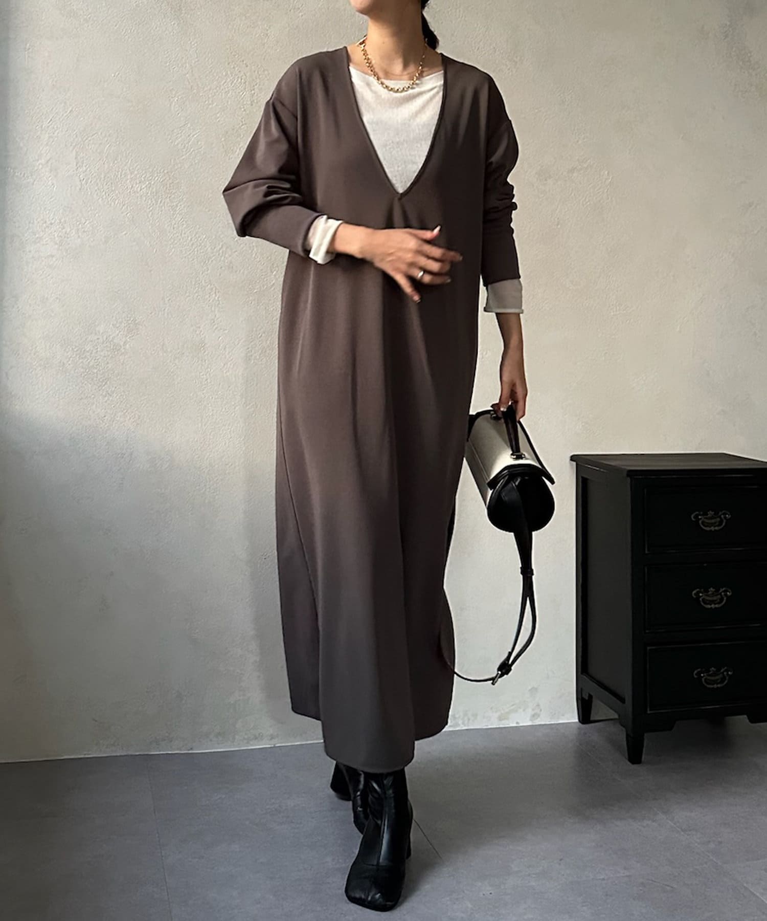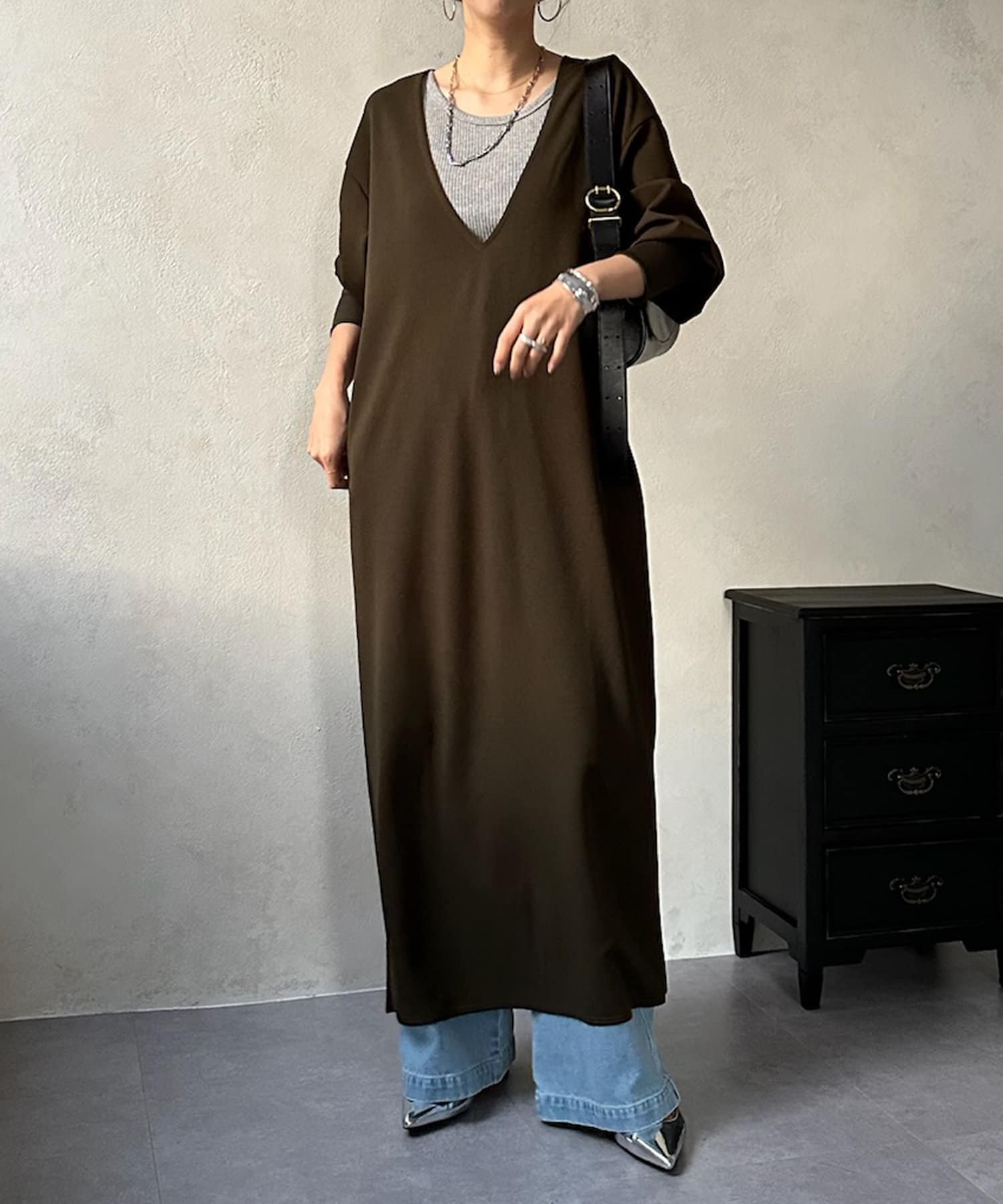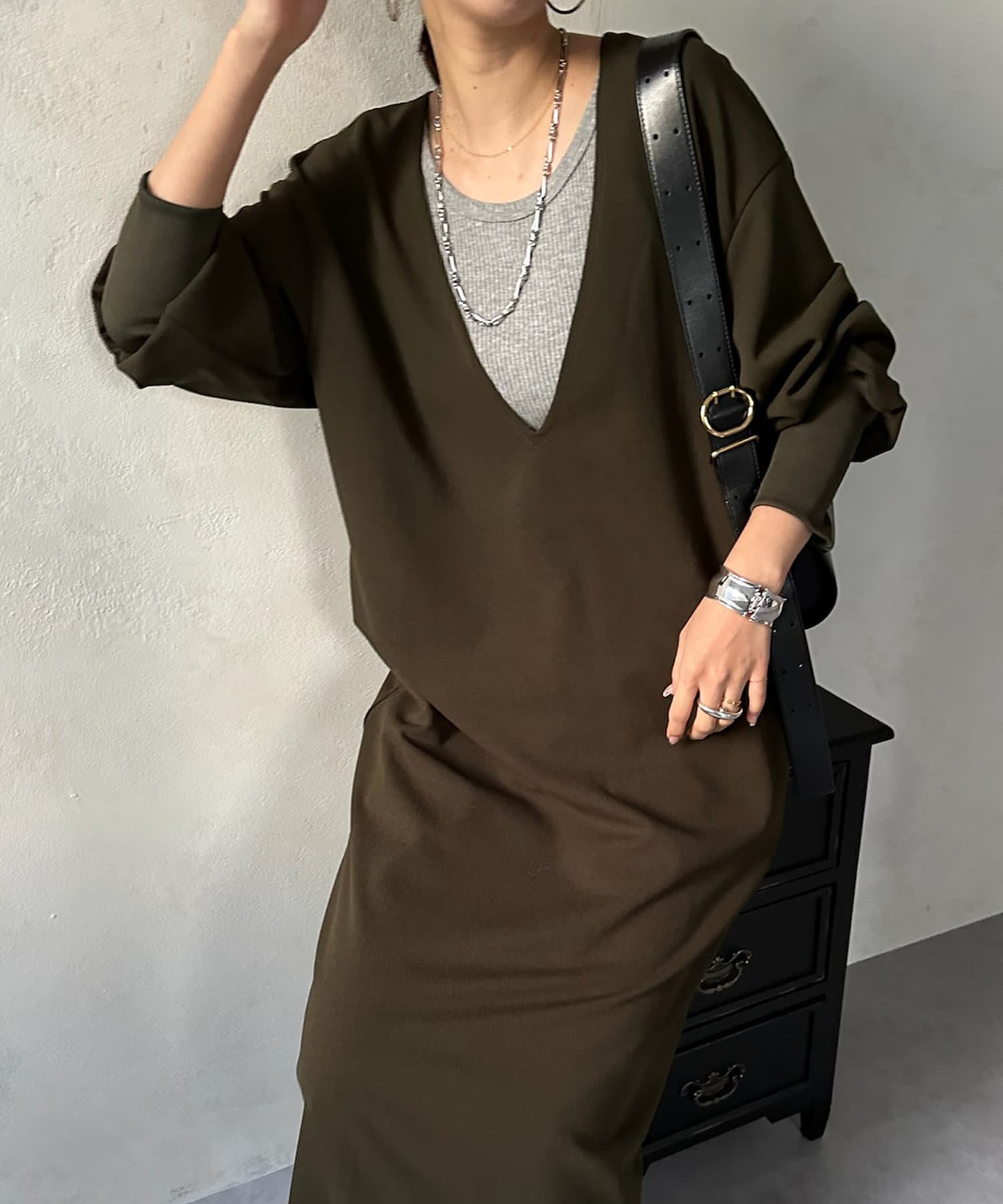 ざっくりと深めのVネックに仕上げたロングワンピース。