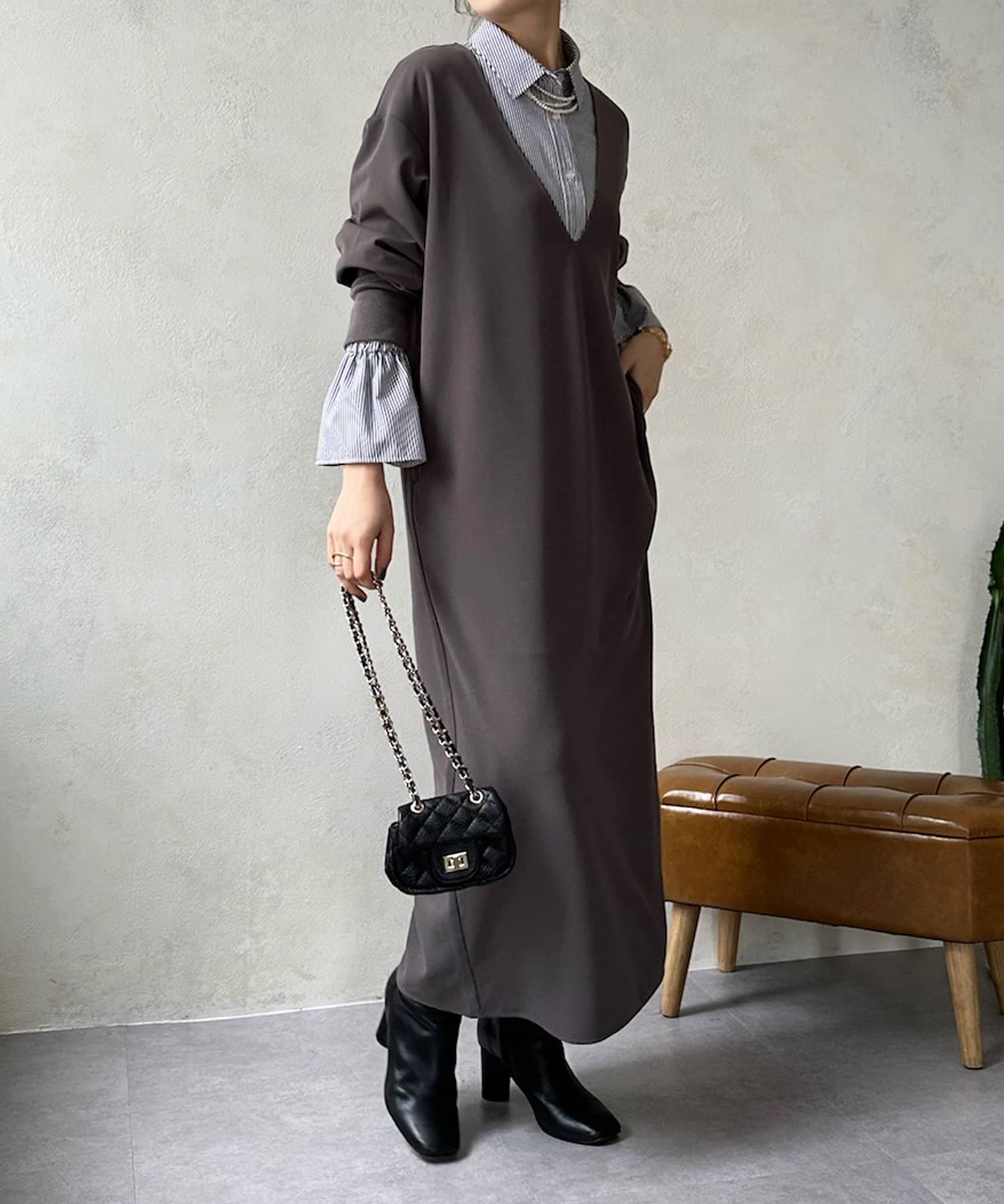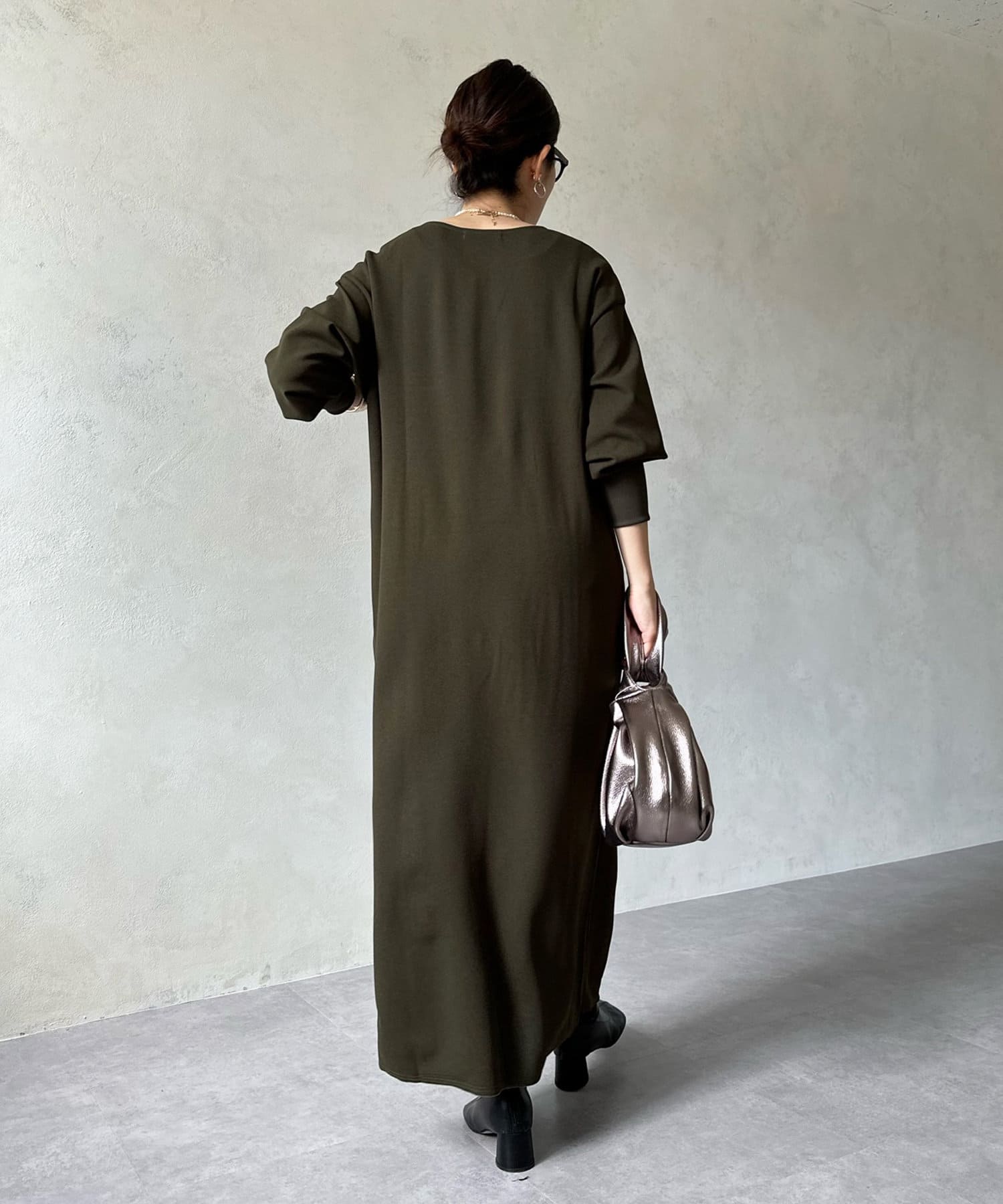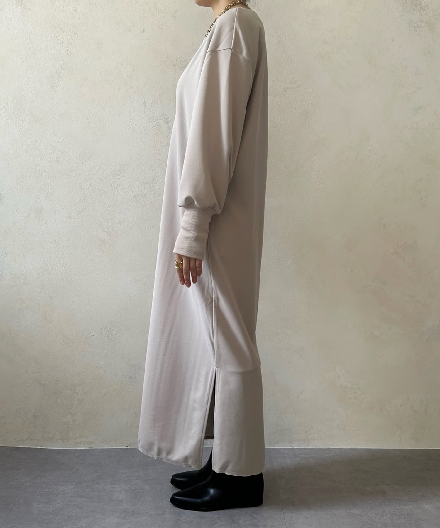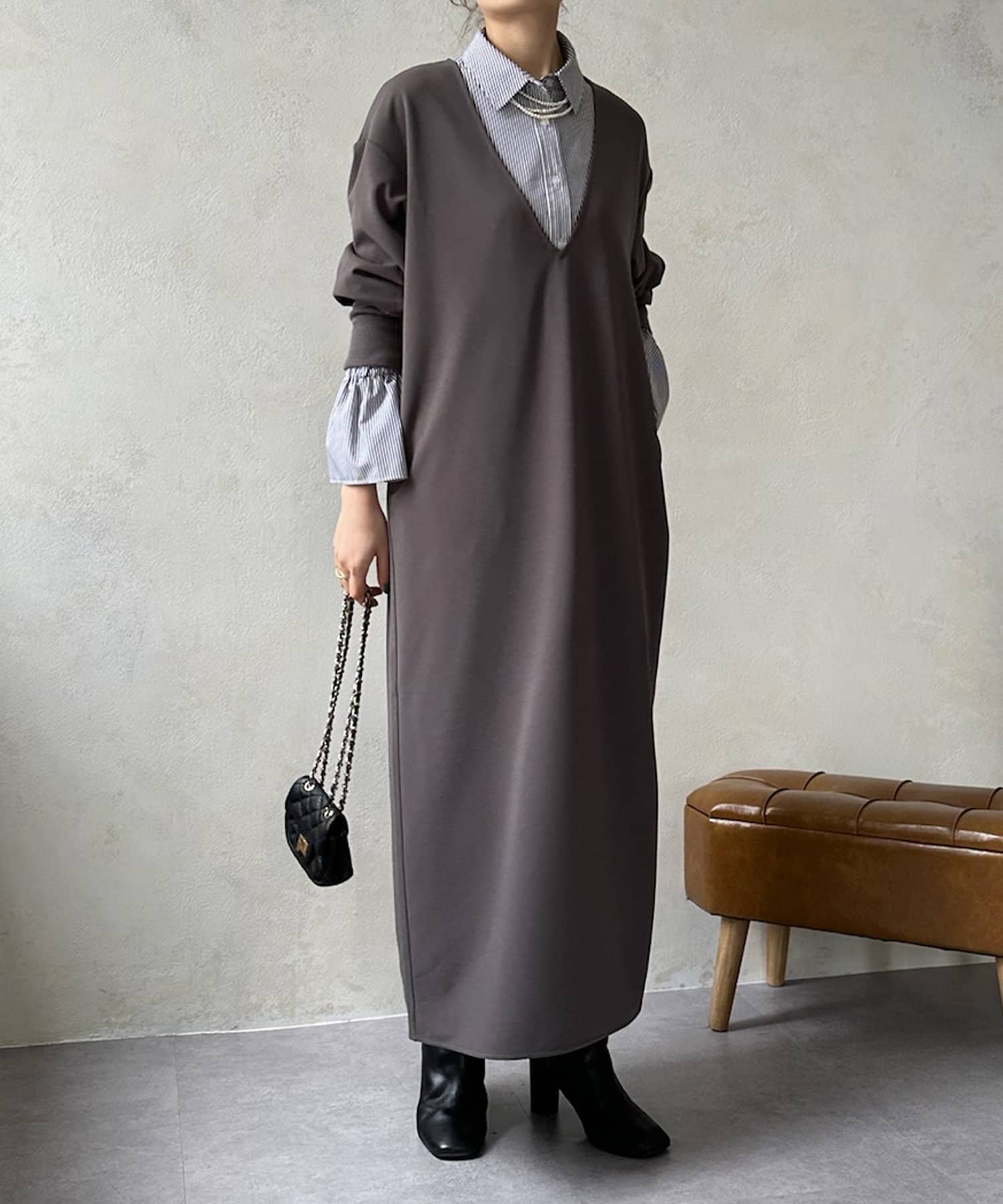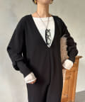 ざっくりと深めのVネックに仕上げたロングワンピース。
