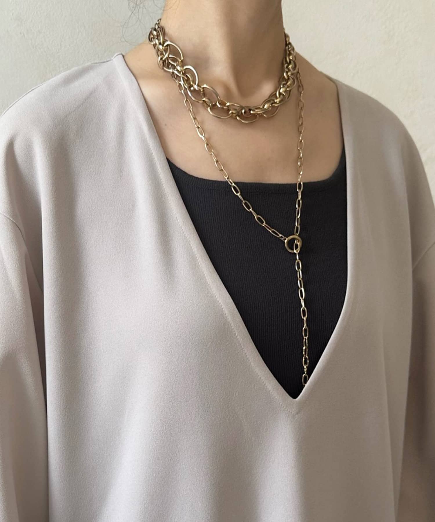 深めのVネックはレイヤードした時に、おしゃれに魅せてくれるポイントとなってくれますよ。
